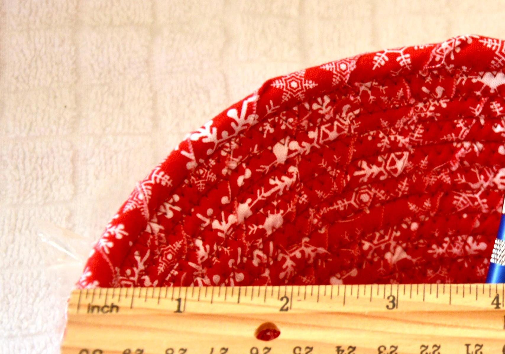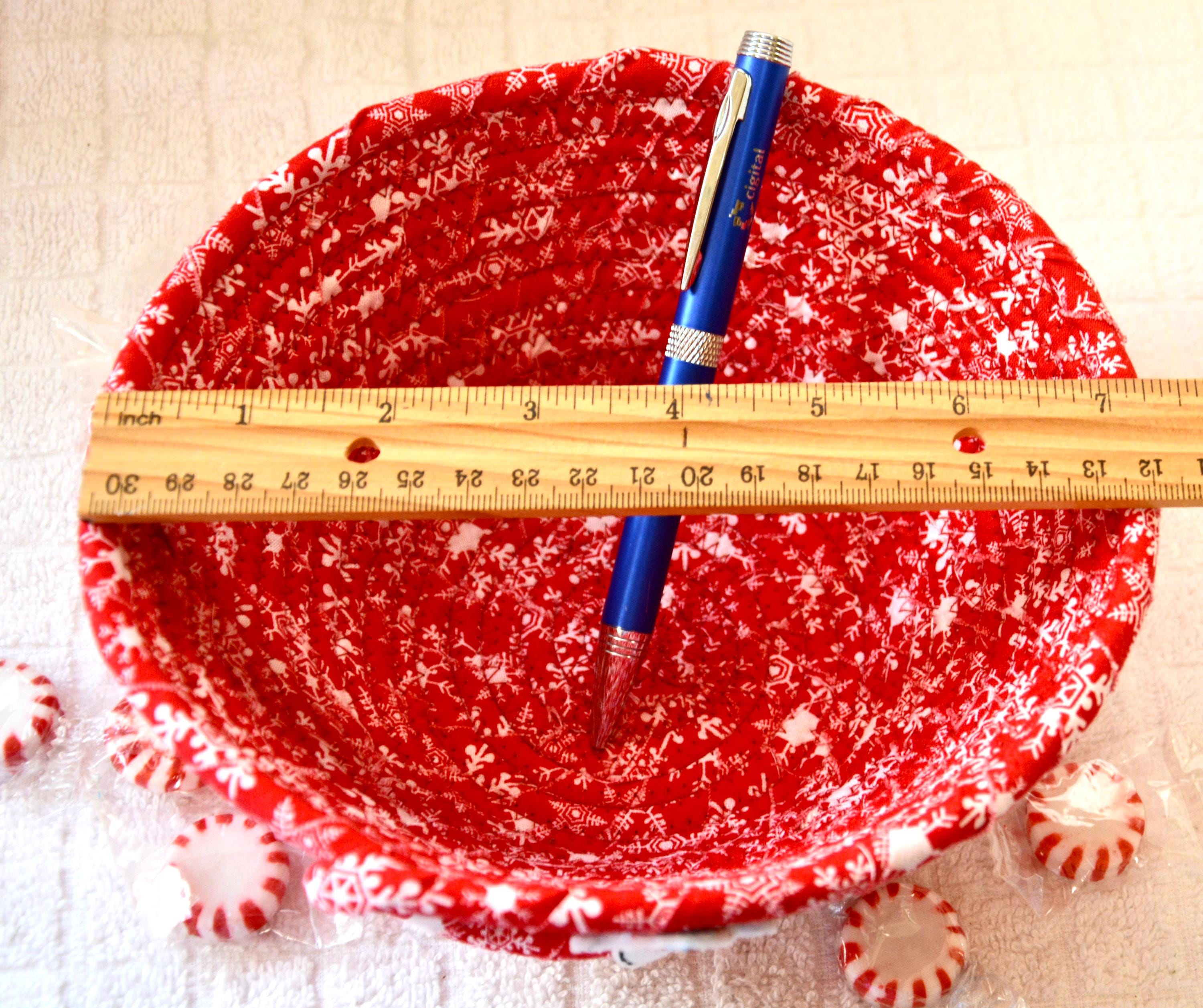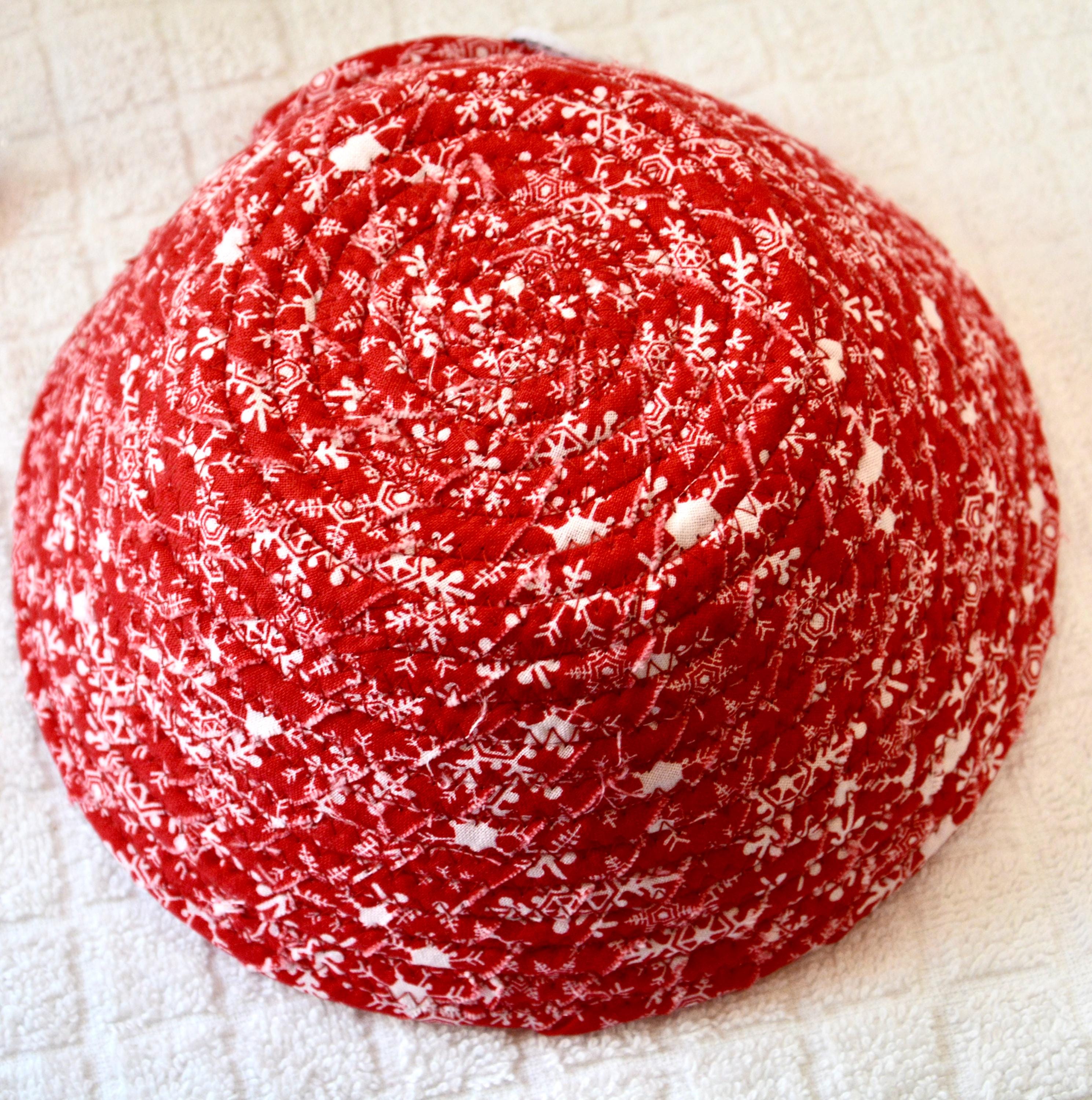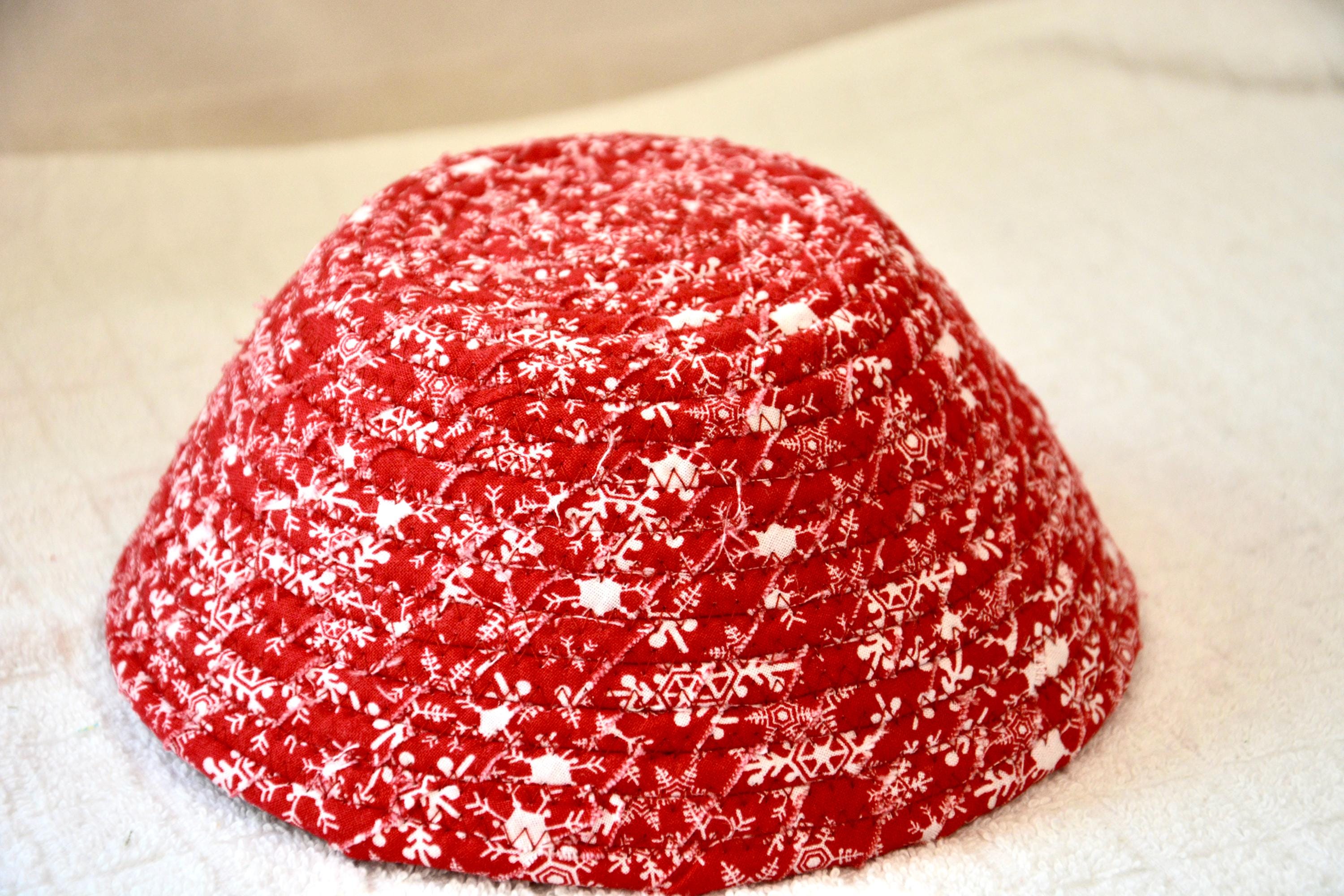 I hand wrapped this high quality fabric around cotton line, which I then hand coiled and machine quilted to make it sturdy. I used the raw edge technique with some fray to add a wonderful shabby chic texture. The cute snowman on the basket is included for a nice accent.