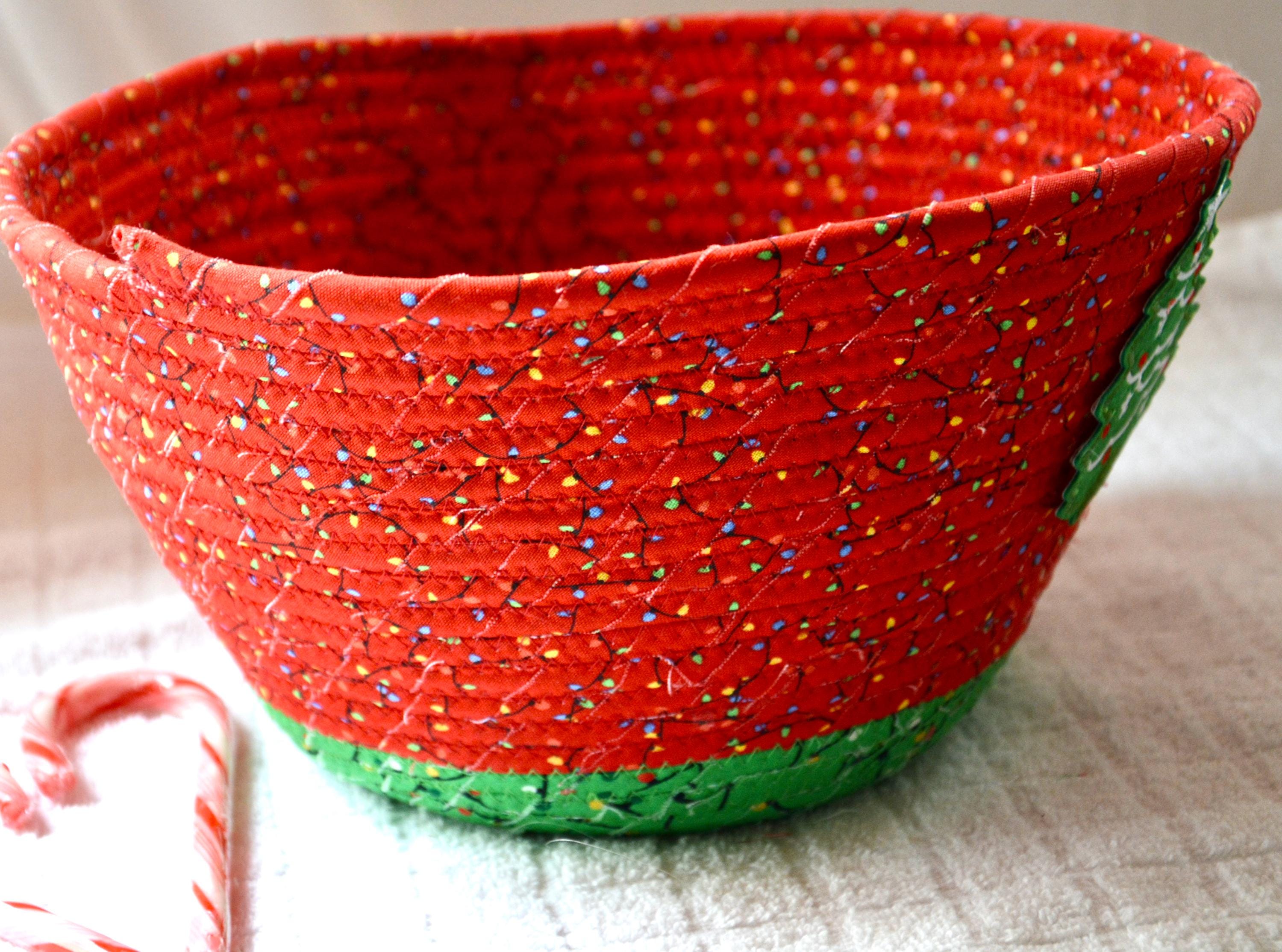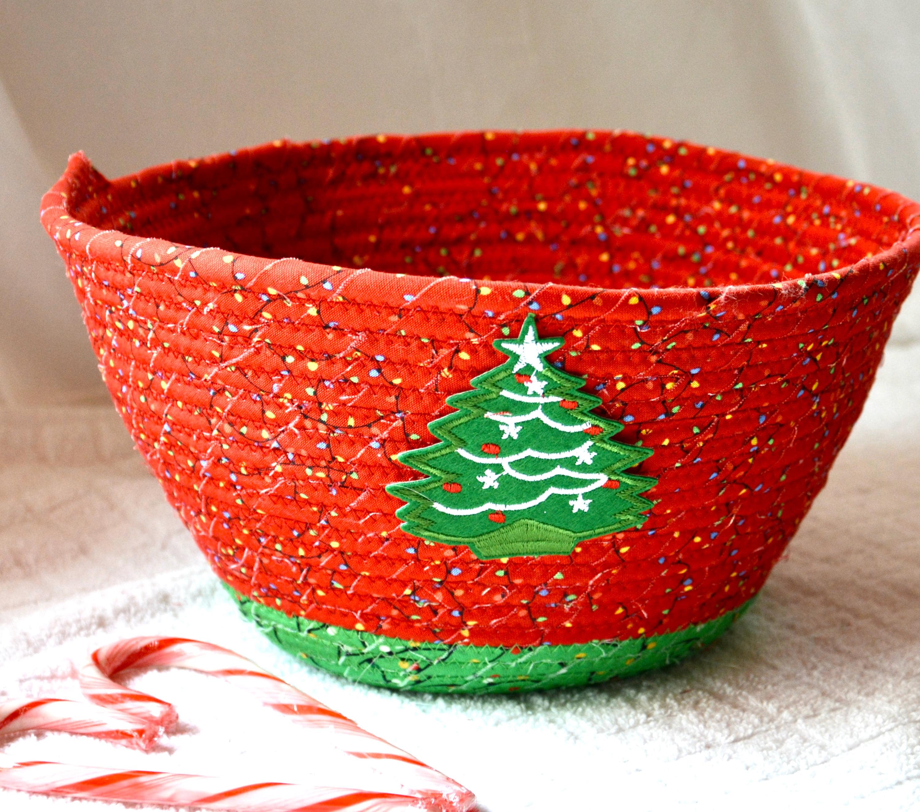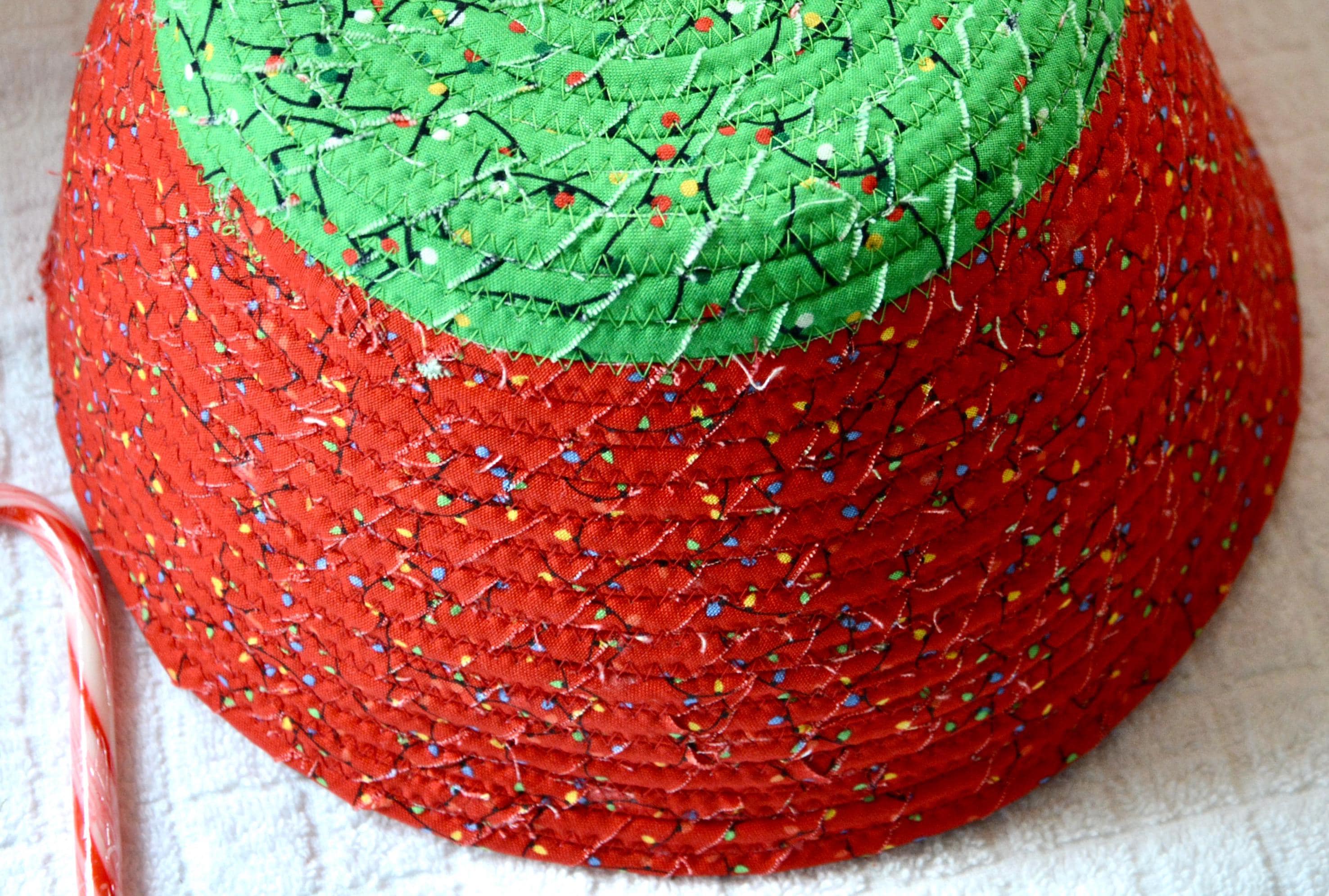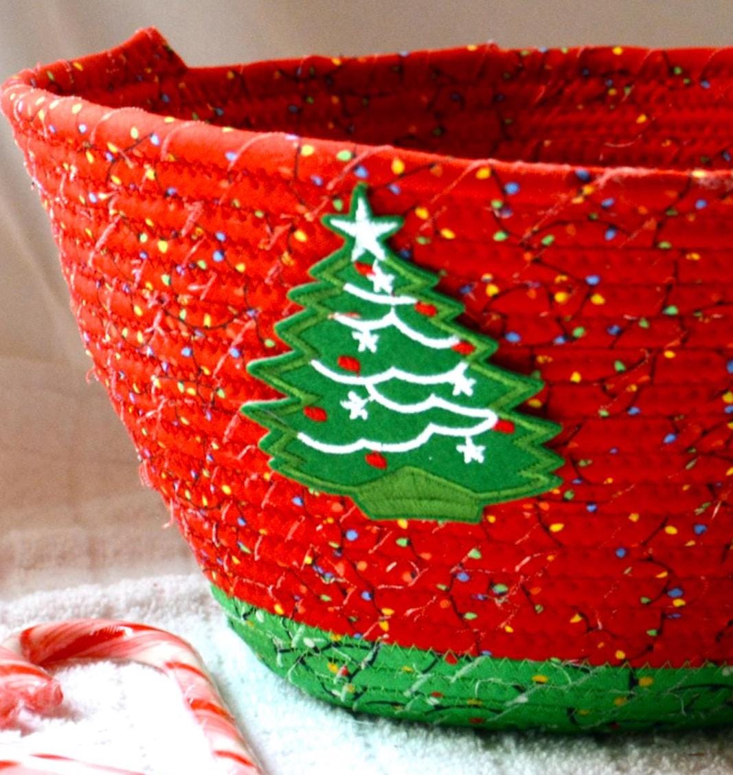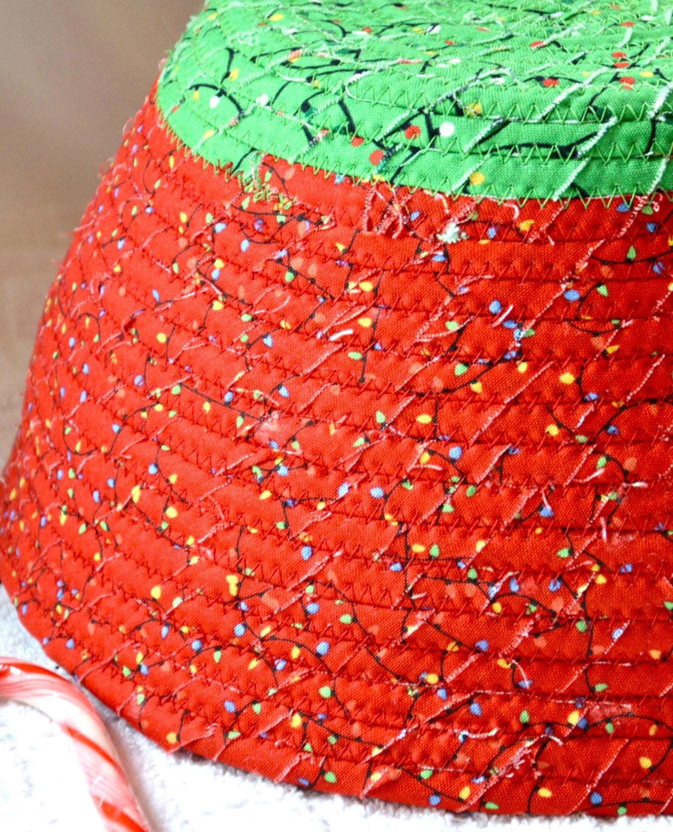 I hand wrapped these high quality Christmas lights fabrics around cotton line, which I then hand coiled and machine quilted to make it sturdy. I used the raw edge technique with some fray to add a wonderful shabby chic texture. I just love the colorful highlights in both fabrics! So festive! The green Christmas Tree applique on the basket is included for a nice accent.