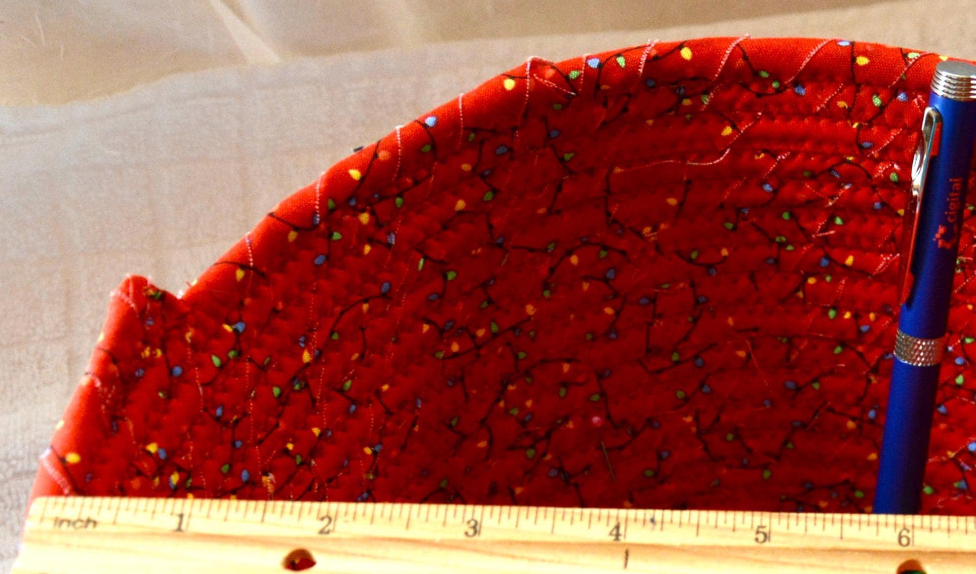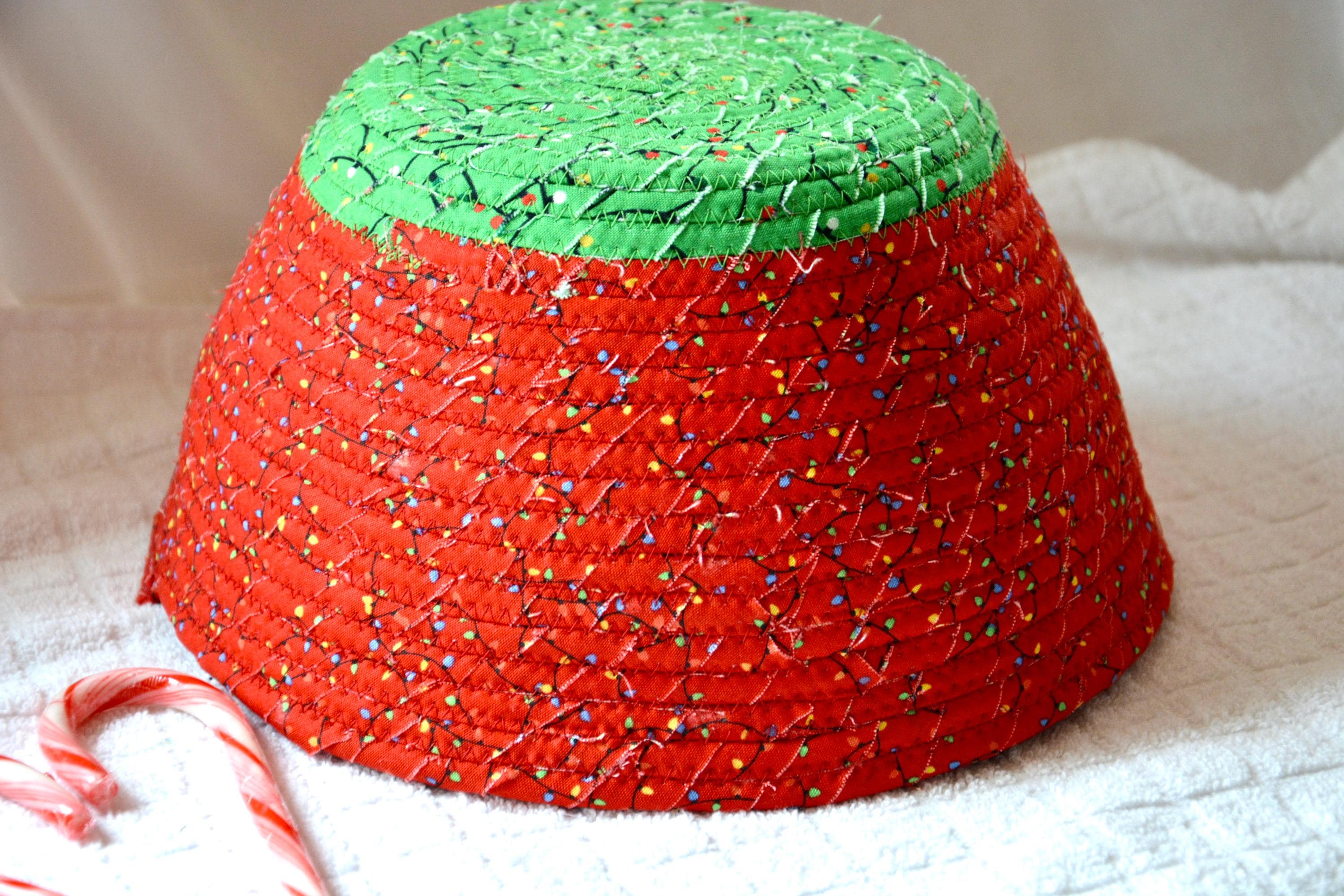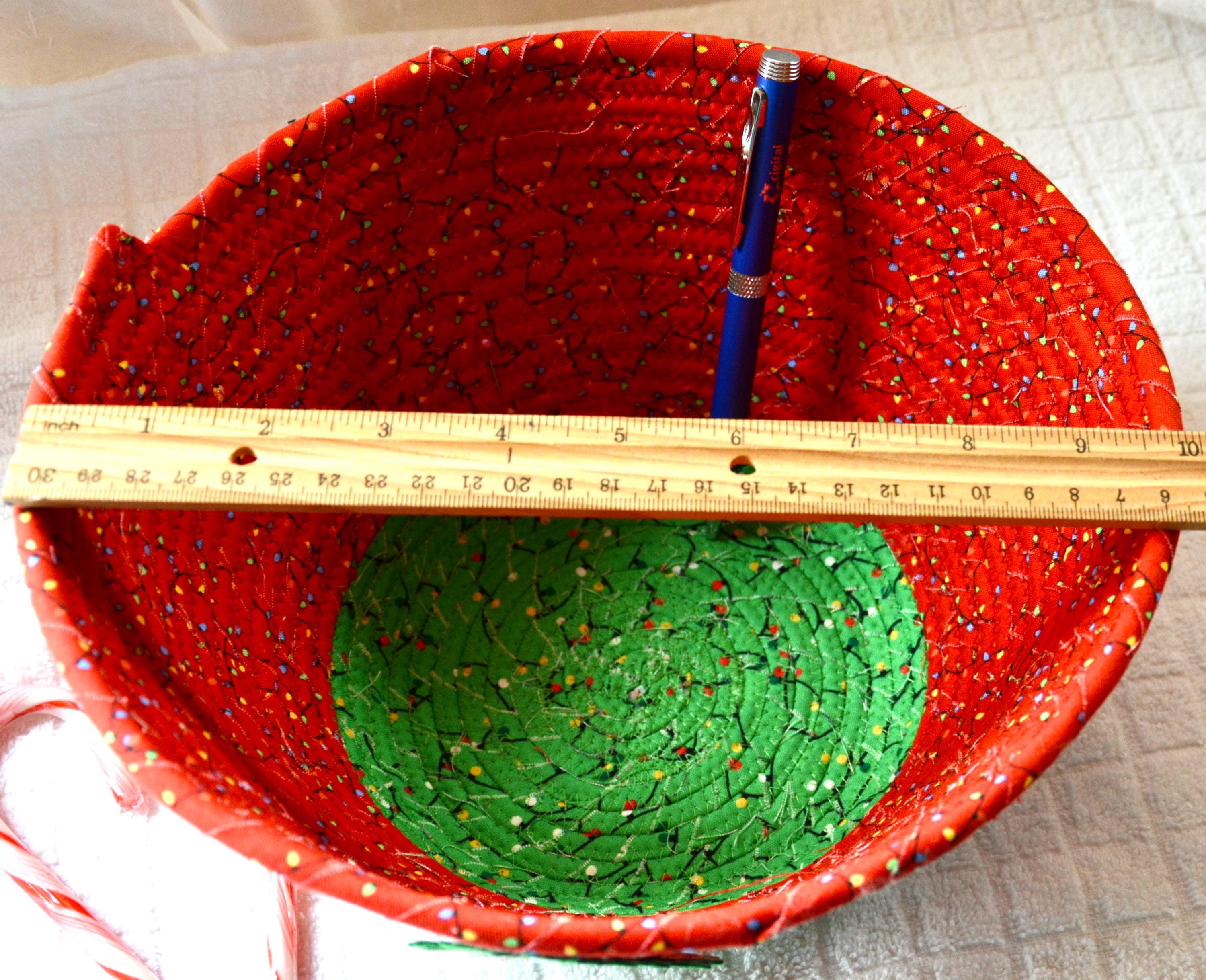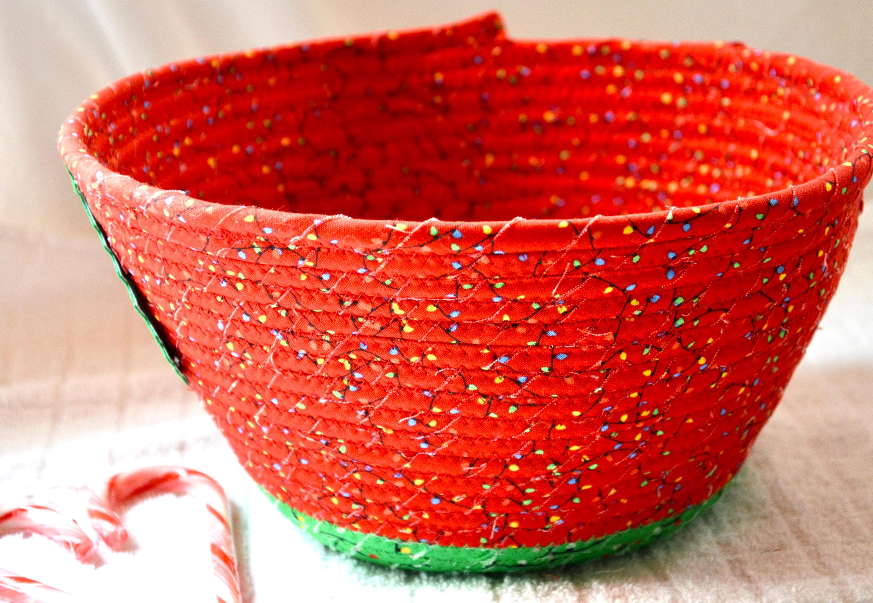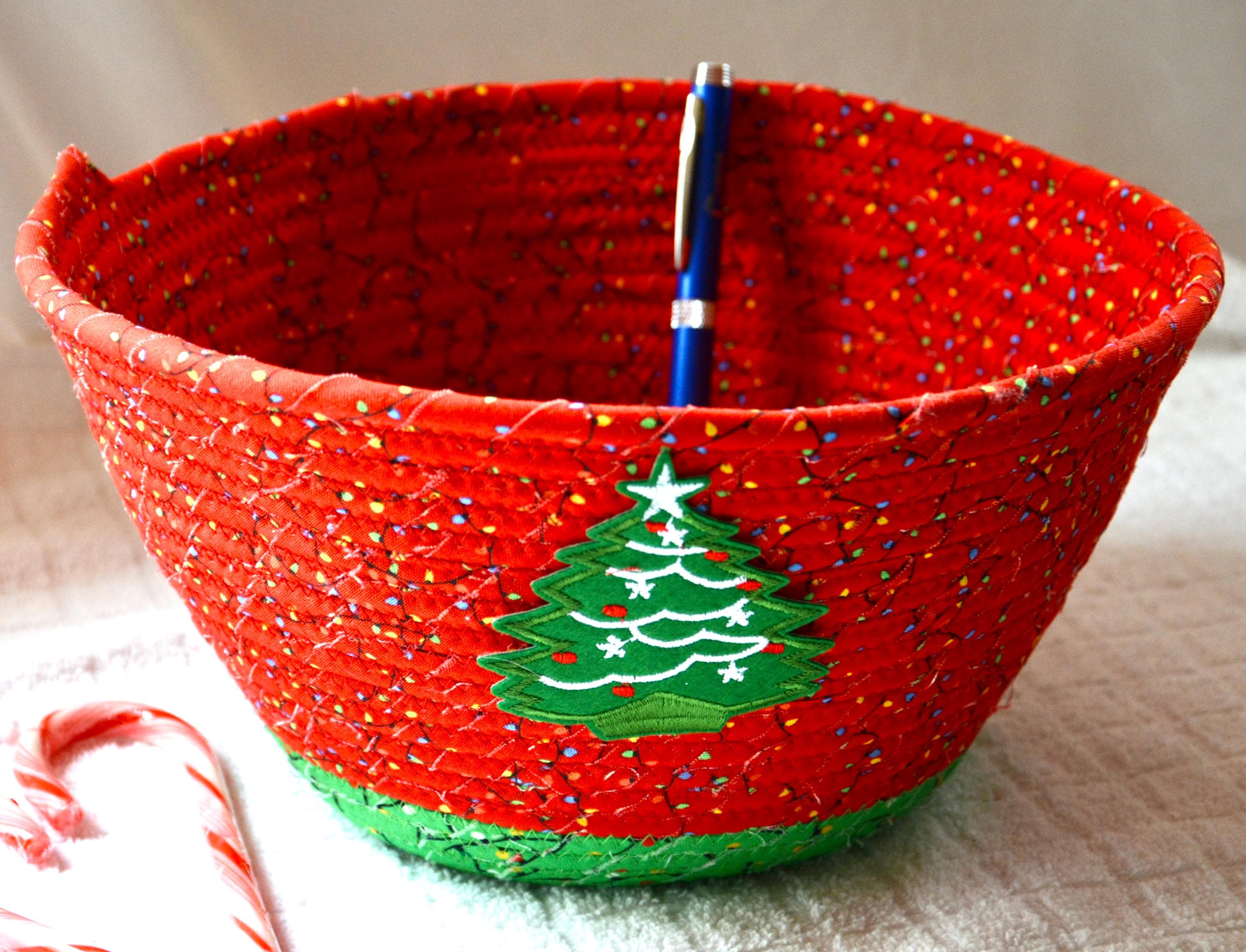 I hand wrapped these high quality Christmas lights fabrics around cotton line, which I then hand coiled and machine quilted to make it sturdy. I used the raw edge technique with some fray to add a wonderful shabby chic texture. I just love the colorful highlights in both fabrics! So festive! The green Christmas Tree applique on the basket is included for a nice accent.