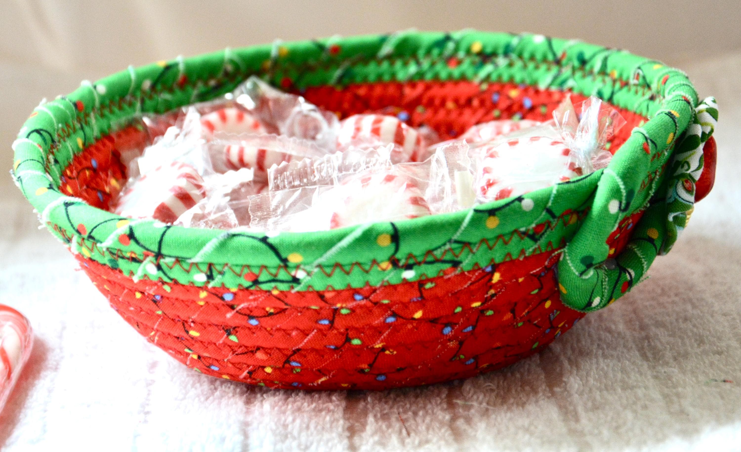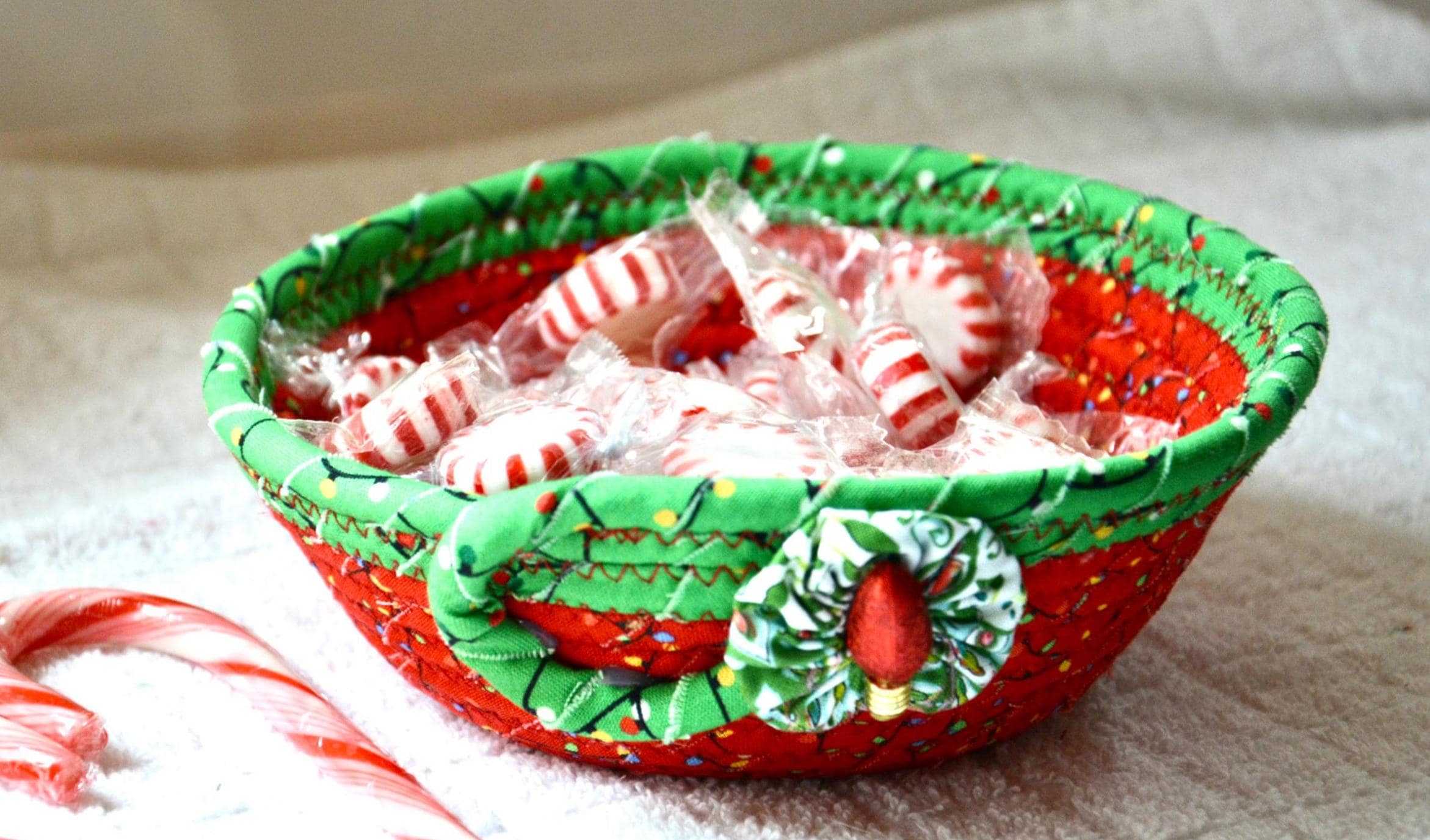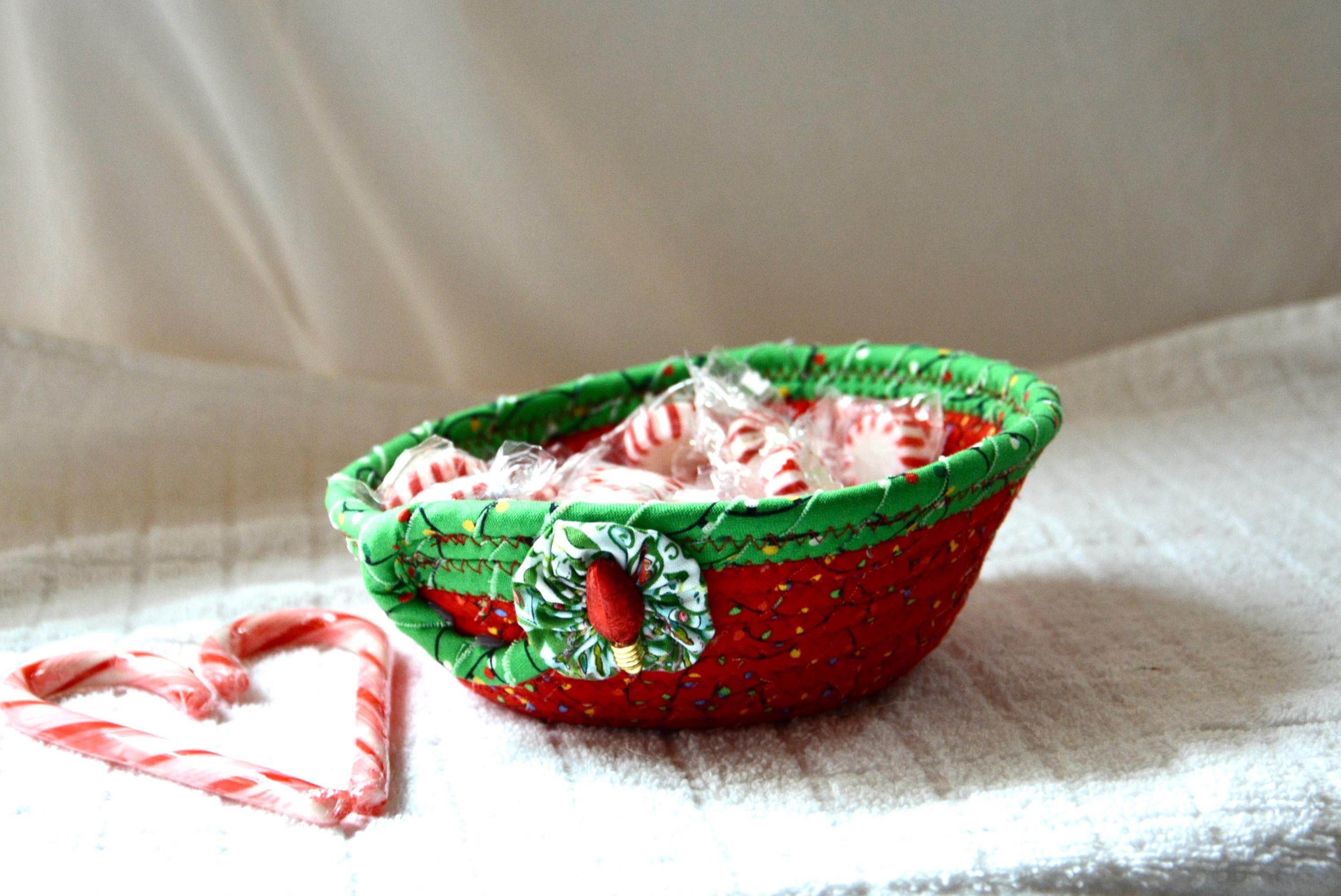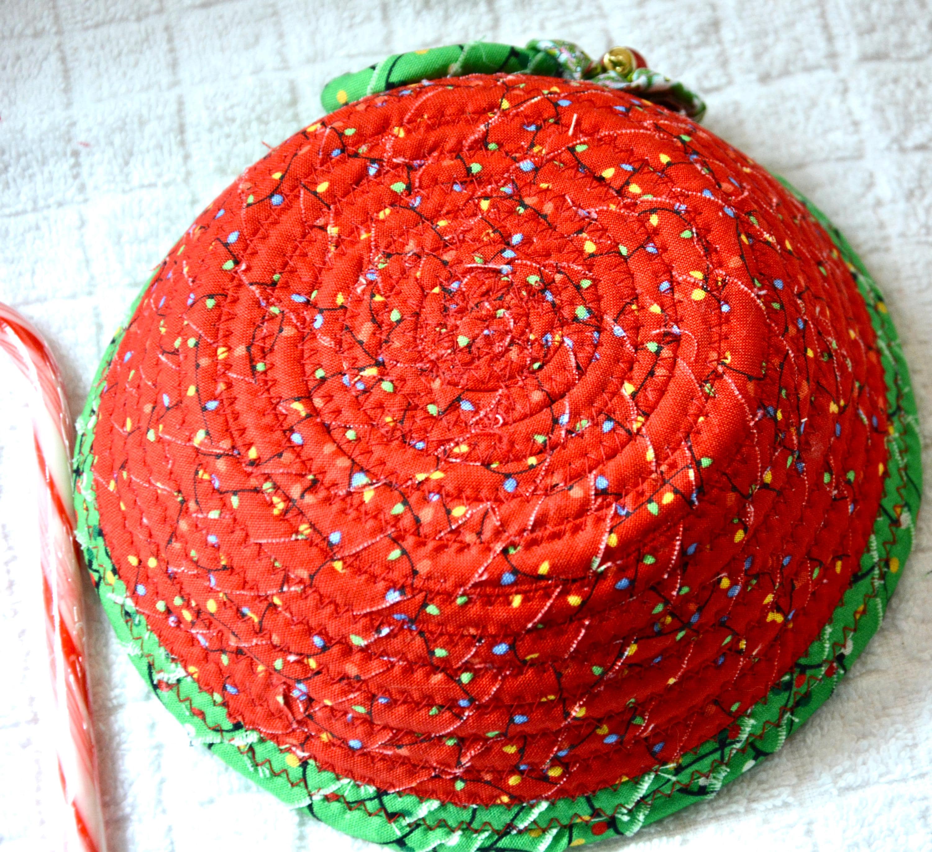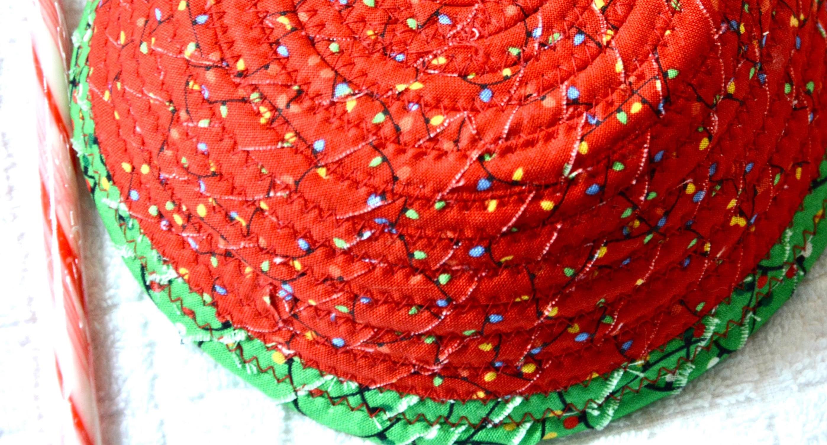 I hand wrapped these high quality Christmas 100% cotton fabrics around cotton line, which I then hand coiled and machine quilted to make it sturdy. I used the raw edge technique with some fray to add a wonderful shabby chic texture.