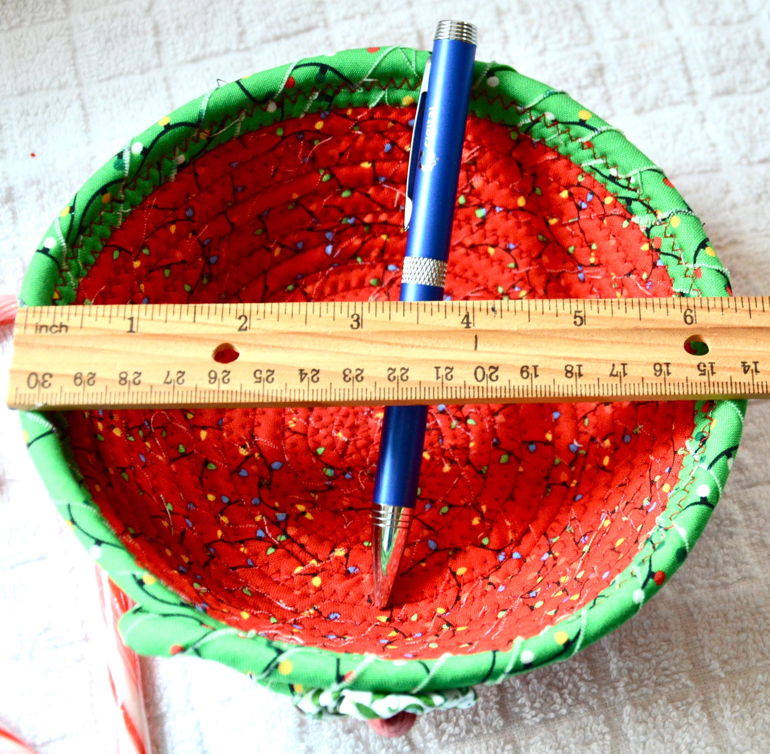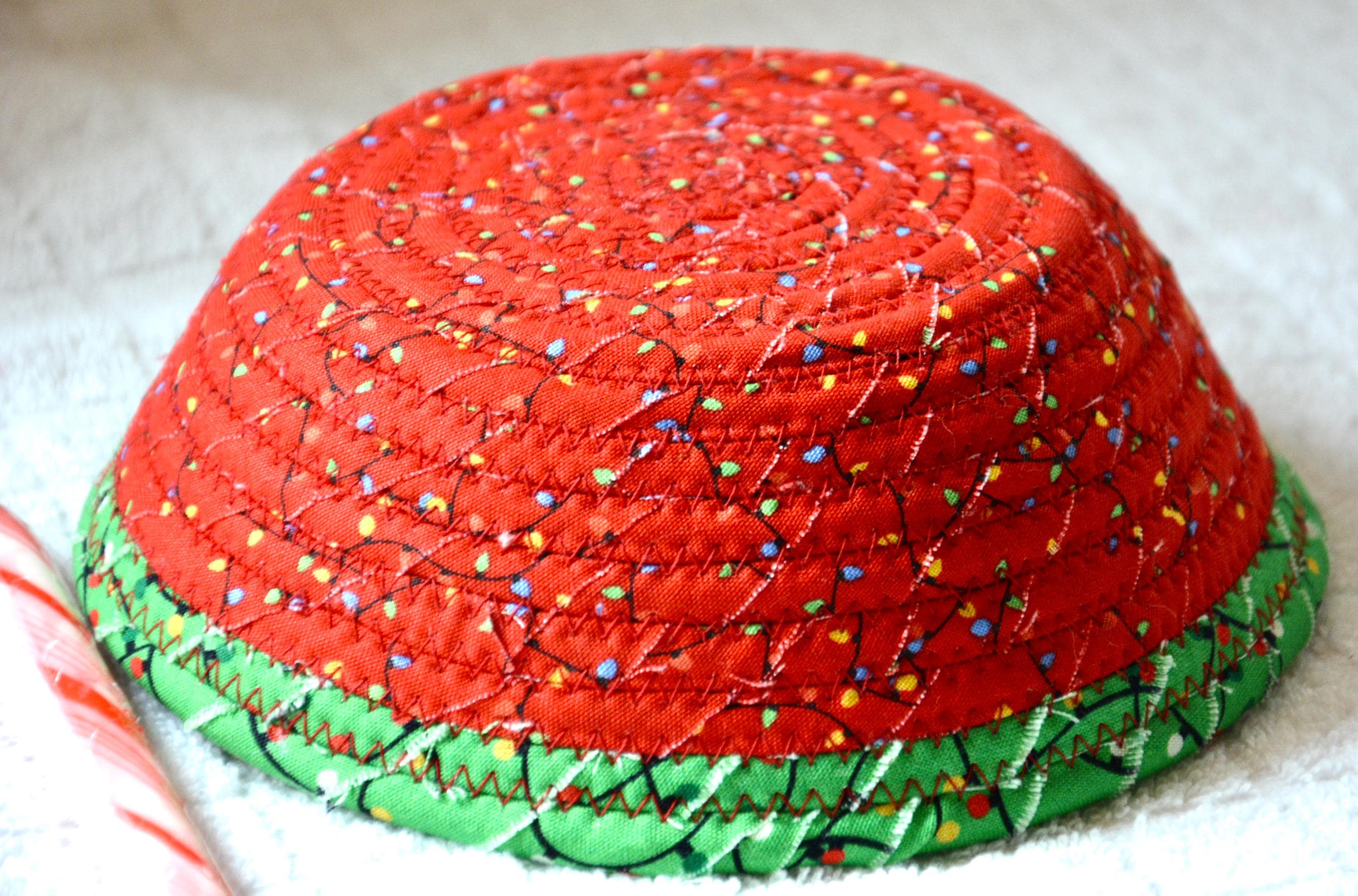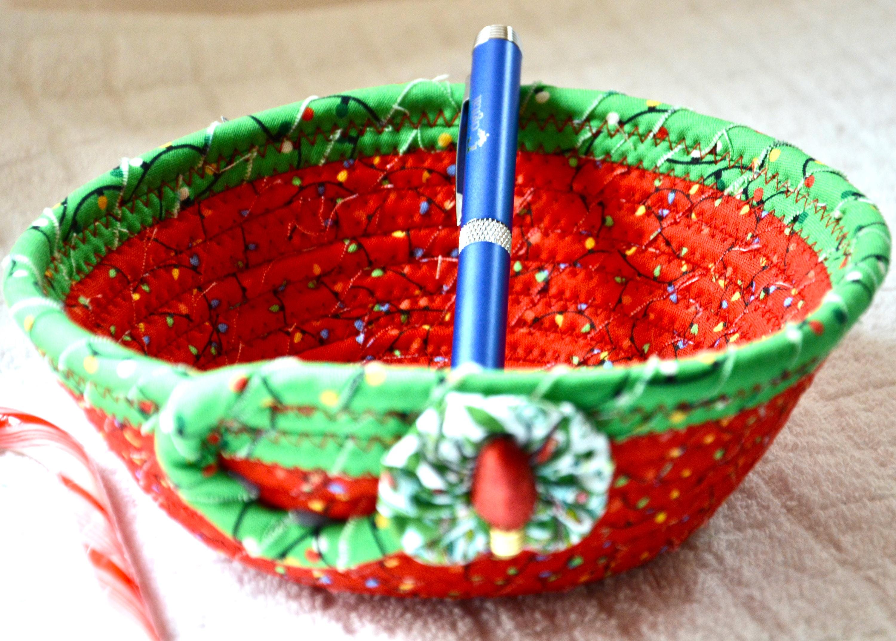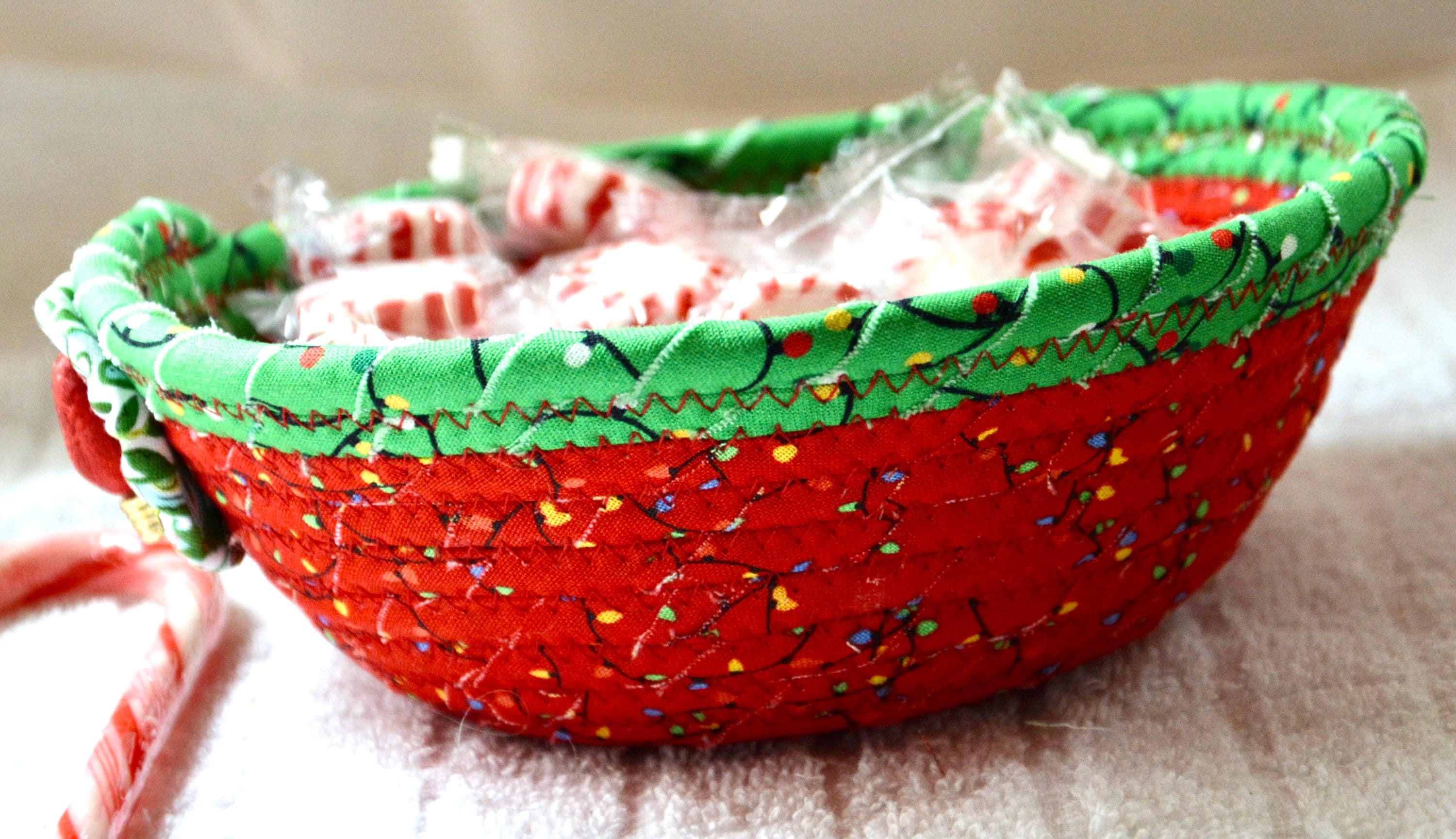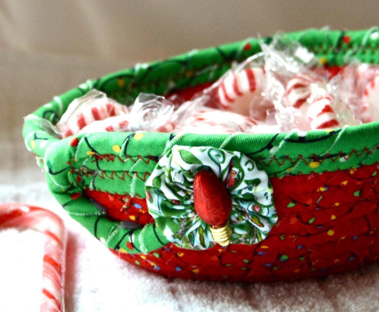 I hand wrapped these high quality Christmas 100% cotton fabrics around cotton line, which I then hand coiled and machine quilted to make it sturdy. I used the raw edge technique with some fray to add a wonderful shabby chic texture.