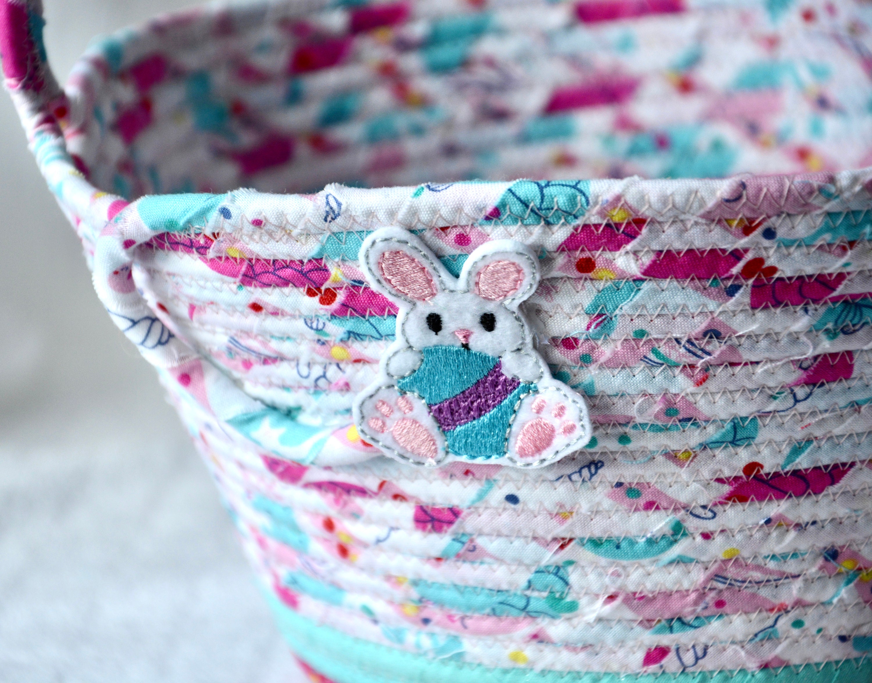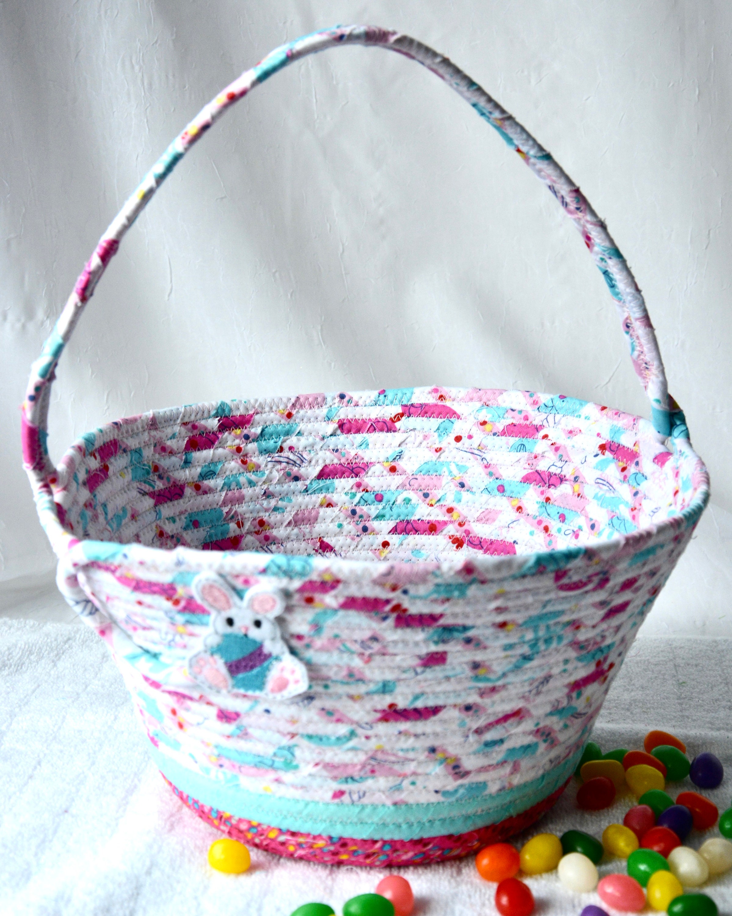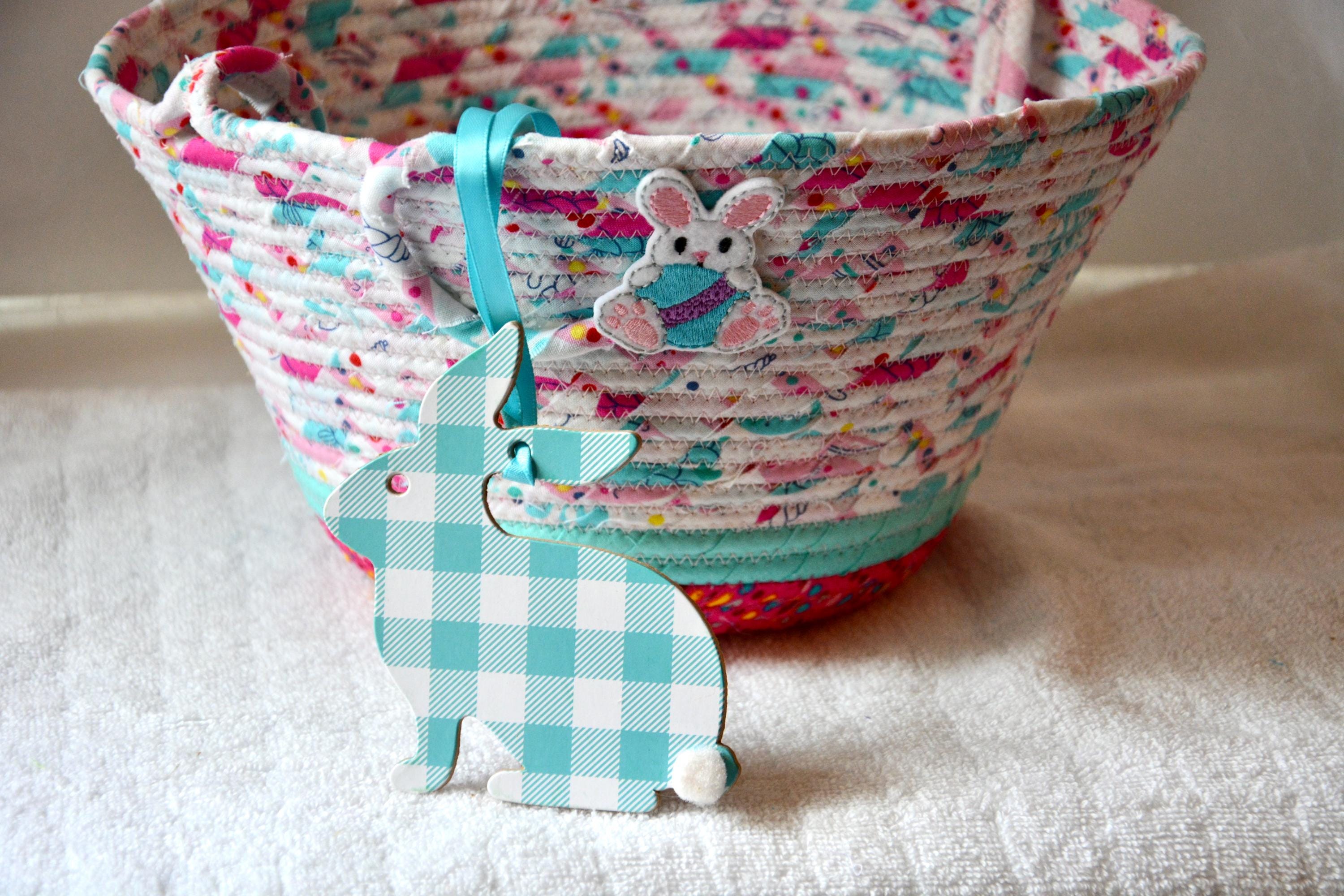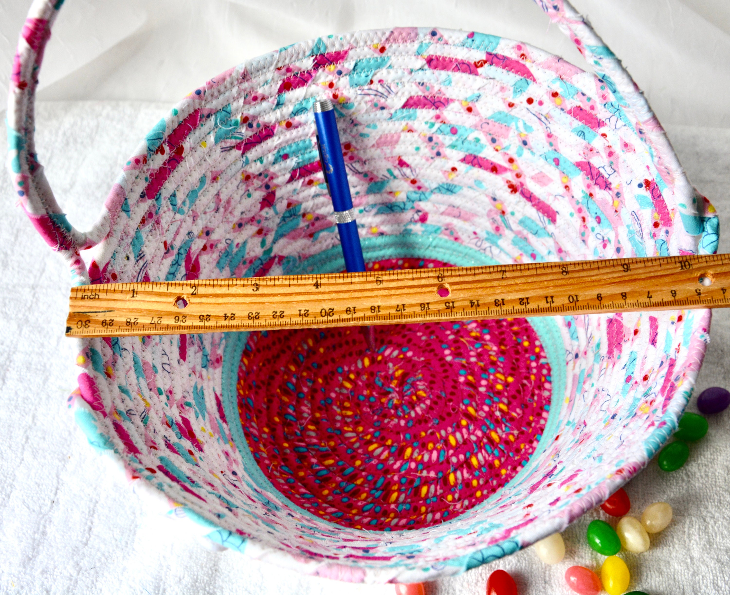 I hand wrapped these cute pink fabrics around cotton line, which I then hand coiled and machine sewed to make it sturdy. I used the raw edge technique with a little fray for a nice shabby chic texture. The cute felted bunny on the basket is included for a nice accent. I just love these pretty Easter fabrics, all are 100% cotton and all show on the inside of the basket too!