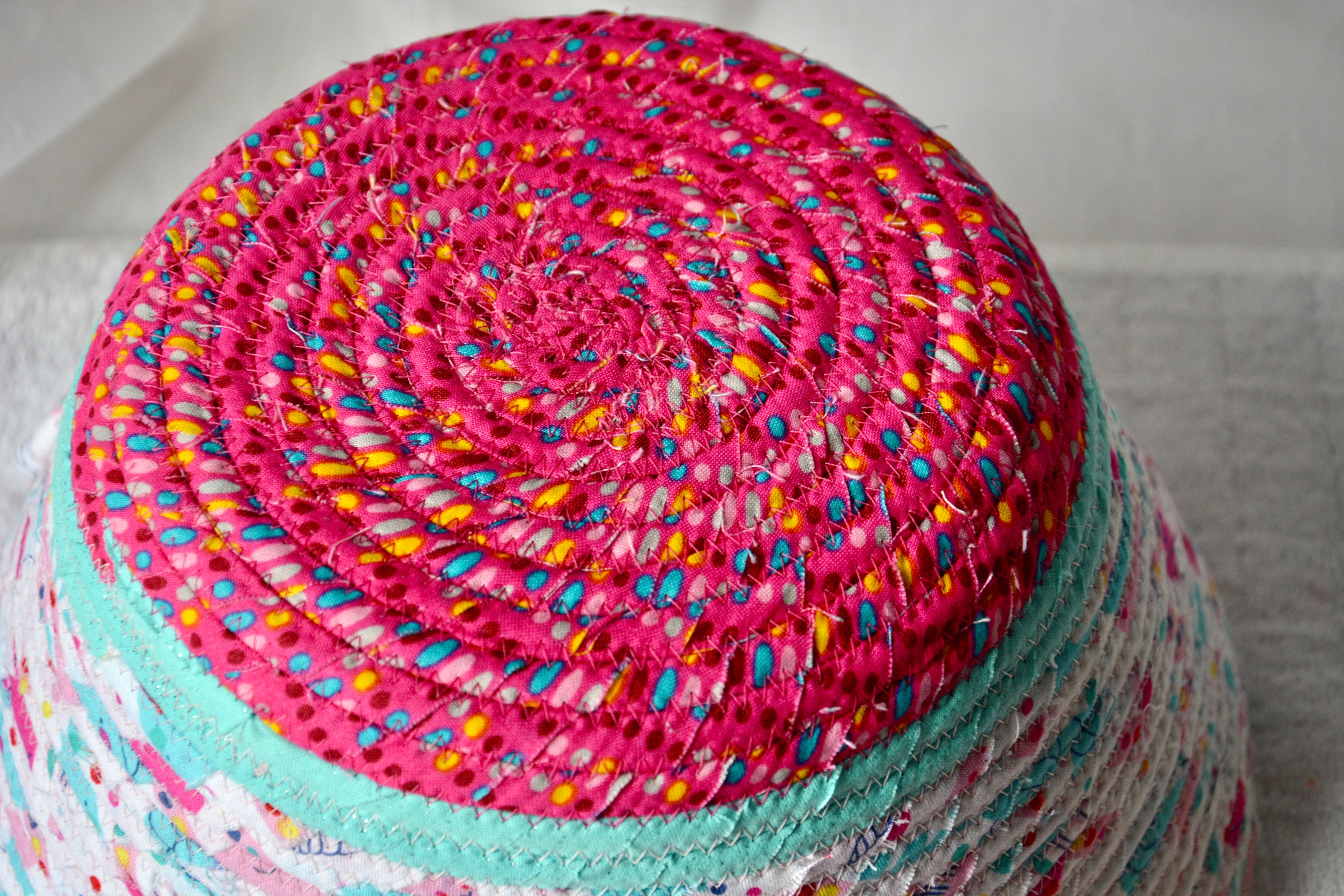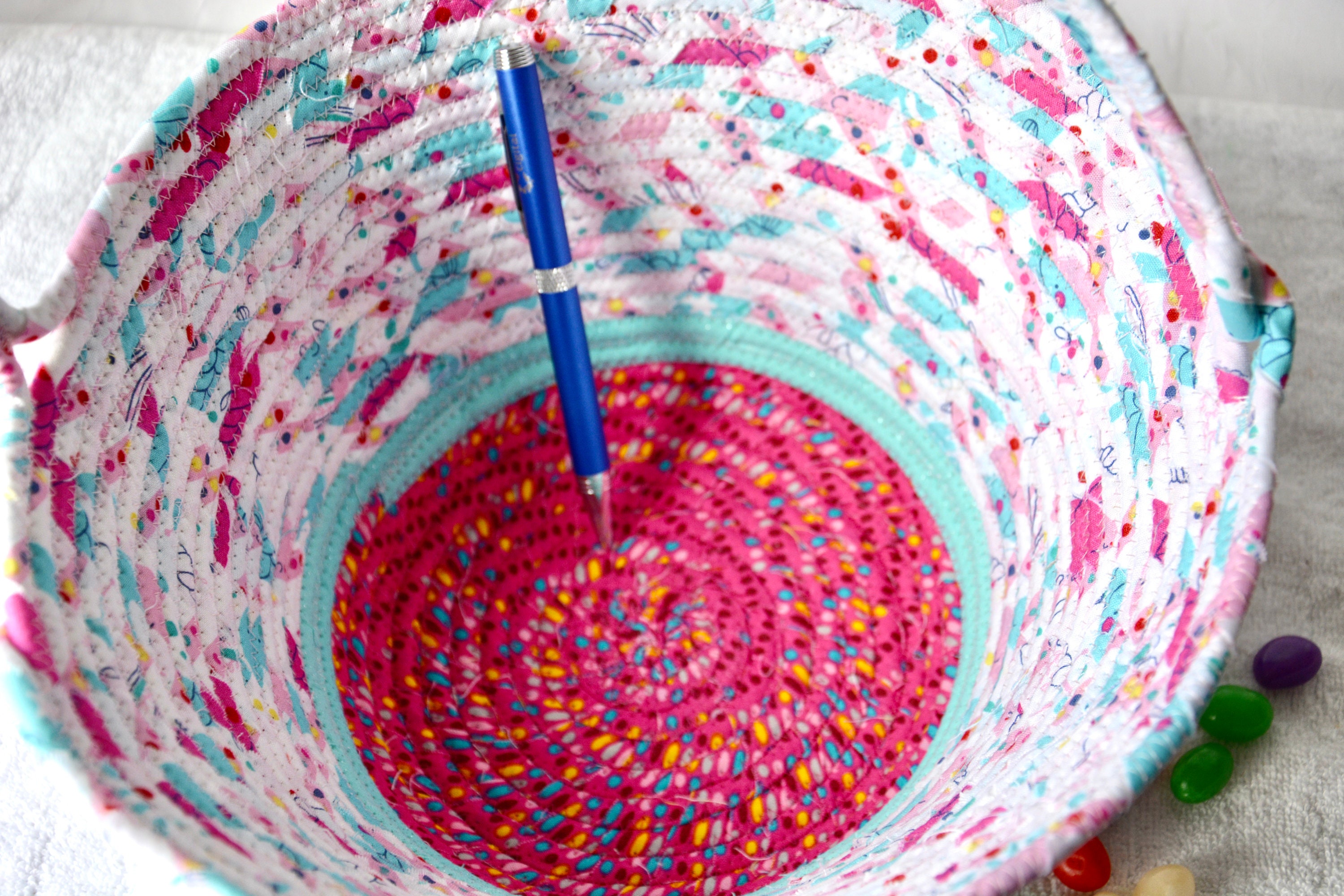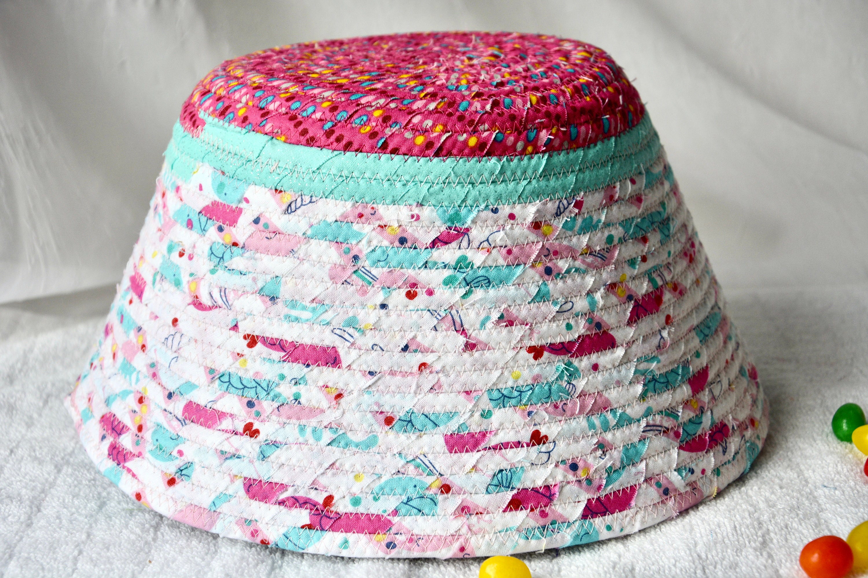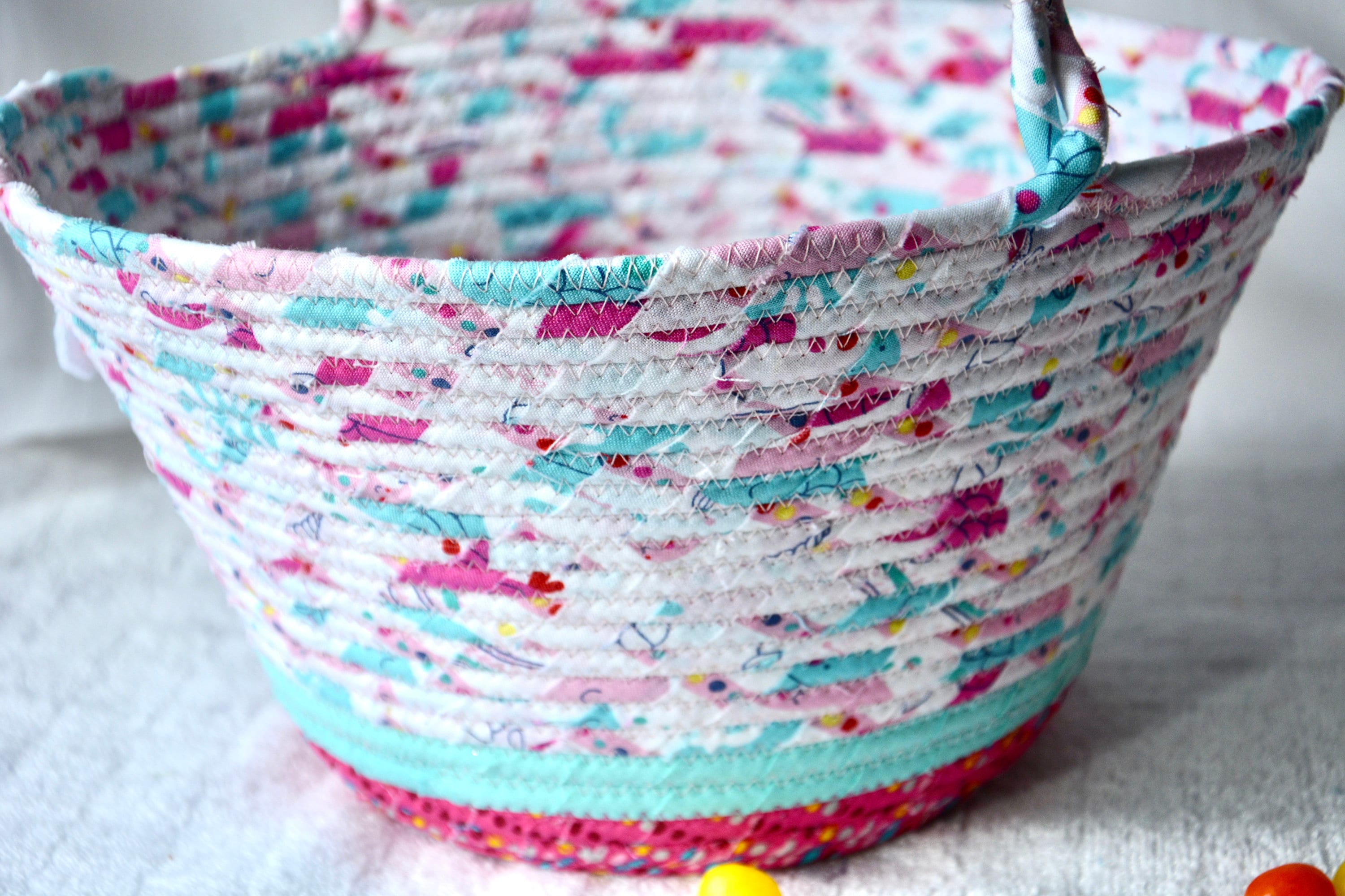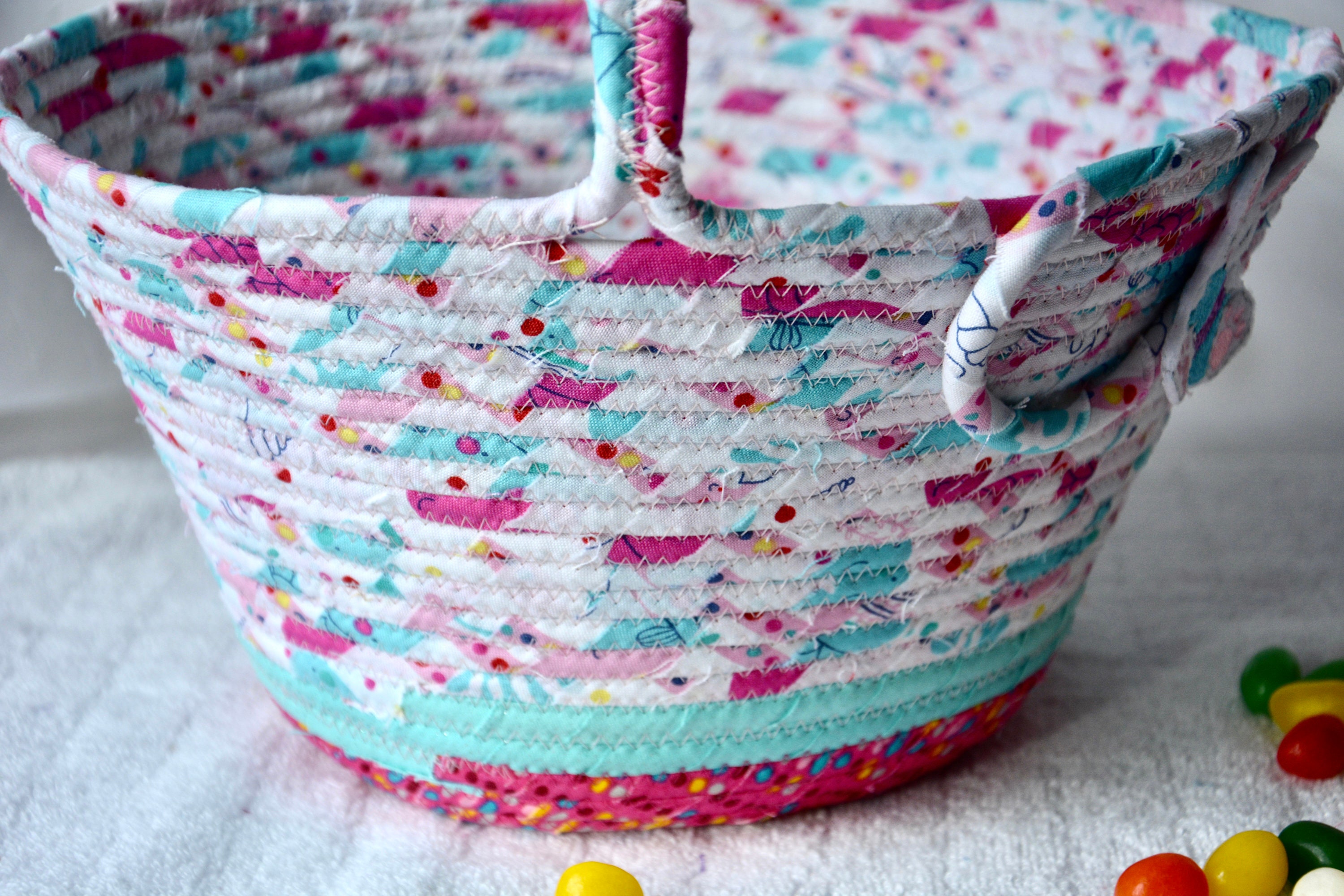 I hand wrapped these cute pink fabrics around cotton line, which I then hand coiled and machine sewed to make it sturdy. I used the raw edge technique with a little fray for a nice shabby chic texture. The cute felted bunny on the basket is included for a nice accent. I just love these pretty Easter fabrics, all are 100% cotton and all show on the inside of the basket too!