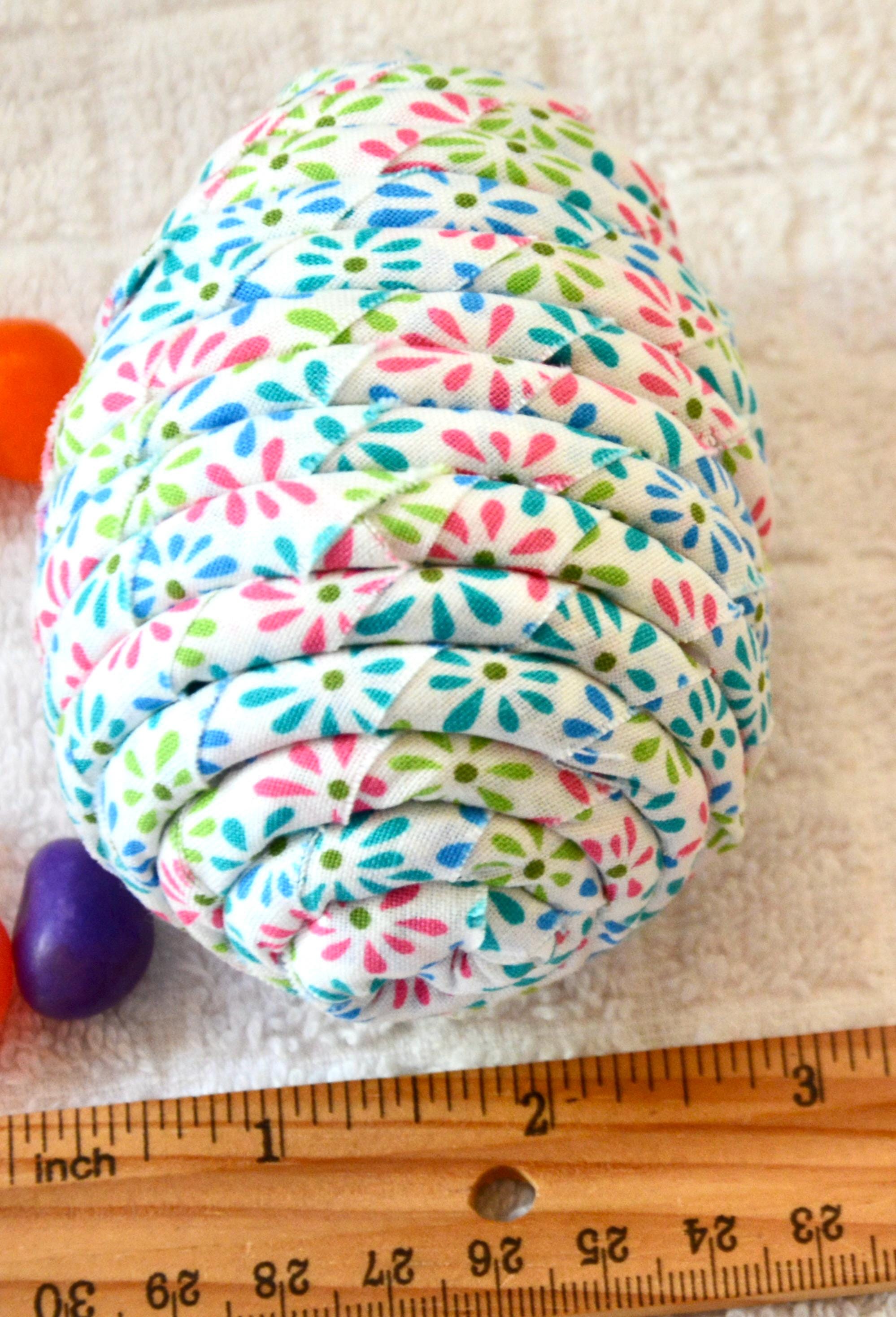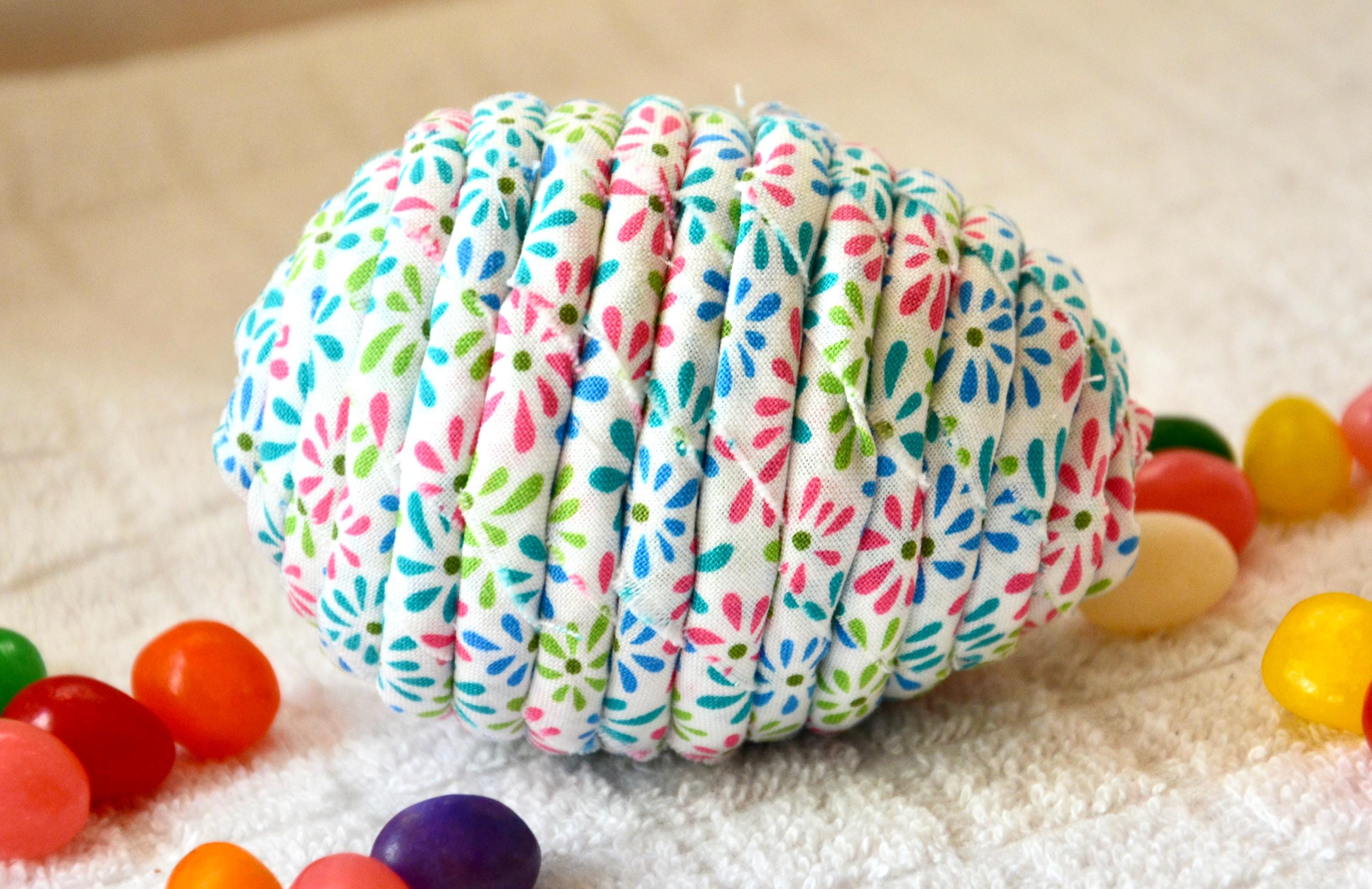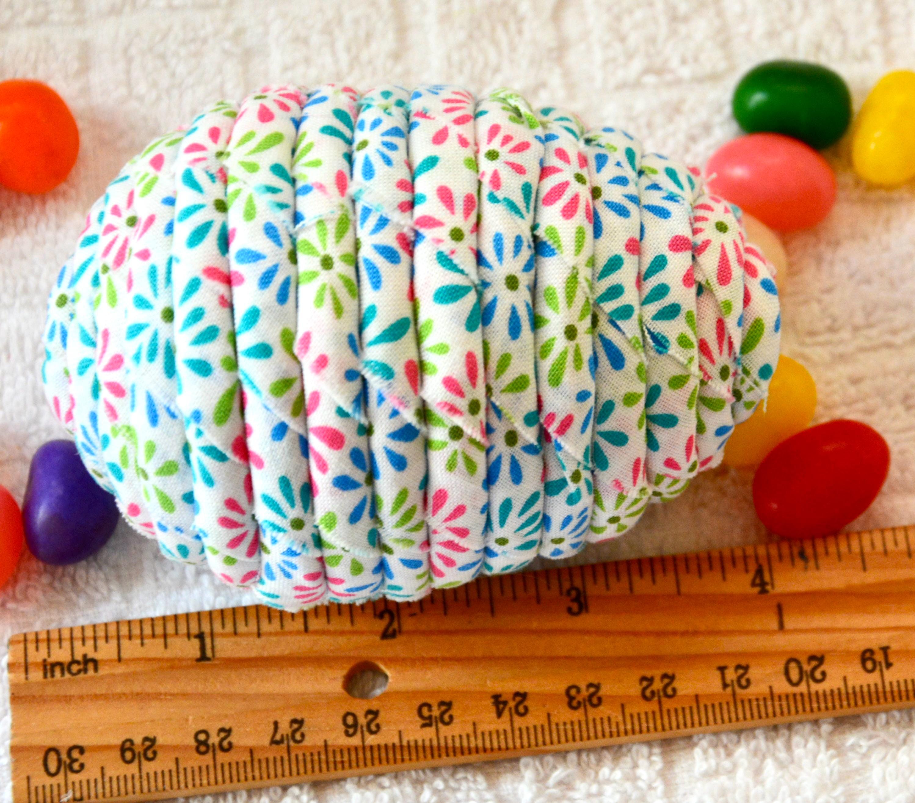 I hand wrapped this cute blue floral fabric around cotton line which I than hand coiled into an Easter Egg shape. The fabric edge is unfinished for a lovely shabby chic texture.