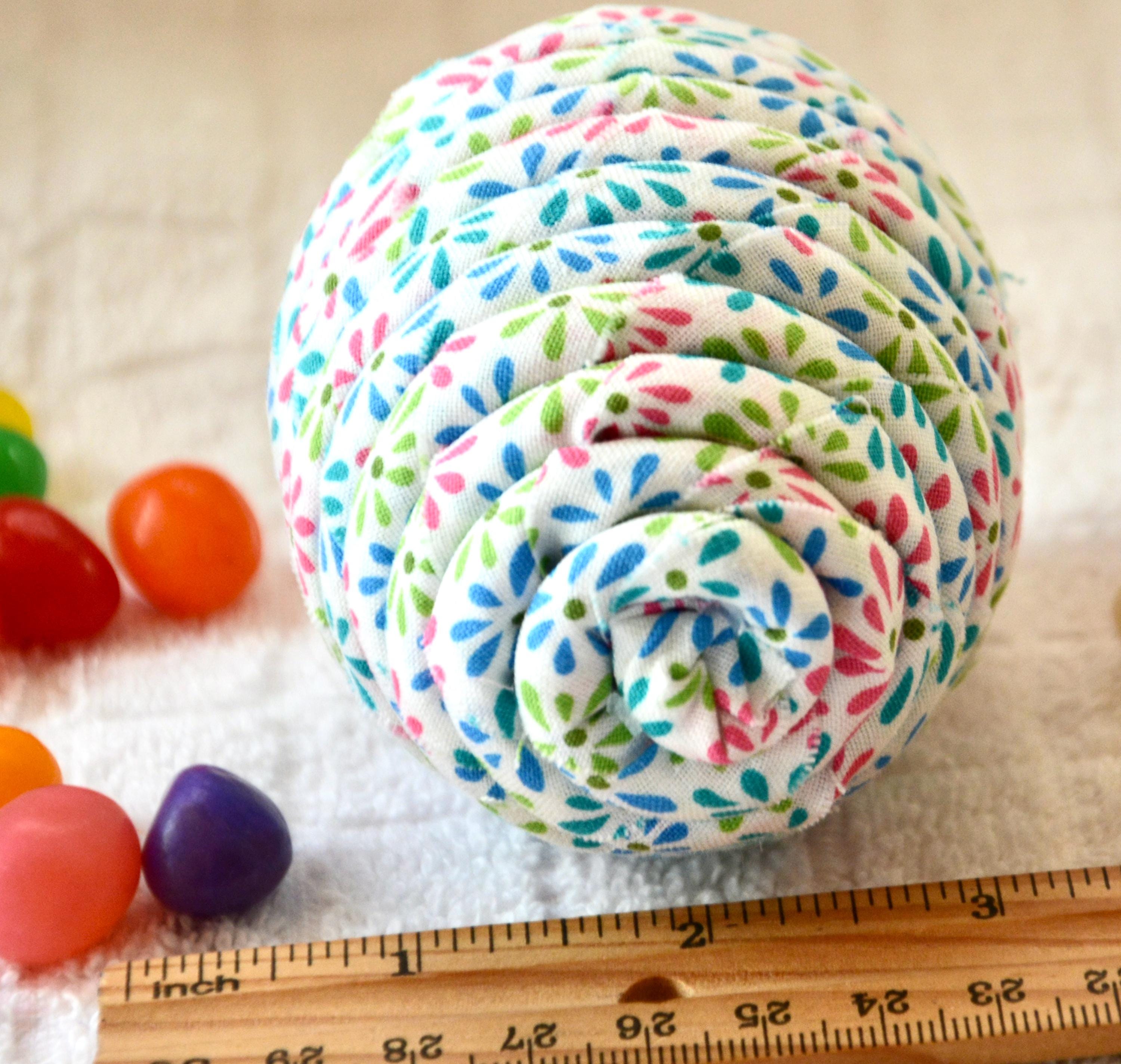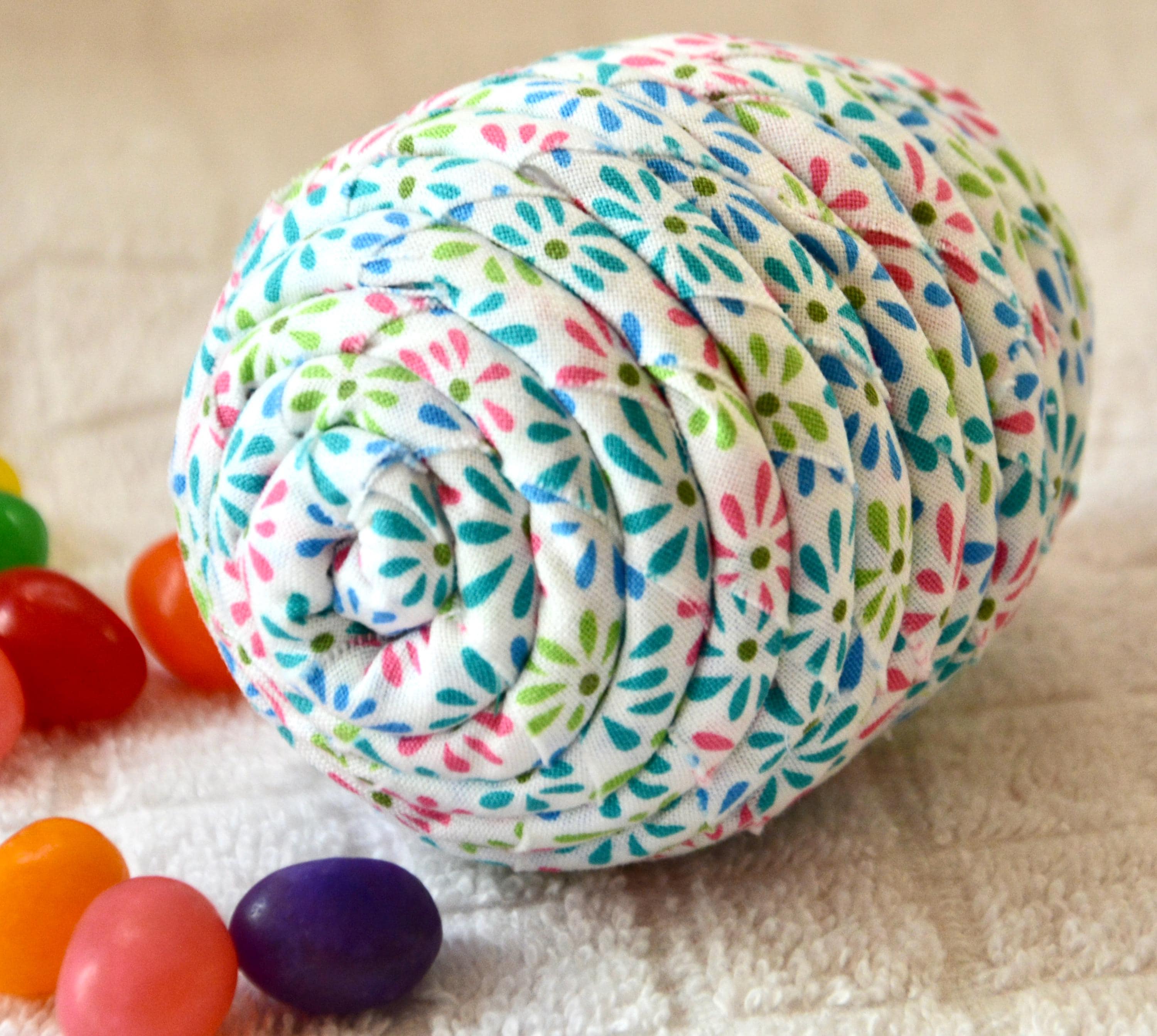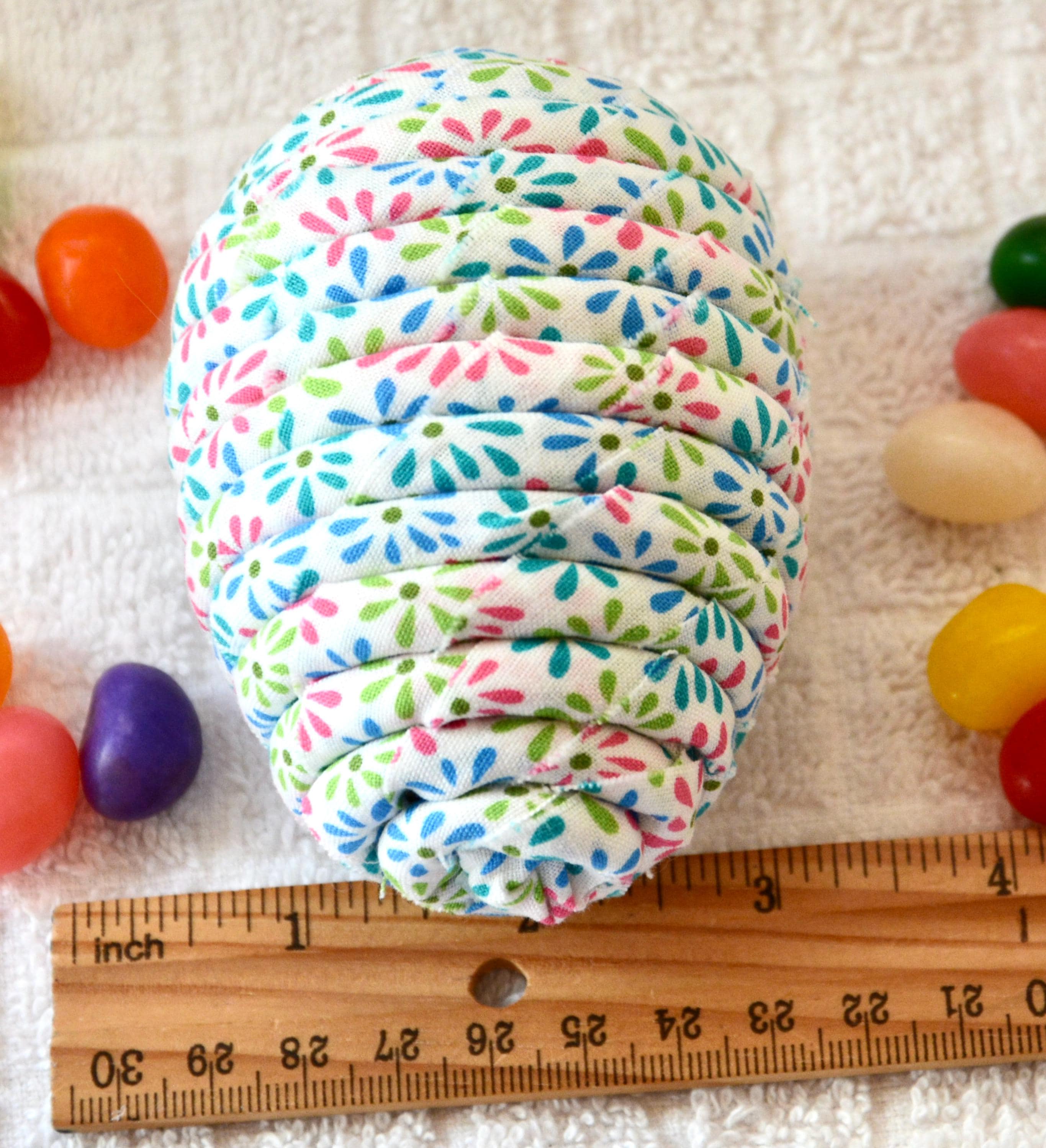 I hand wrapped this cute blue floral fabric around cotton line which I than hand coiled into an Easter Egg shape. The fabric edge is unfinished for a lovely shabby chic texture.