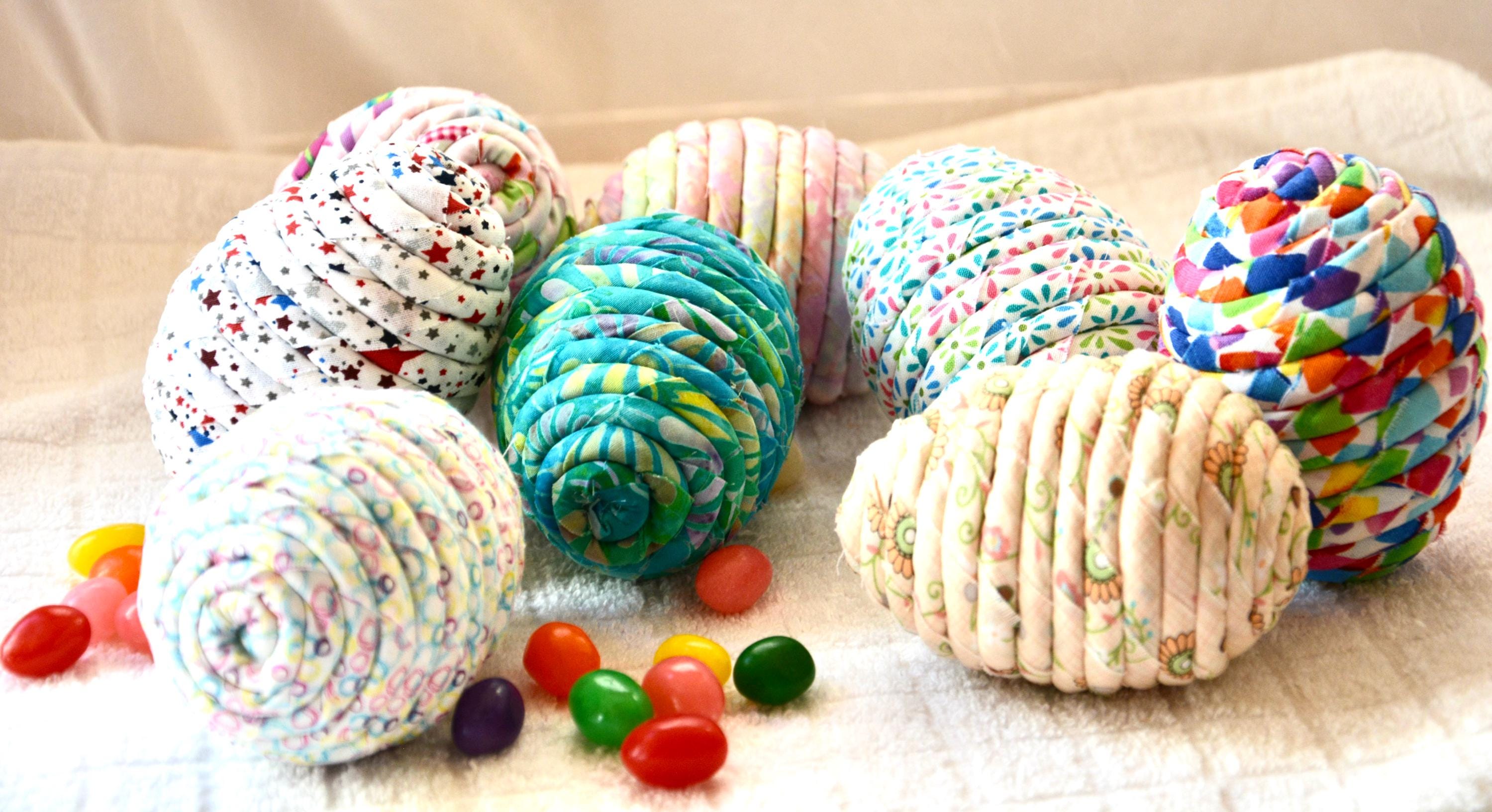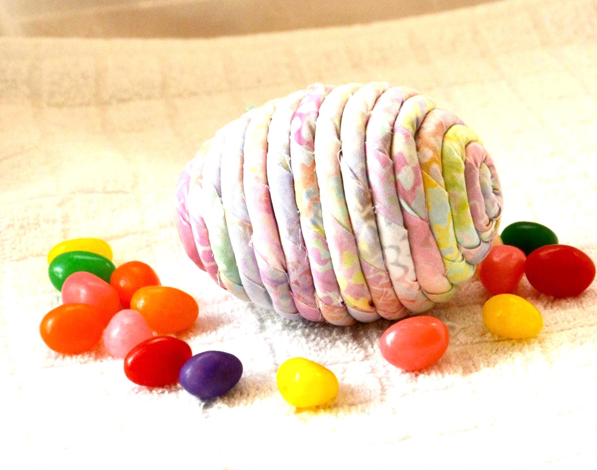 I hand wrapped this lovely pastel batik fabric around cotton line which I then hand coiled into an Egg shape. The fabric edge is unfinished for a lovely shabby chic texture. I just love this pretty fabric, it created a unique pattern with cute pink highlights. I designed and created this lovely egg in my smoke free home studio. Bunny, jelly bean, ruler, other egg props not included. Color placement will vary. Egg does not open. Spot clean.