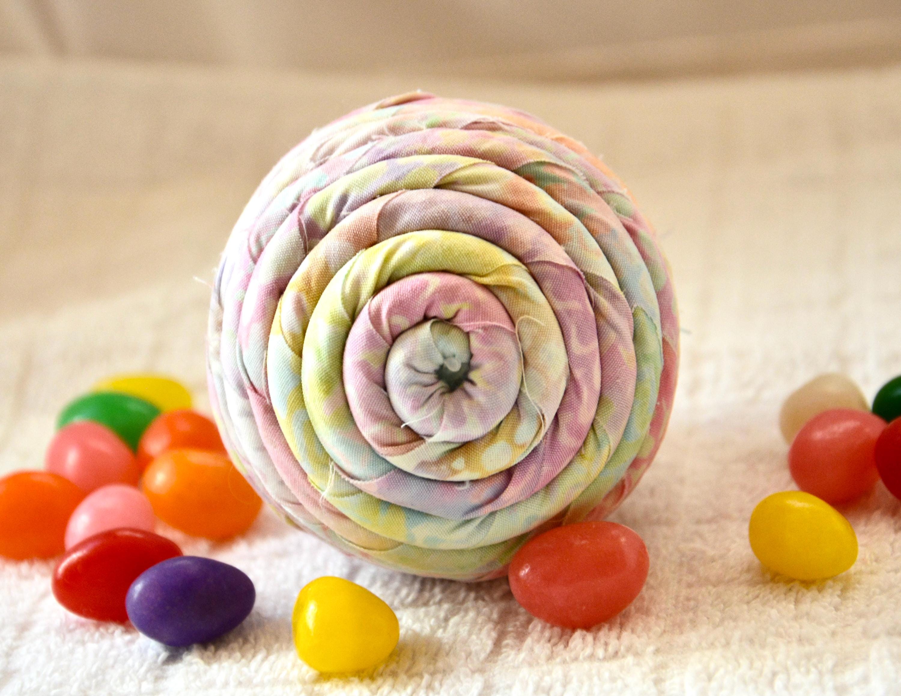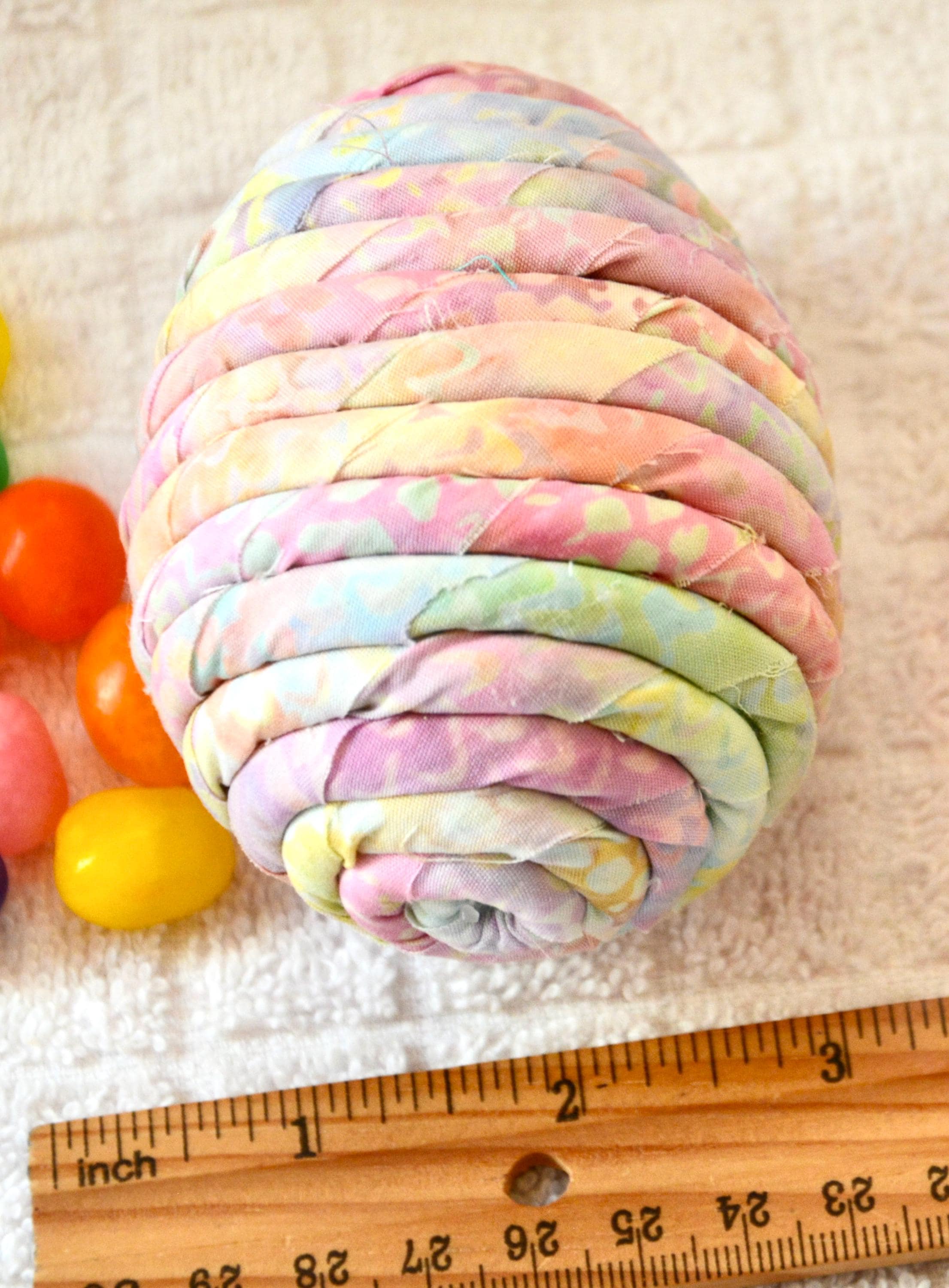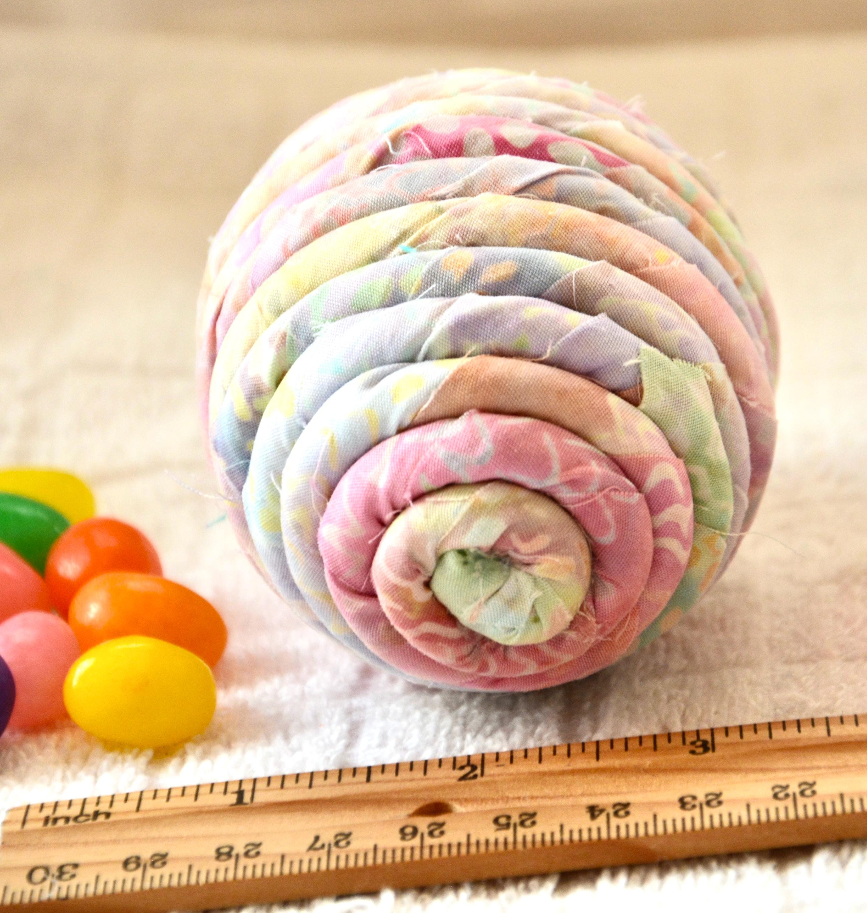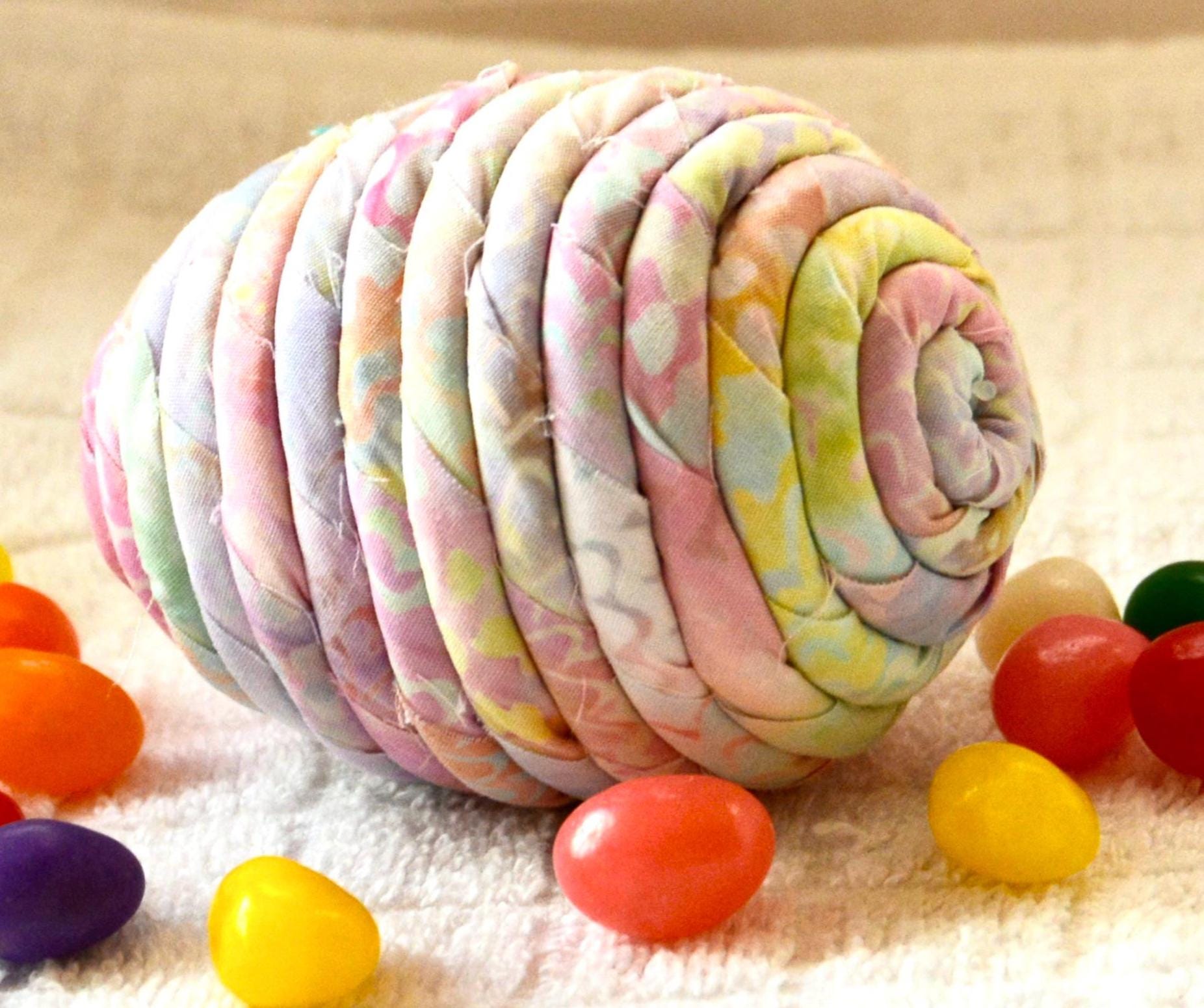 I hand wrapped this lovely pastel batik fabric around cotton line which I then hand coiled into an Egg shape. The fabric edge is unfinished for a lovely shabby chic texture. I just love this pretty fabric, it created a unique pattern with cute pink highlights. I designed and created this lovely egg in my smoke free home studio. Bunny, jelly bean, ruler, other egg props not included. Color placement will vary. Egg does not open. Spot clean.