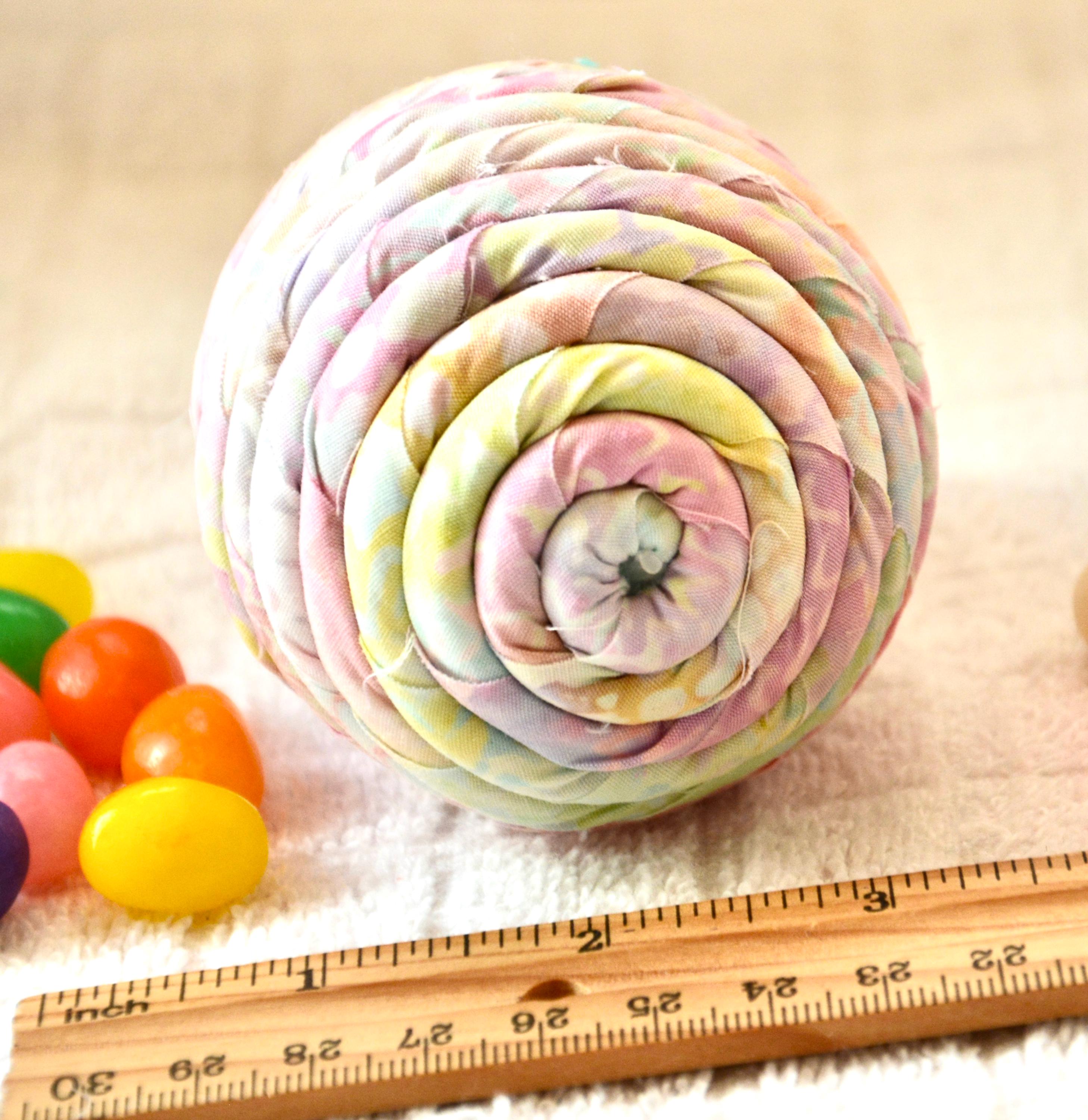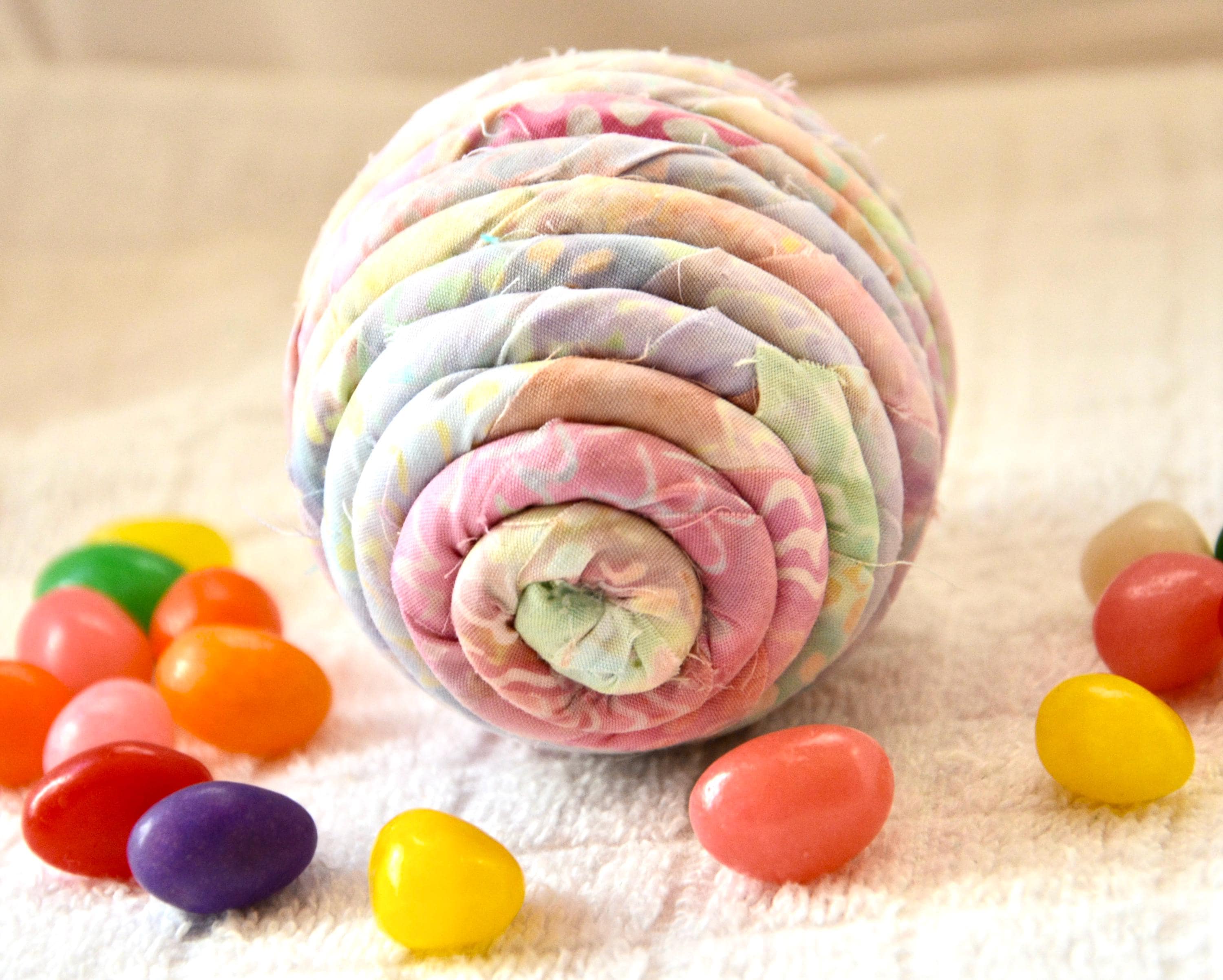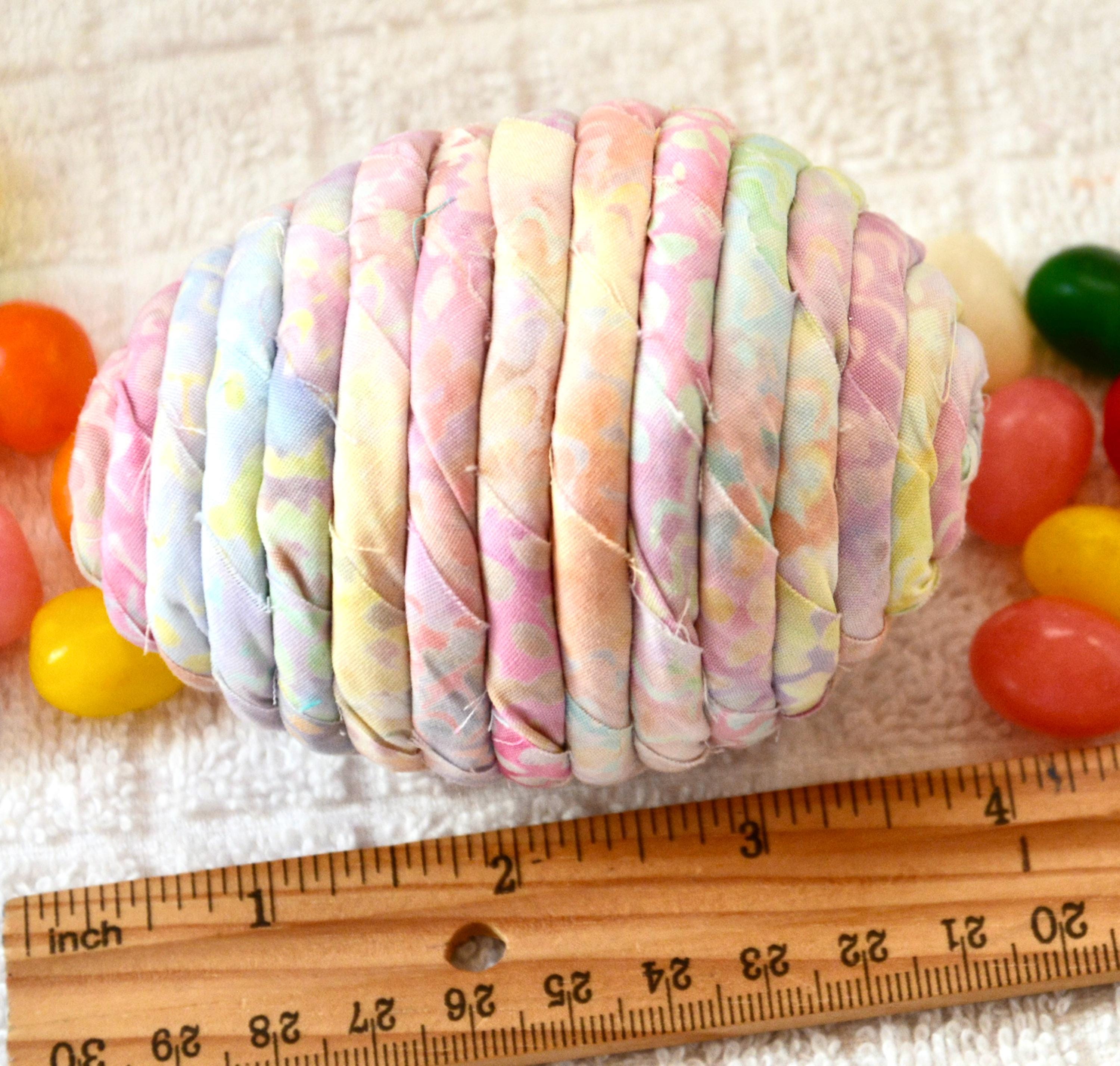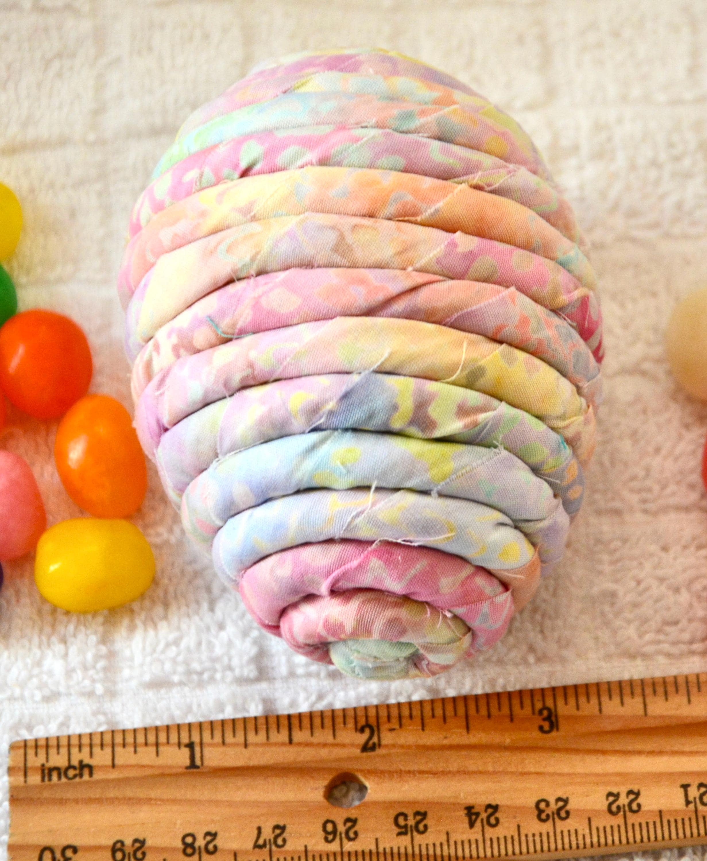I hand wrapped this lovely pastel batik fabric around cotton line which I then hand coiled into an Egg shape. The fabric edge is unfinished for a lovely shabby chic texture. I just love this pretty fabric, it created a unique pattern with cute pink highlights. I designed and created this lovely egg in my smoke free home studio. Bunny, jelly bean, ruler, other egg props not included. Color placement will vary. Egg does not open. Spot clean.