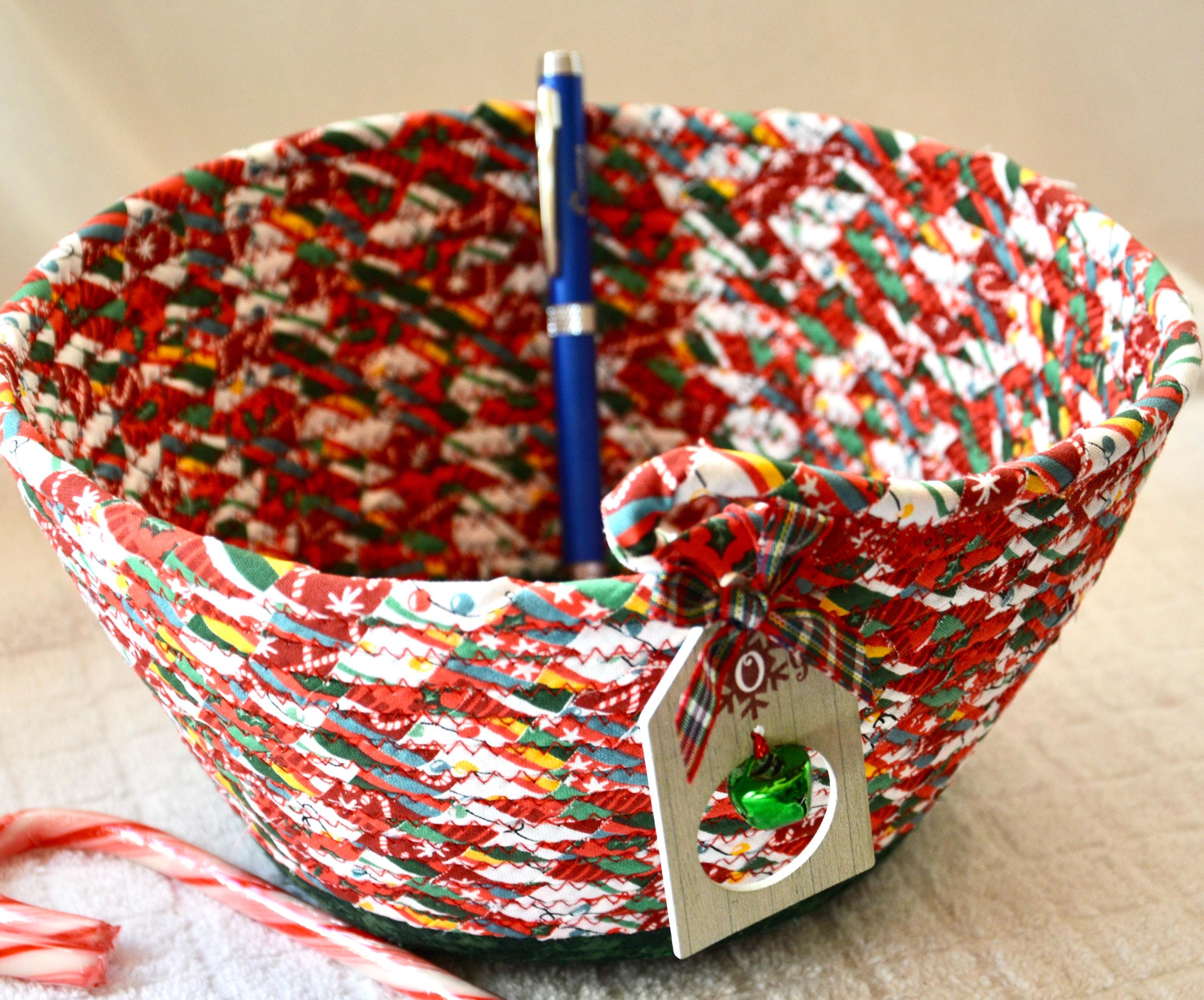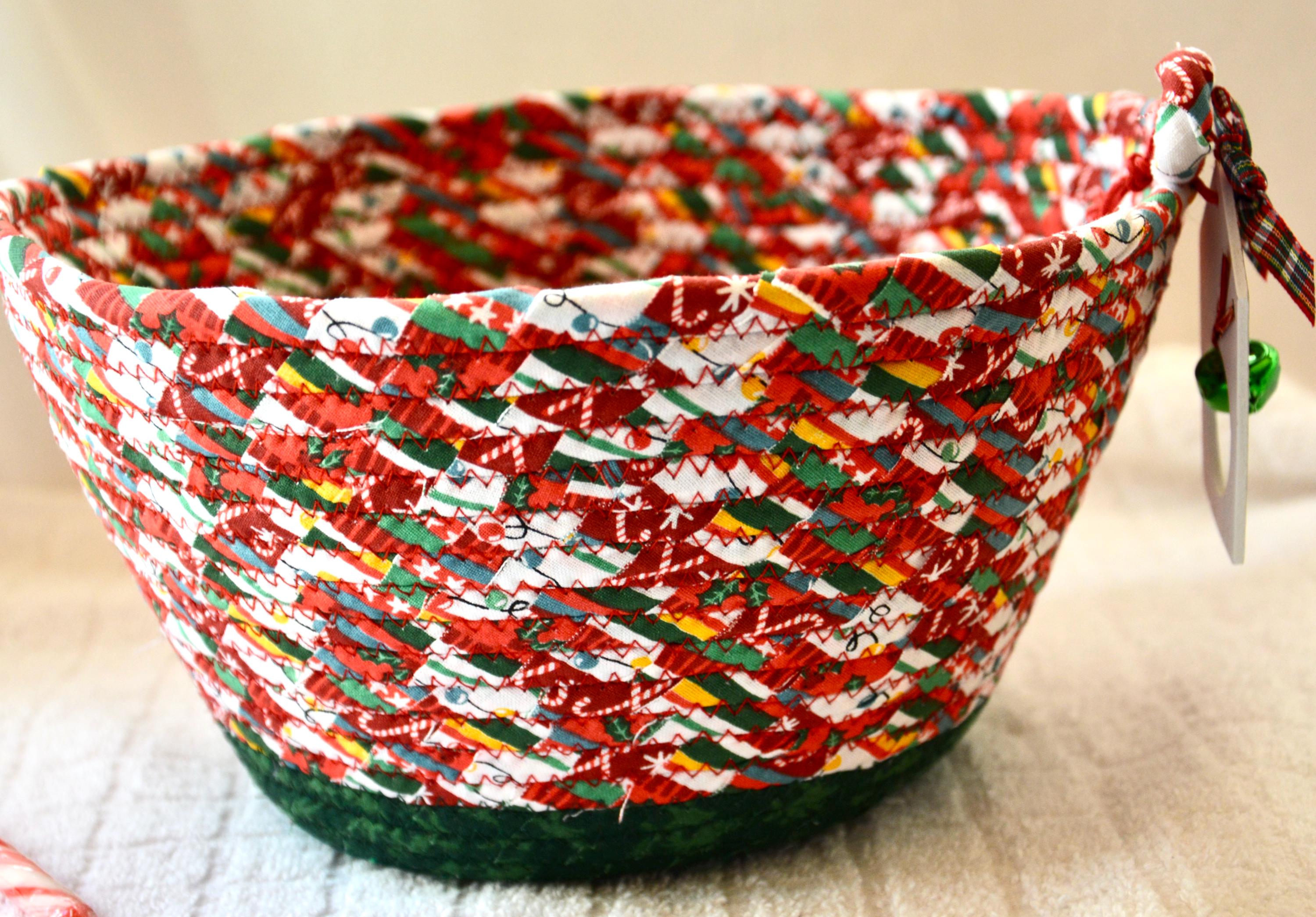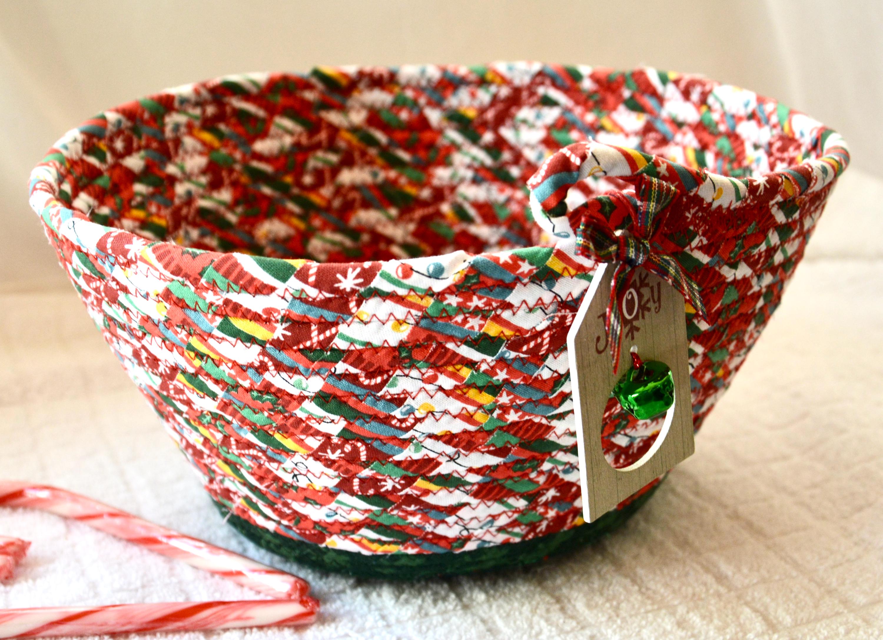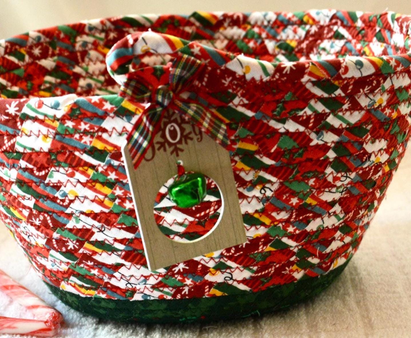 I hand wrapped these high quality Christmas fabrics around cotton line, which I then hand coiled and machine quilted to make it sturdy. I used the raw edge technique with some fray to add a wonderful shabby chic texture. I just love the cute highlights in this bright cheery fabric! So festive! The Joy with bell ornament is included for a
