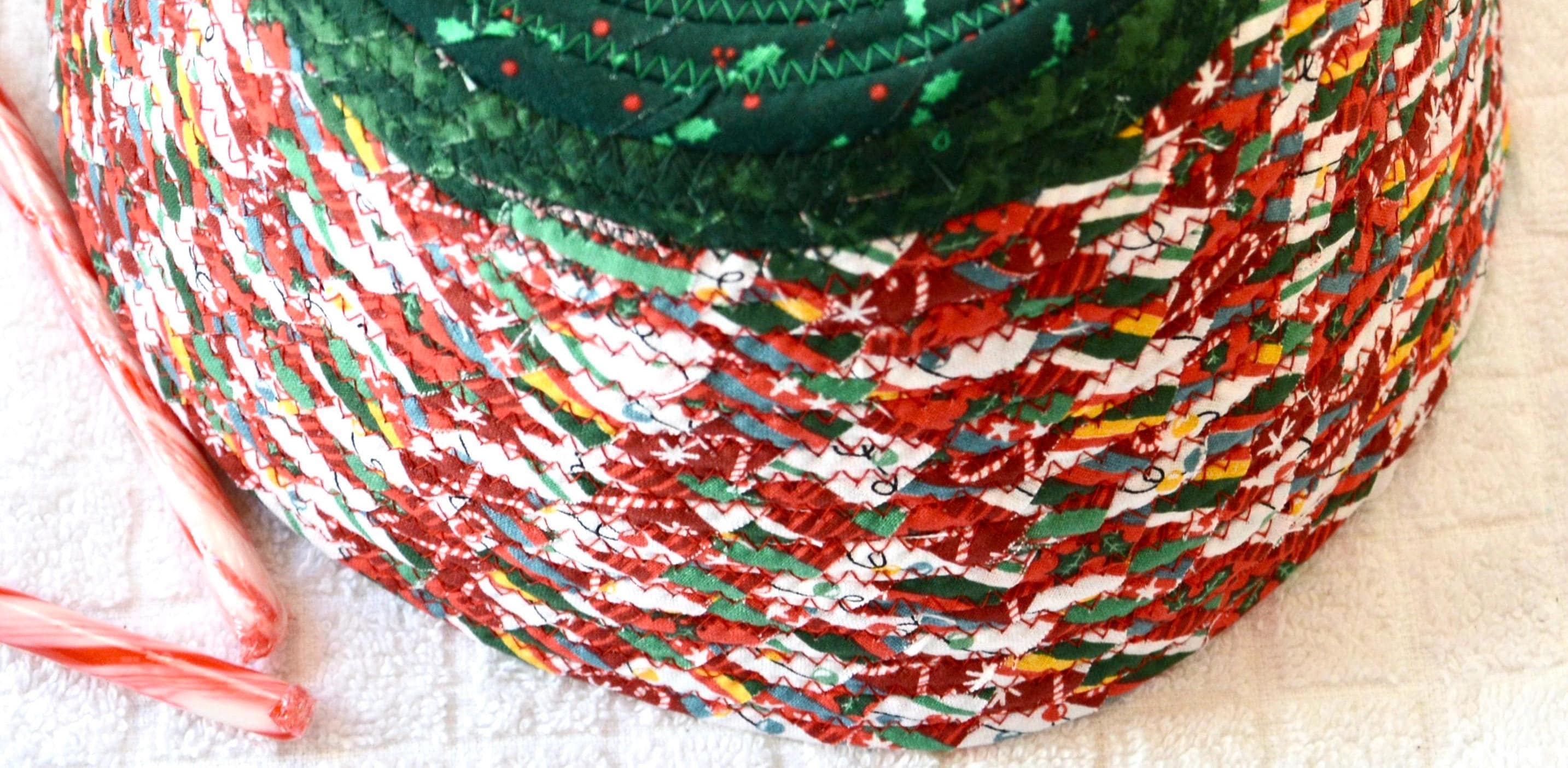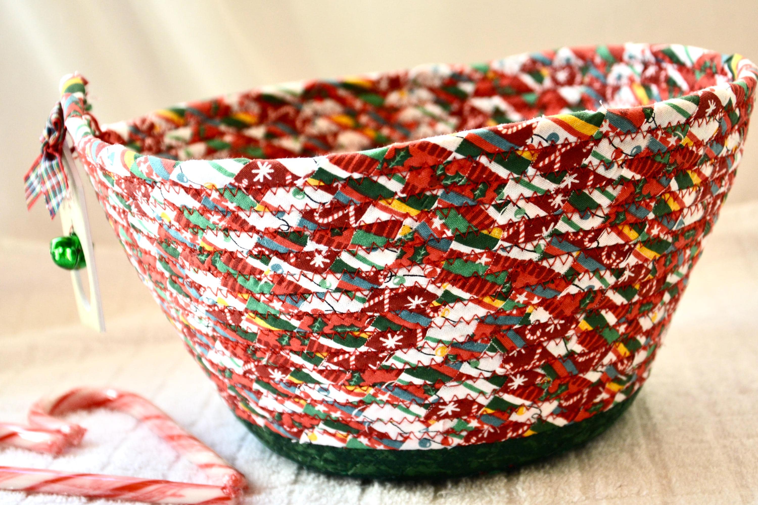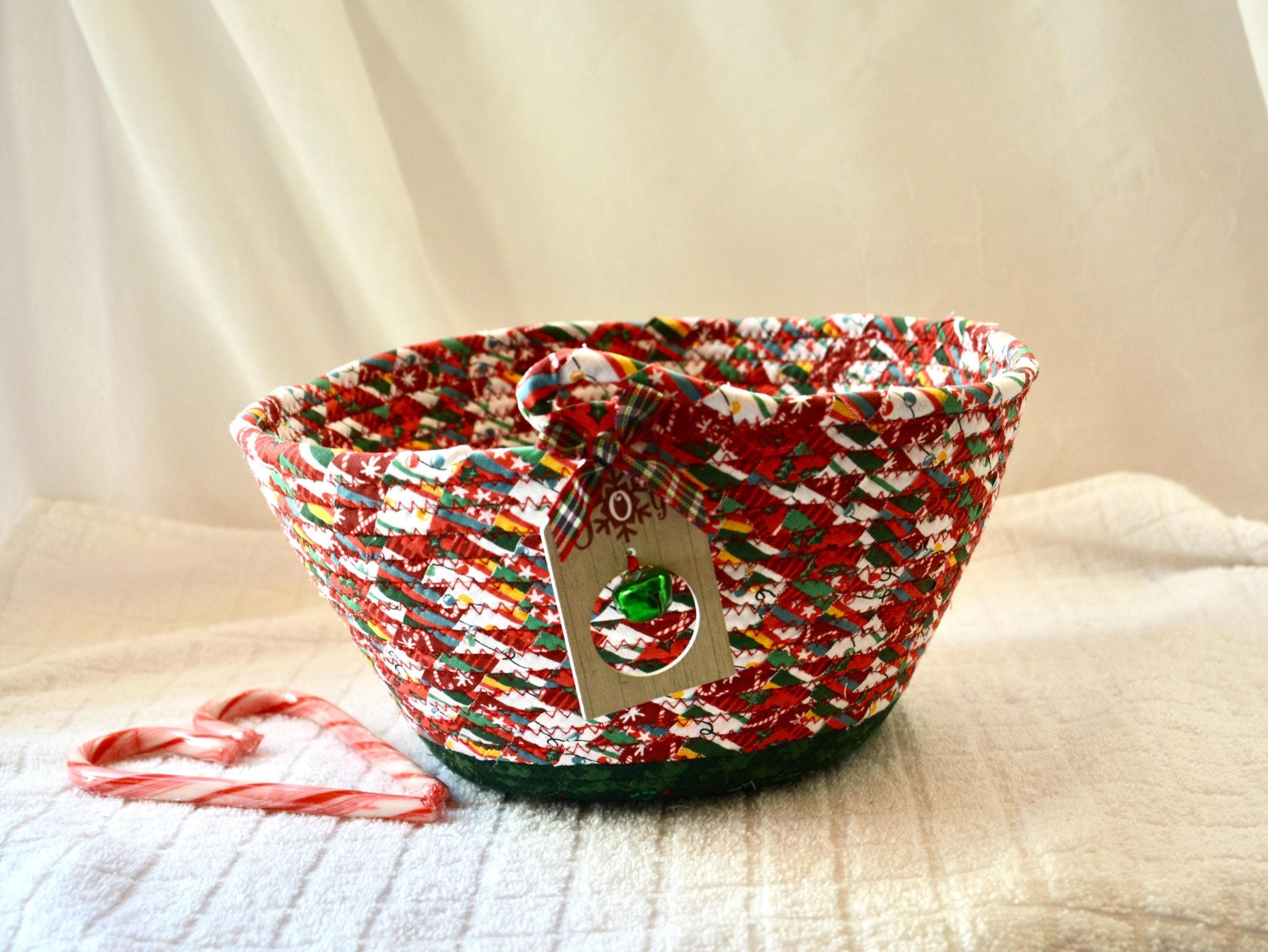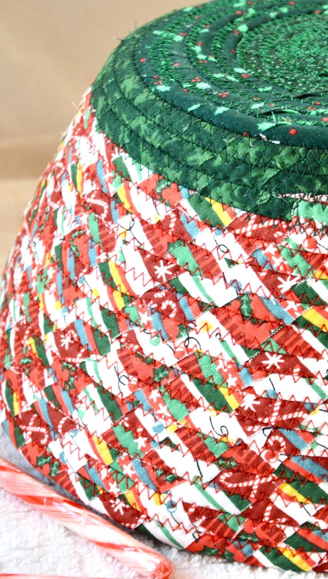 I hand wrapped these high quality Christmas fabrics around cotton line, which I then hand coiled and machine quilted to make it sturdy. I used the raw edge technique with some fray to add a wonderful shabby chic texture. I just love the cute highlights in this bright cheery fabric! So festive! The Joy with bell ornament is included for a