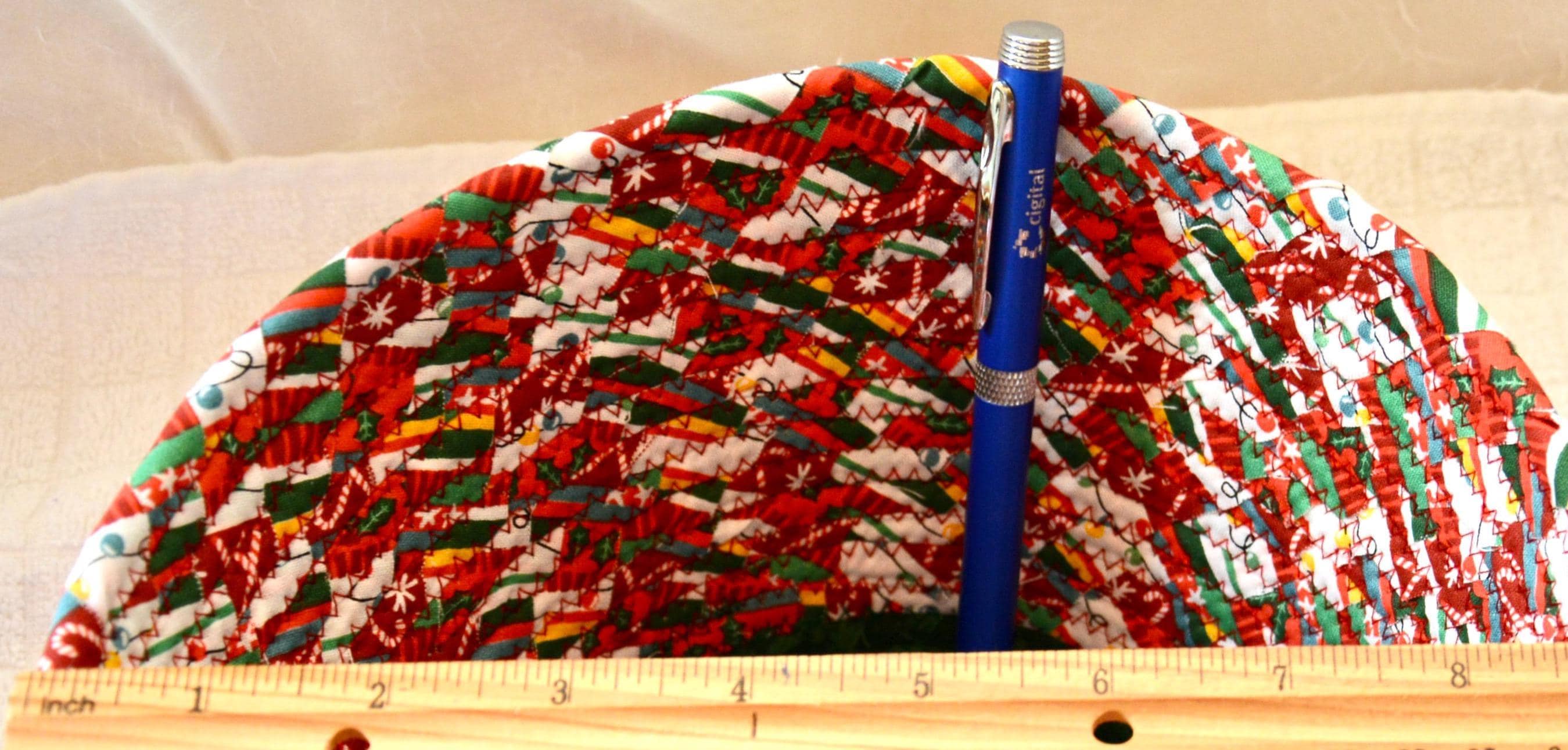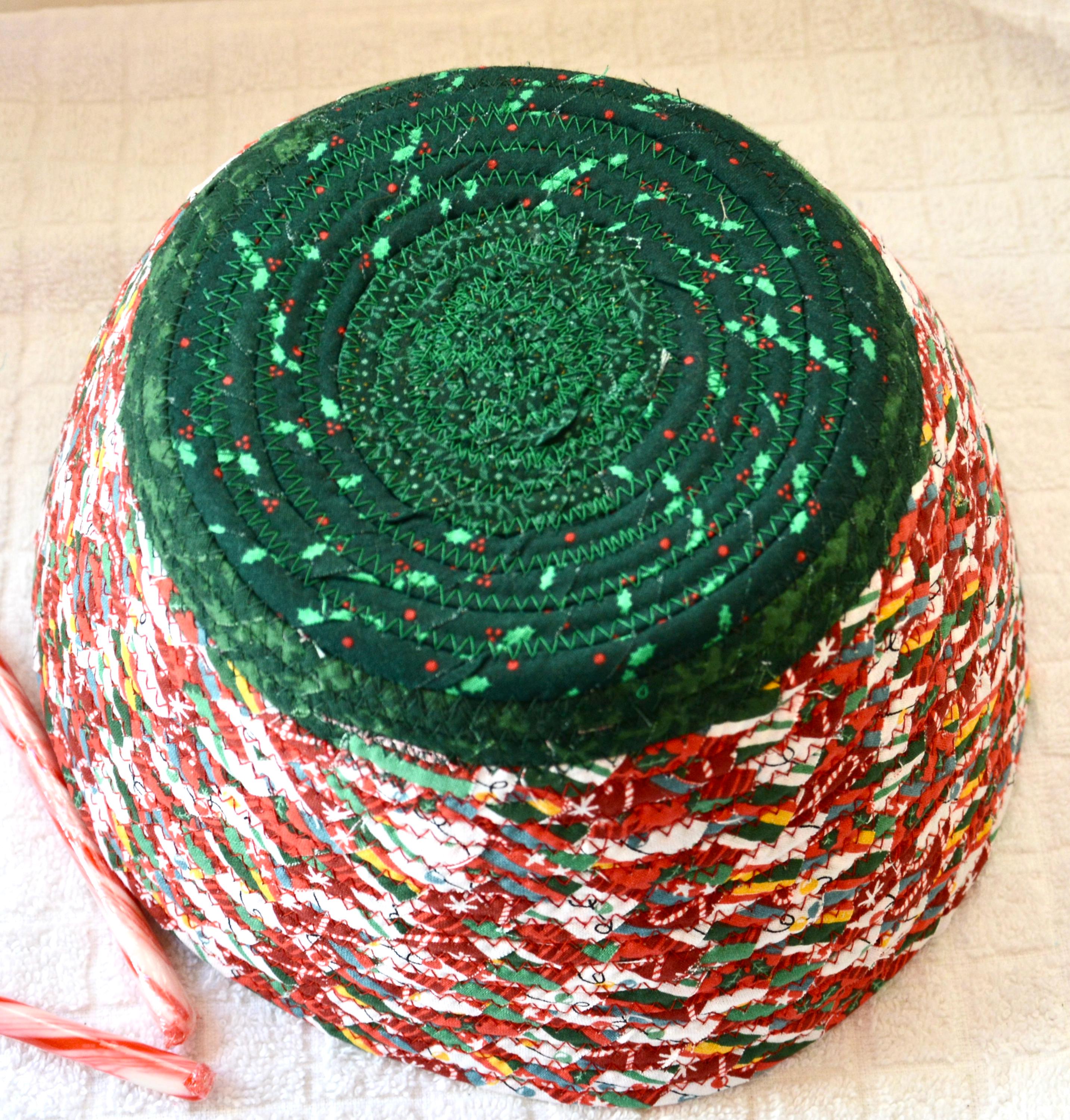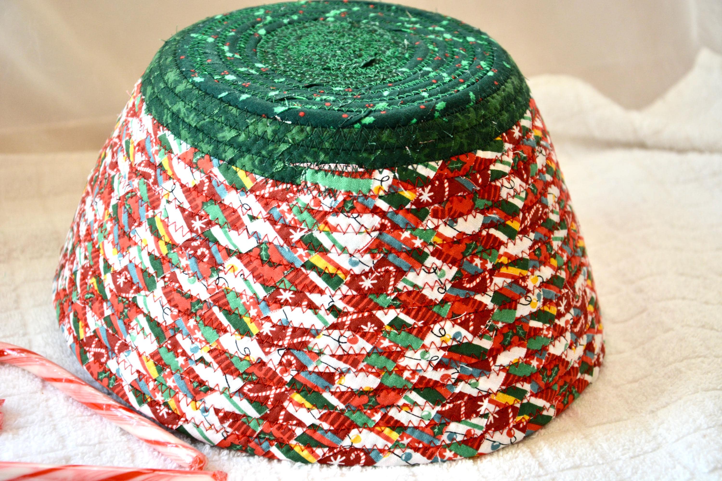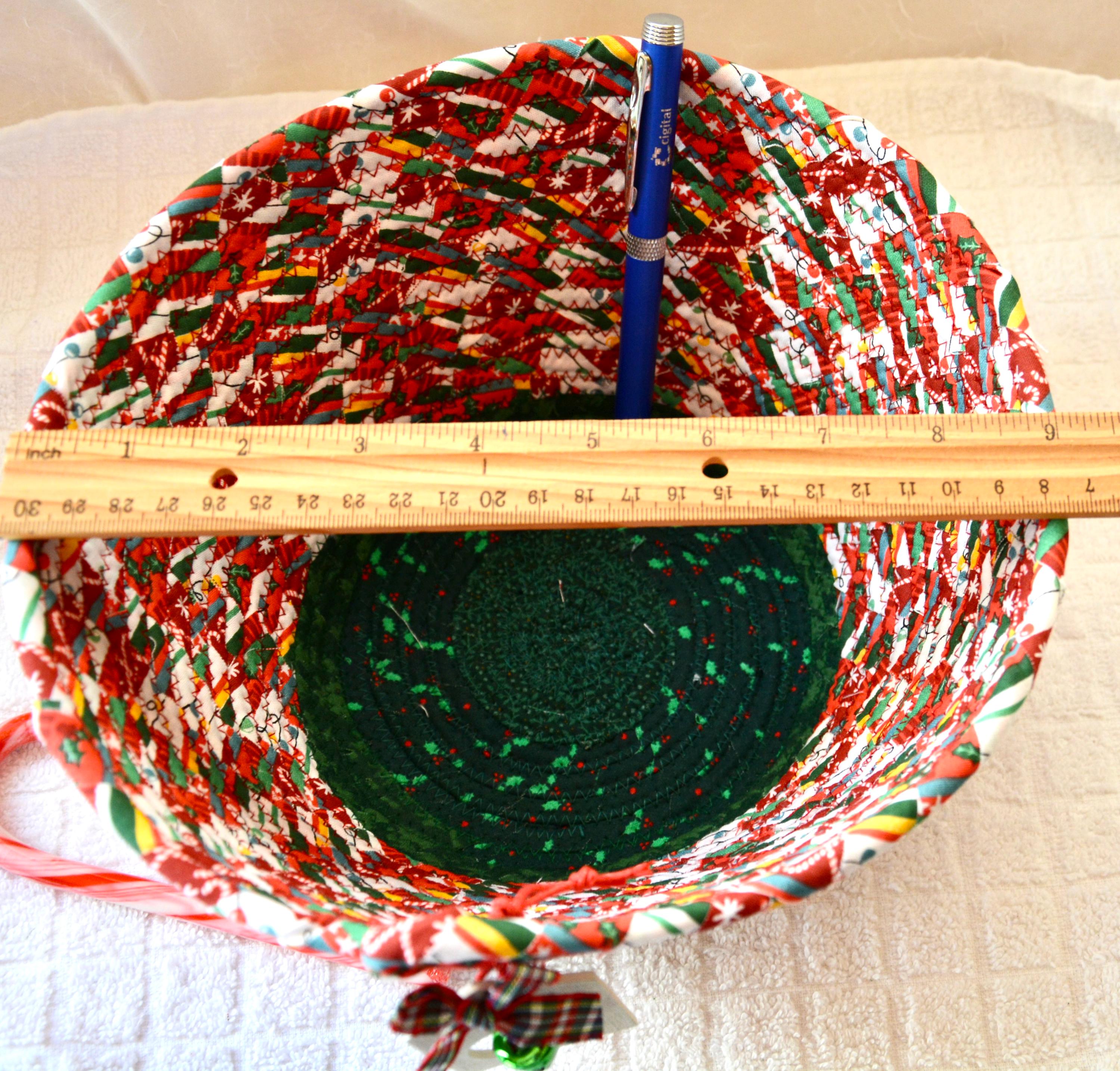 I hand wrapped these high quality Christmas fabrics around cotton line, which I then hand coiled and machine quilted to make it sturdy. I used the raw edge technique with some fray to add a wonderful shabby chic texture. I just love the cute highlights in this bright cheery fabric! So festive! The Joy with bell ornament is included for a