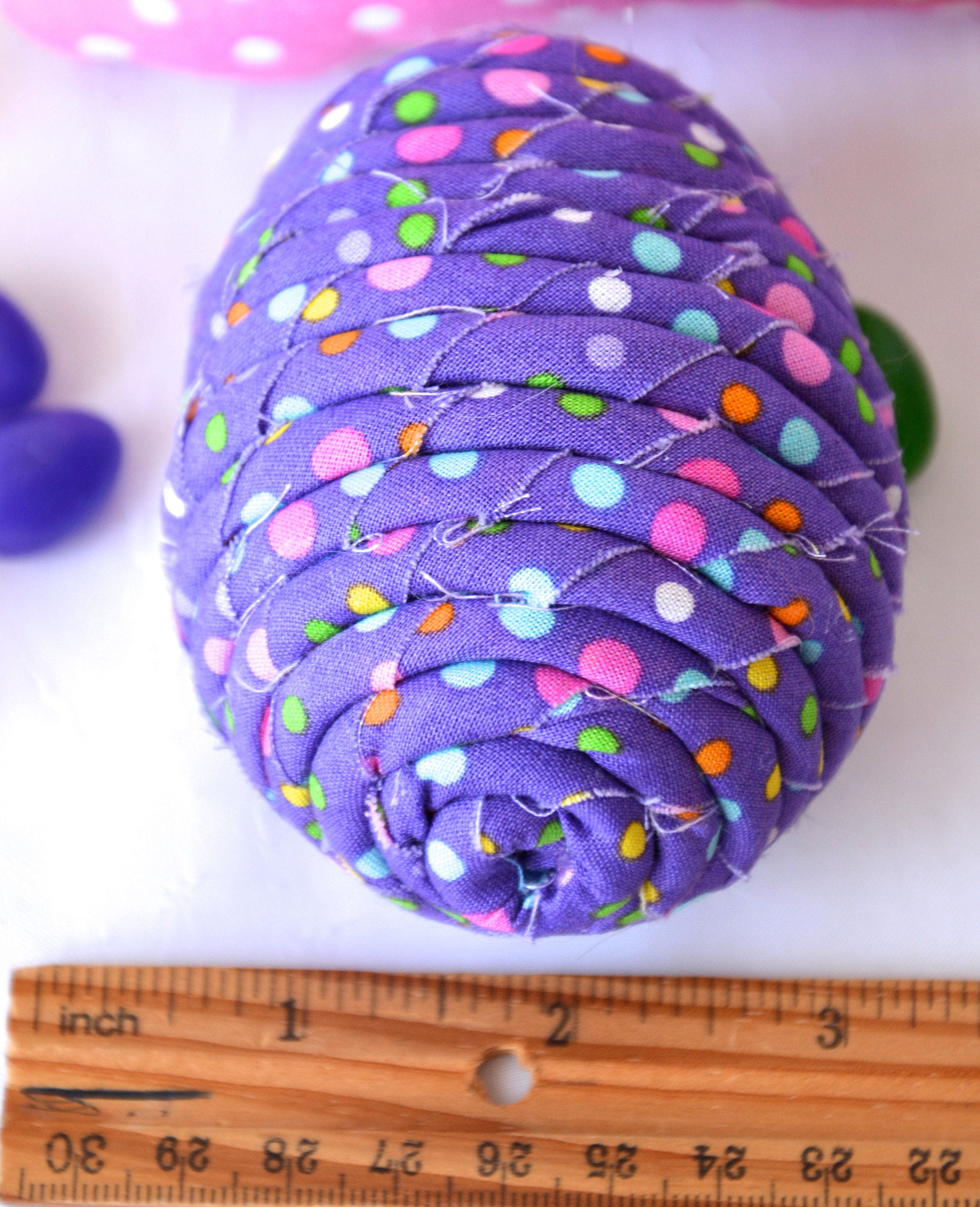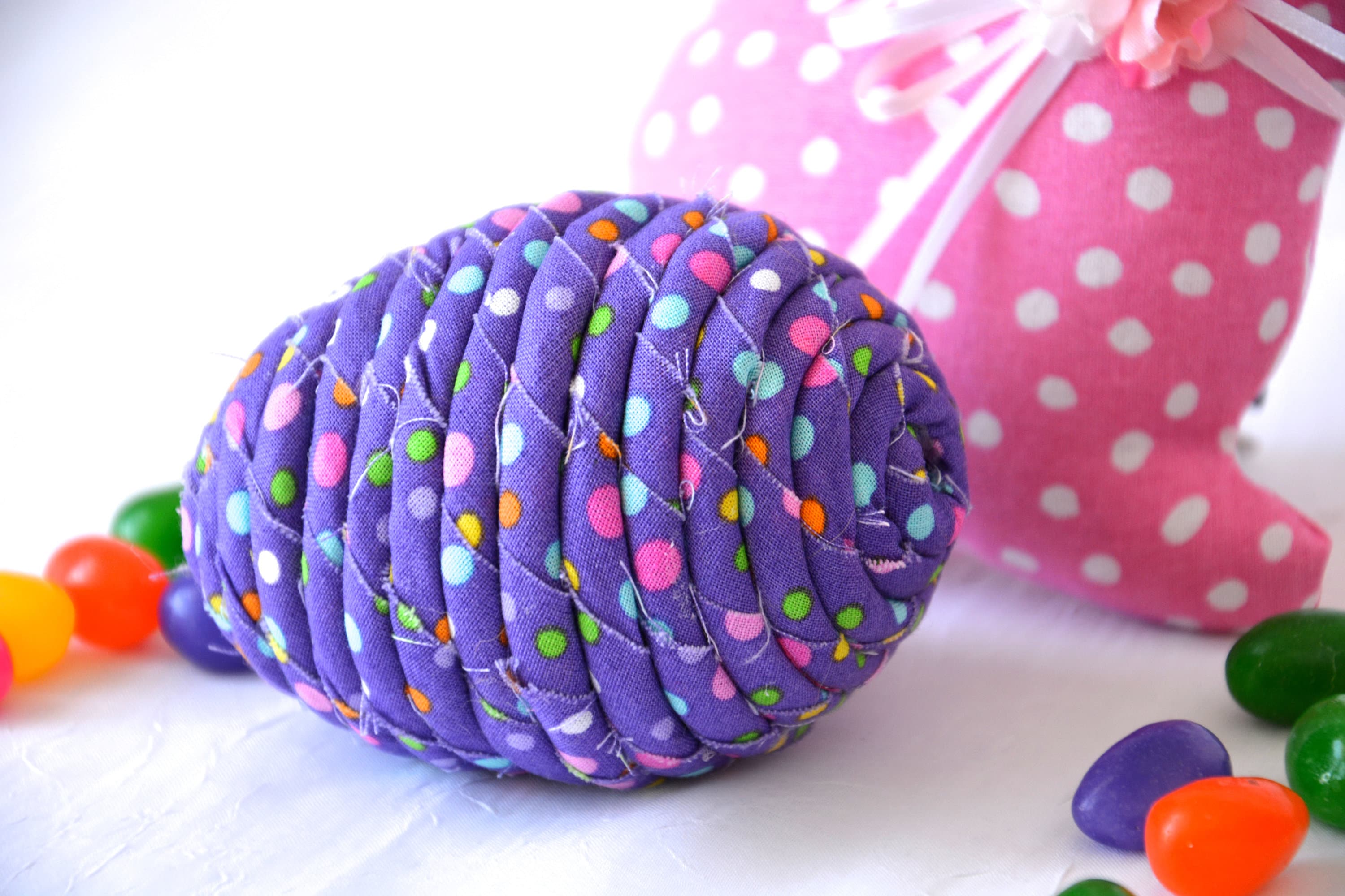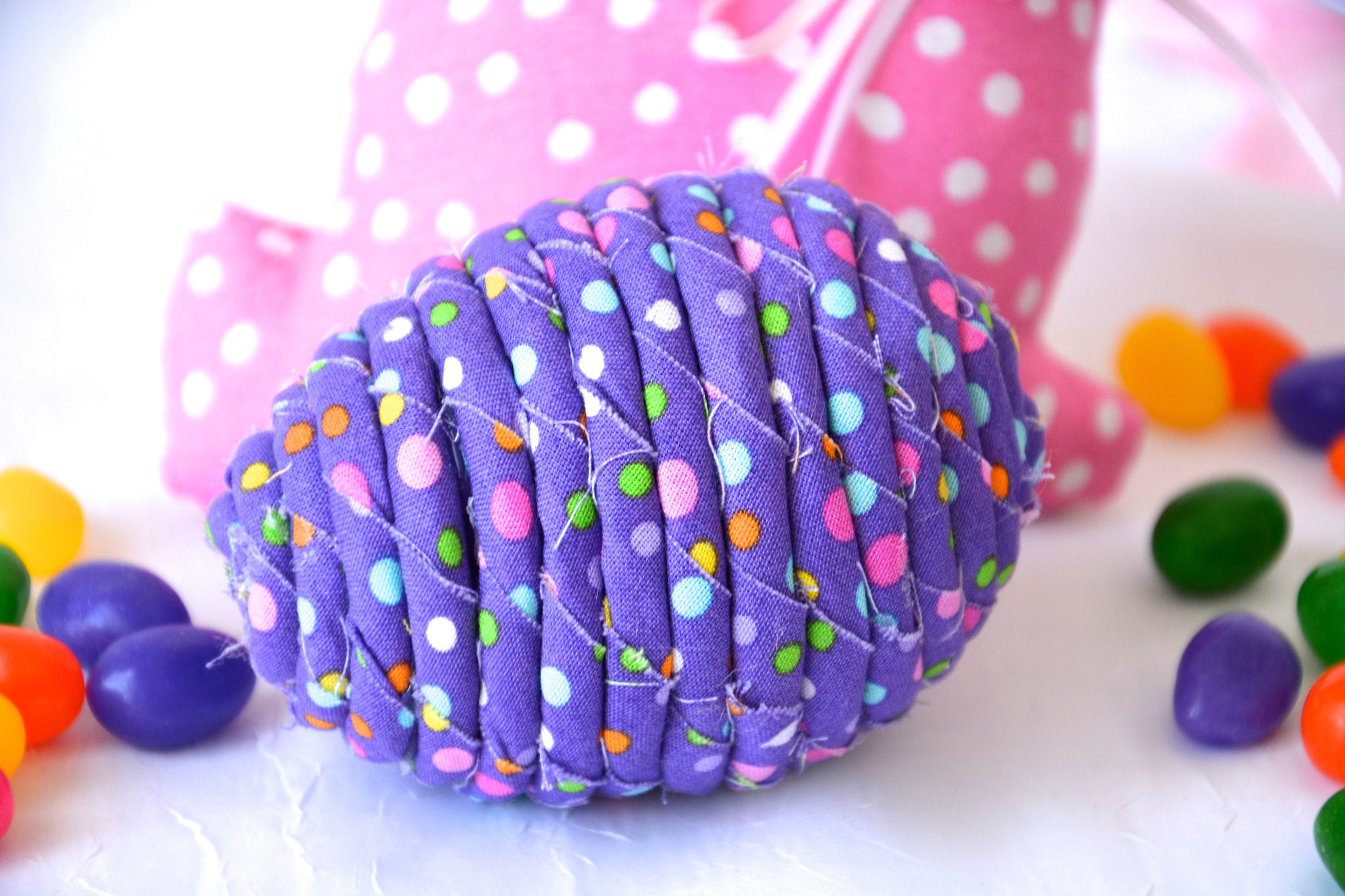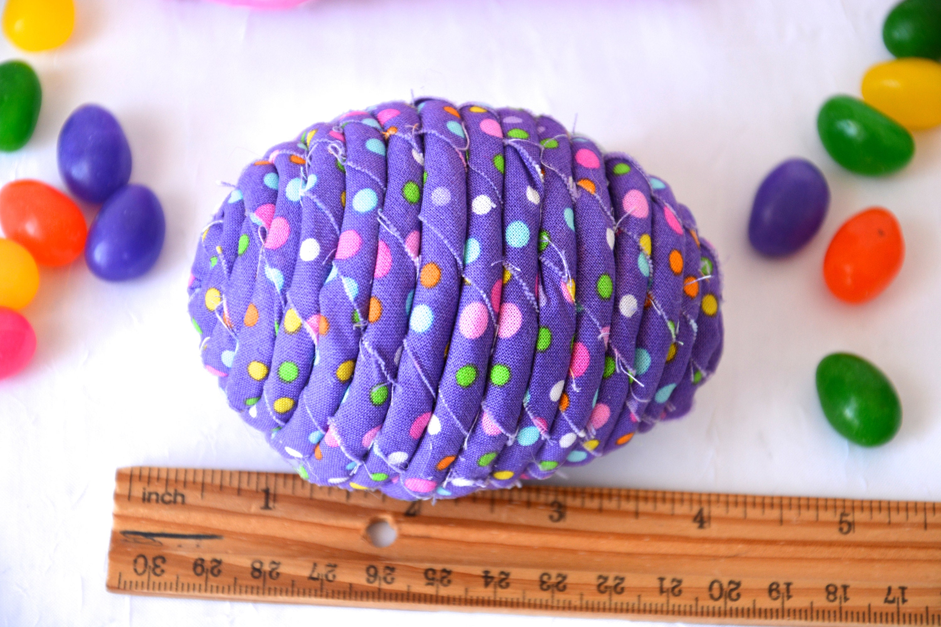 I hand wrapped this cute purple dot fabric around cotton line which I than hand coiled into an Easter Egg shape. The fabric edge is unfinished for a lovely shabby chic texture. I just love this fun fabric, it created a unique pattern with fun highlights. I designed and created this lovely fabric Easter egg in my smoke free home studio. Color placement will vary. Spot clean. Bunny, jelly bean, ruler, candy props not included.