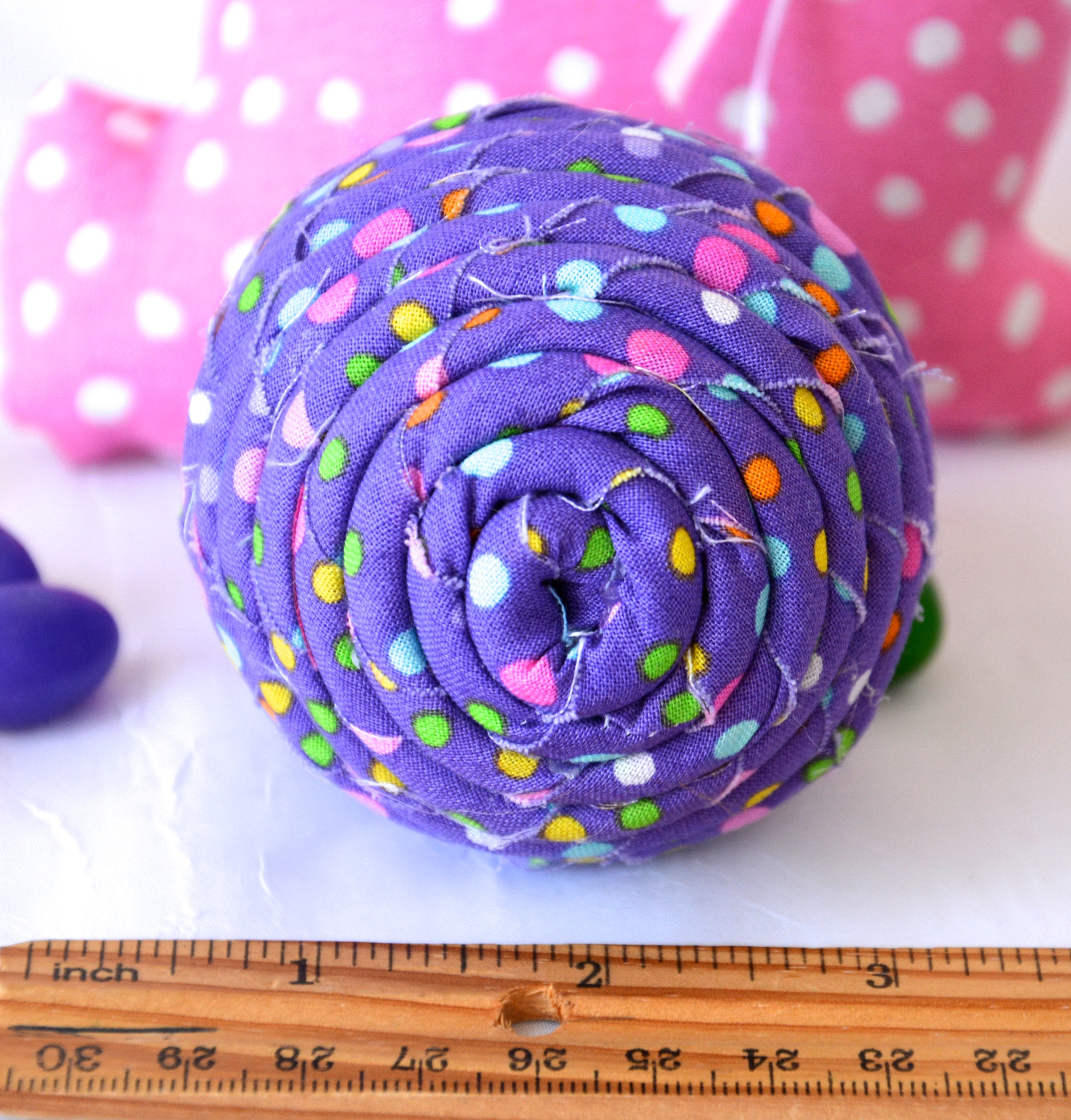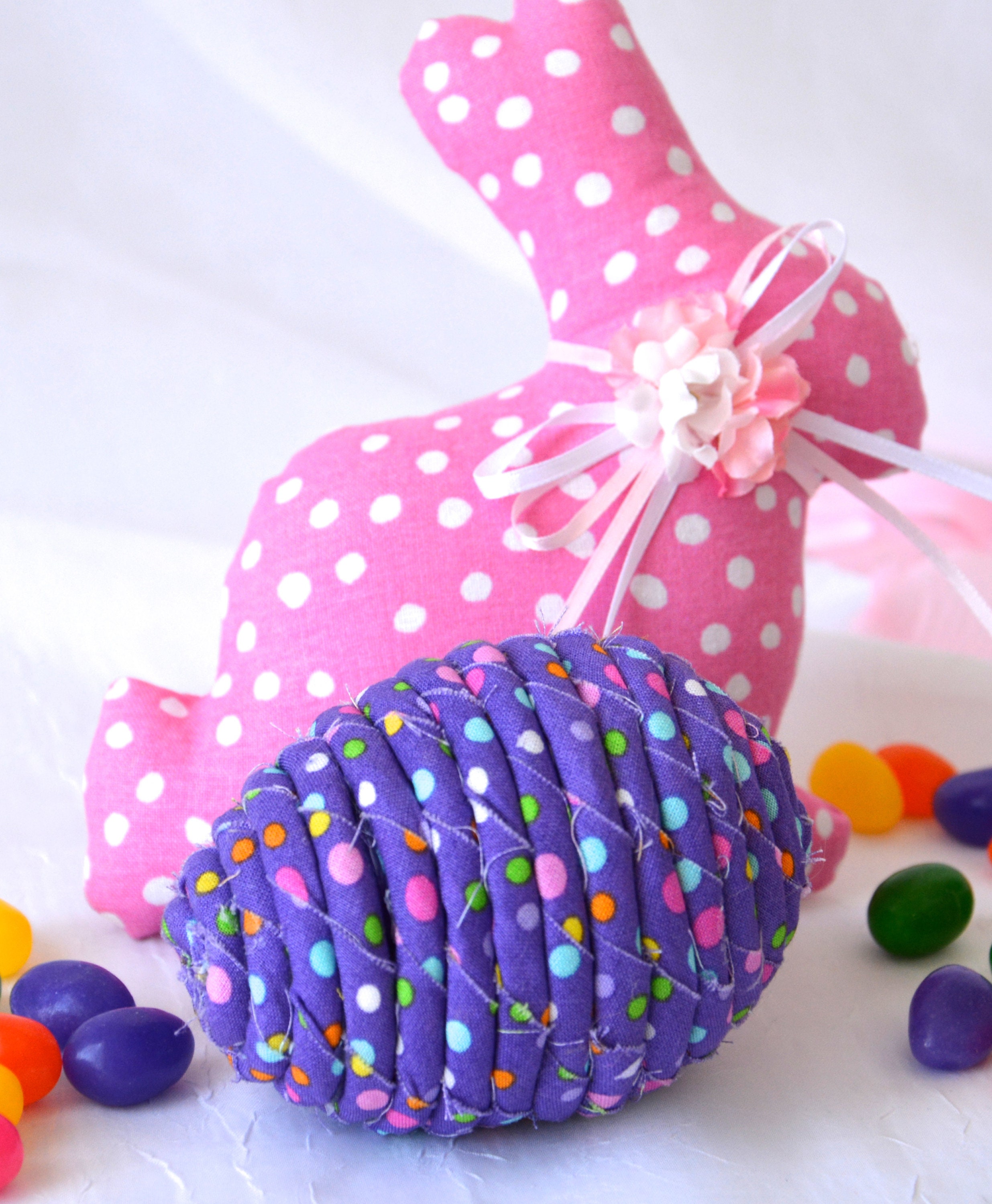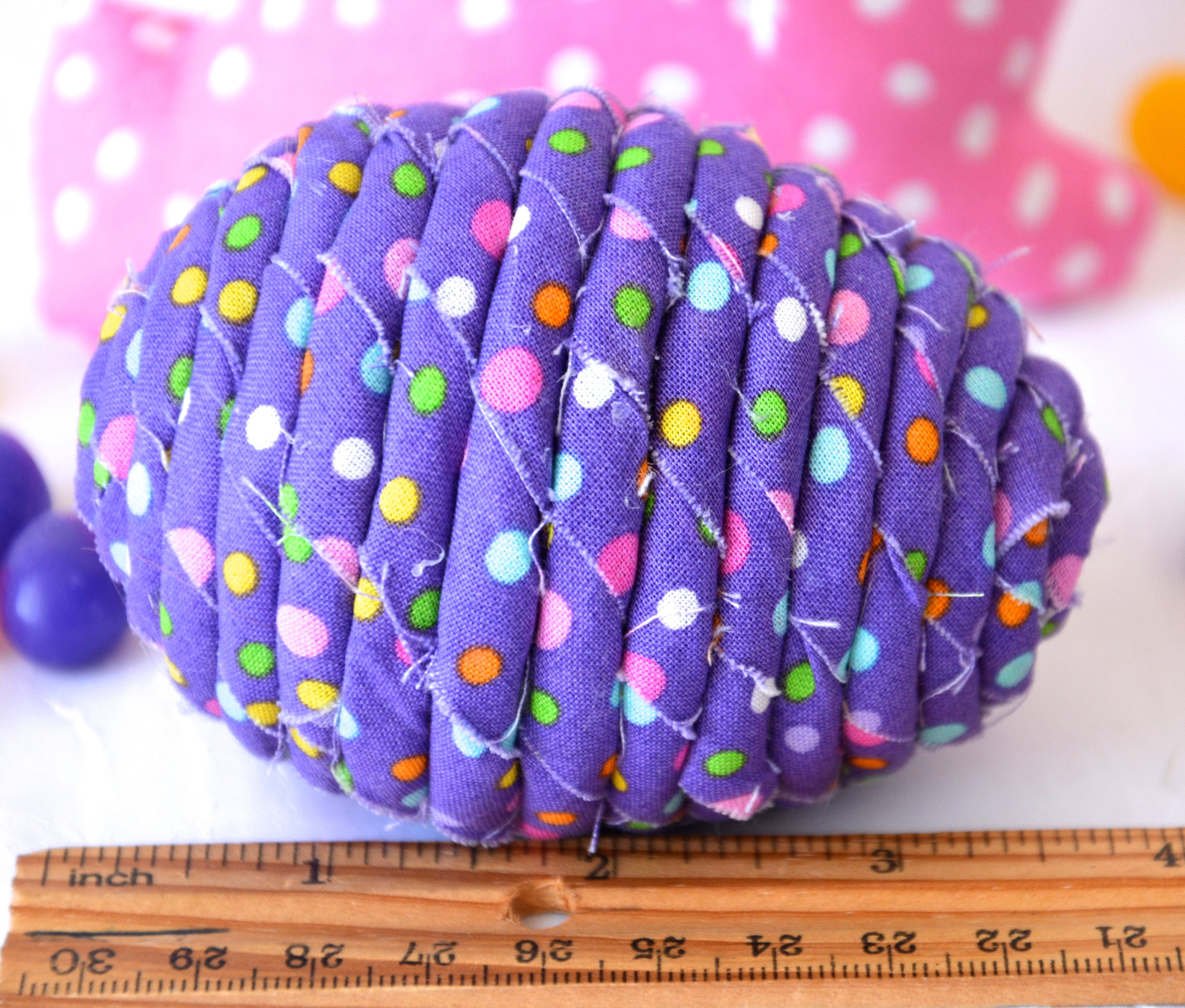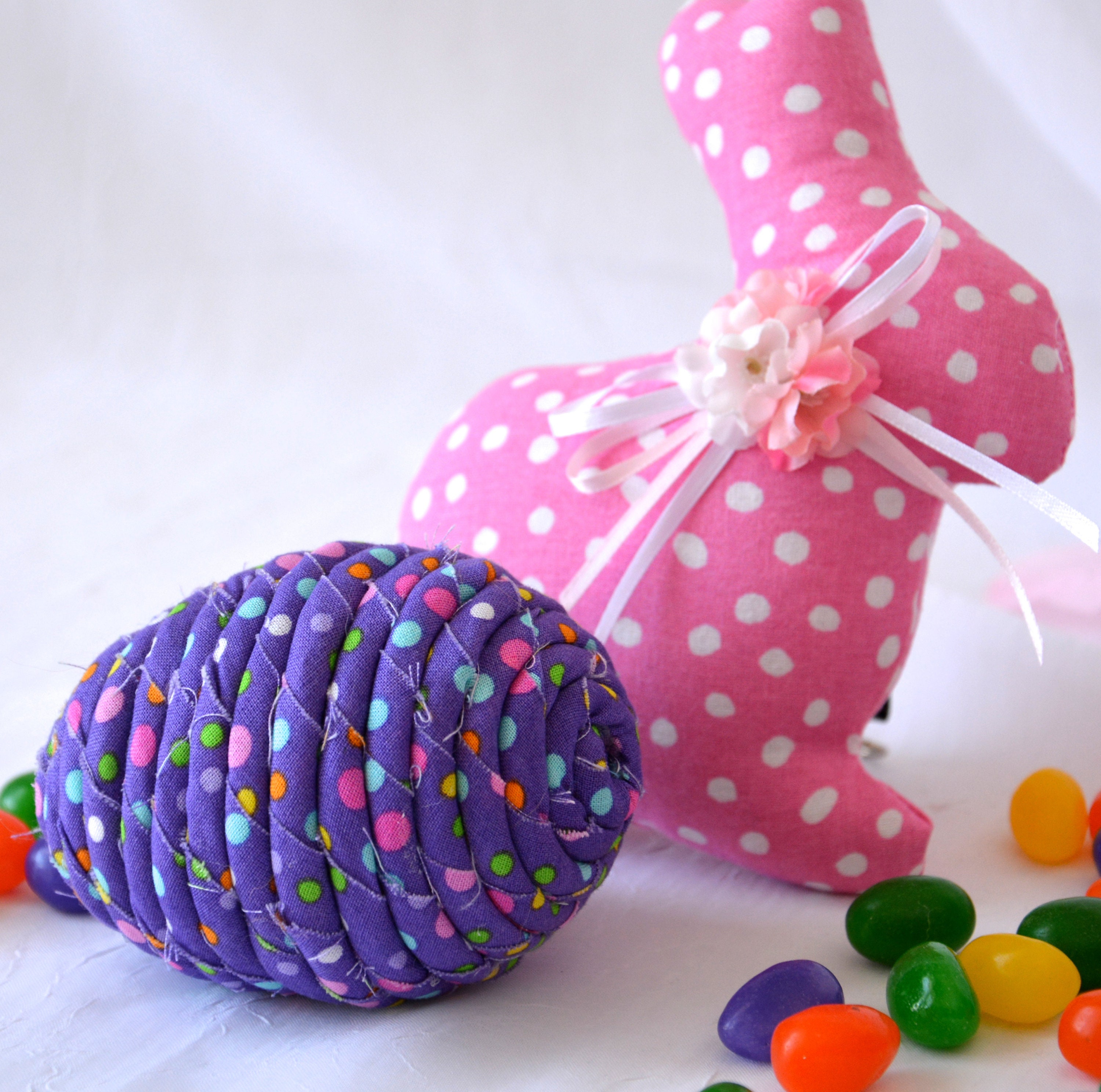 I hand wrapped this cute purple dot fabric around cotton line which I than hand coiled into an Easter Egg shape. The fabric edge is unfinished for a lovely shabby chic texture. I just love this fun fabric, it created a unique pattern with fun highlights. I designed and created this lovely fabric Easter egg in my smoke free home studio. Color placement will vary. Spot clean. Bunny, jelly bean, ruler, candy props not included.