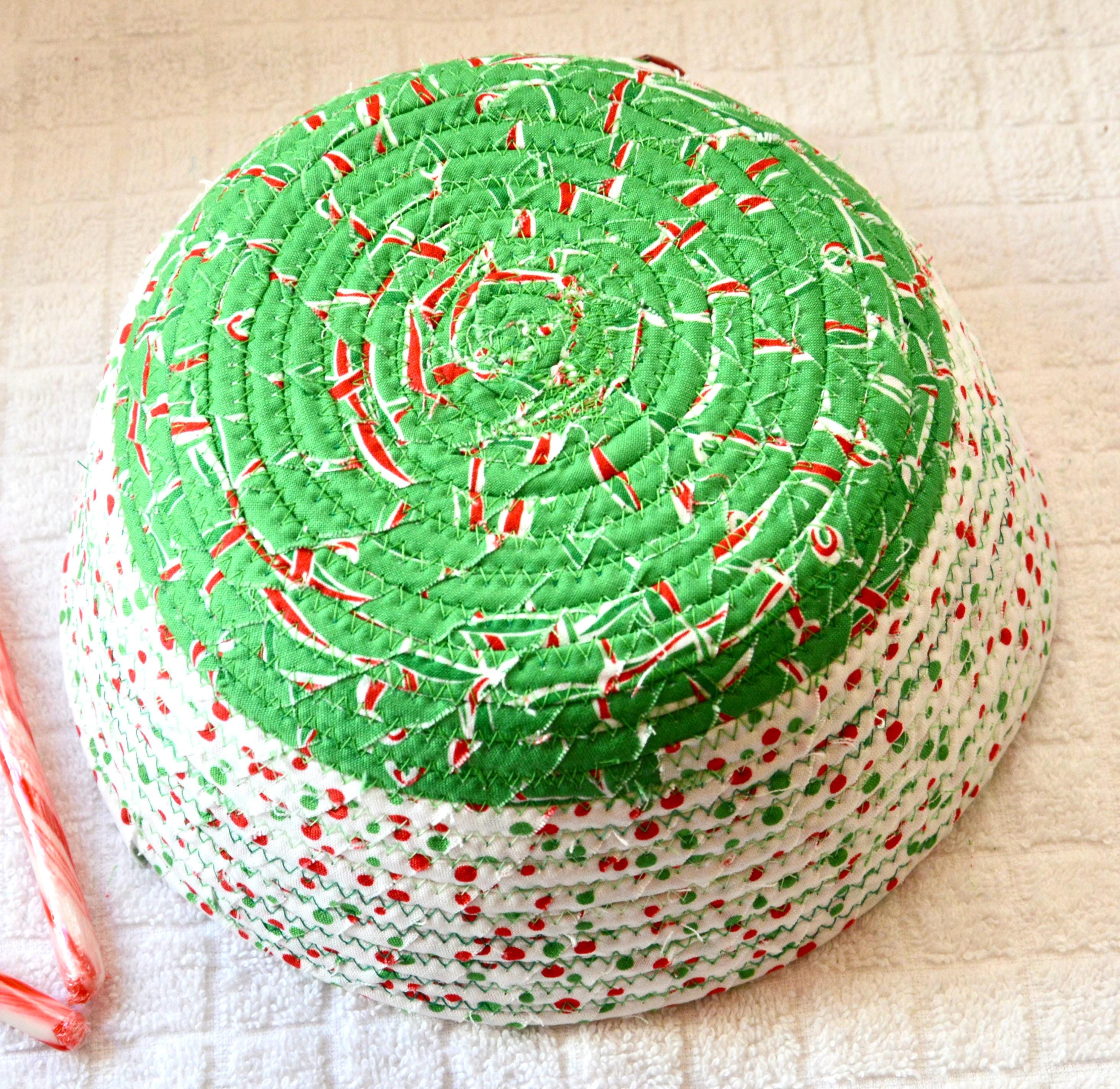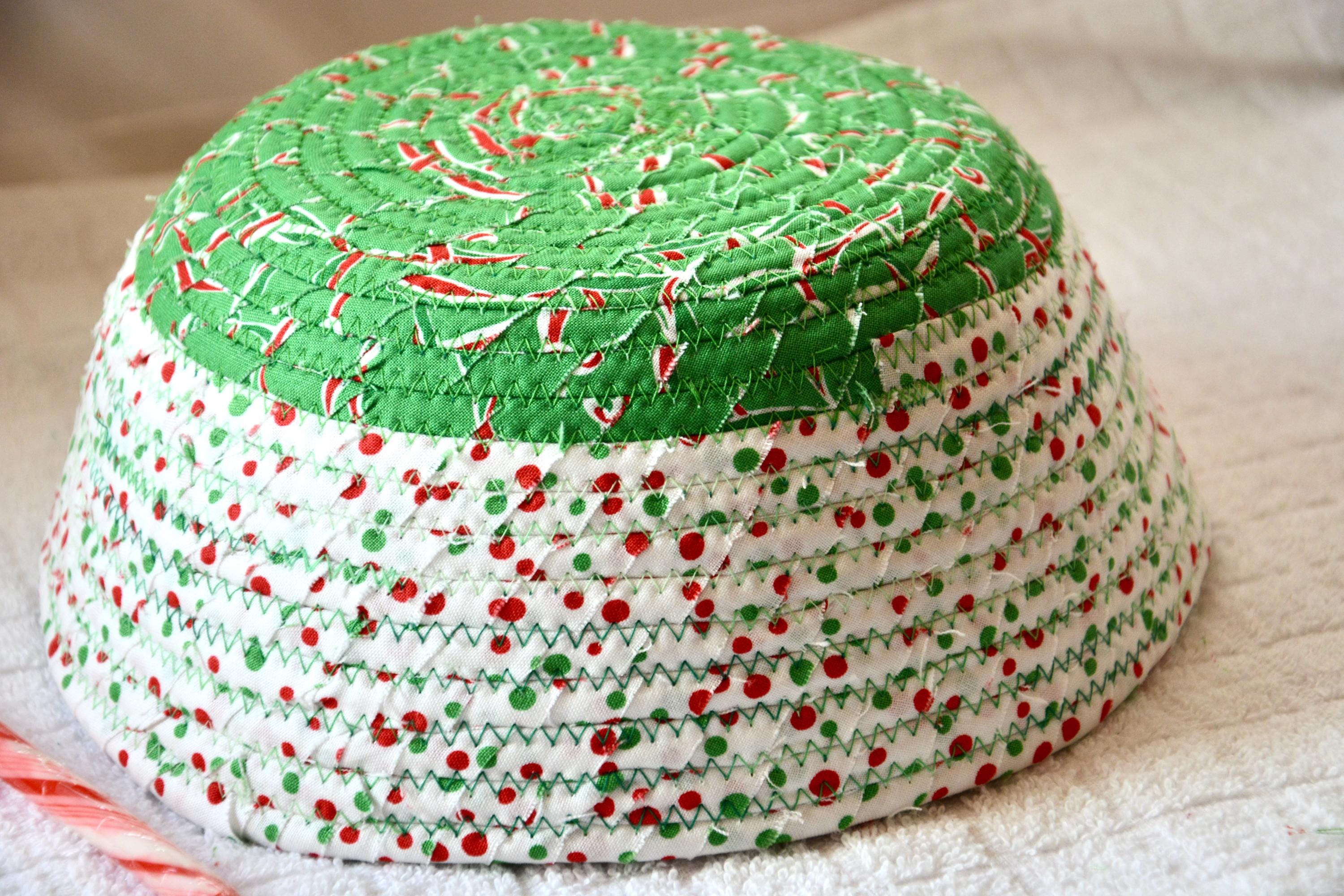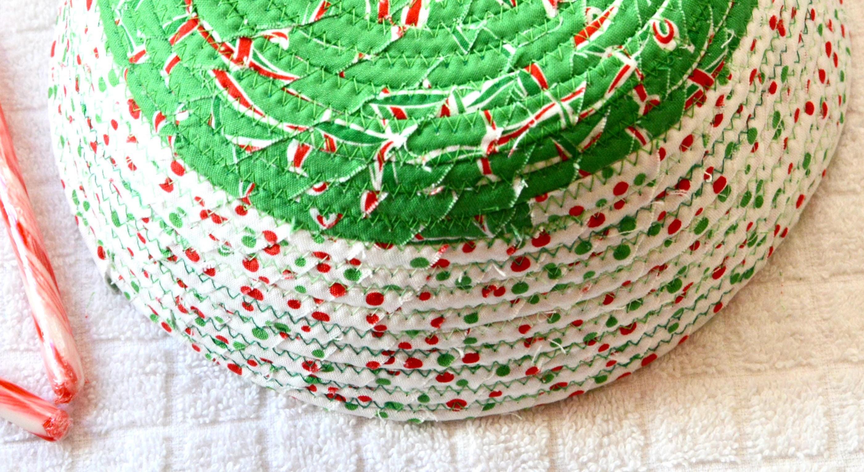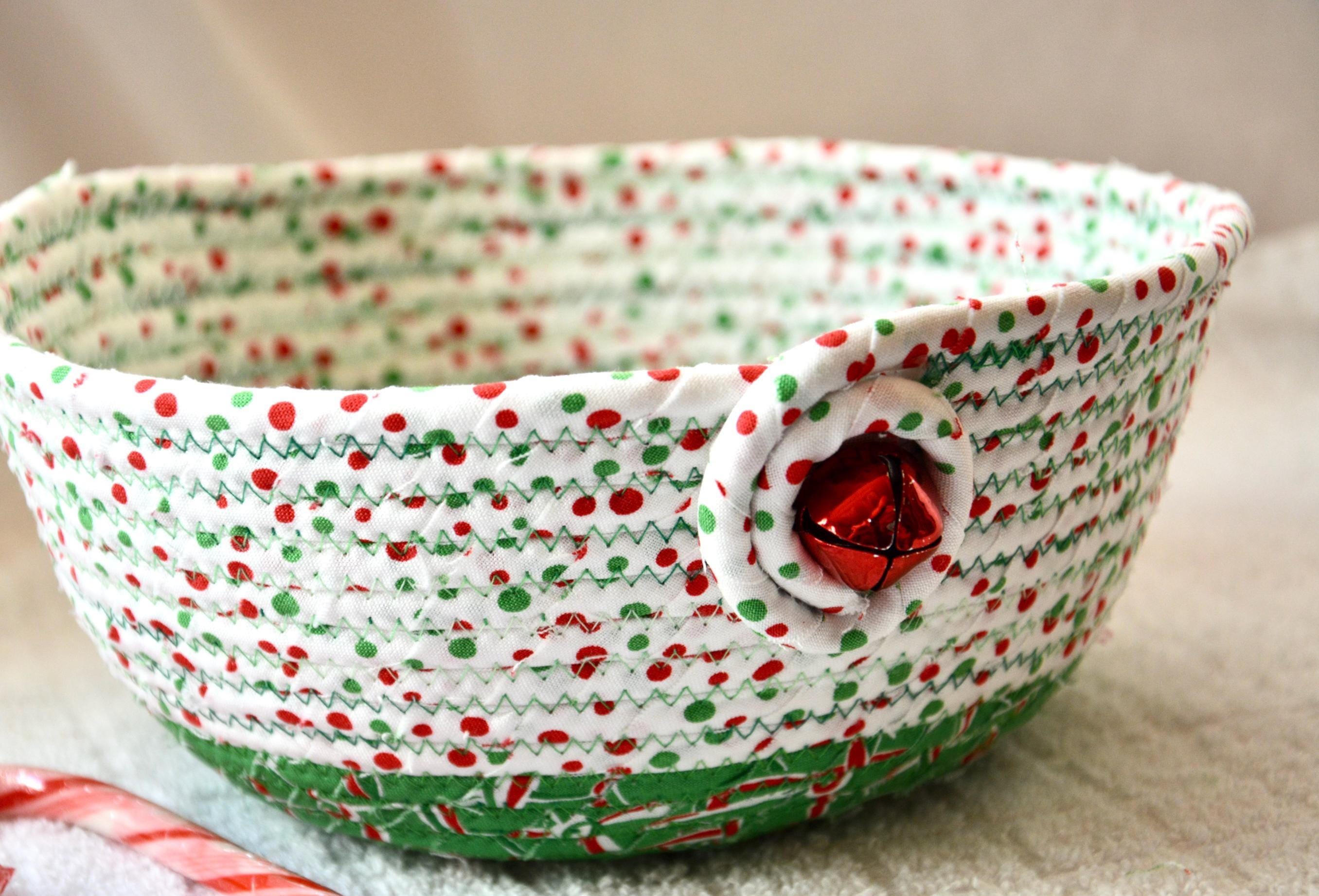 I hand wrapped these high quality Christmas 100% cotton fabrics around cotton line, which I then hand coiled and machine quilted to make it sturdy. I used the raw edge technique with some fray to add a wonderful shabby chic texture. Color placement will vary.
