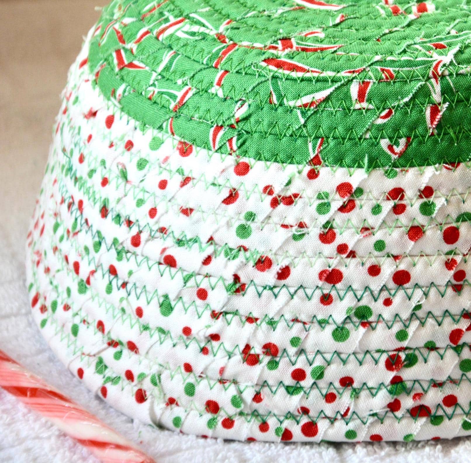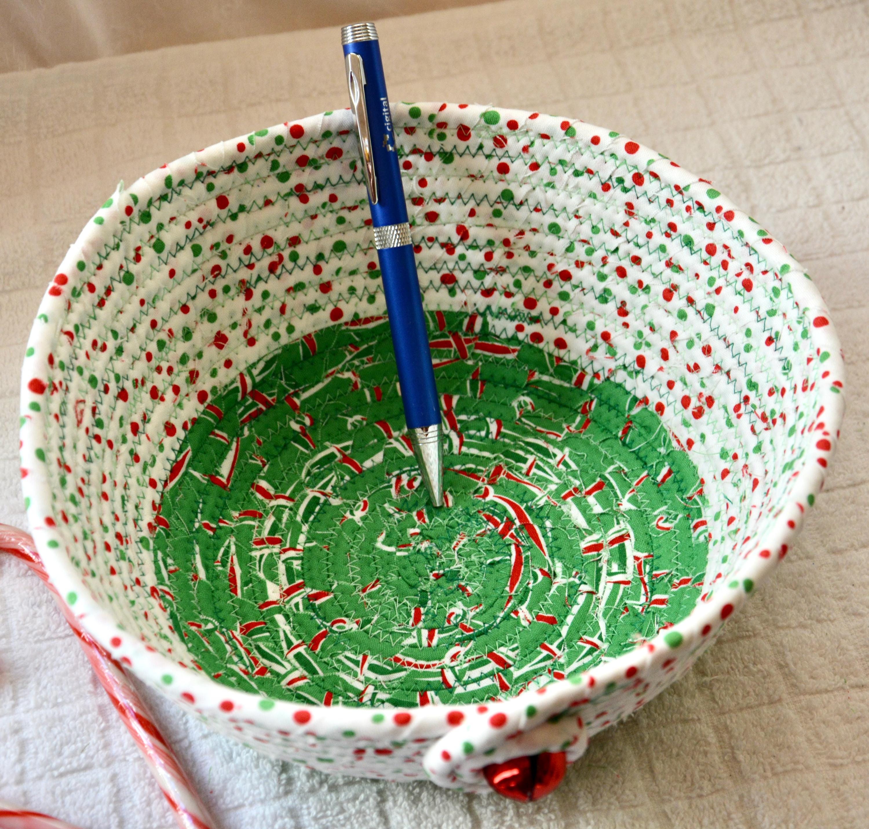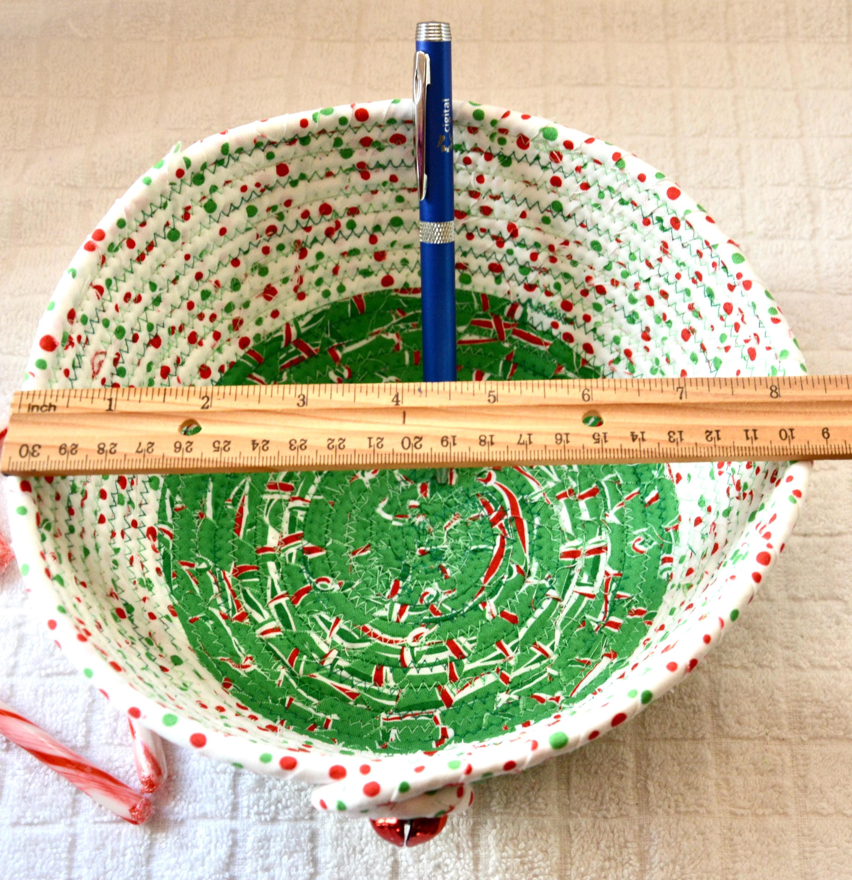 I hand wrapped these high quality Christmas 100% cotton fabrics around cotton line, which I then hand coiled and machine quilted to make it sturdy. I used the raw edge technique with some fray to add a wonderful shabby chic texture. Color placement will vary.