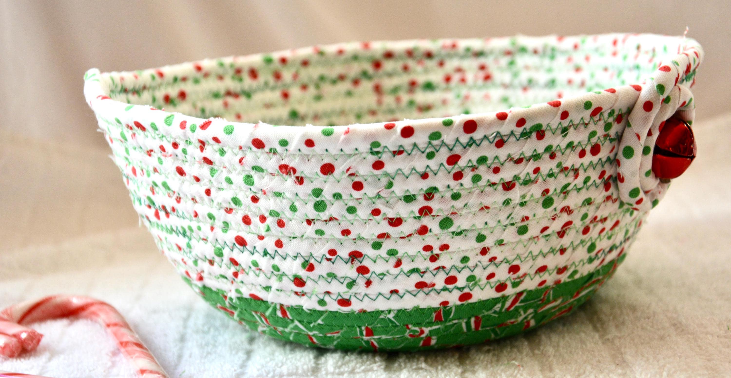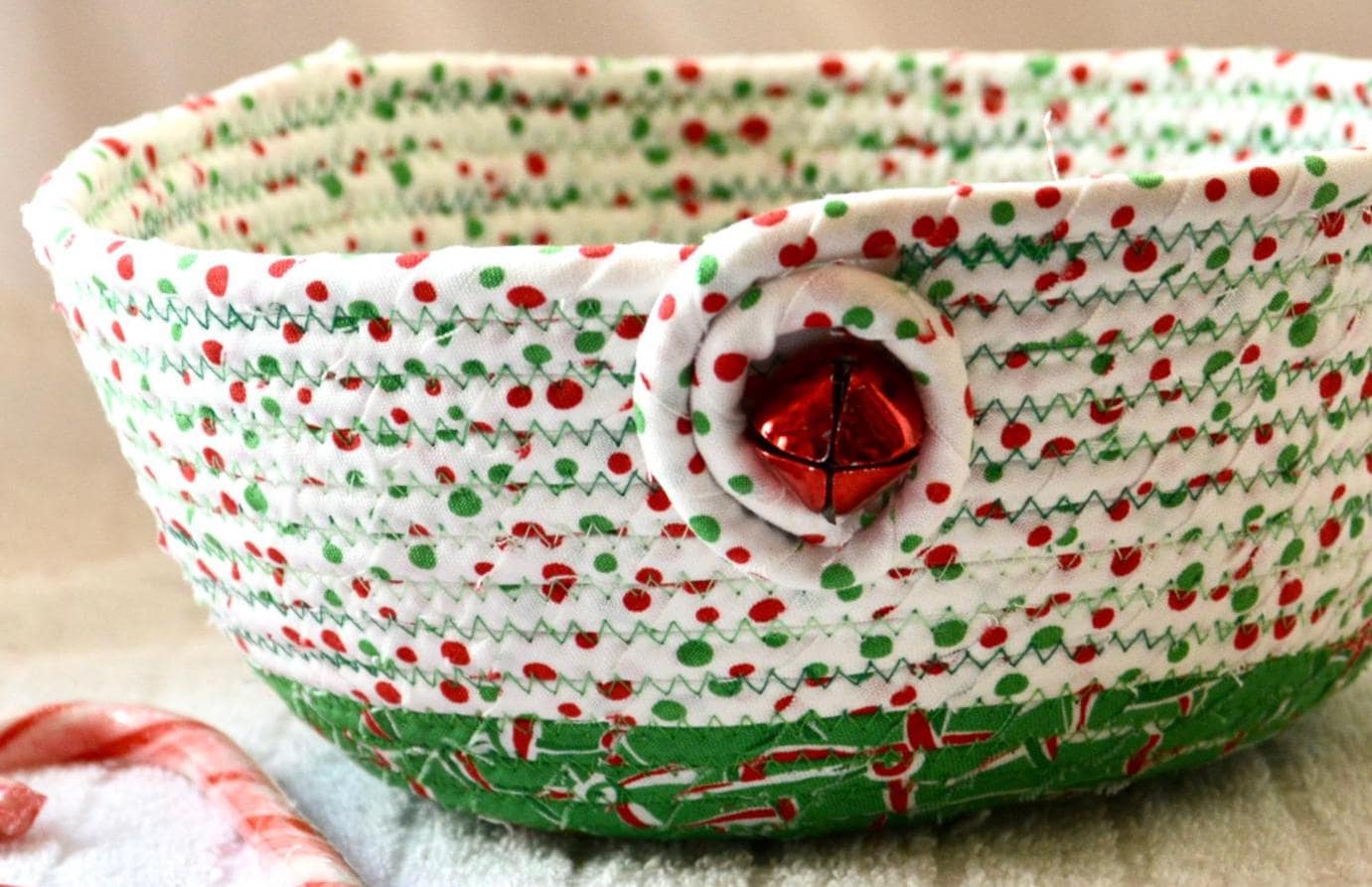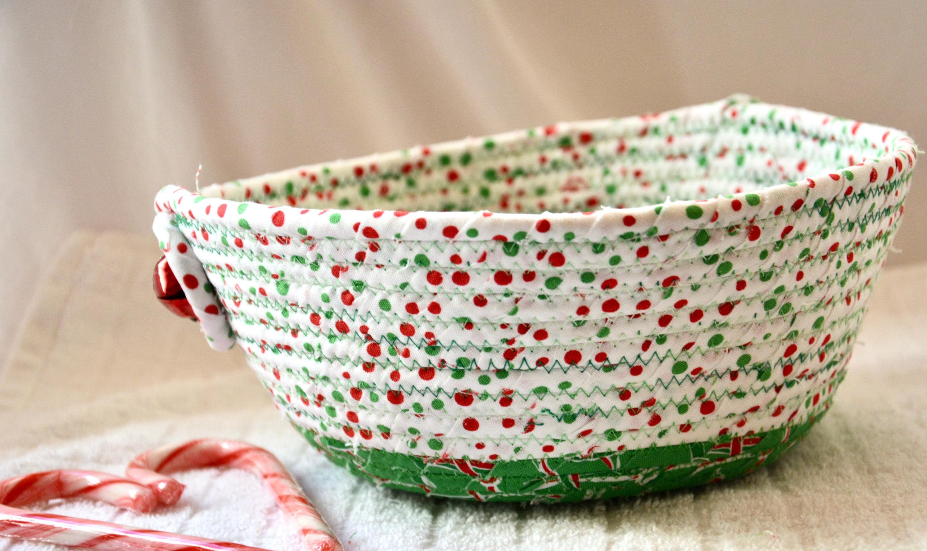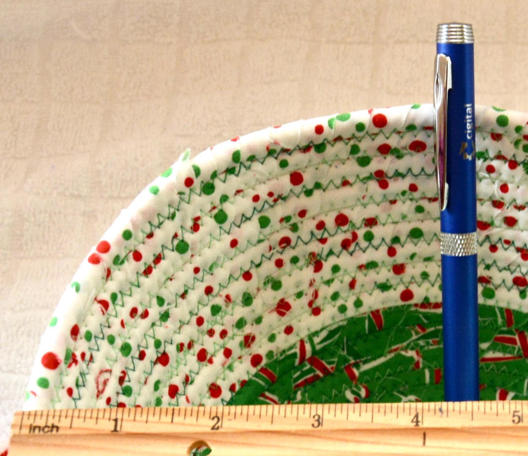 I hand wrapped these high quality Christmas 100% cotton fabrics around cotton line, which I then hand coiled and machine quilted to make it sturdy. I used the raw edge technique with some fray to add a wonderful shabby chic texture. Color placement will vary.