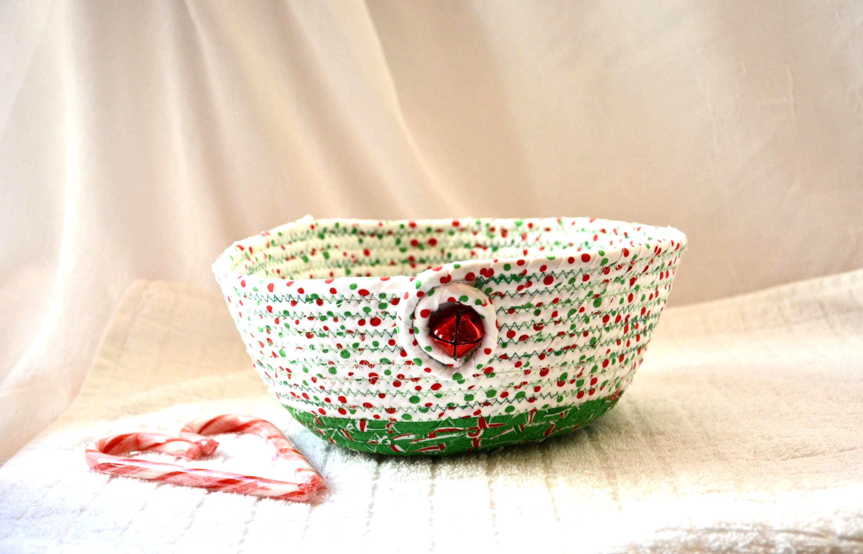 I hand wrapped these high quality Christmas 100% cotton fabrics around cotton line, which I then hand coiled and machine quilted to make it sturdy. I used the raw edge technique with some fray to add a wonderful shabby chic texture. Color placement will vary. Spot clean.