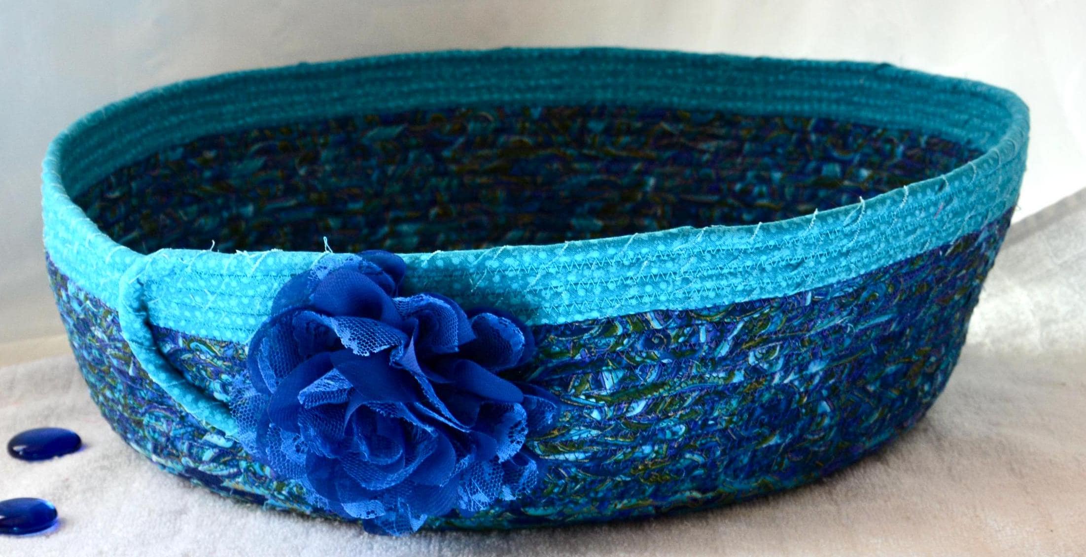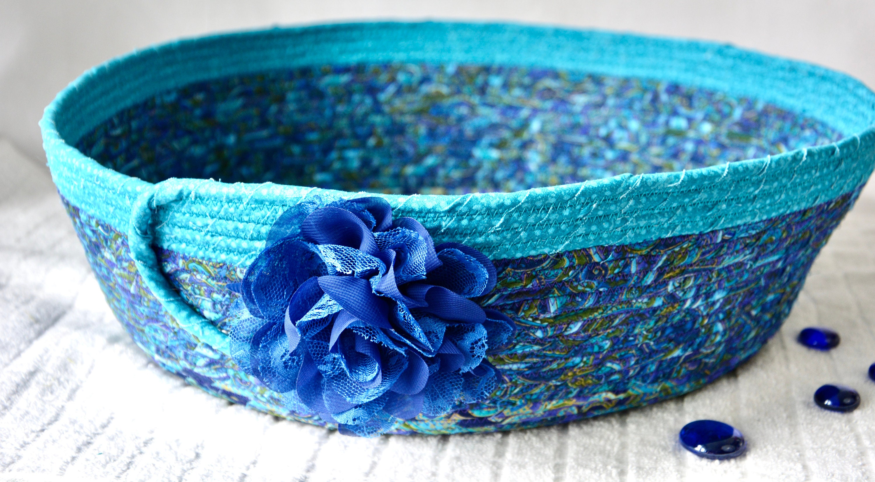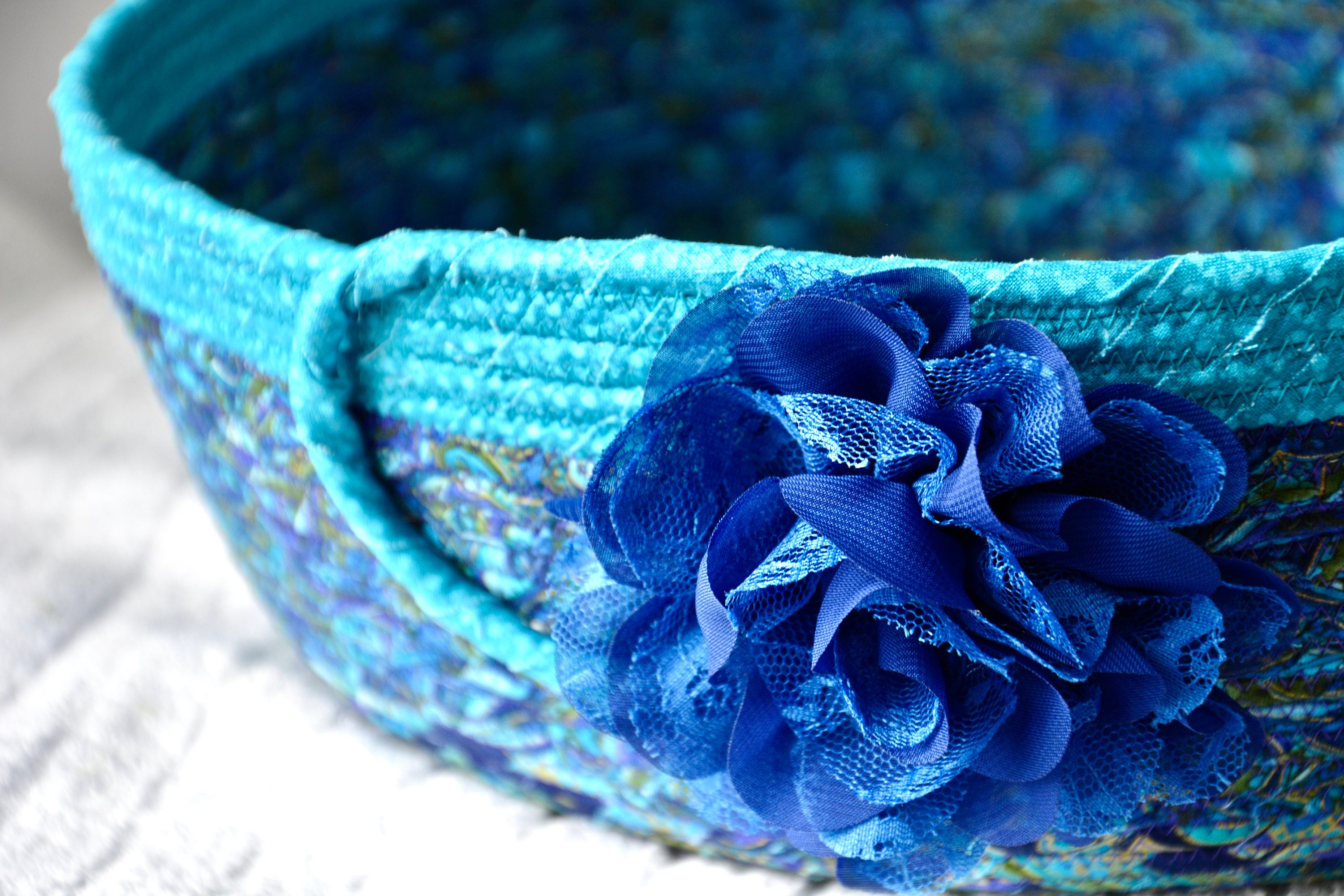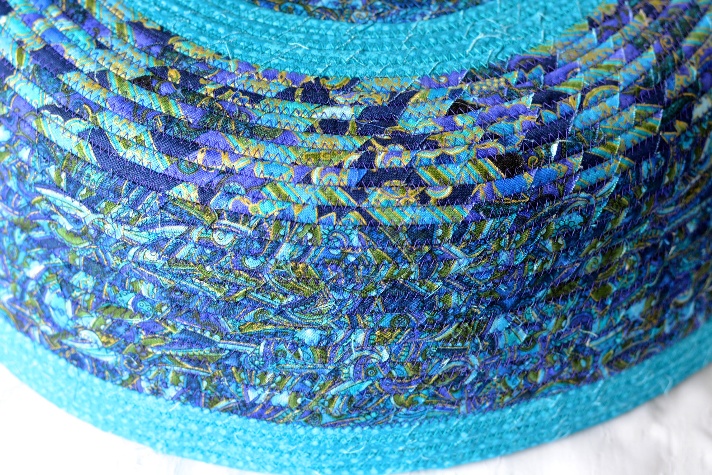I hand wrapped these lovely floral fabrics around cotton line, which I then hand coiled and machine quilted to make it sturdy. I used the raw edge technique with some fray. These rich blue fabrics show on the inside of this lovely basket too! All are 100% cotton! I just love these beautiful fabrics, both have rich gold metallic highlights! The pretty flower on the basket is included for a nice accent.