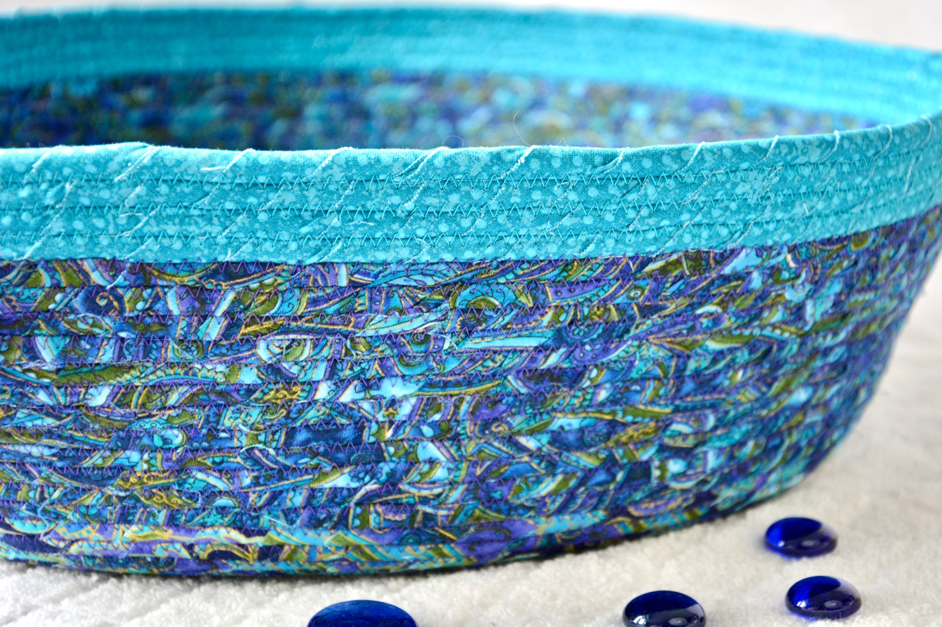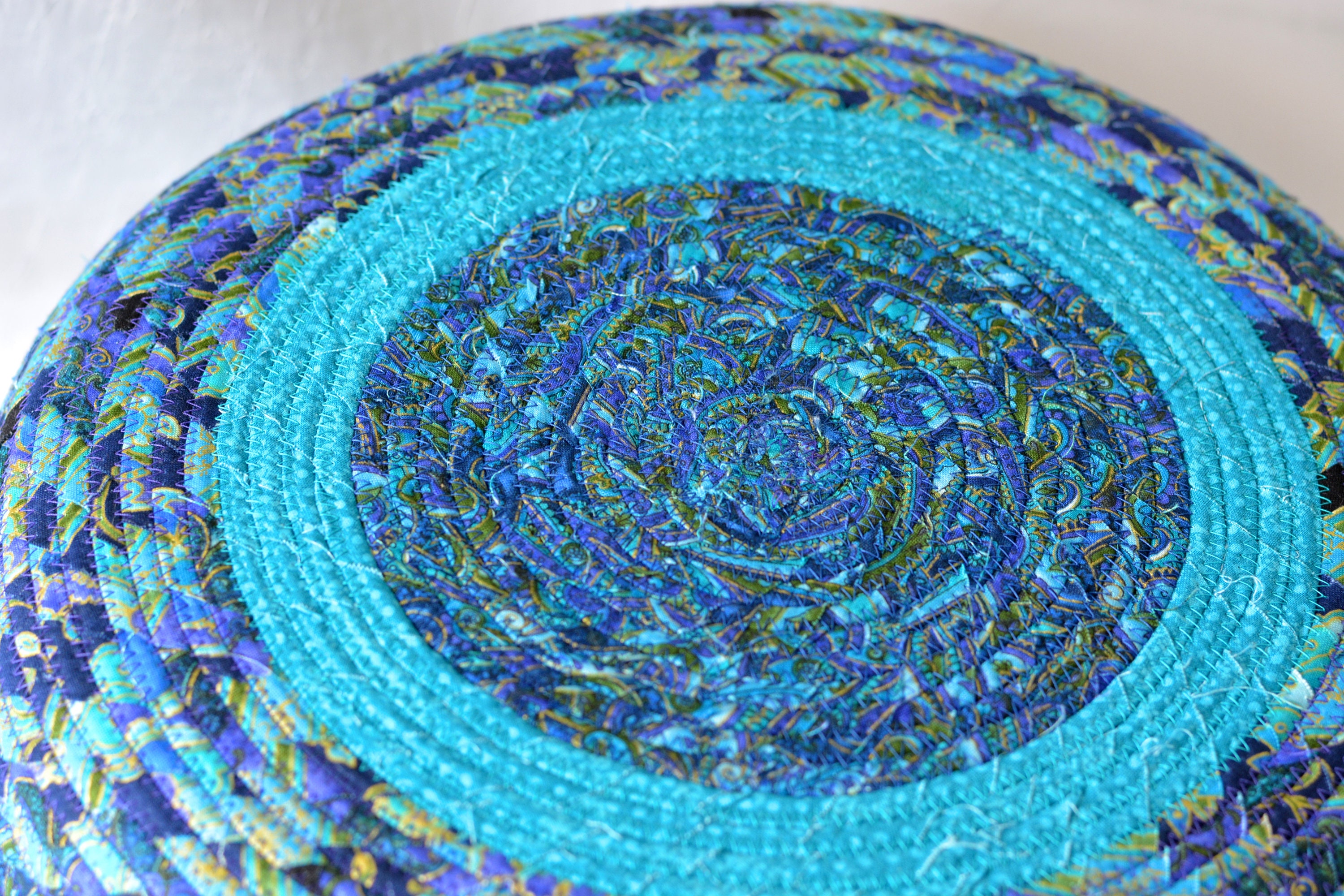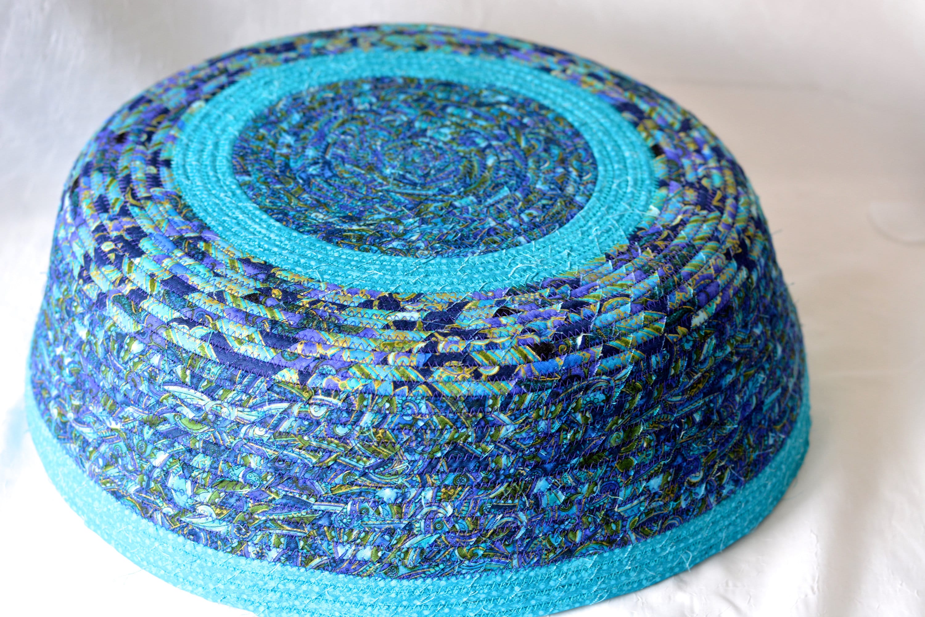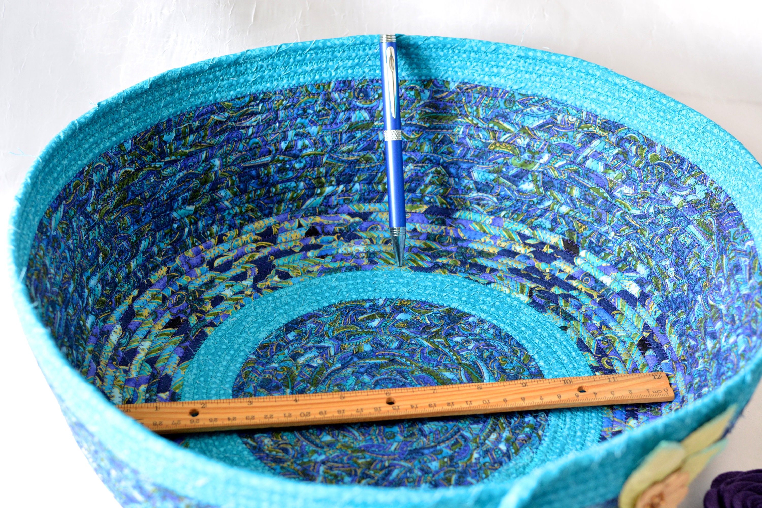 I hand wrapped these lovely floral fabrics around cotton line, which I then hand coiled and machine quilted to make it sturdy. I used the raw edge technique with some fray. These rich blue fabrics show on the inside of this lovely basket too! All are 100% cotton! I just love these beautiful fabrics, both have rich gold metallic highlights! The pretty flower on the basket is included for a nice accent.