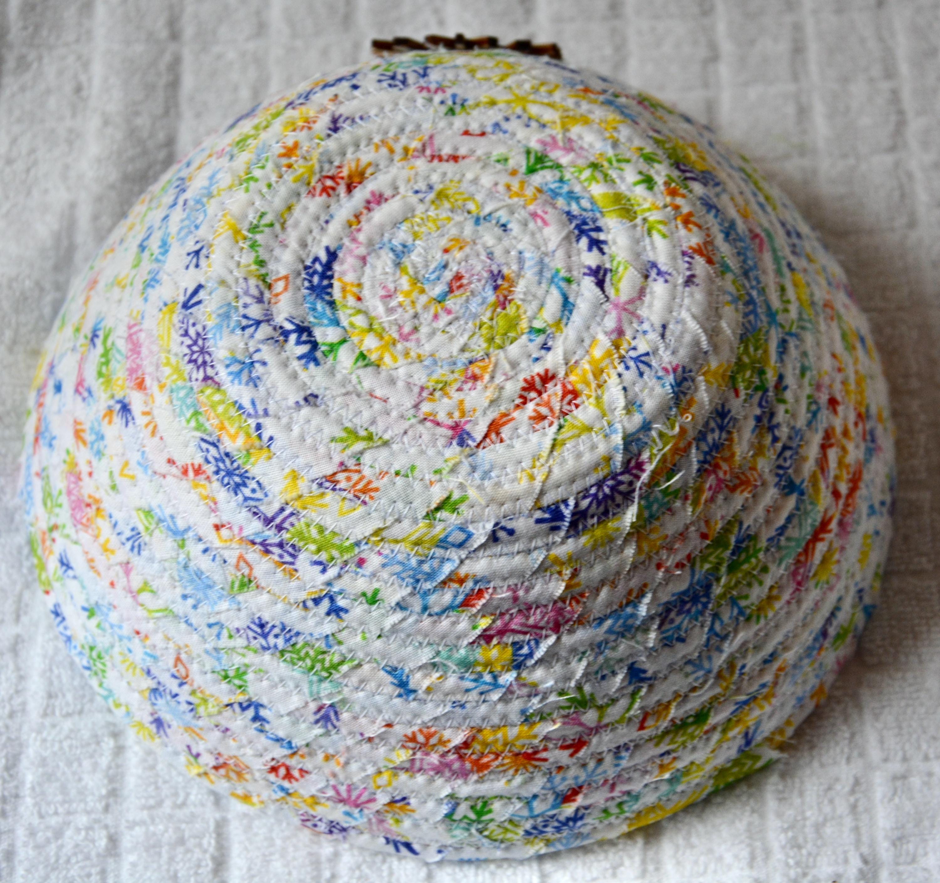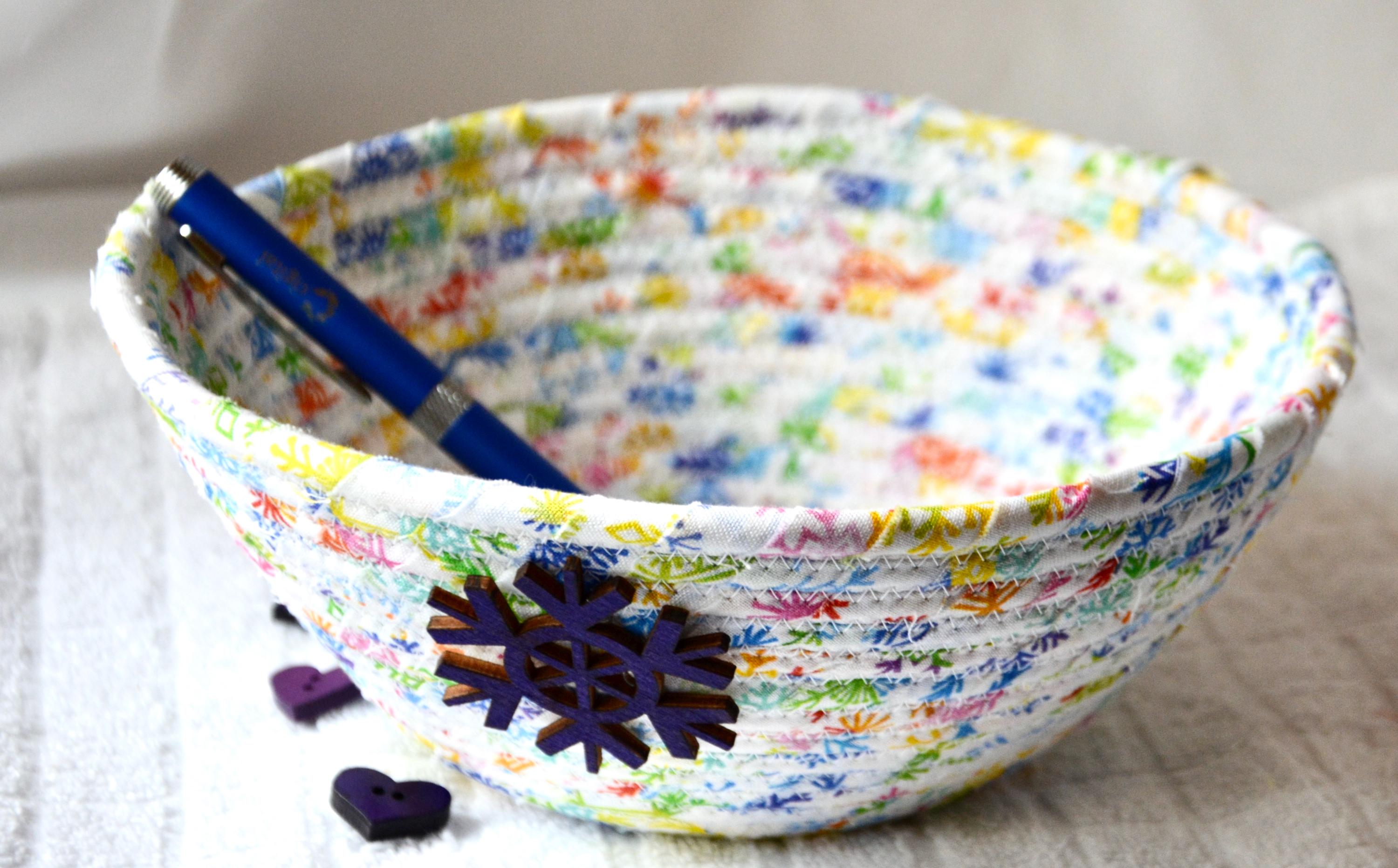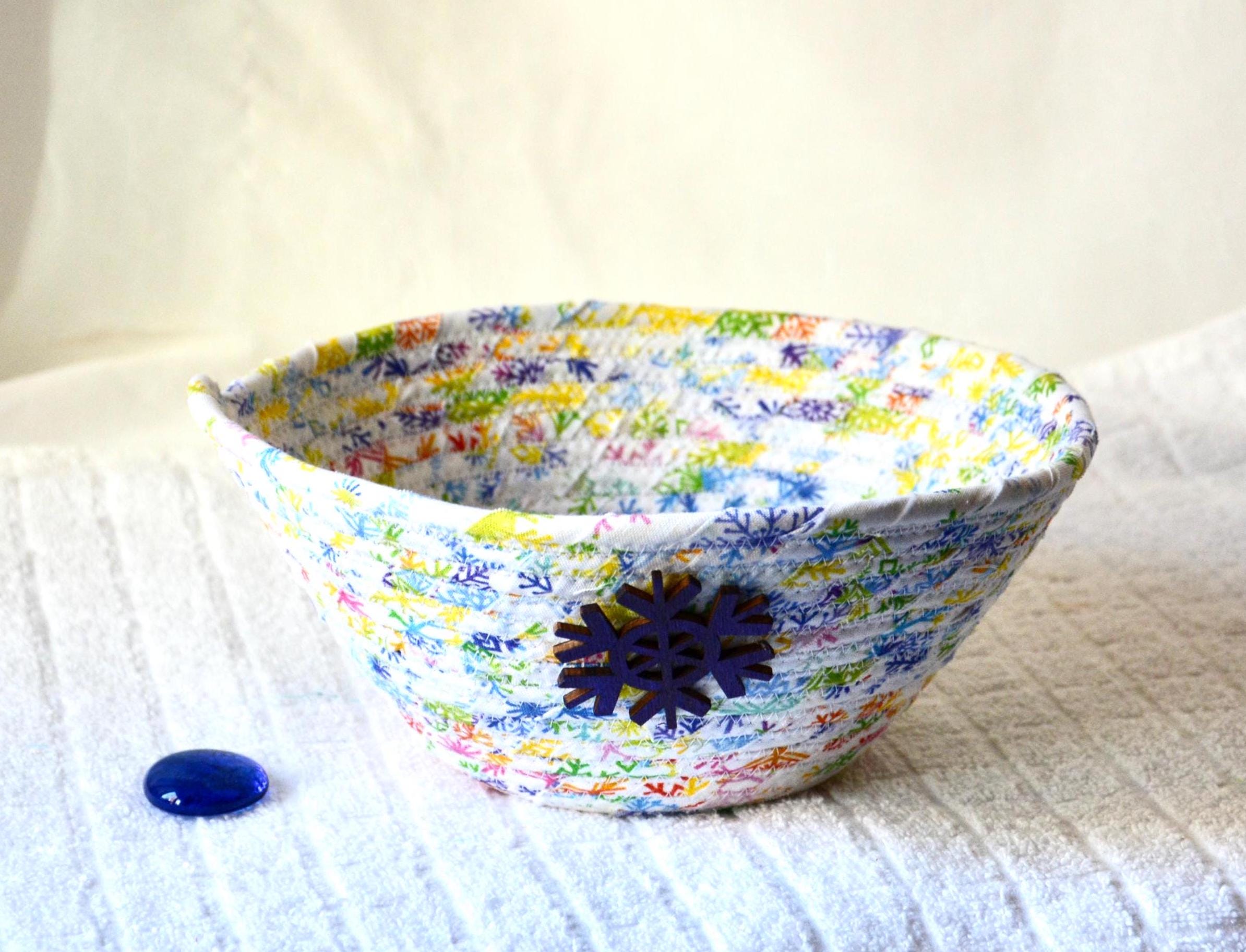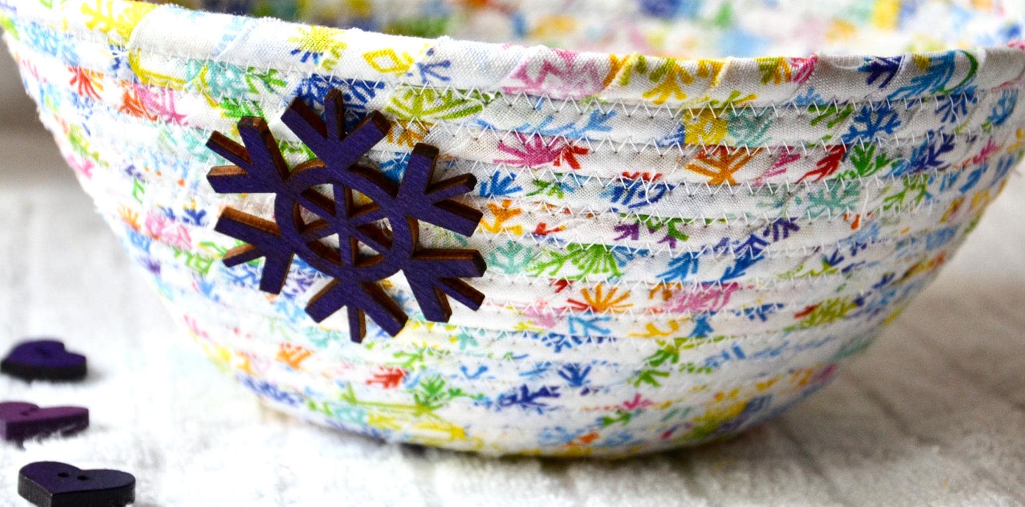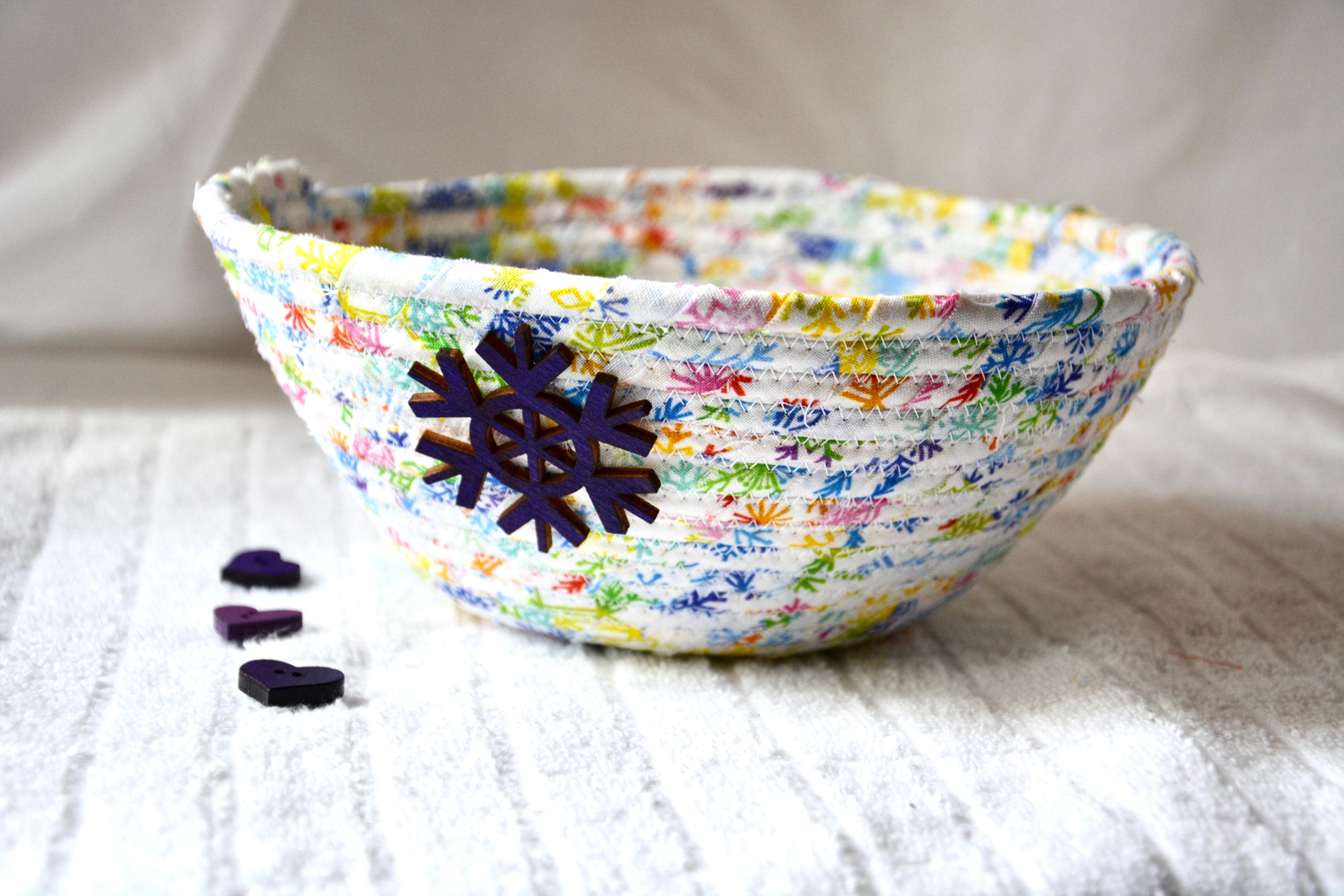 I hand wrapped this high quality fabric around cotton line, which I then hand coiled and machine quilted to make it sturdy. I used the raw edge technique with some fray to add a wonderful shabby chic texture. I just love the colorful snowflake highlights! So festive! The pretty purple snowflake on the basket is included for a nice accent.