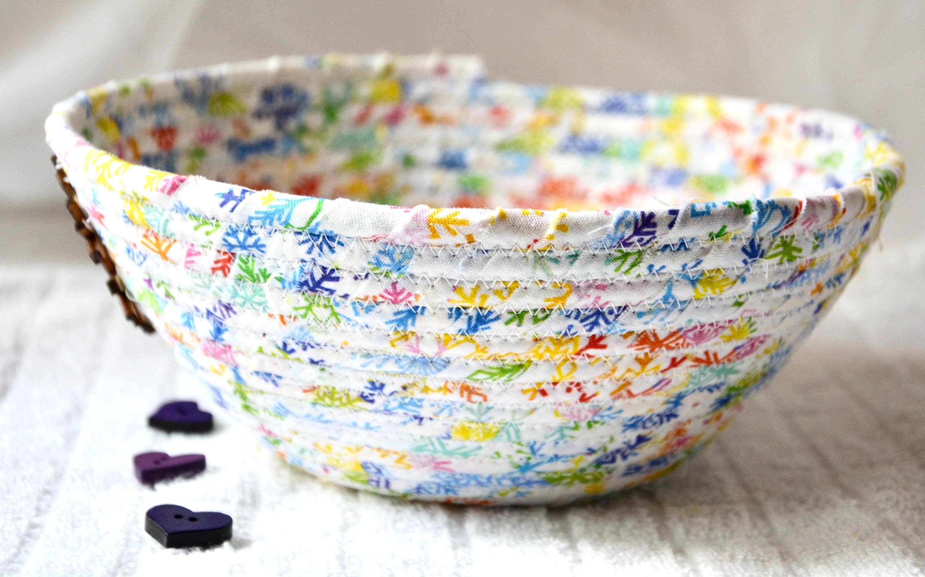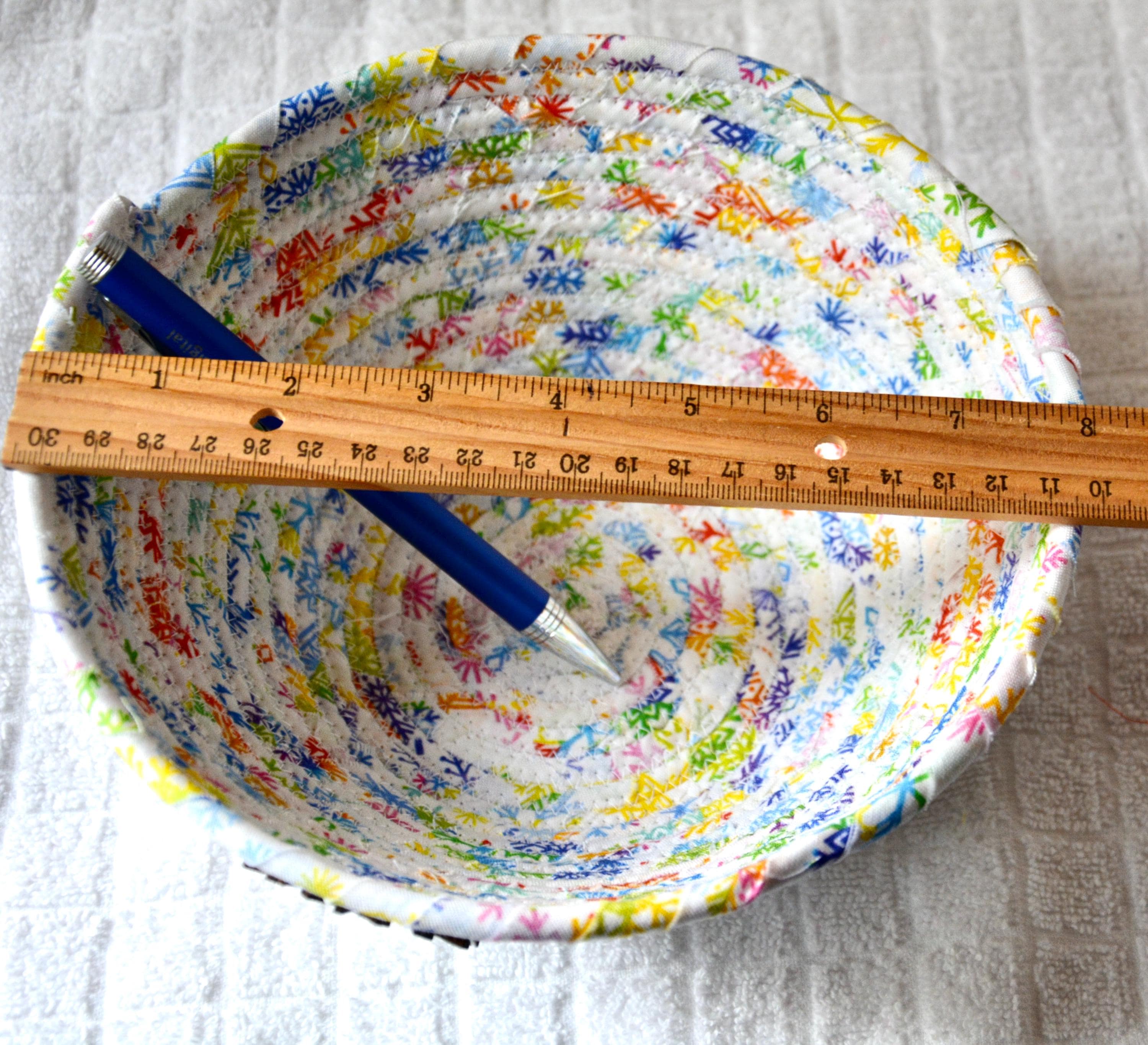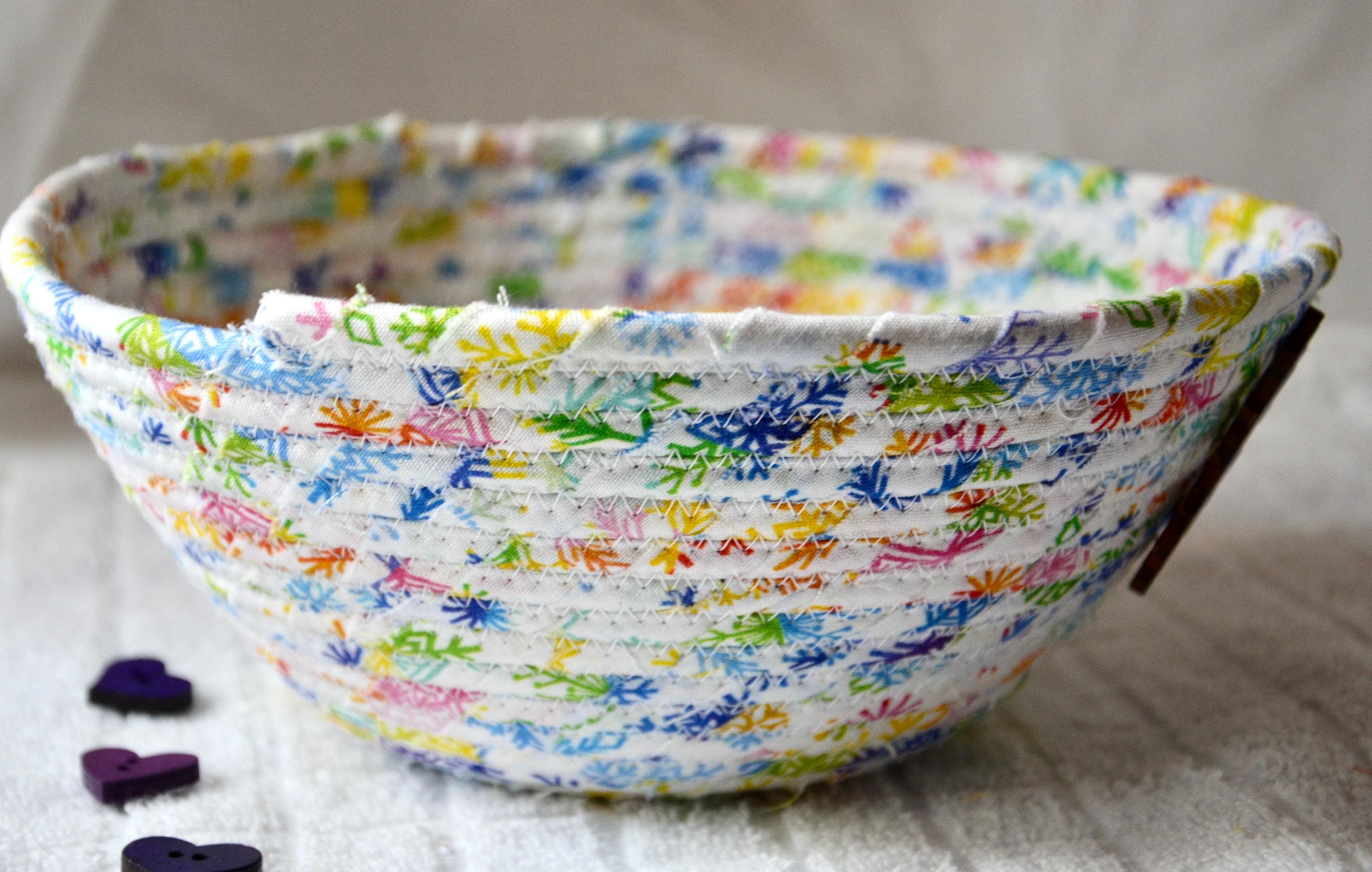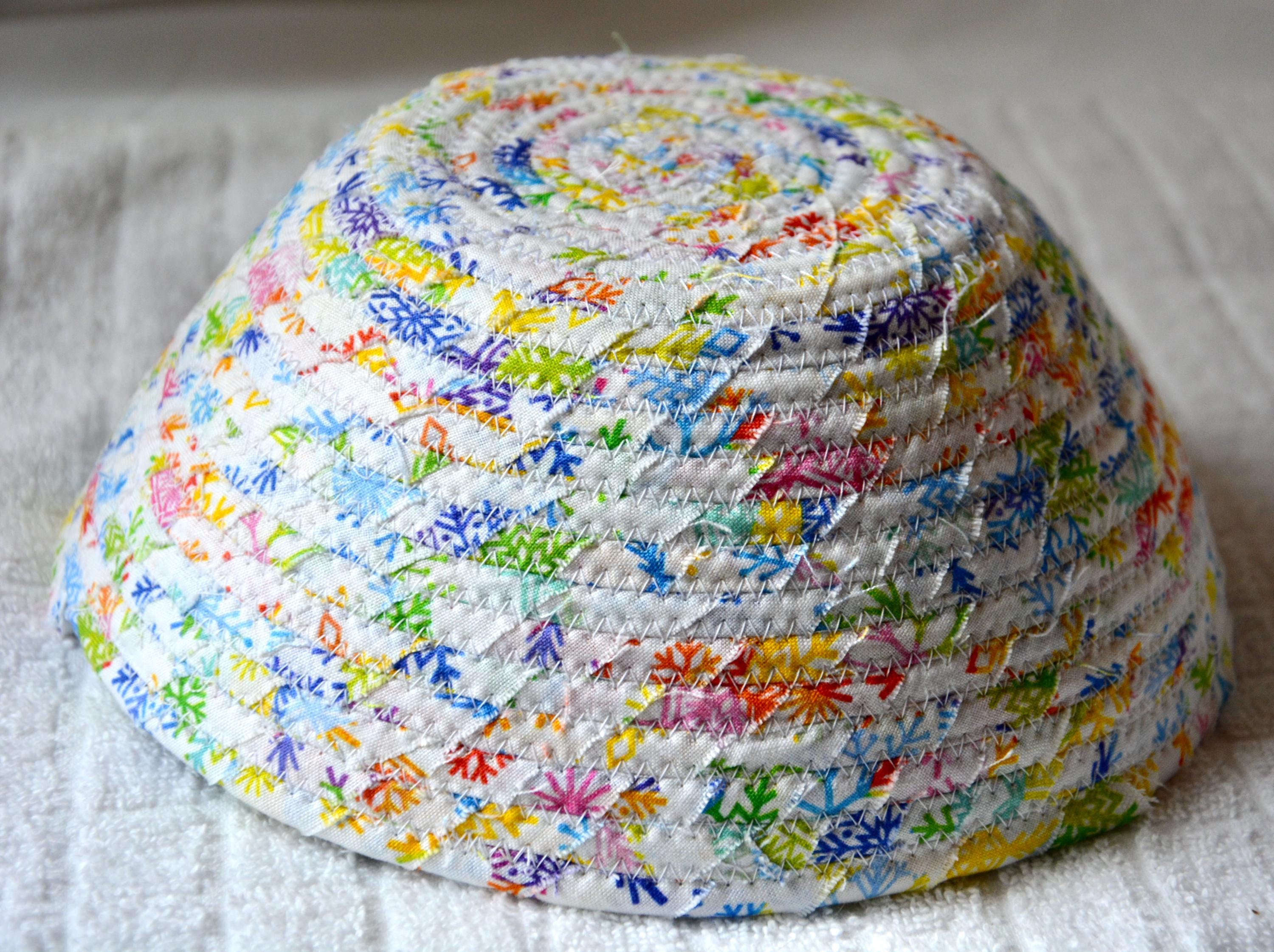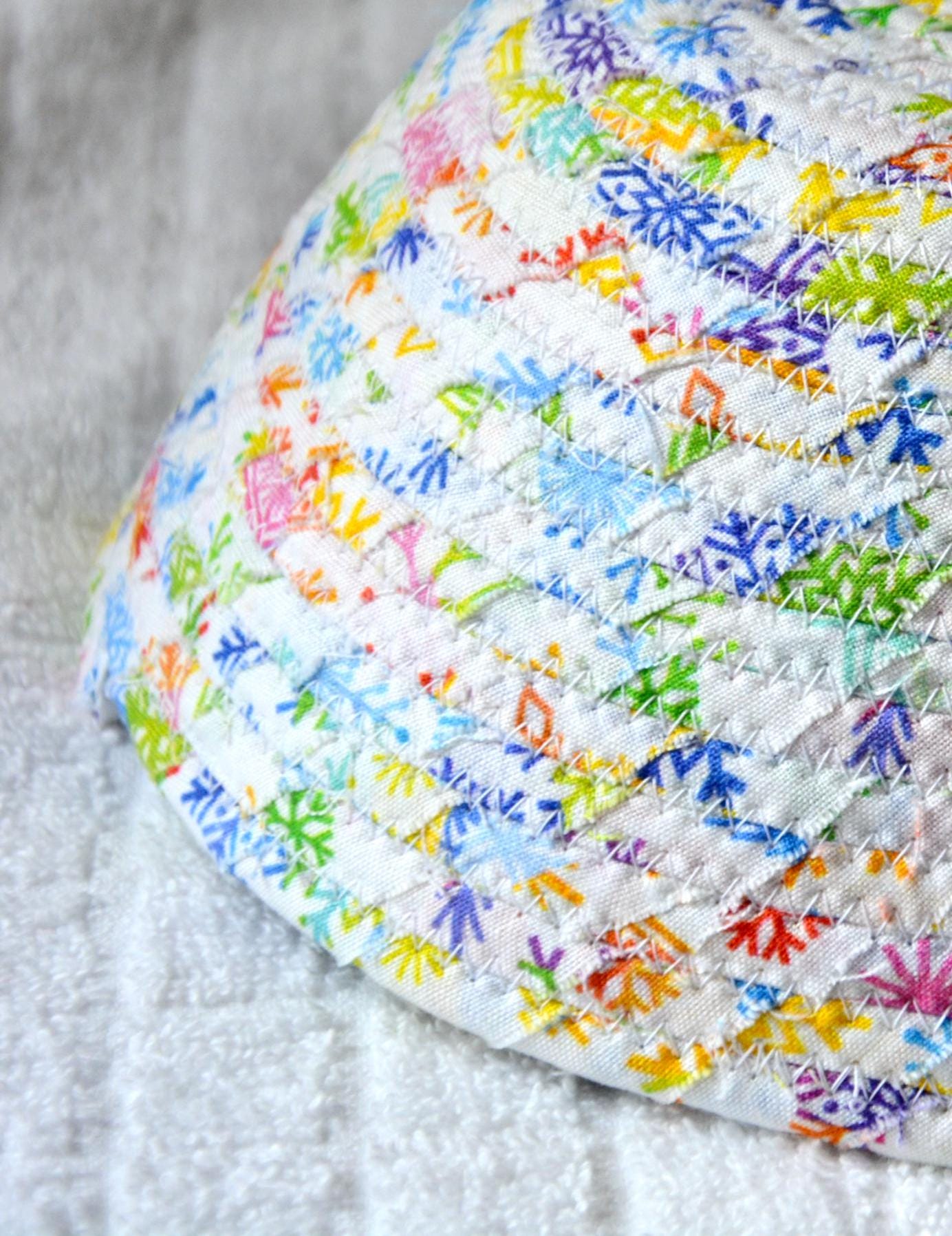 I hand wrapped this high quality fabric around cotton line, which I then hand coiled and machine quilted to make it sturdy. I used the raw edge technique with some fray to add a wonderful shabby chic texture. I just love the colorful snowflake highlights! So festive! The pretty purple snowflake on the basket is included for a nice accent.