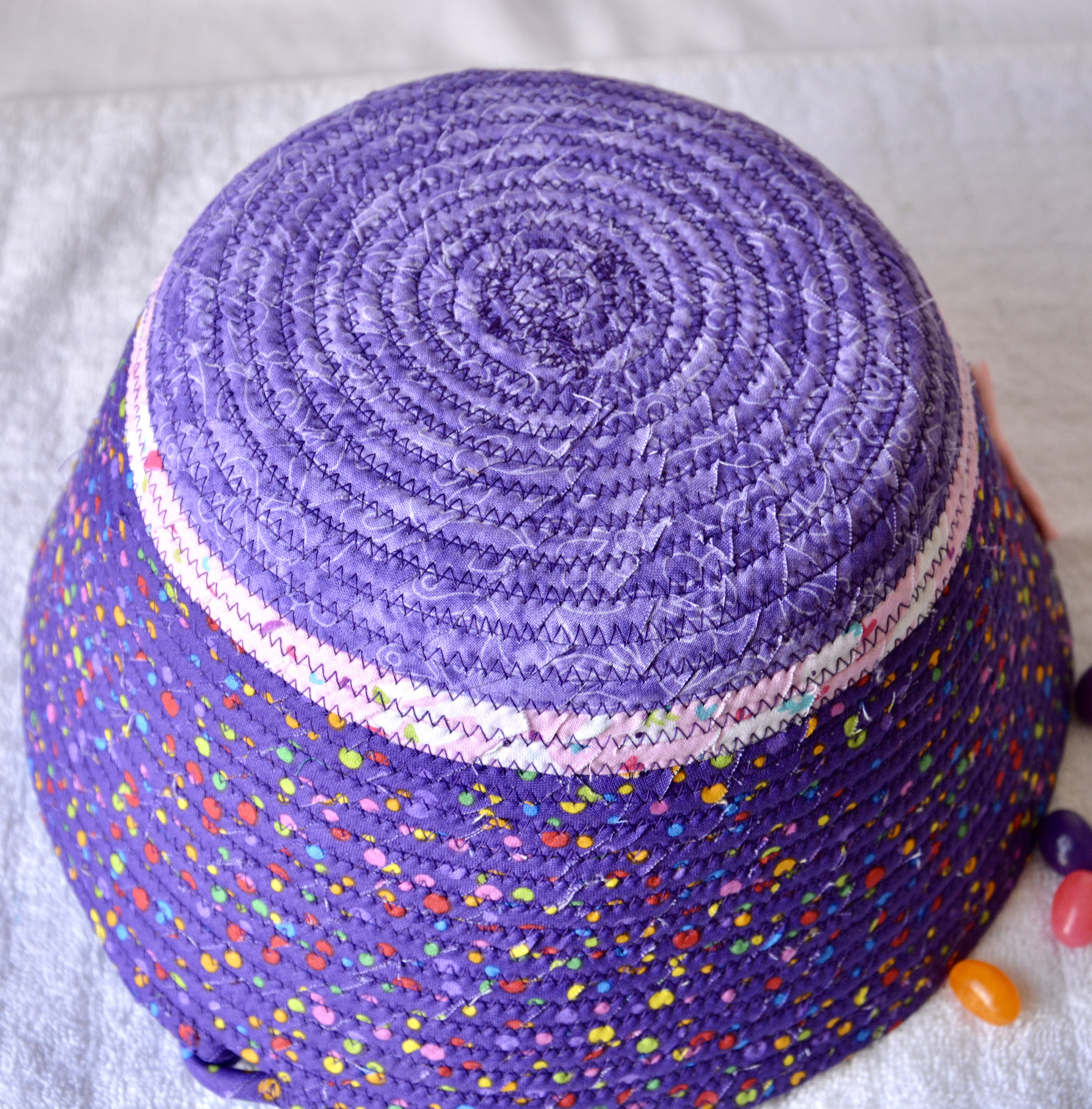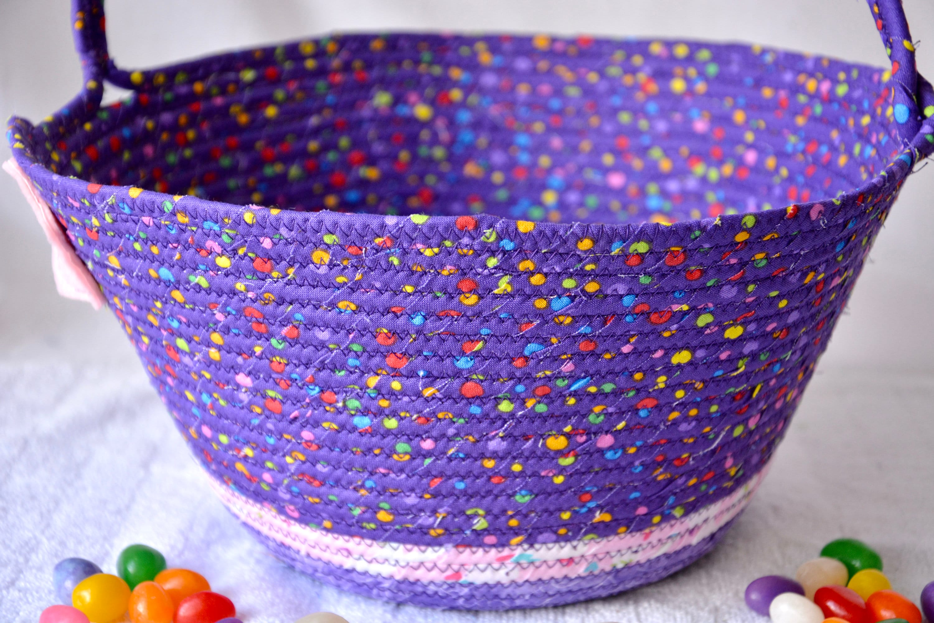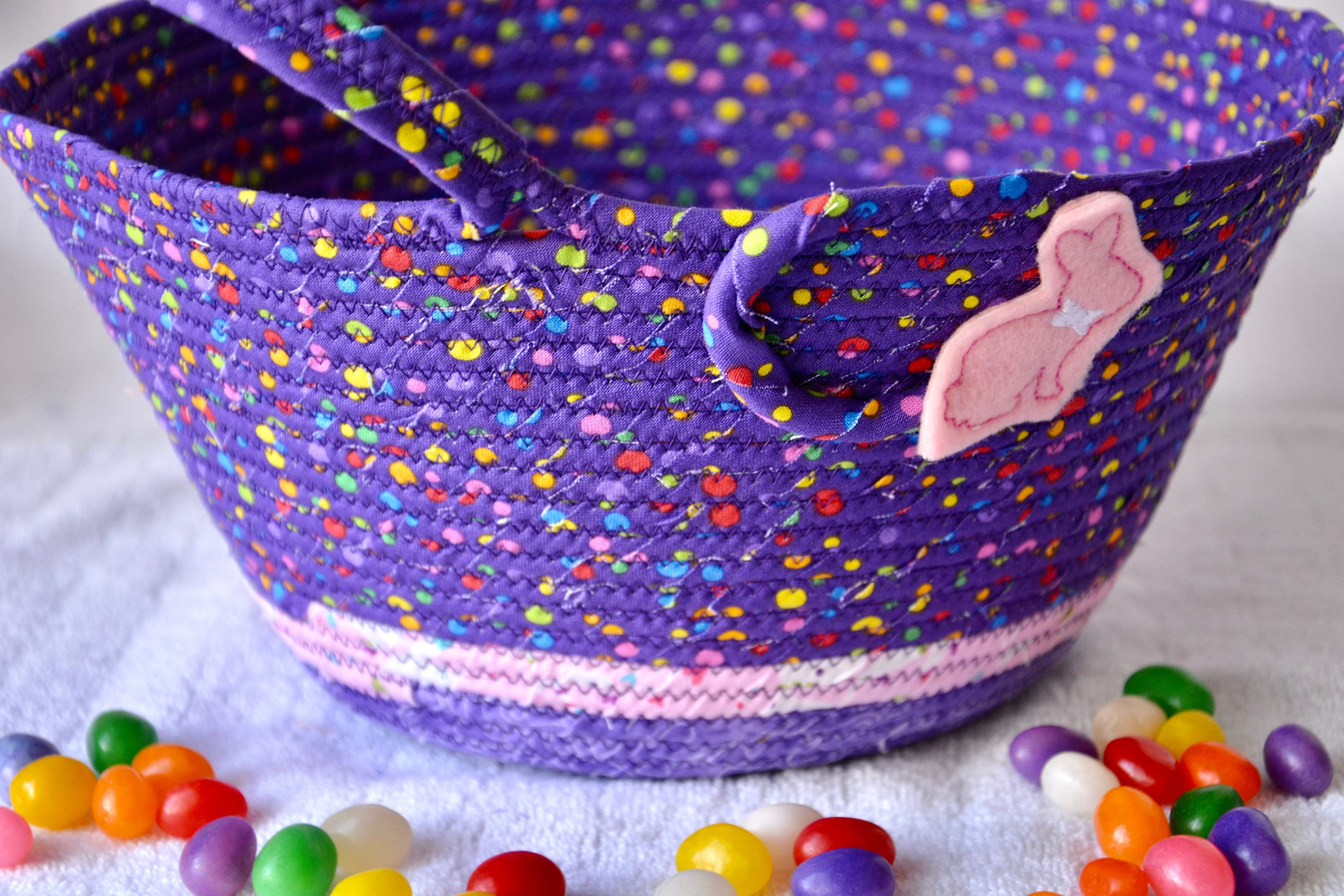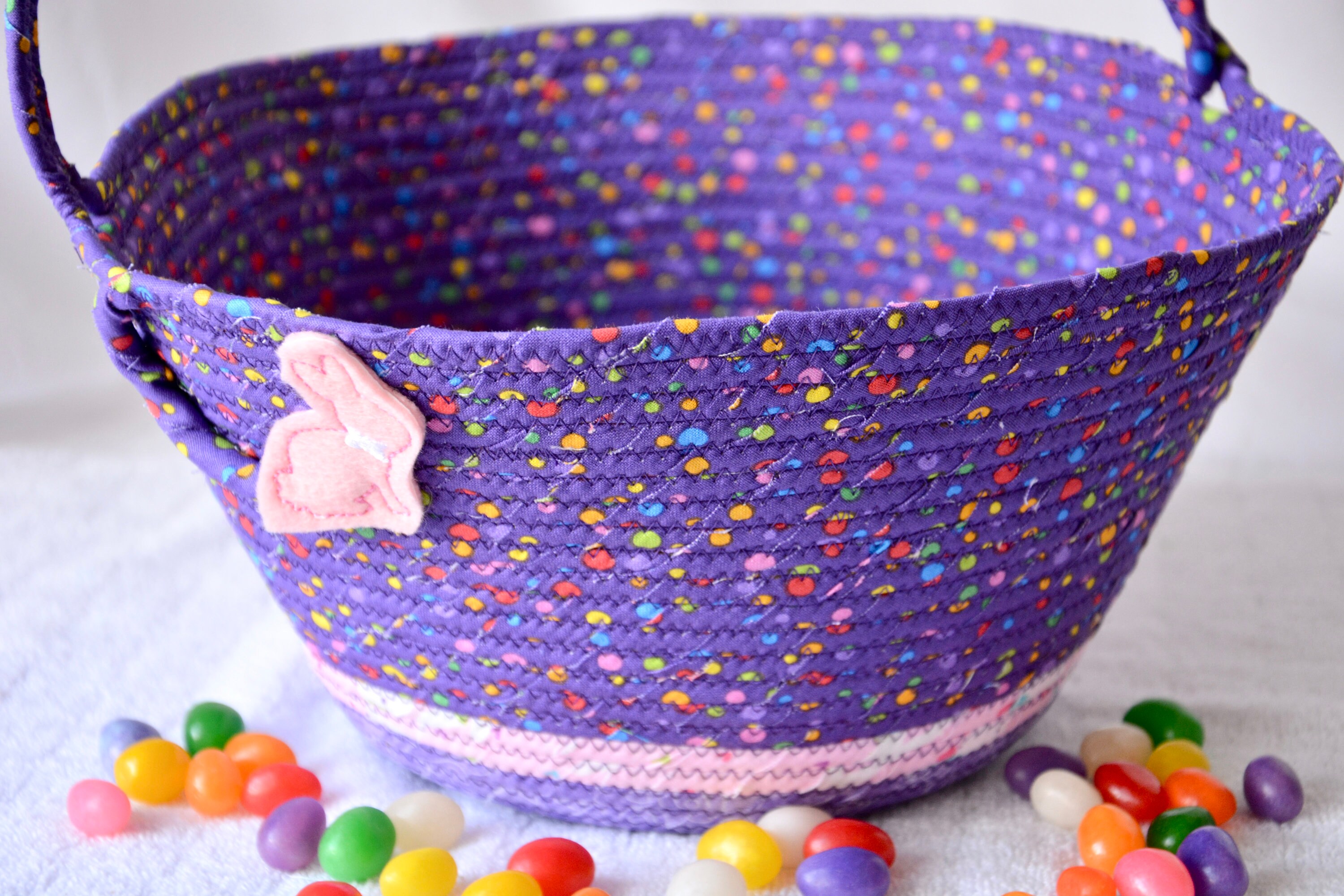 I hand wrapped these cute purple fabrics around cotton line, which I then hand coiled and machine sewed to make it sturdy. I used the raw edge technique with a little fray for a nice shabby chic texture. I just love this pretty dotted fabric, the highlights are beautiful! All of these fabrics are 100% cotton and both show on the inside of the basket too! The cute felted Easter bunny on the basket is included for a nice accent.