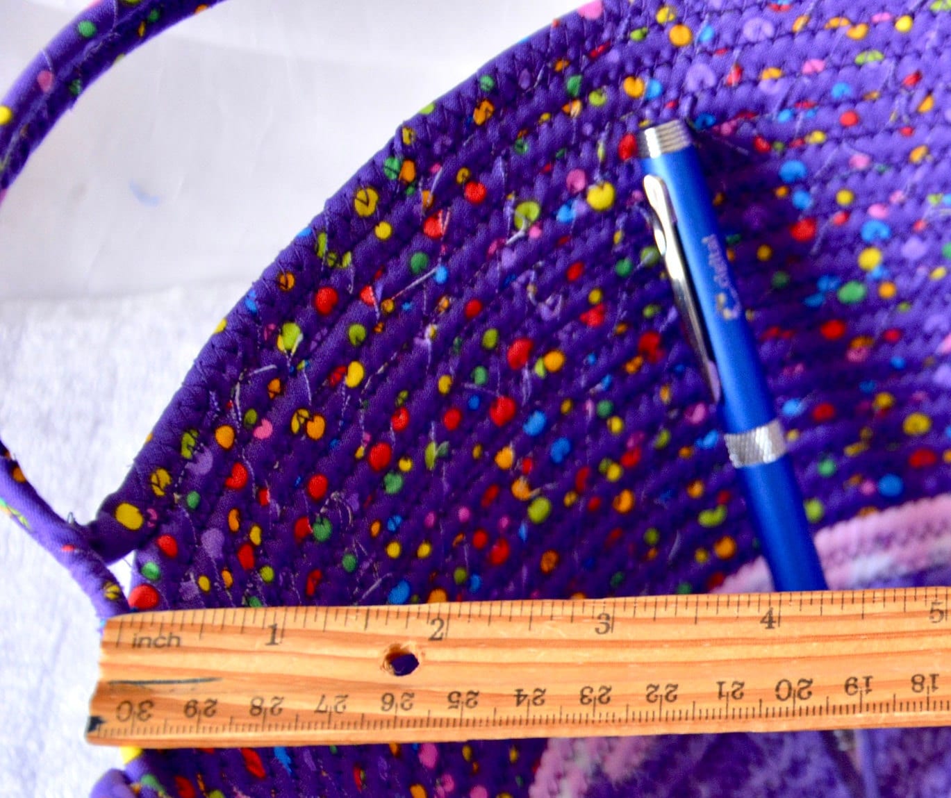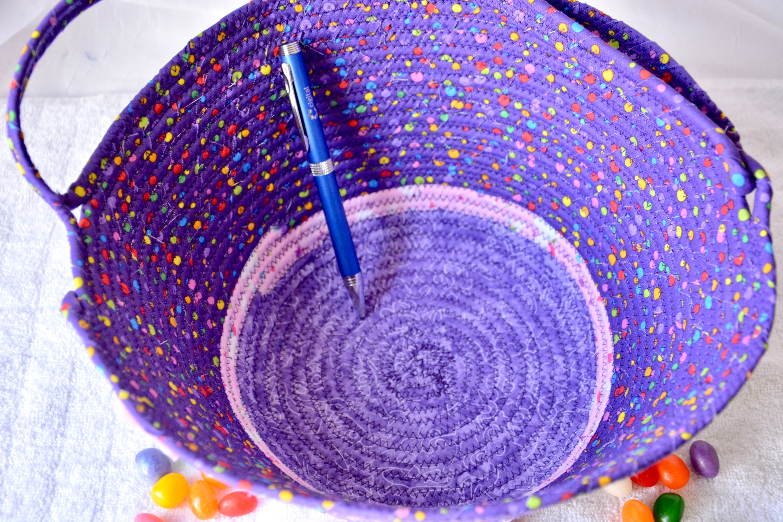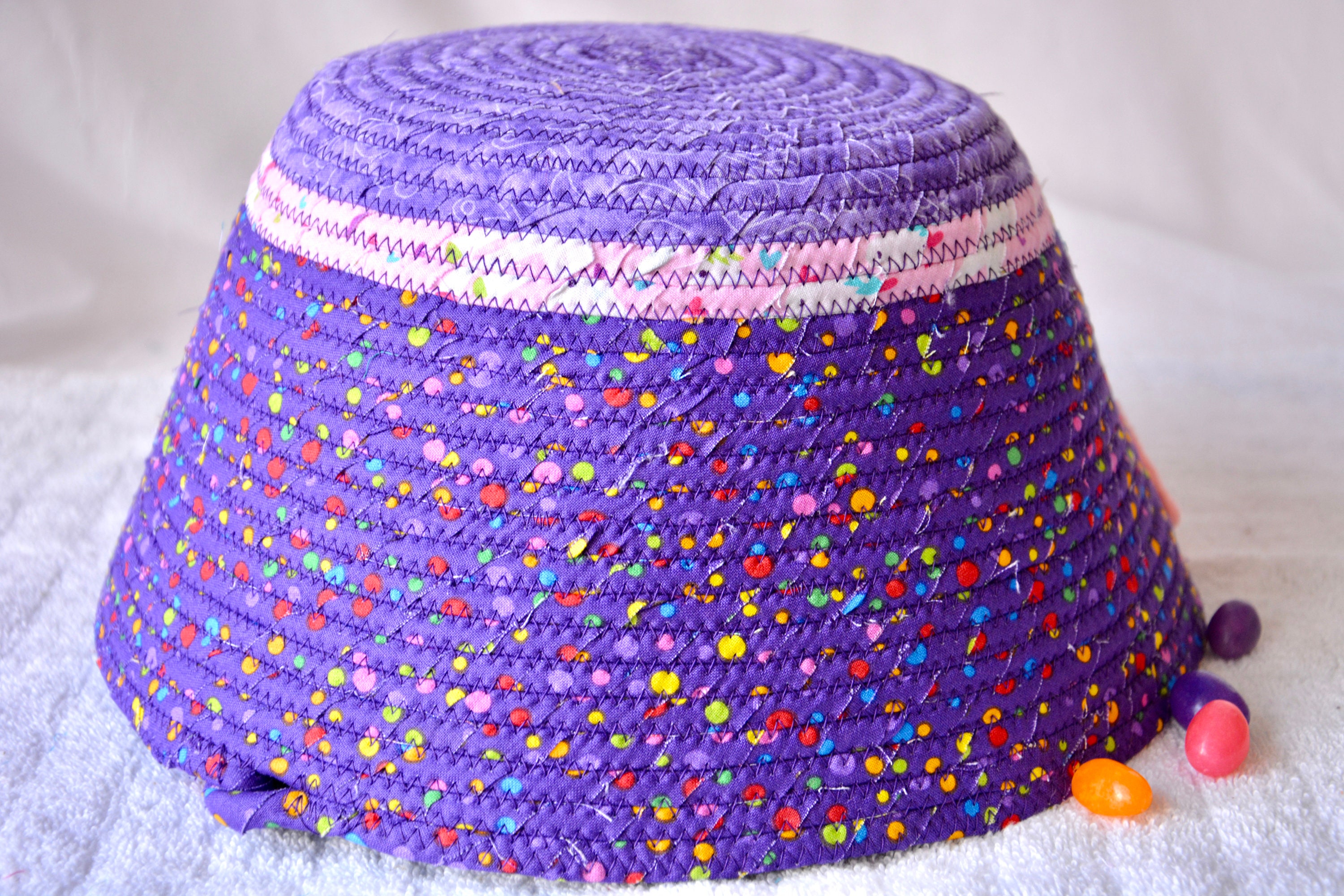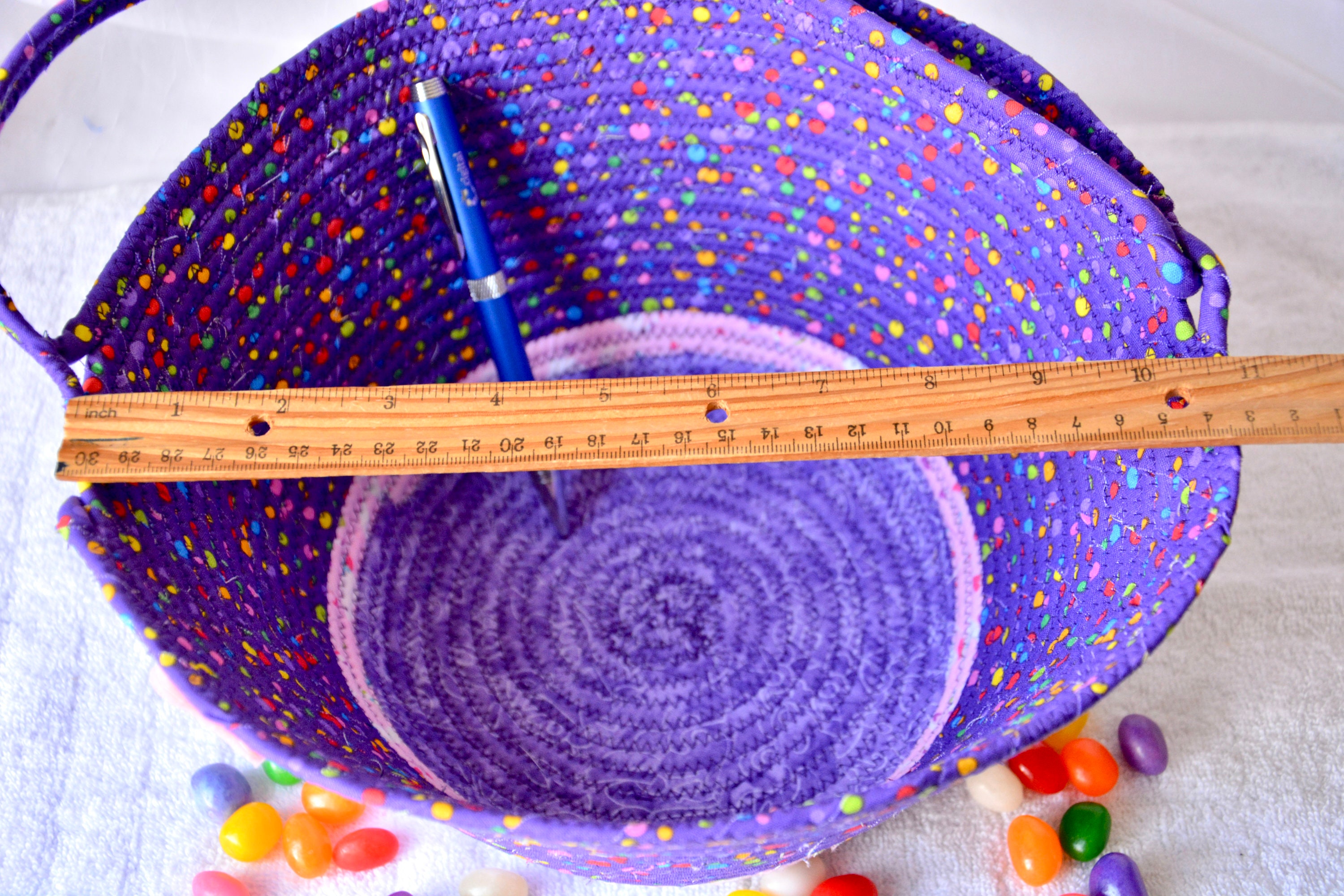 I hand wrapped these cute purple fabrics around cotton line, which I then hand coiled and machine sewed to make it sturdy. I used the raw edge technique with a little fray for a nice shabby chic texture. I just love this pretty dotted fabric, the highlights are beautiful! All of these fabrics are 100% cotton and both show on the inside of the basket too! The cute felted Easter bunny on the basket is included for a nice accent.