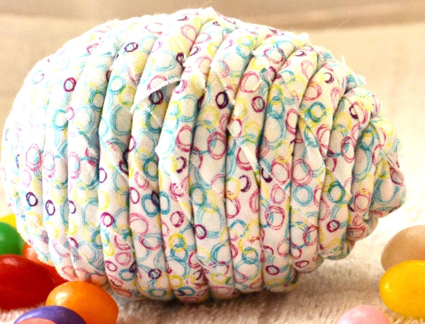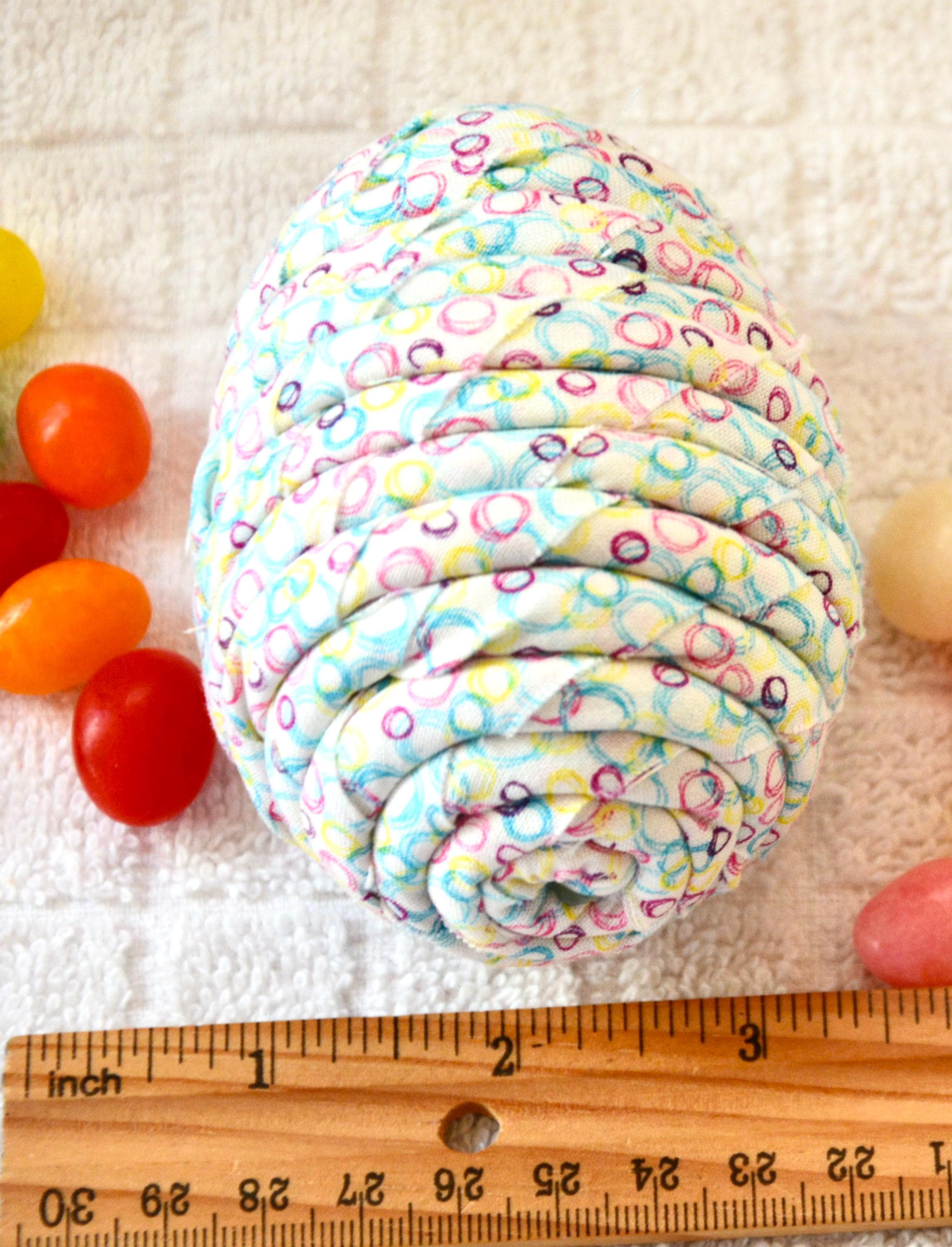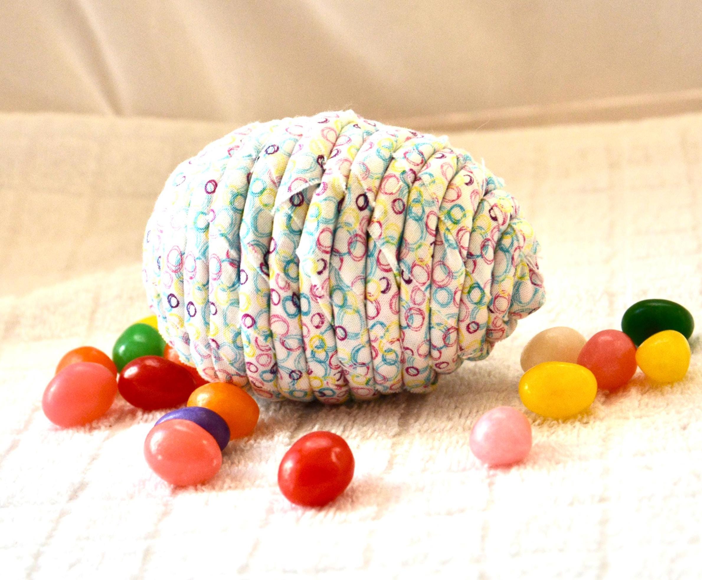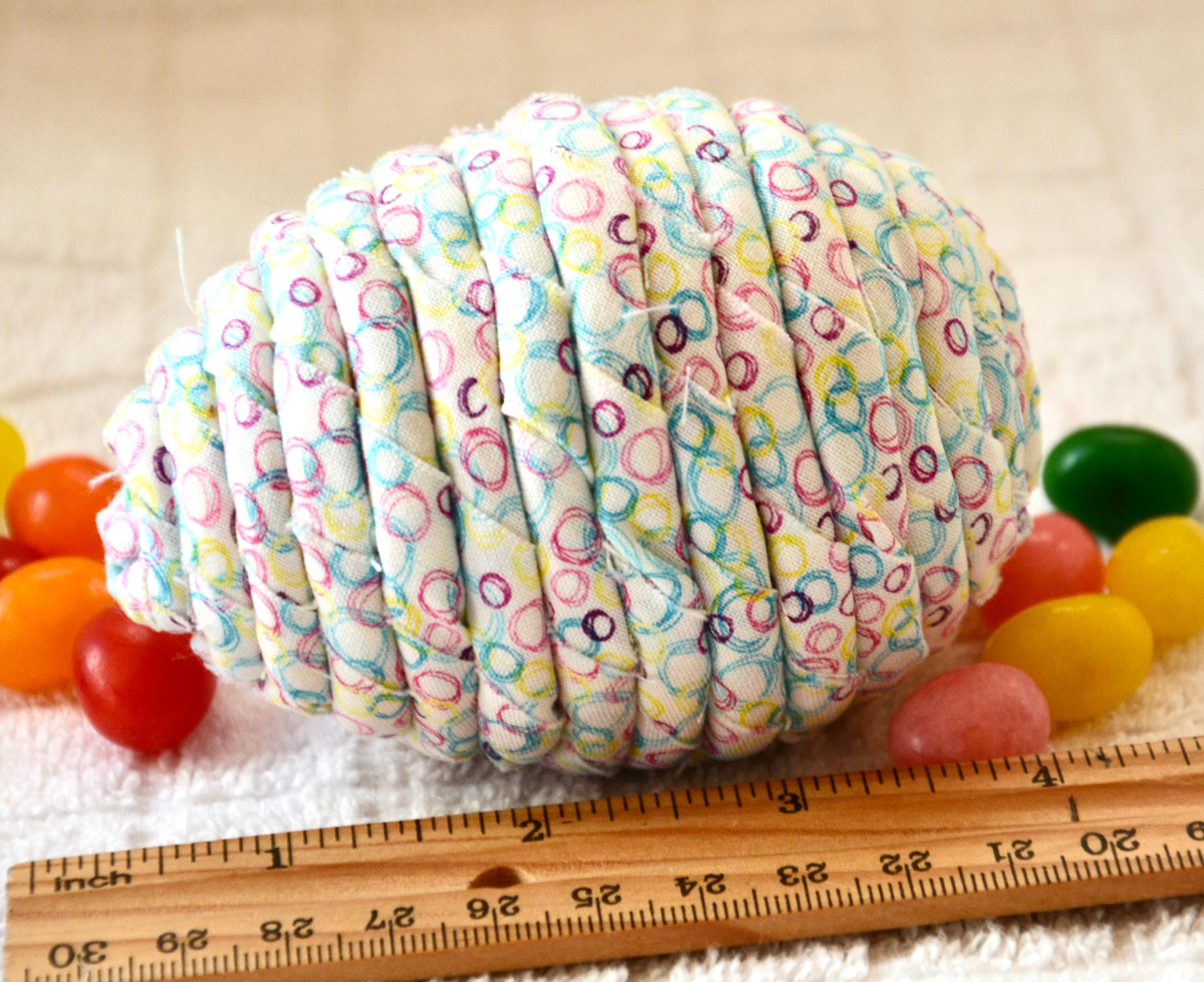 I hand wrapped this cute fabric with circles around cotton line which I than hand coiled into an Easter Egg shape. The fabric edge is unfinished for a lovely shabby chic texture.