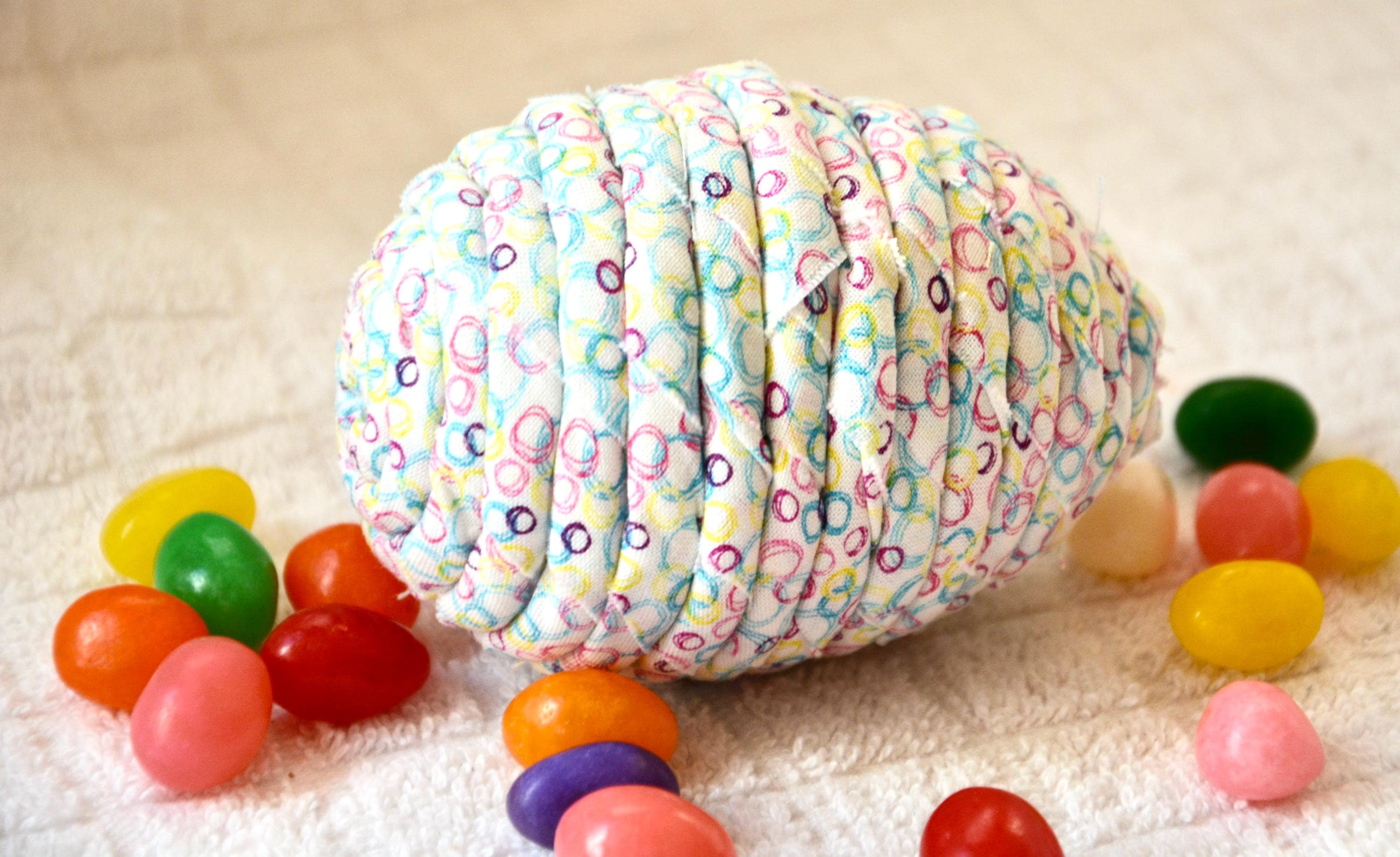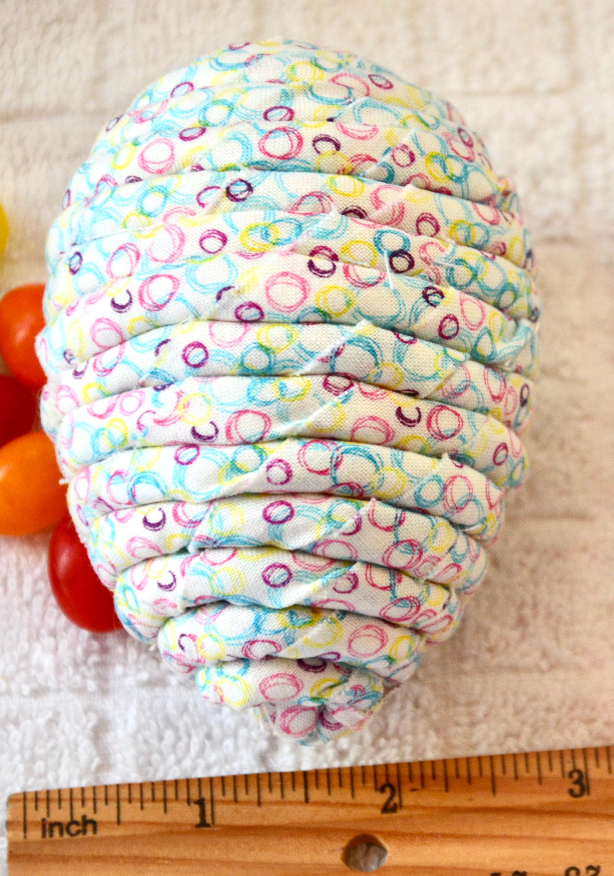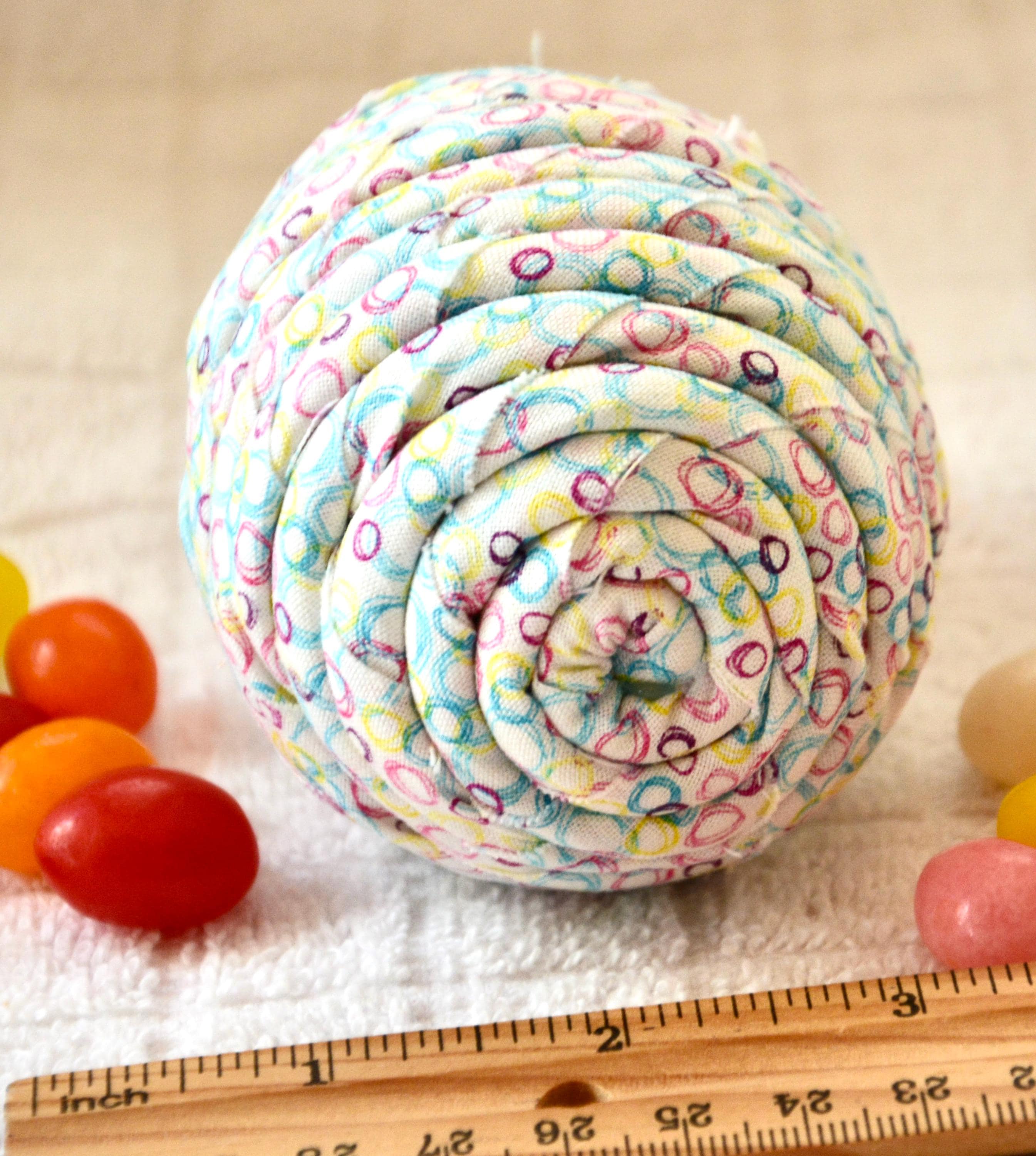 I hand wrapped this cute fabric with circles around cotton line which I than hand coiled into an Easter Egg shape. The fabric edge is unfinished for a lovely shabby chic texture.