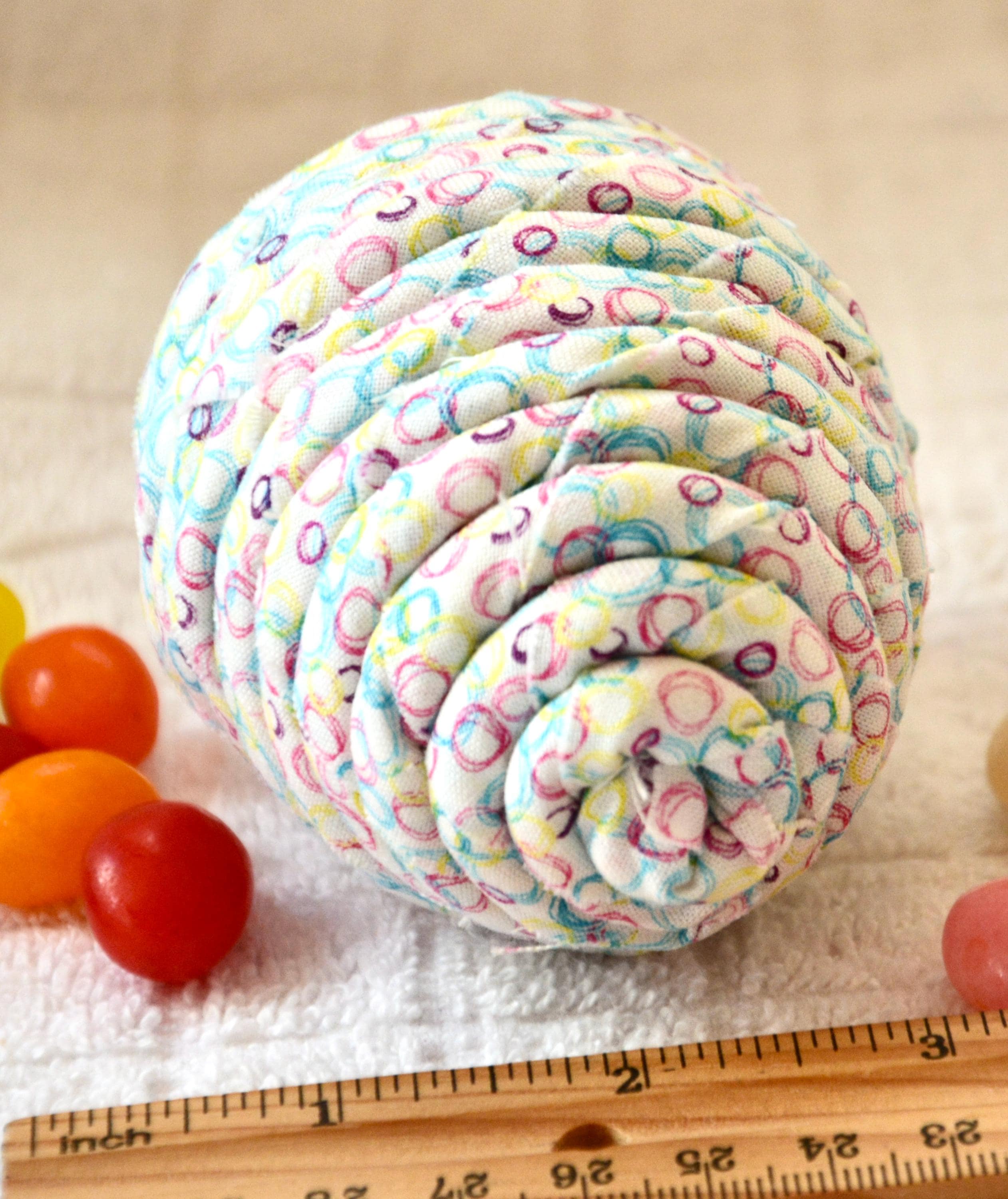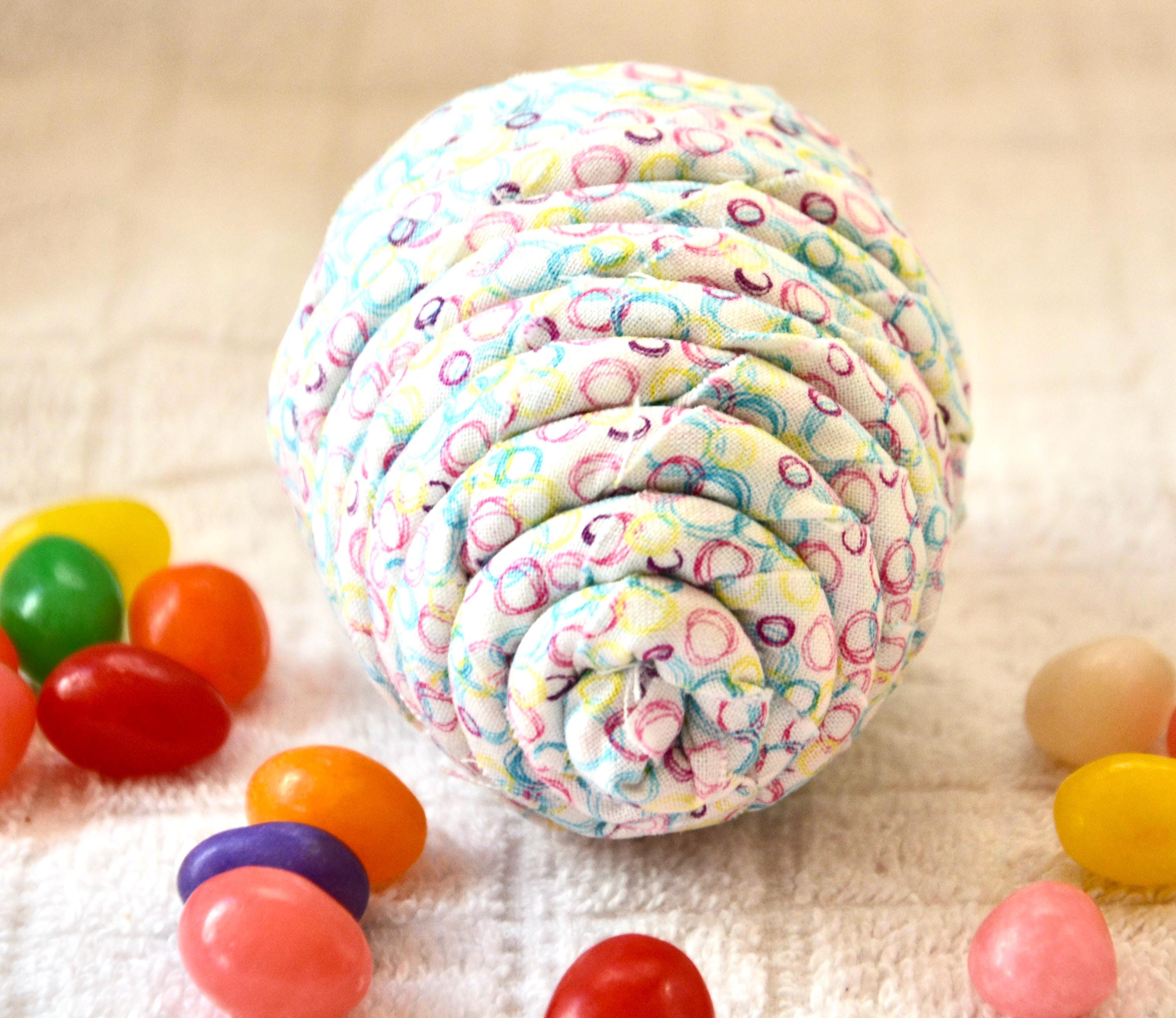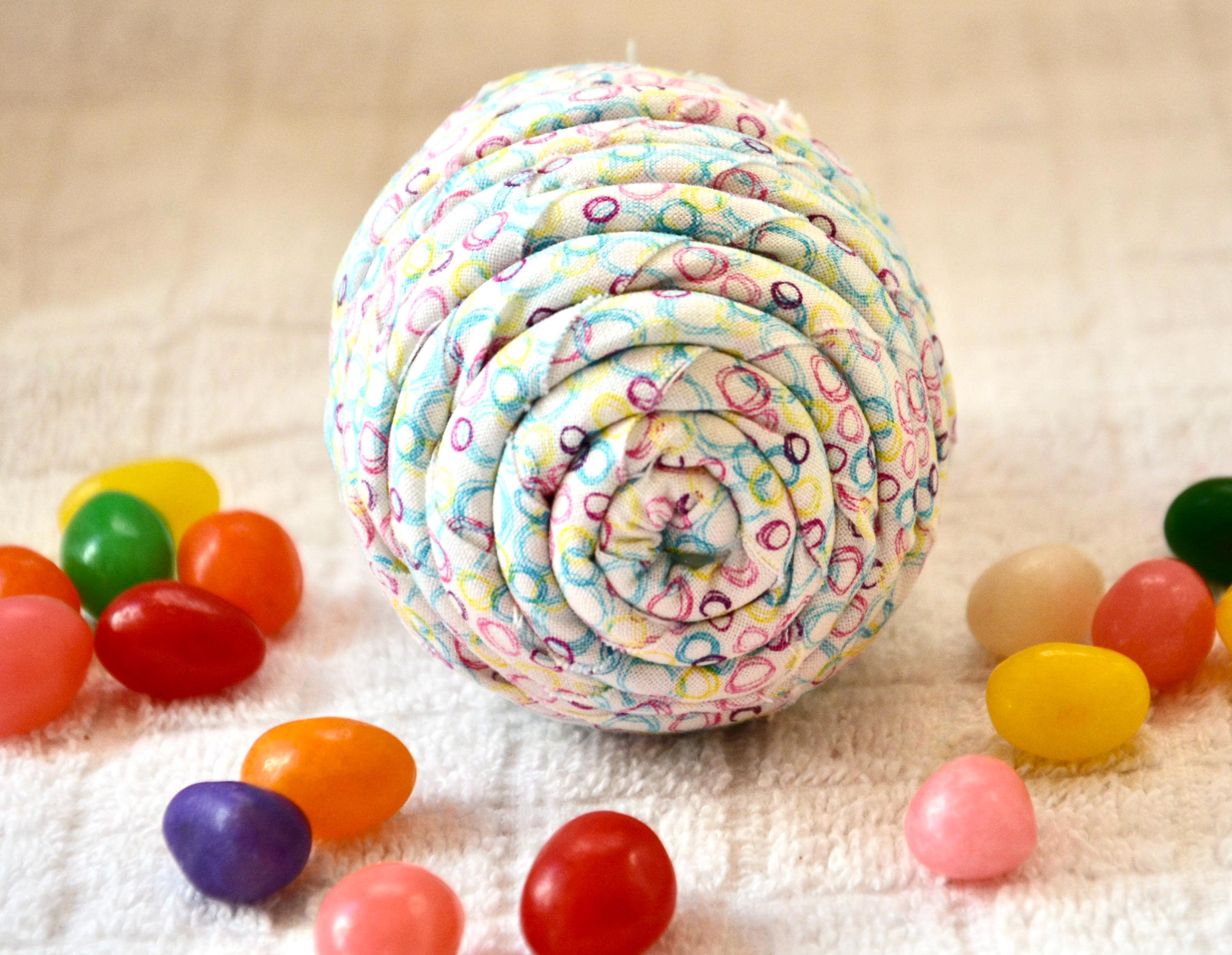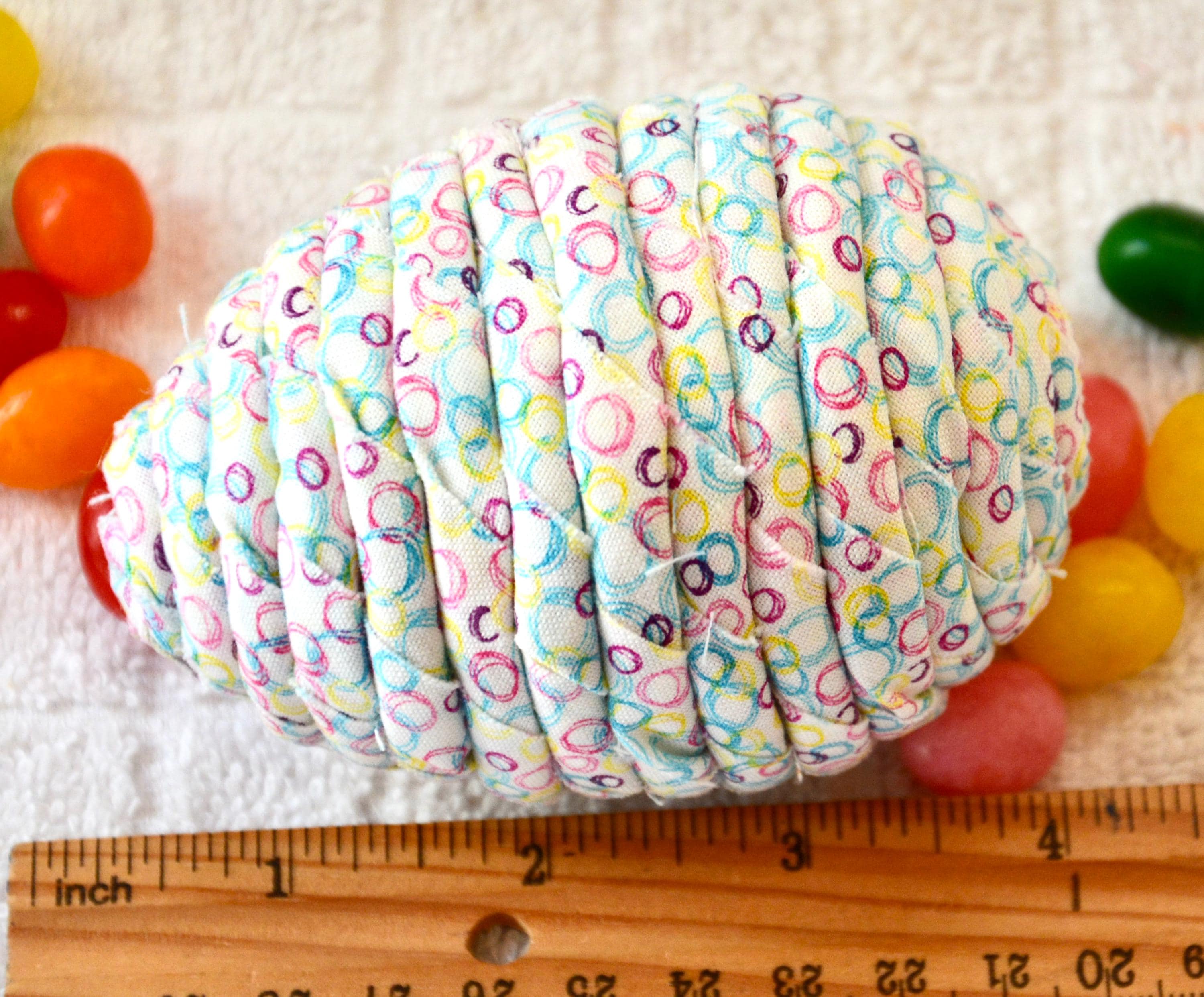 I hand wrapped this cute fabric with circles around cotton line which I than hand coiled into an Easter Egg shape. The fabric edge is unfinished for a lovely shabby chic texture.