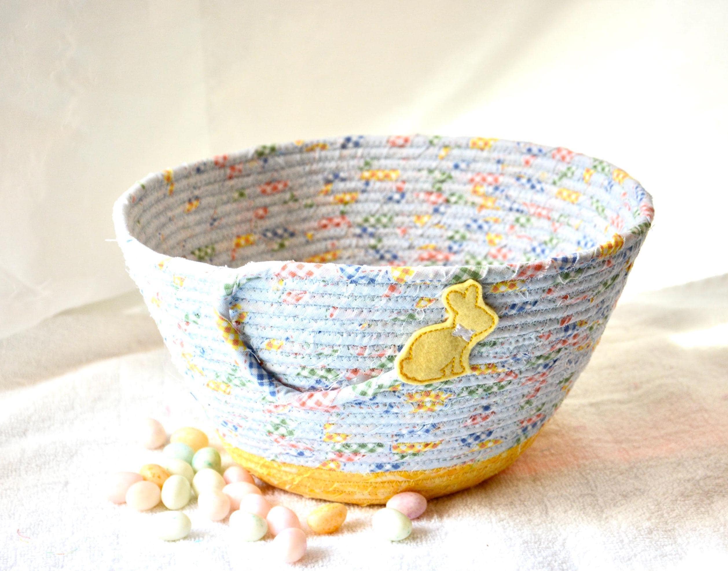 I hand wrapped these lovely pastel fabrics around cotton line, which I then hand coiled and machine quilted to make it sturdy. I used the raw edge technique with some fray for a great shabby chic texture. I just love these colorful pastel fabrics, both are 100% cotton and show on the inside of the basket too! The cute yellow bunny on the basket is included for a nice accent.