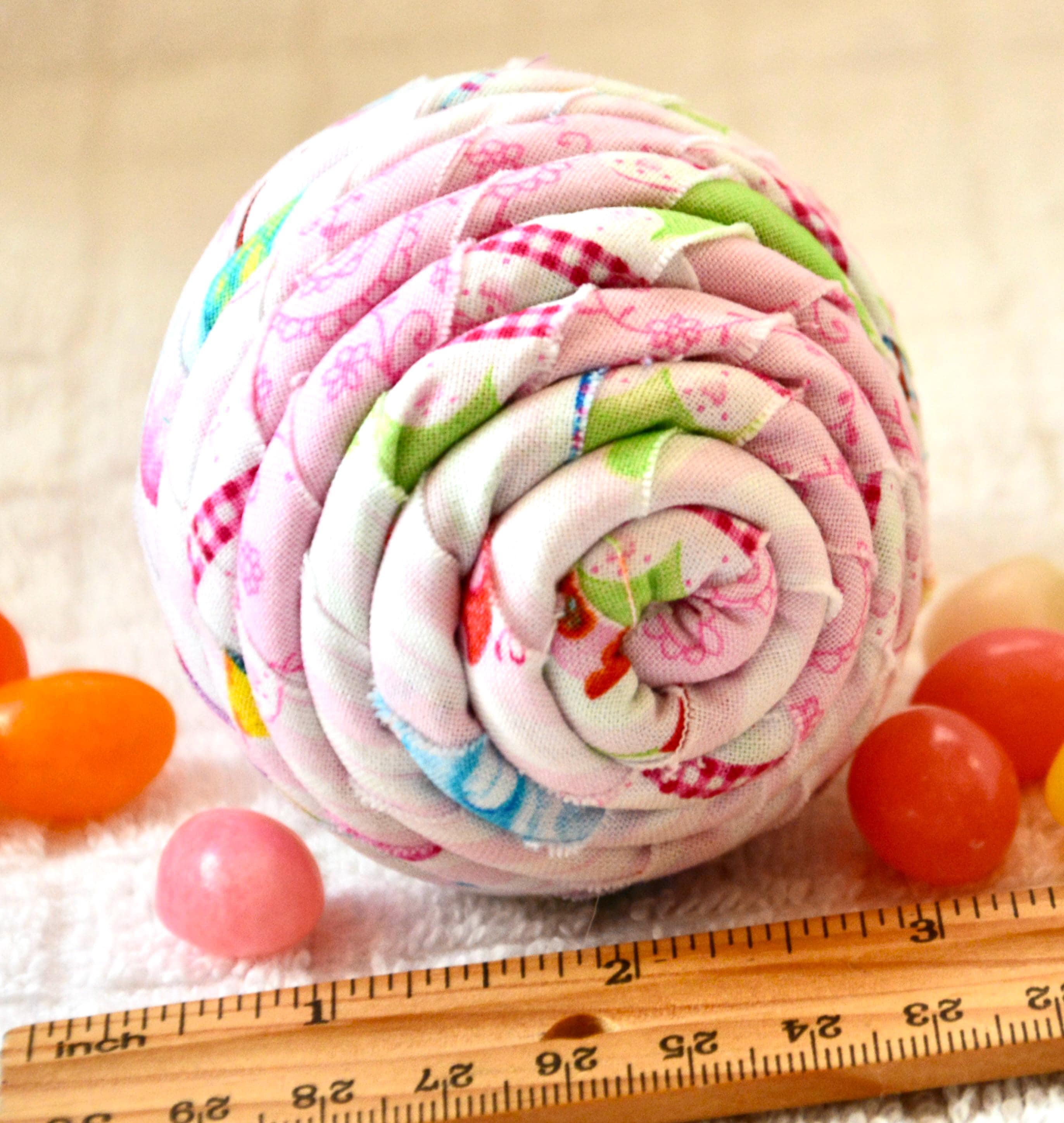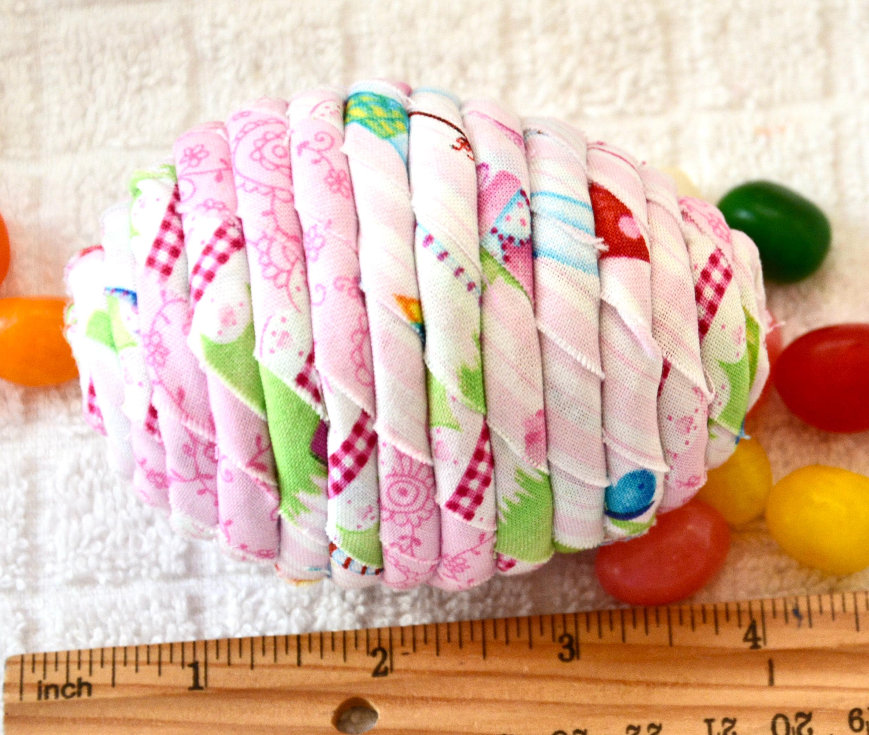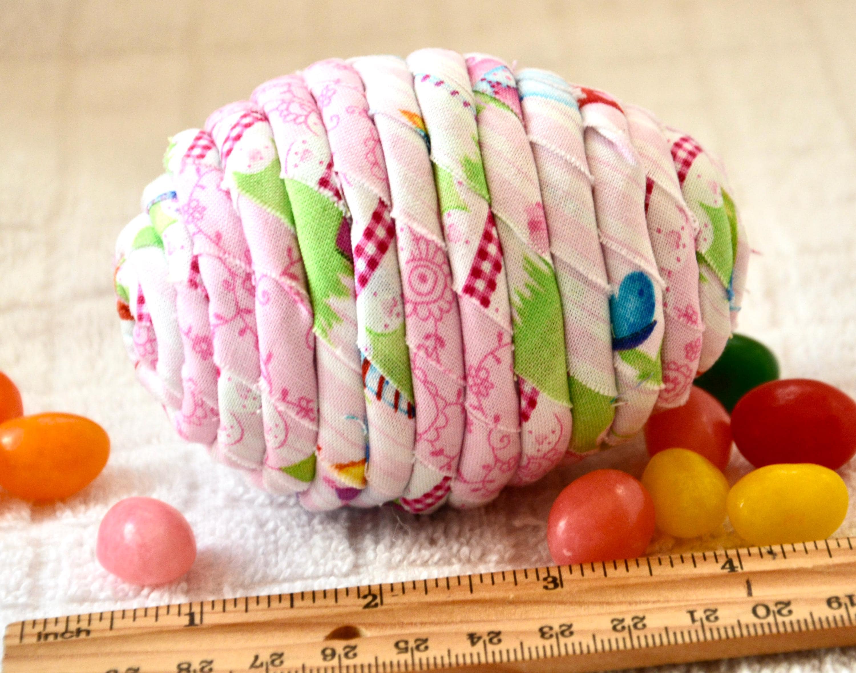 I hand wrapped this lovely pink fabric around cotton line which I than hand coiled into an Easter Egg shape. The fabric edge is unfinished for a lovely shabby chic texture.