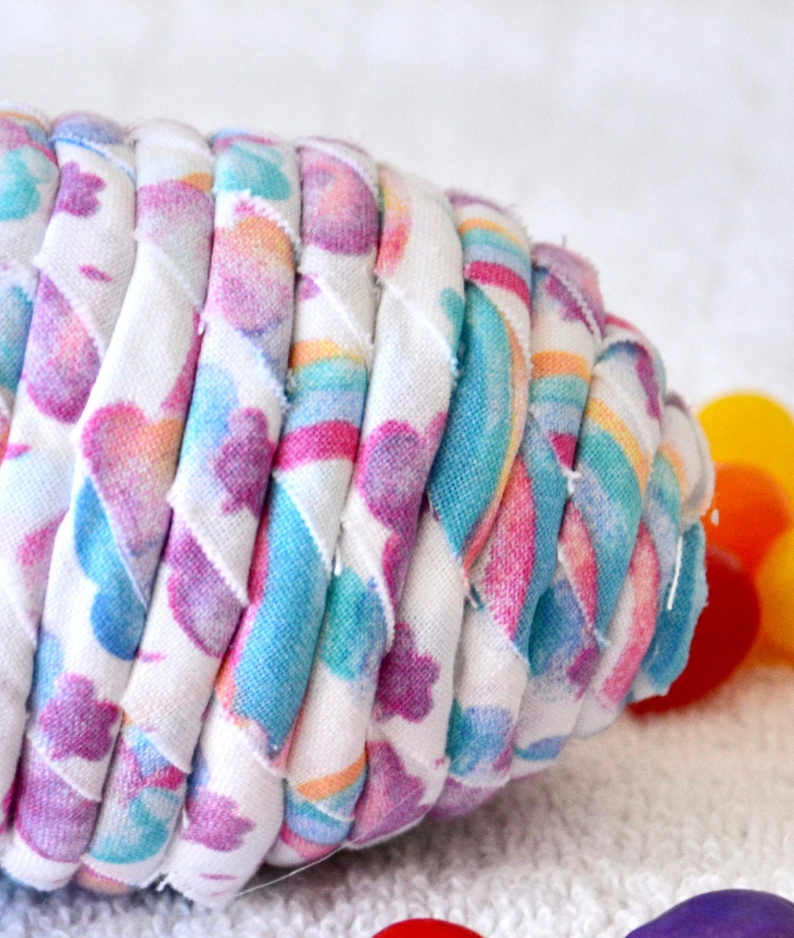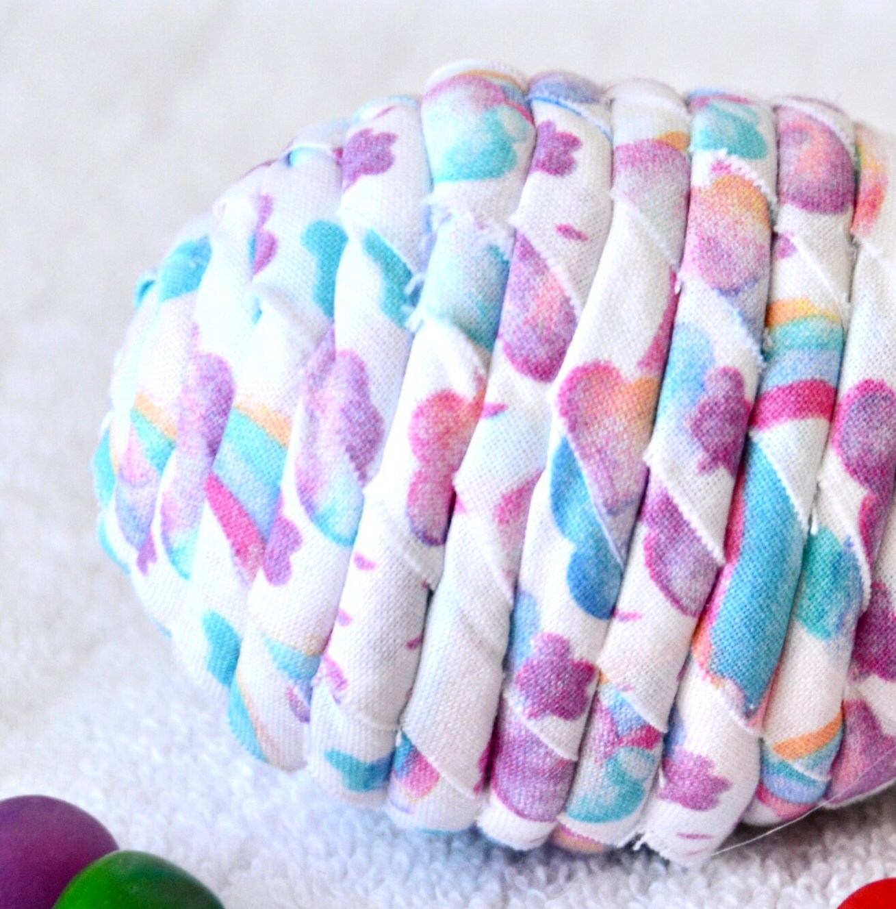 I hand wrapped this lovely pink and aqua fabric around cotton line which I than hand coiled into an Easter Egg shape. The fabric edge is unfinished for a lovely shabby chic texture. I just love this pretty fabric, it created a unique pattern. I designed and created this lovely Easter egg in my smoke free home studio. Egg does not open. Spot clean. Bunny, candy, jelly bean, ruler, other props not included.