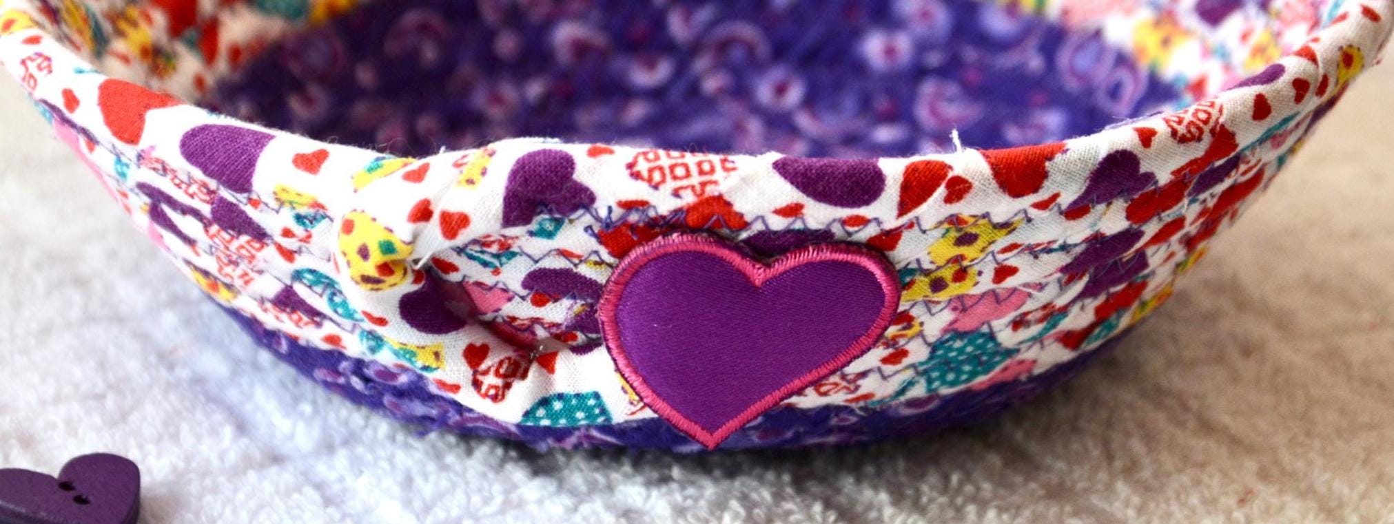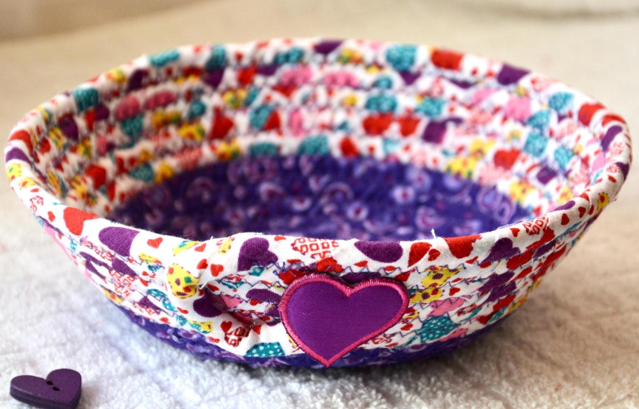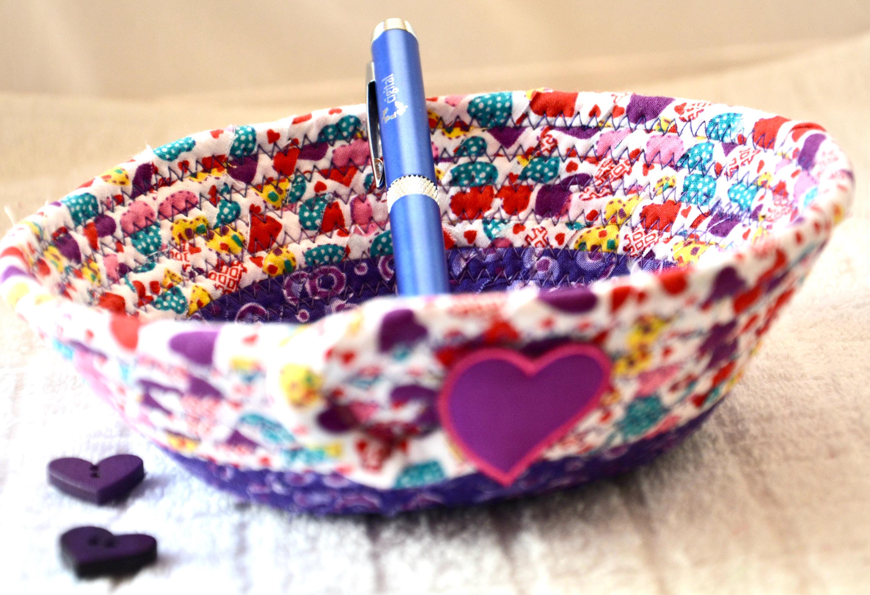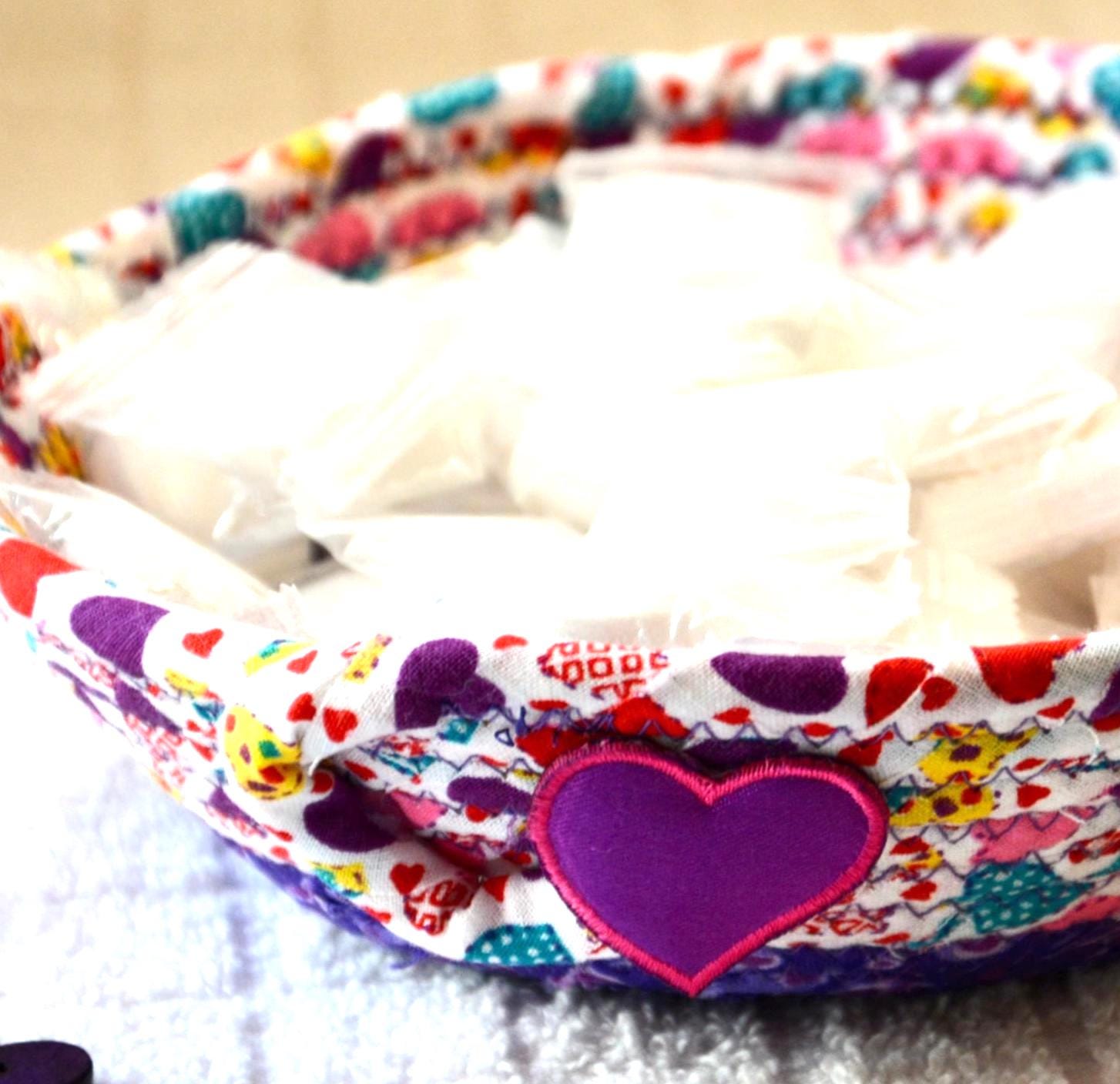 I hand wrapped these wonderful fabrics around cotton line, which I then hand coiled and machine quilted to make the basket sturdy. I used the raw edge technique with some fray to give it a lovely shabby chic texture. The cute heart on the basket is included for a nice accent.