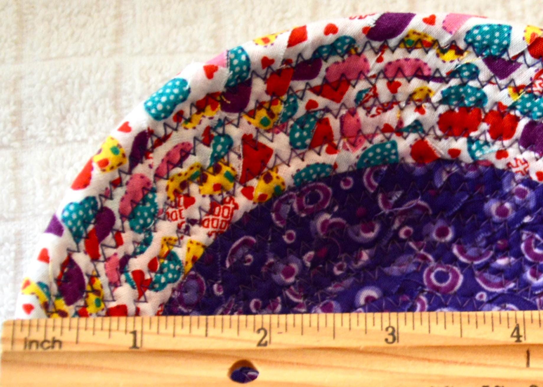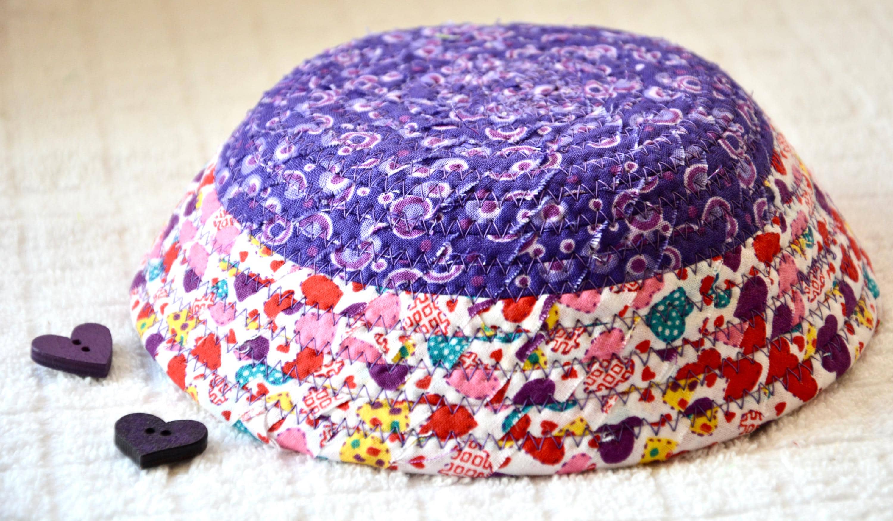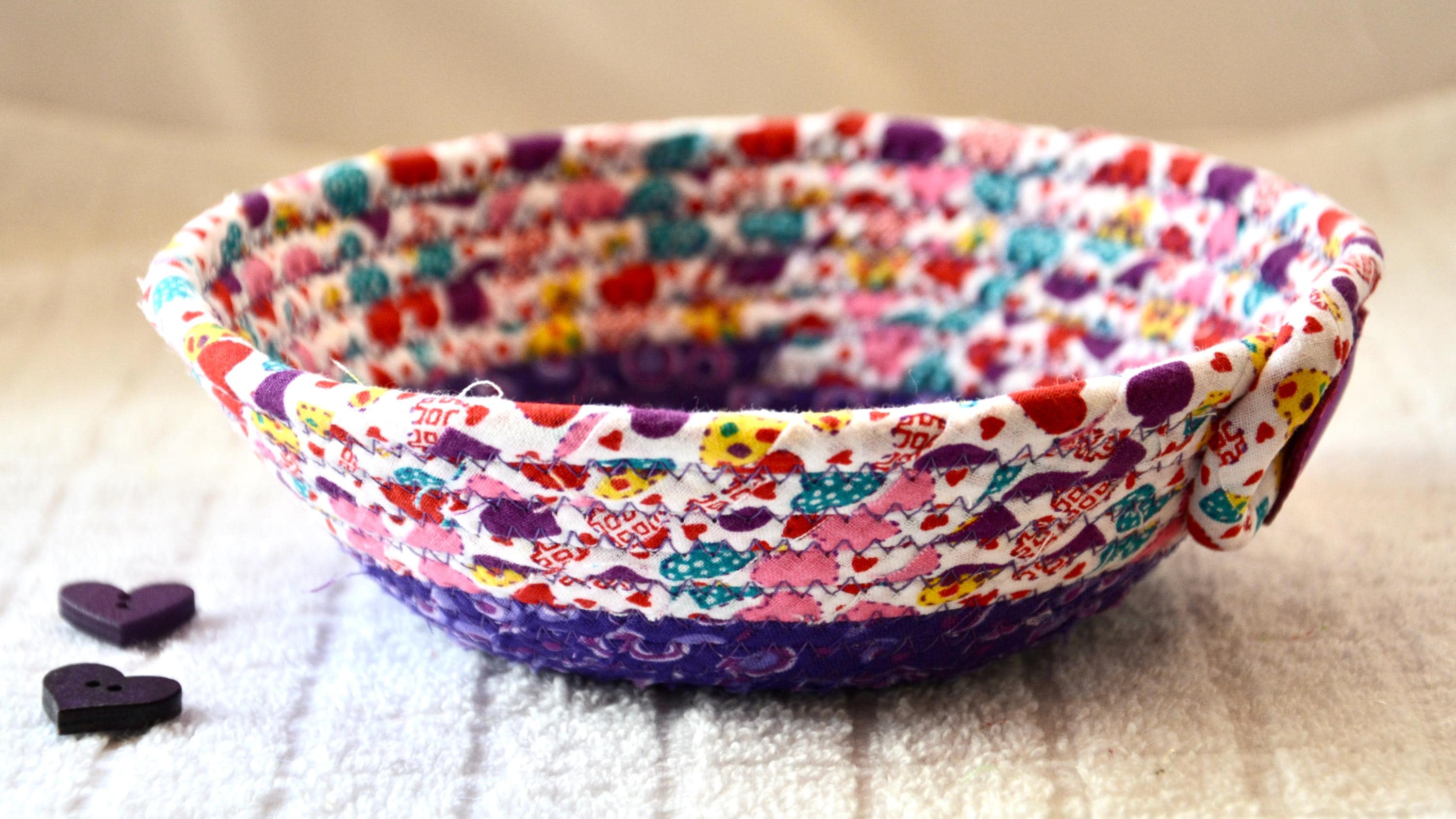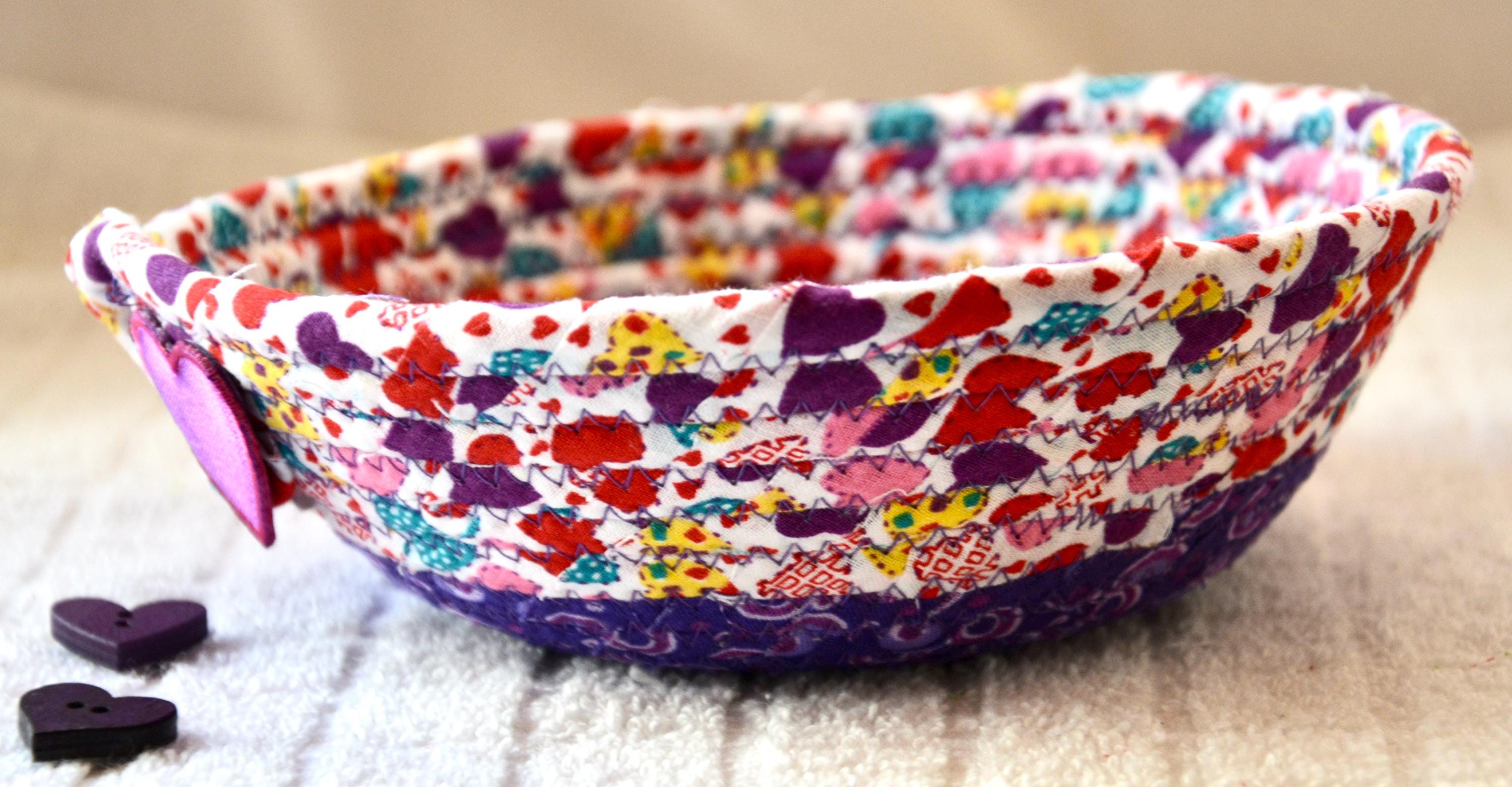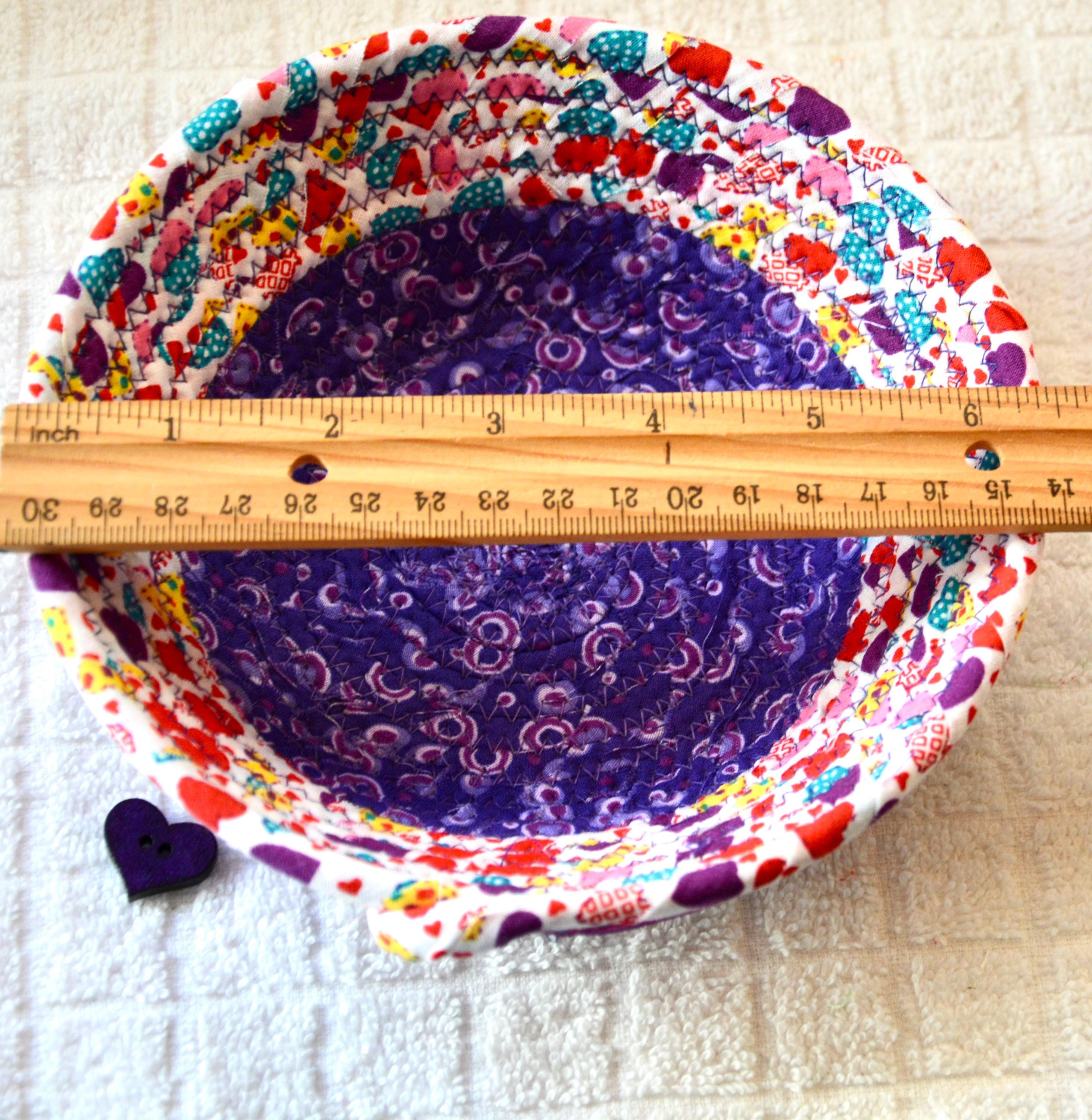 I hand wrapped these wonderful fabrics around cotton line, which I then hand coiled and machine quilted to make the basket sturdy. I used the raw edge technique with some fray to give it a lovely shabby chic texture. The cute heart on the basket is included for a nice accent.