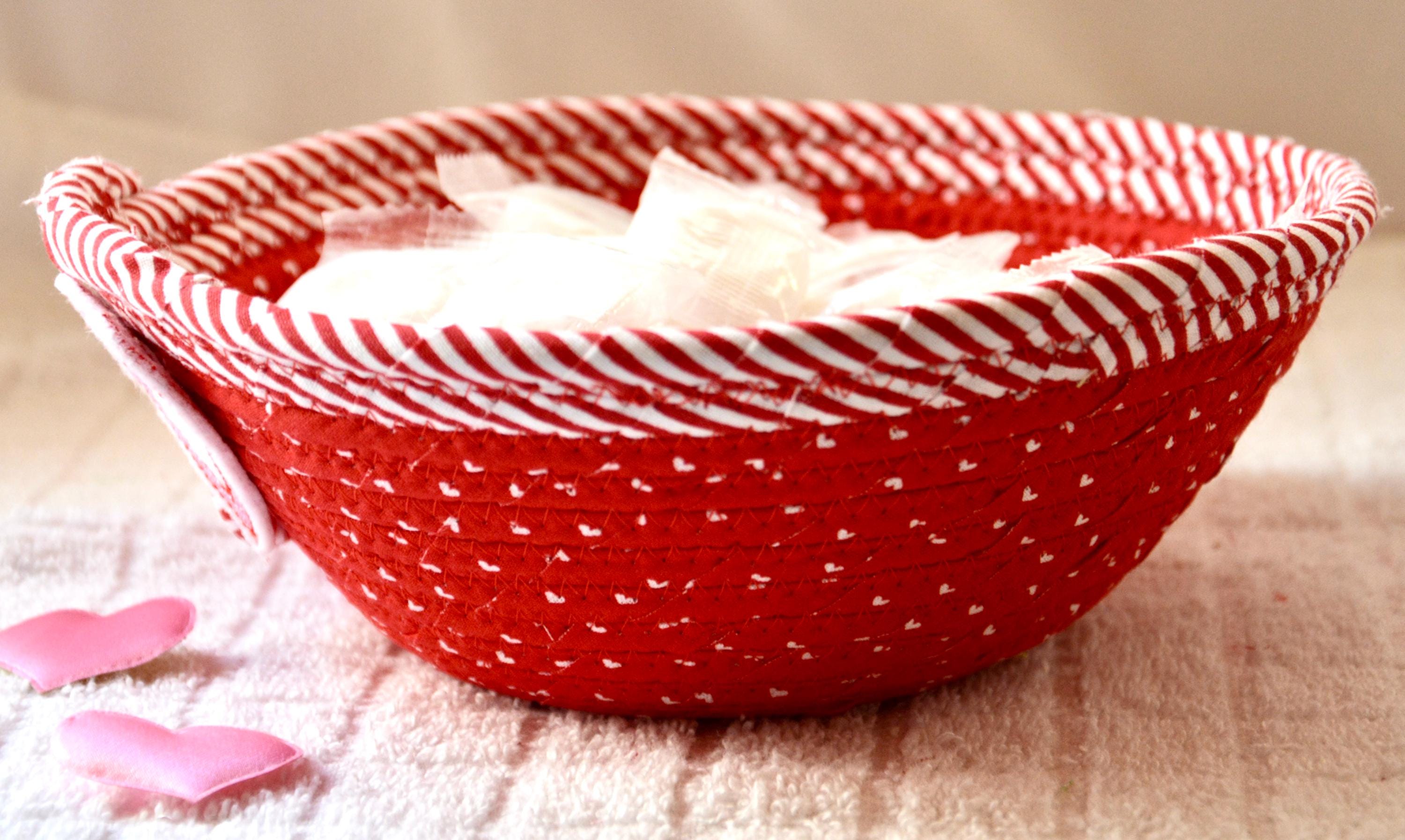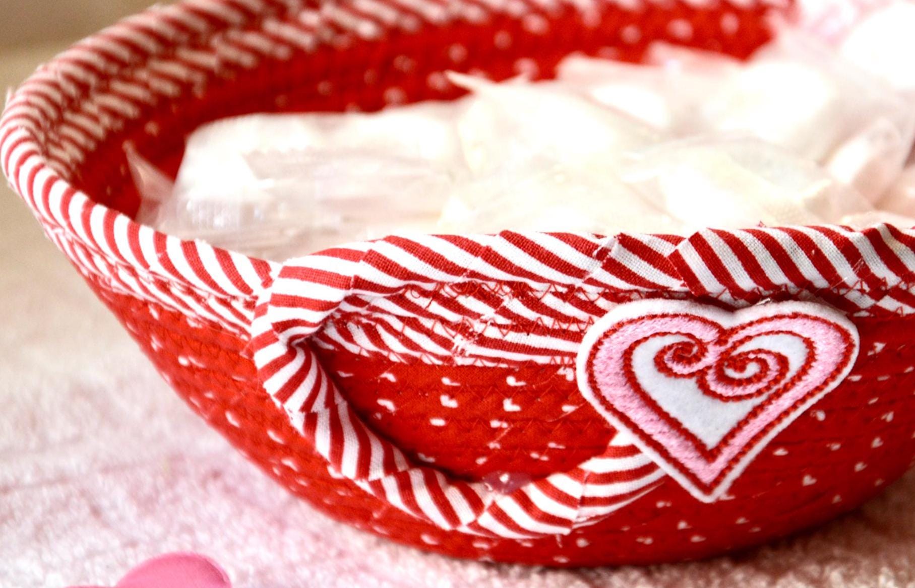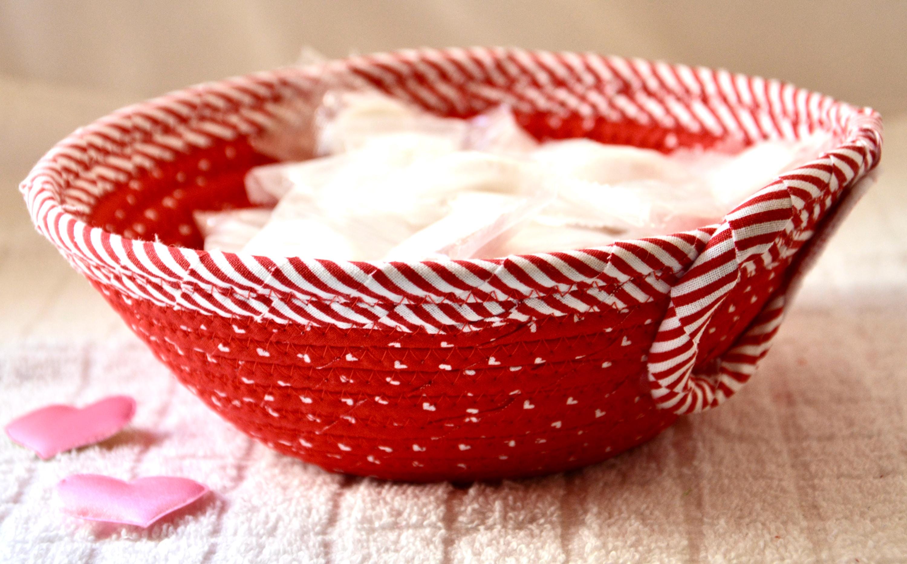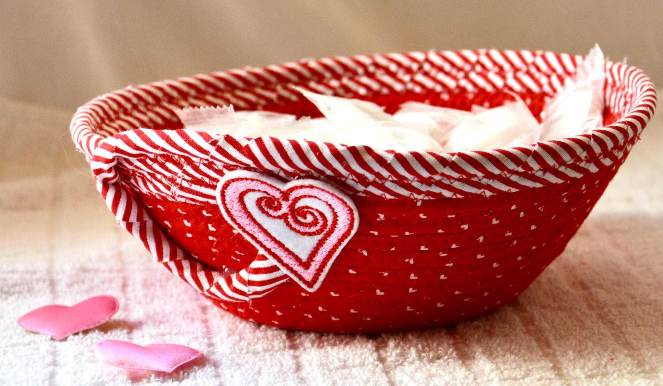 I hand wrapped these wonderful fabrics around cotton line, which I then hand coiled and machine quilted to make the basket sturdy. I used the raw edge technique with some fray to give it a lovely shabby chic texture. The cute heart on the basket is included for a nice accent.