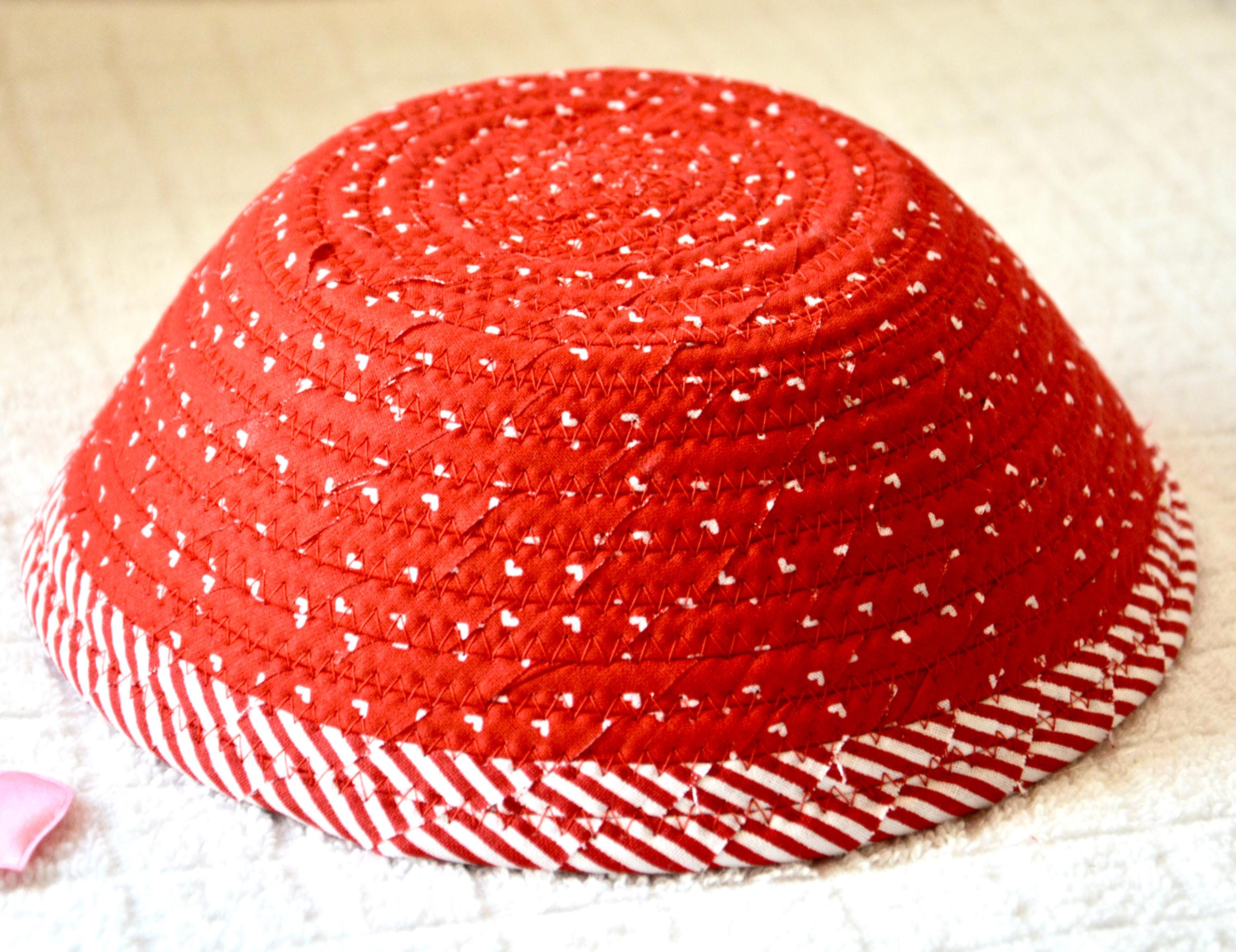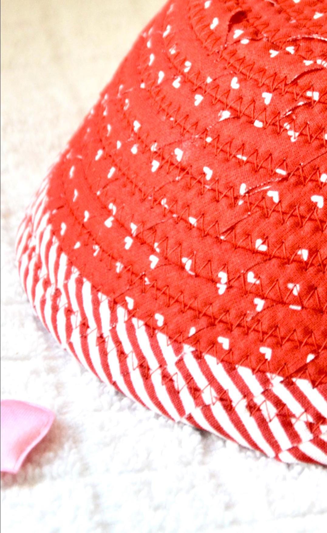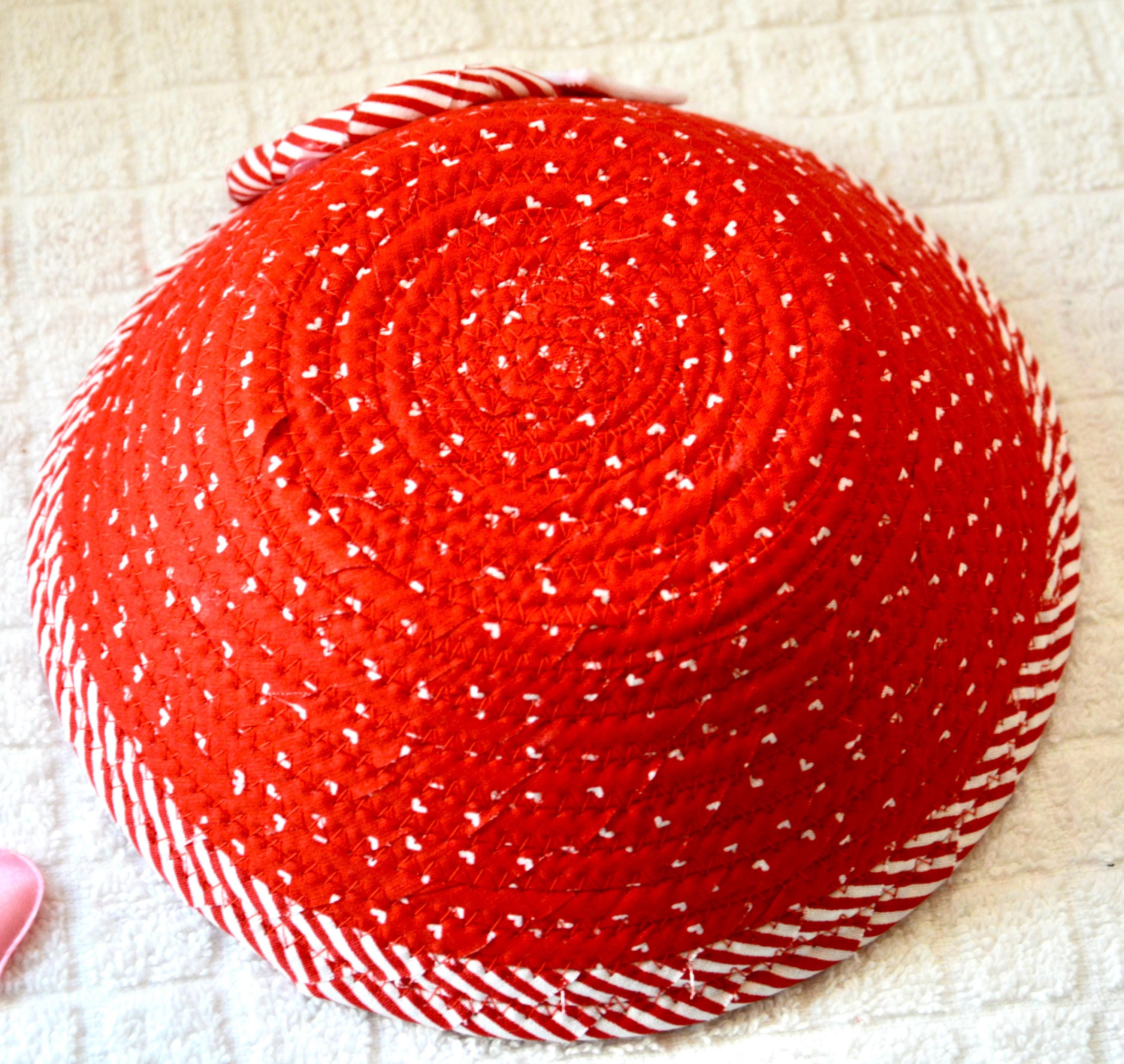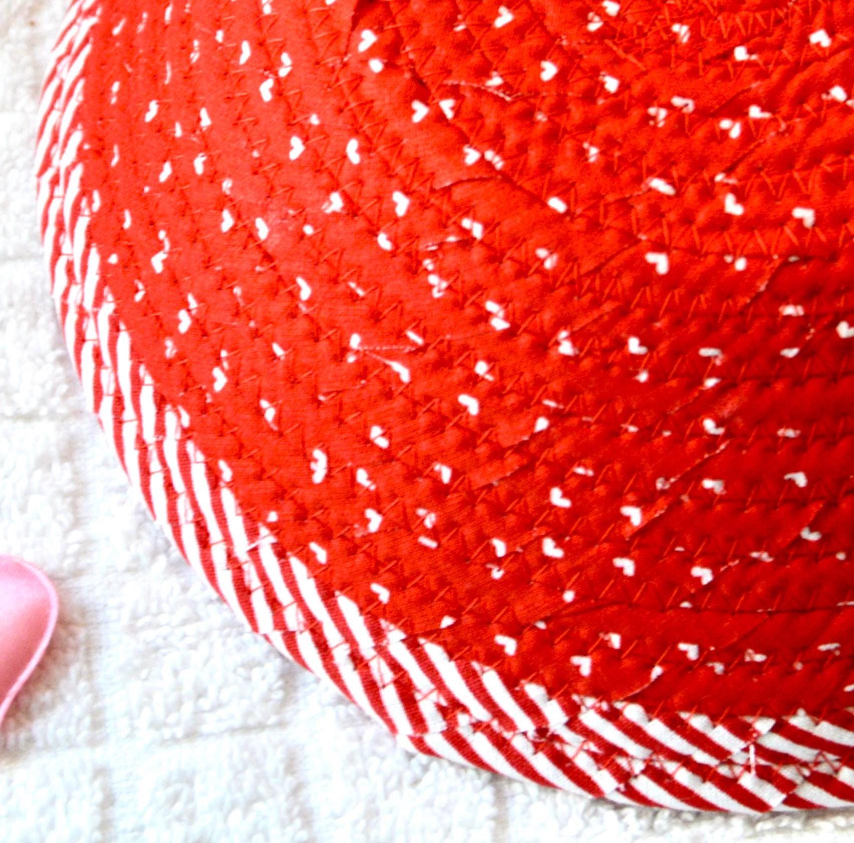 I hand wrapped these wonderful fabrics around cotton line, which I then hand coiled and machine quilted to make the basket sturdy. I used the raw edge technique with some fray to give it a lovely shabby chic texture. The cute heart on the basket is included for a nice accent.