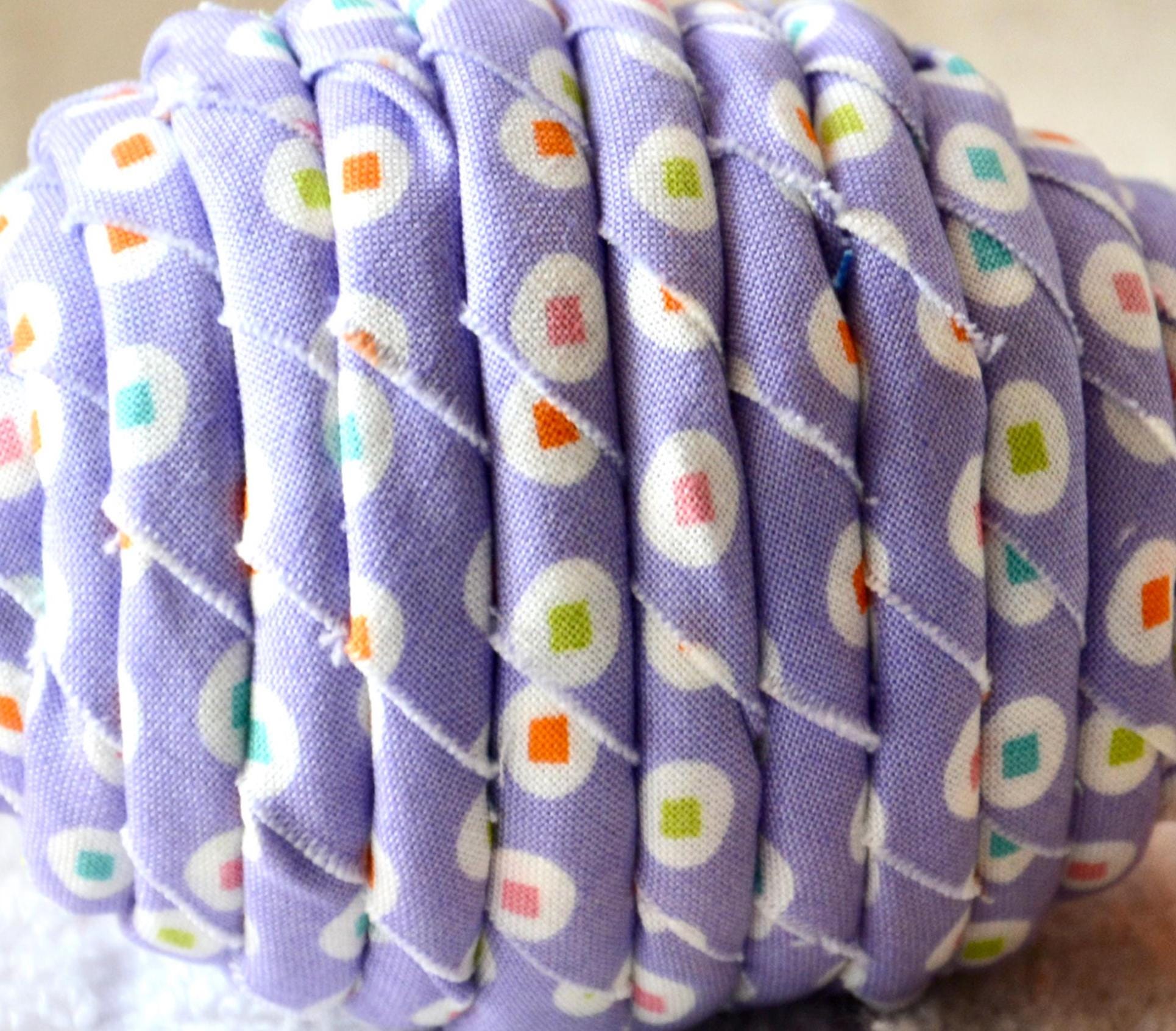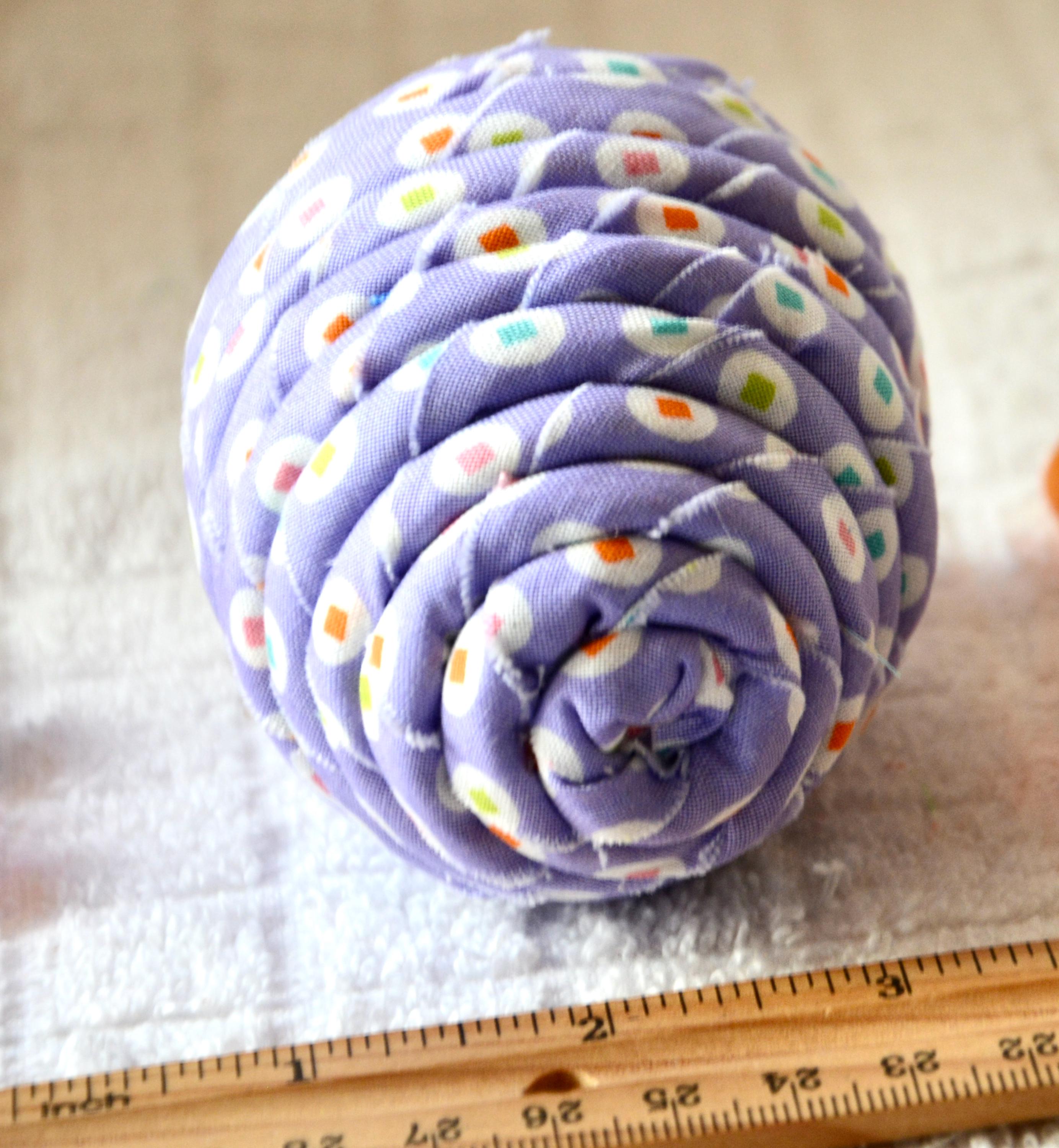 I hand wrapped this lovely lavender dot fabric around cotton line which I than hand coiled into an Easter Egg shape. The fabric edge is unfinished for a lovely shabby chic texture.