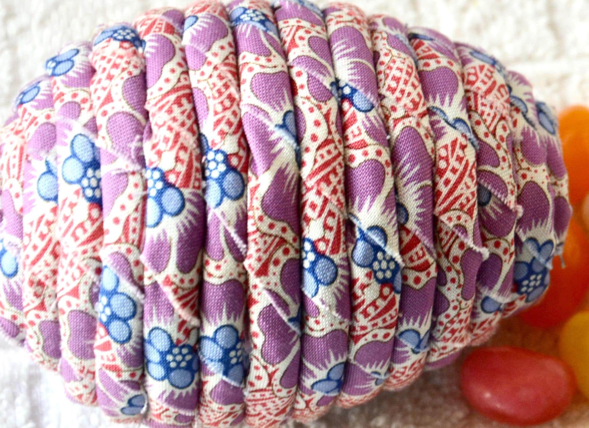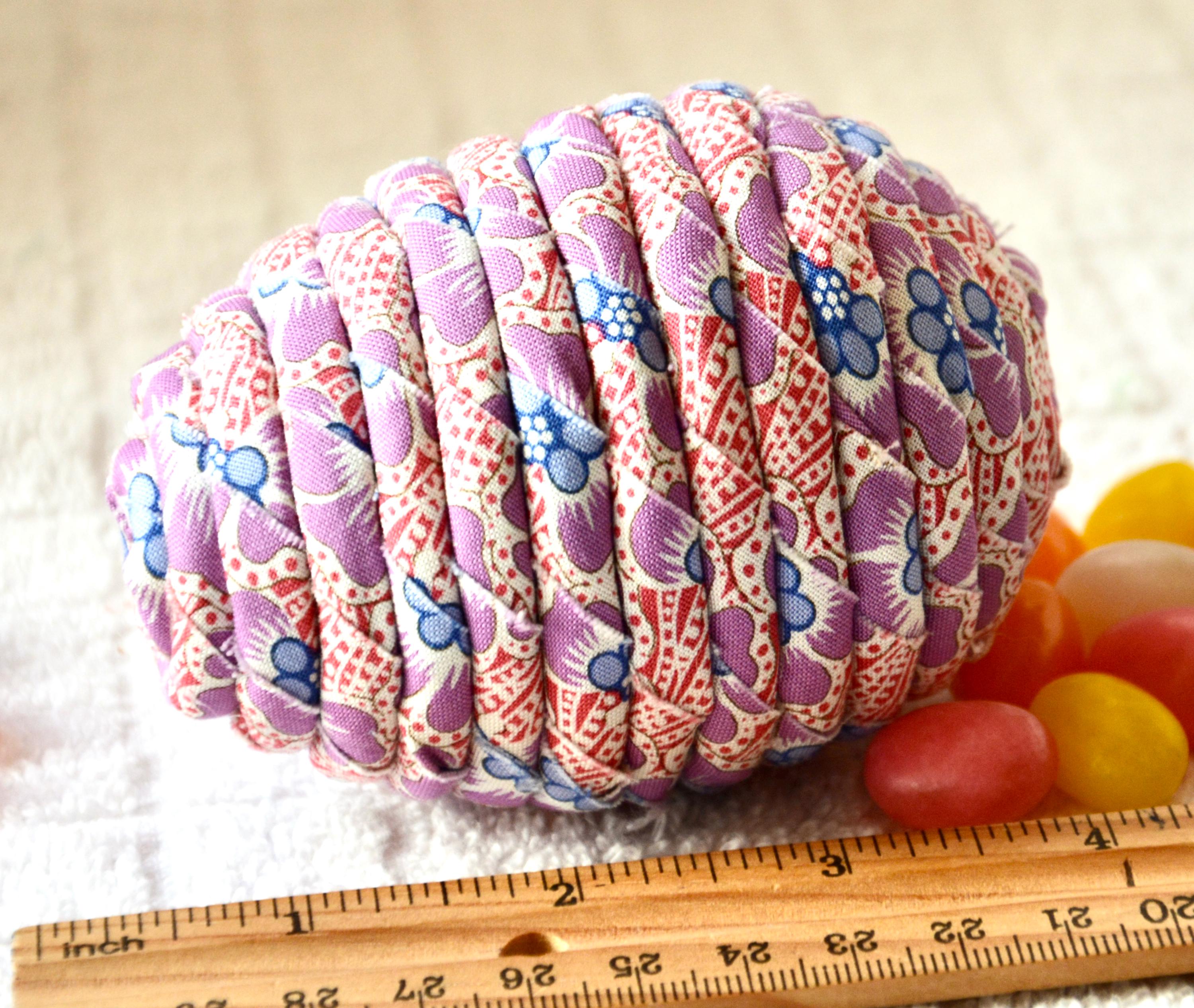 I hand wrapped this lovely lavender fabric around cotton line which I than hand coiled into an Easter Egg shape. The fabric edge is unfinished for a lovely shabby chic texture.