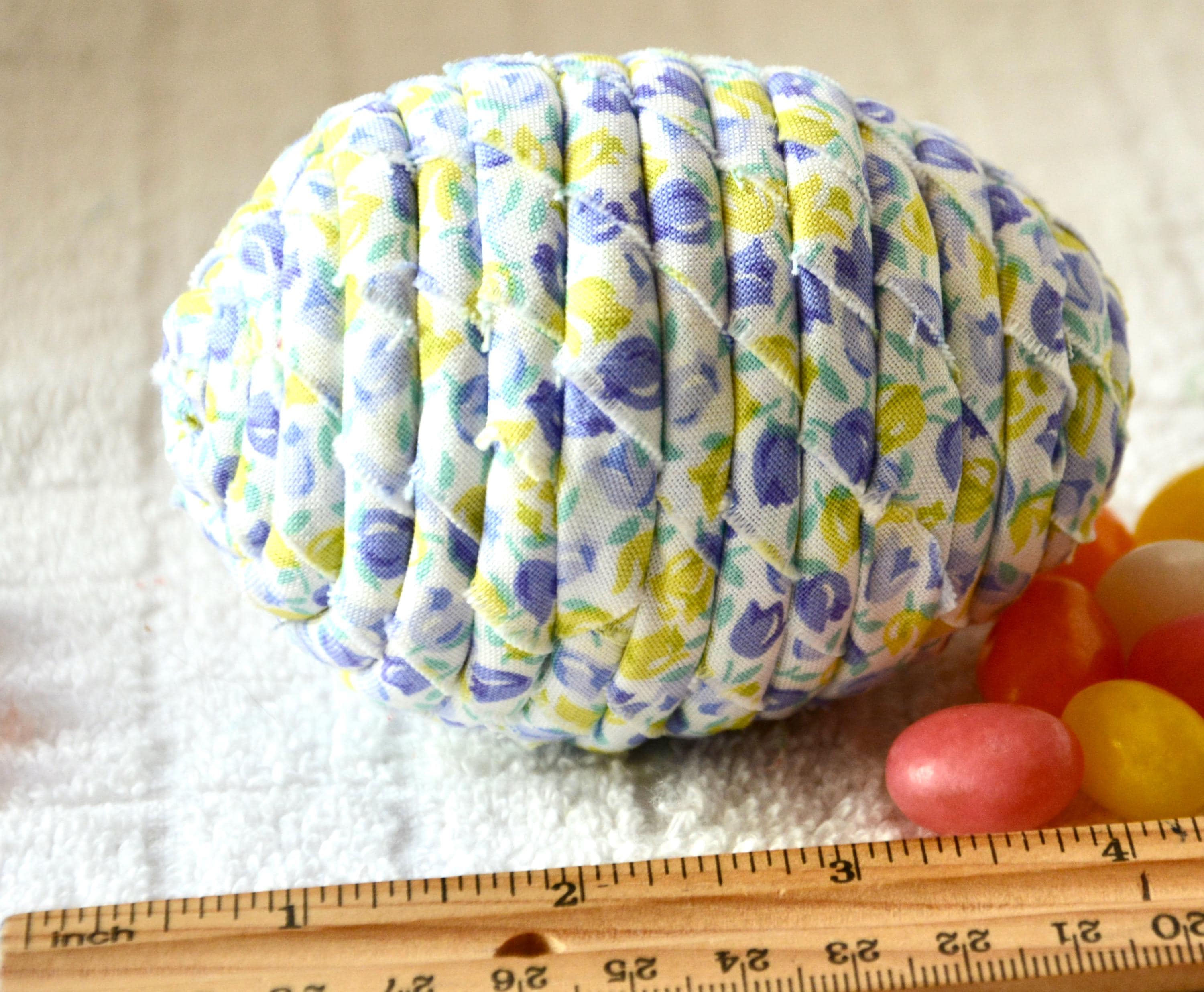 I hand wrapped this lovely Spring floral fabric around cotton line which I than hand coiled into an Easter Egg shape. The fabric edge is unfinished for a lovely shabby chic texture. I just love this pretty fabric, it created a unique pattern. I designed and created this lovely Easter egg in my smoke free home studio. Bunny, candy, jelly bean, egg props not included. Color placement will vary. Egg does not open. Spot clean.