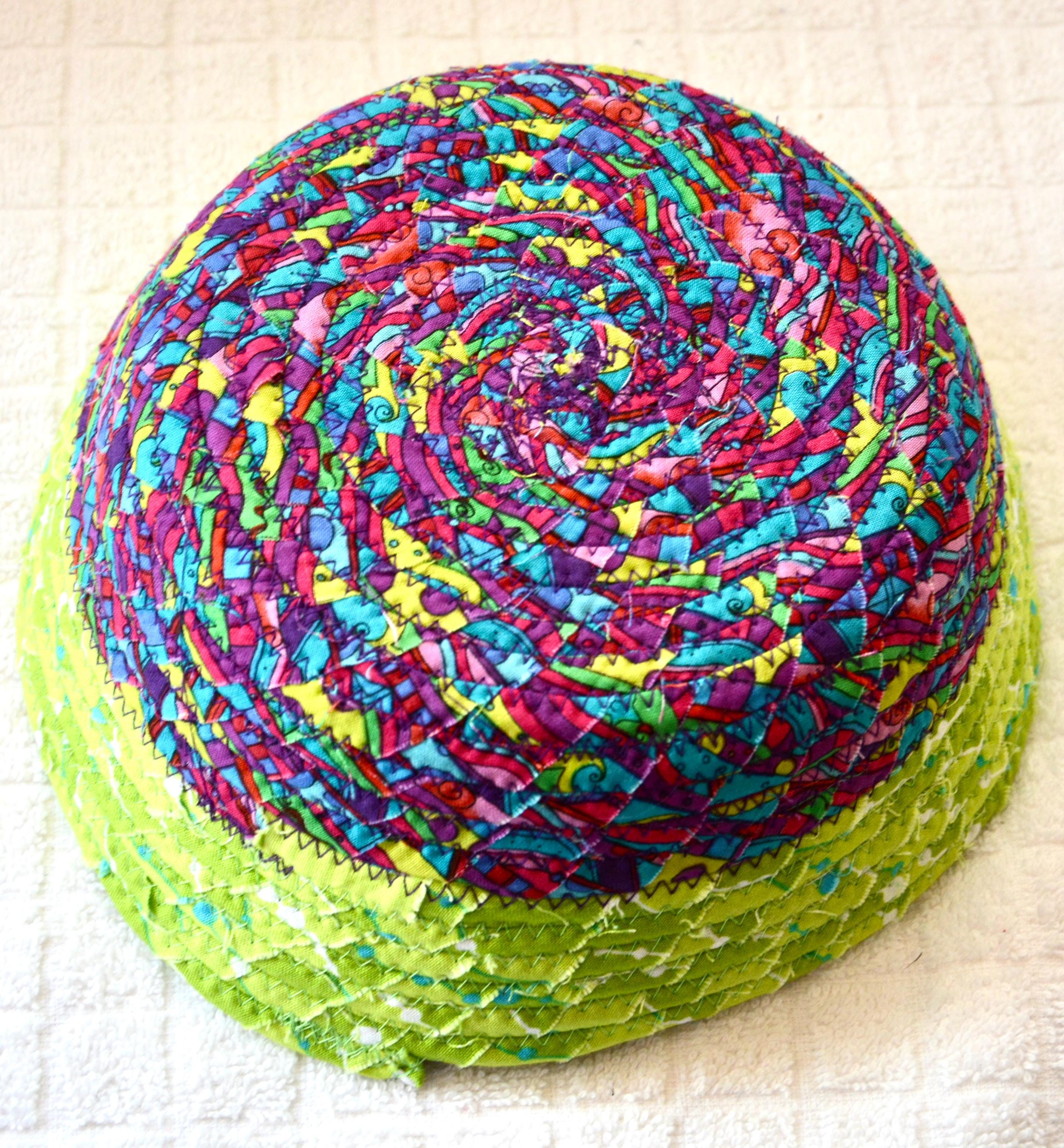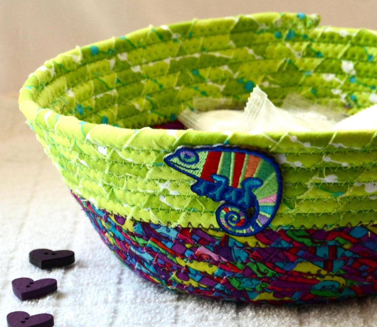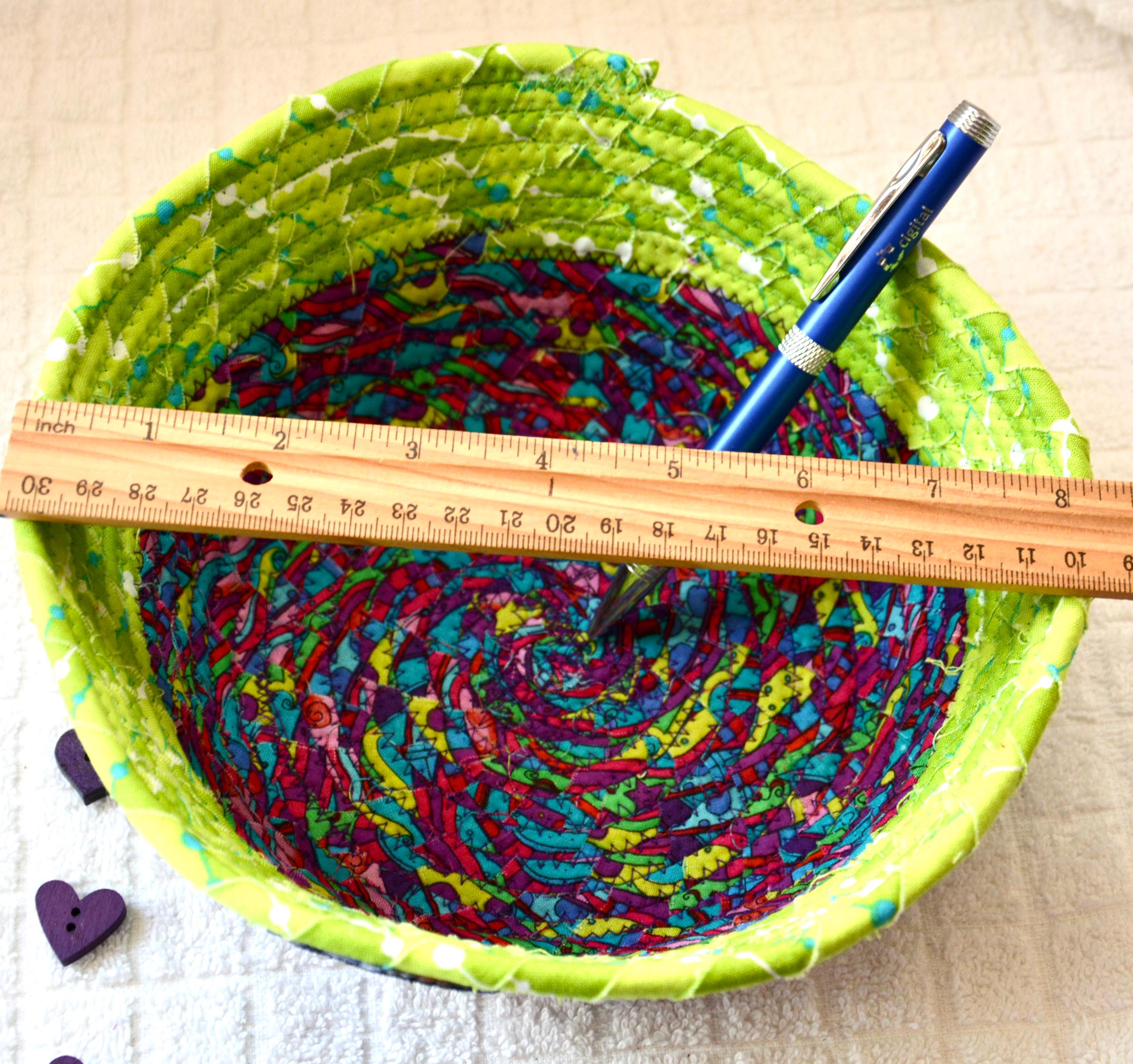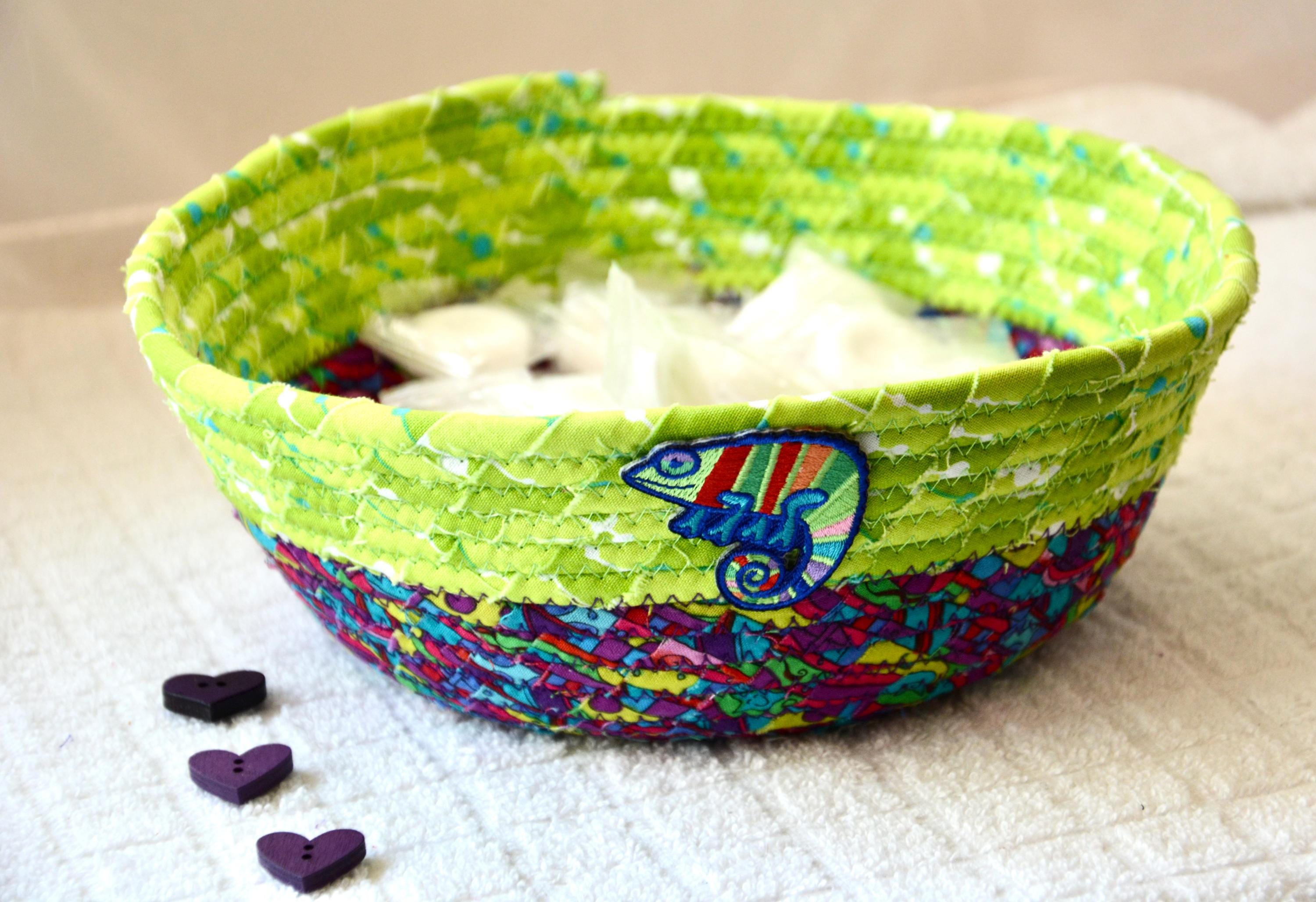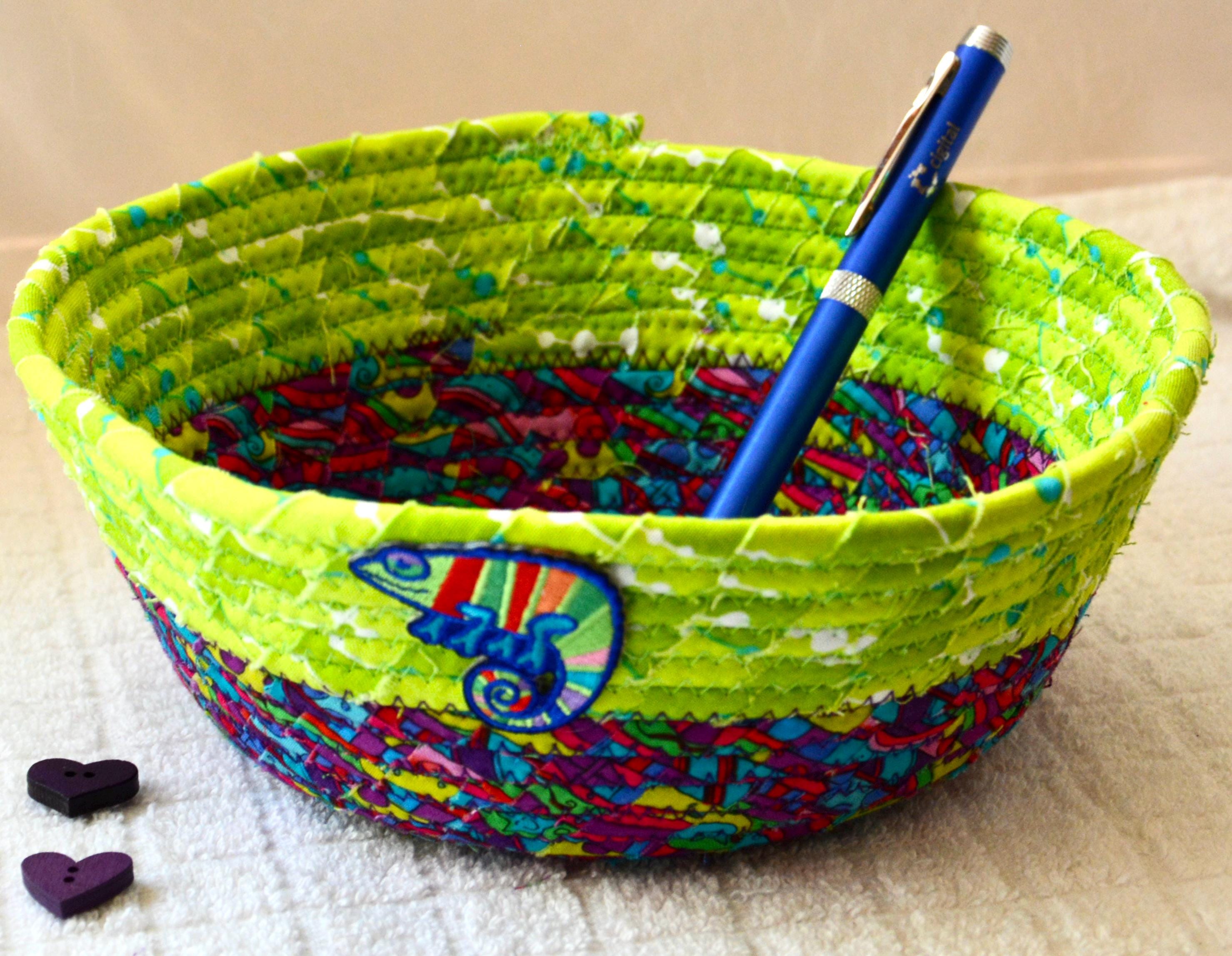 I hand wrapped these colorful fabrics around cotton line, which I then hand coiled and machine quilted to make it sturdy. I used the raw edge technique with some fray to add texture. Both fabrics are high quality 100% cotton and both show on the inside of this fun basket too! The cute chameleon lizard on the basket is included for a nice accent. Please see picture with the pen to help gauge the basket size.