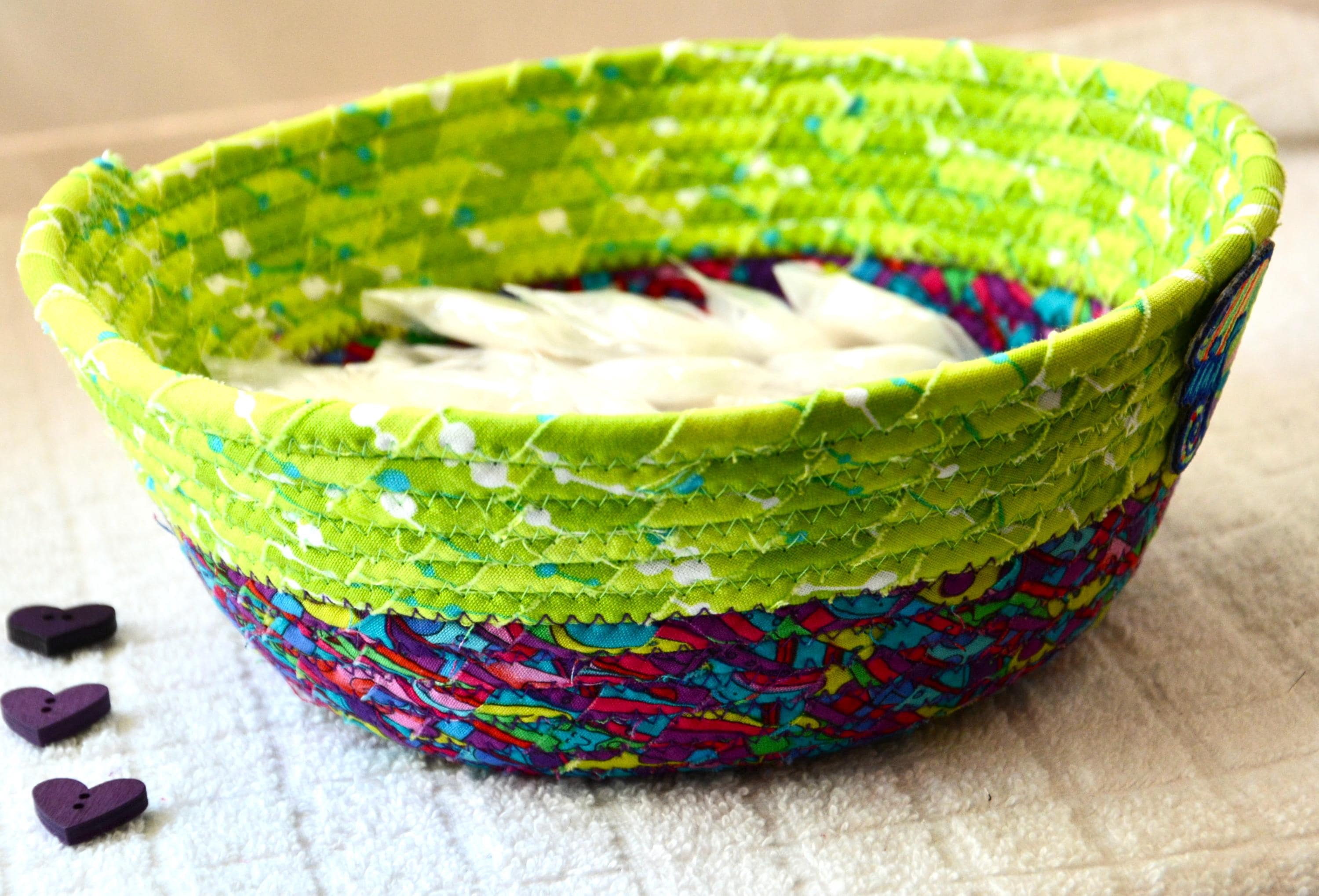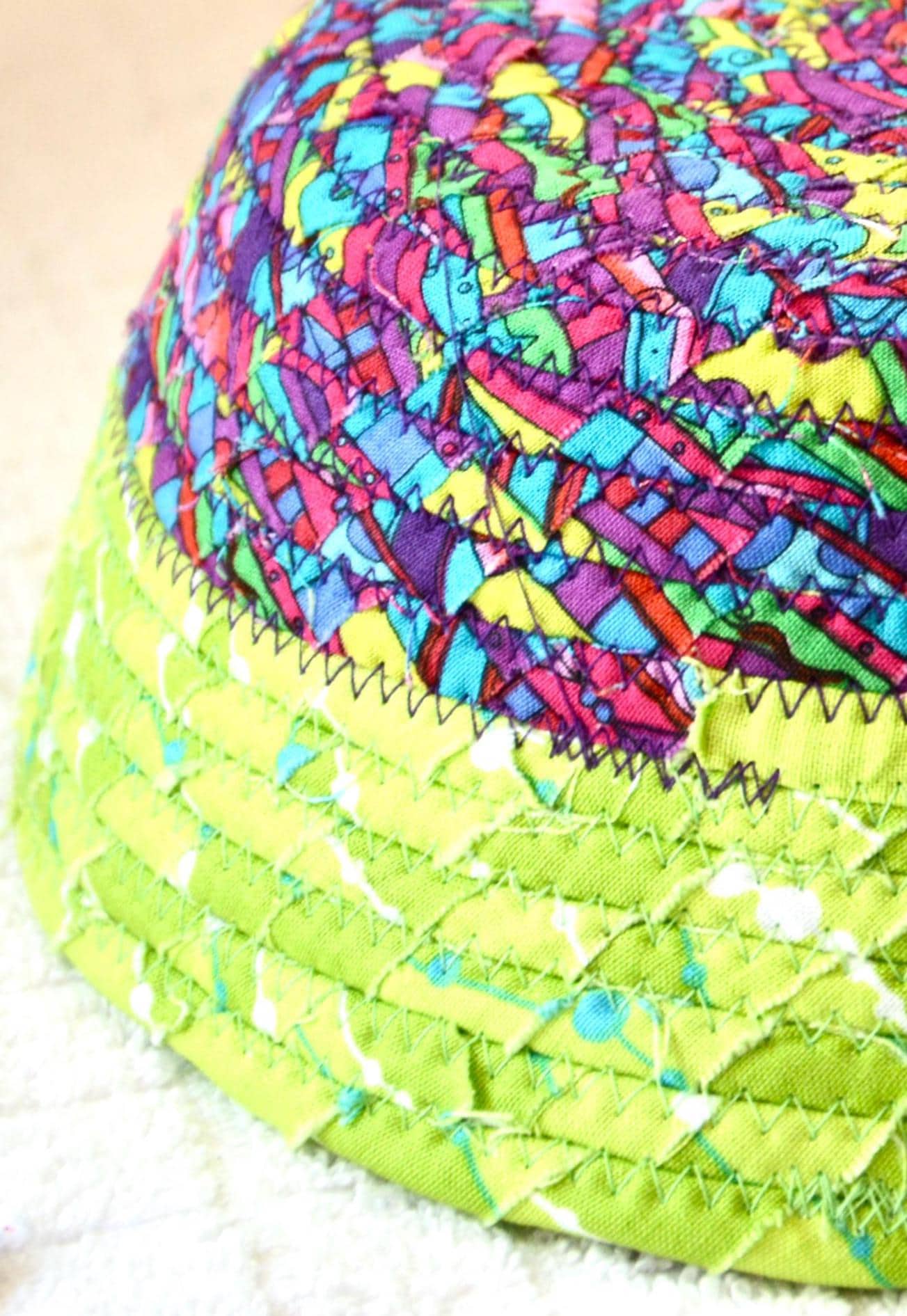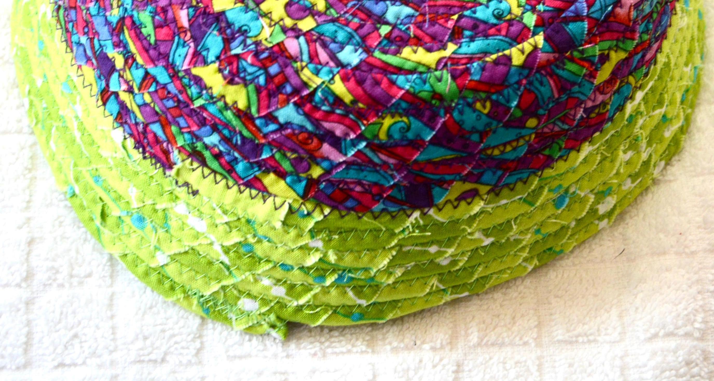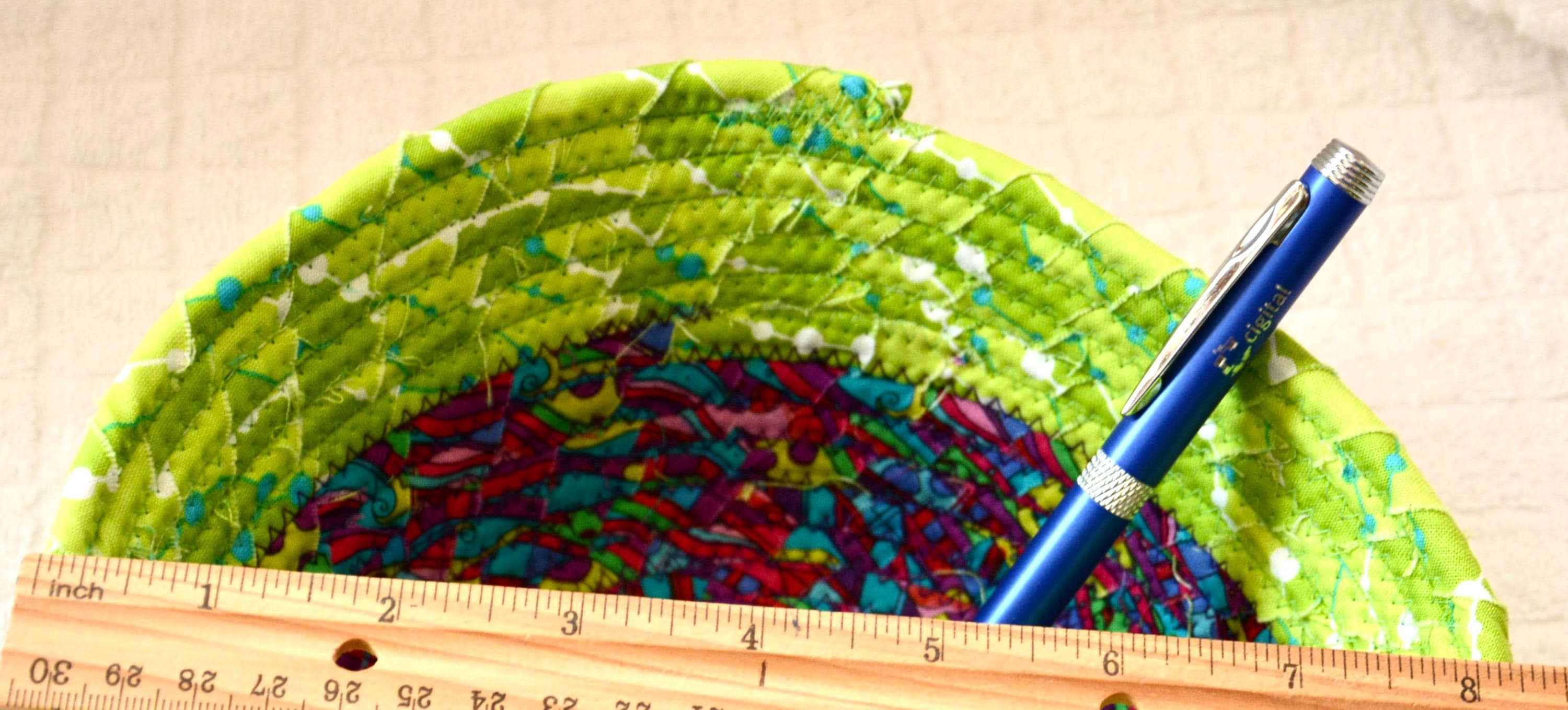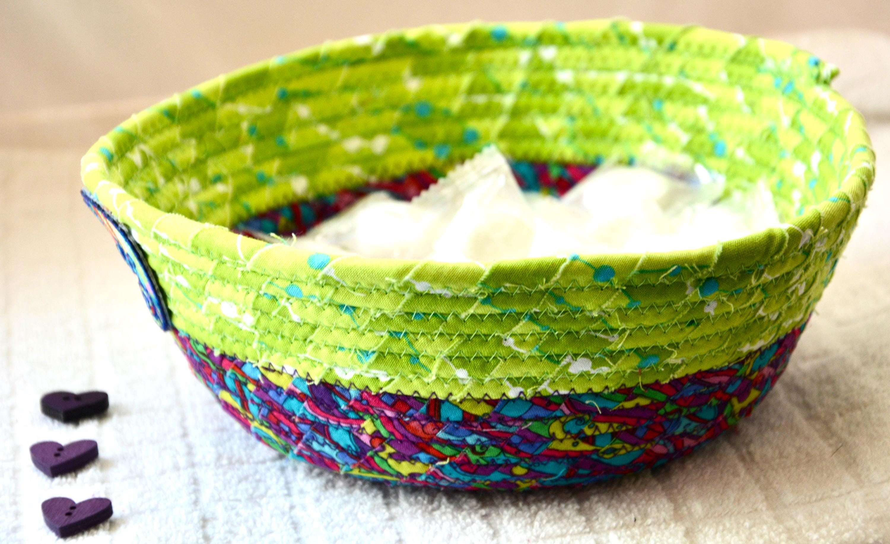 I hand wrapped these colorful fabrics around cotton line, which I then hand coiled and machine quilted to make it sturdy. I used the raw edge technique with some fray to add texture. Both fabrics are high quality 100% cotton and both show on the inside of this fun basket too! The cute chameleon lizard on the basket is included for a nice accent. Please see picture with the pen to help gauge the basket size.