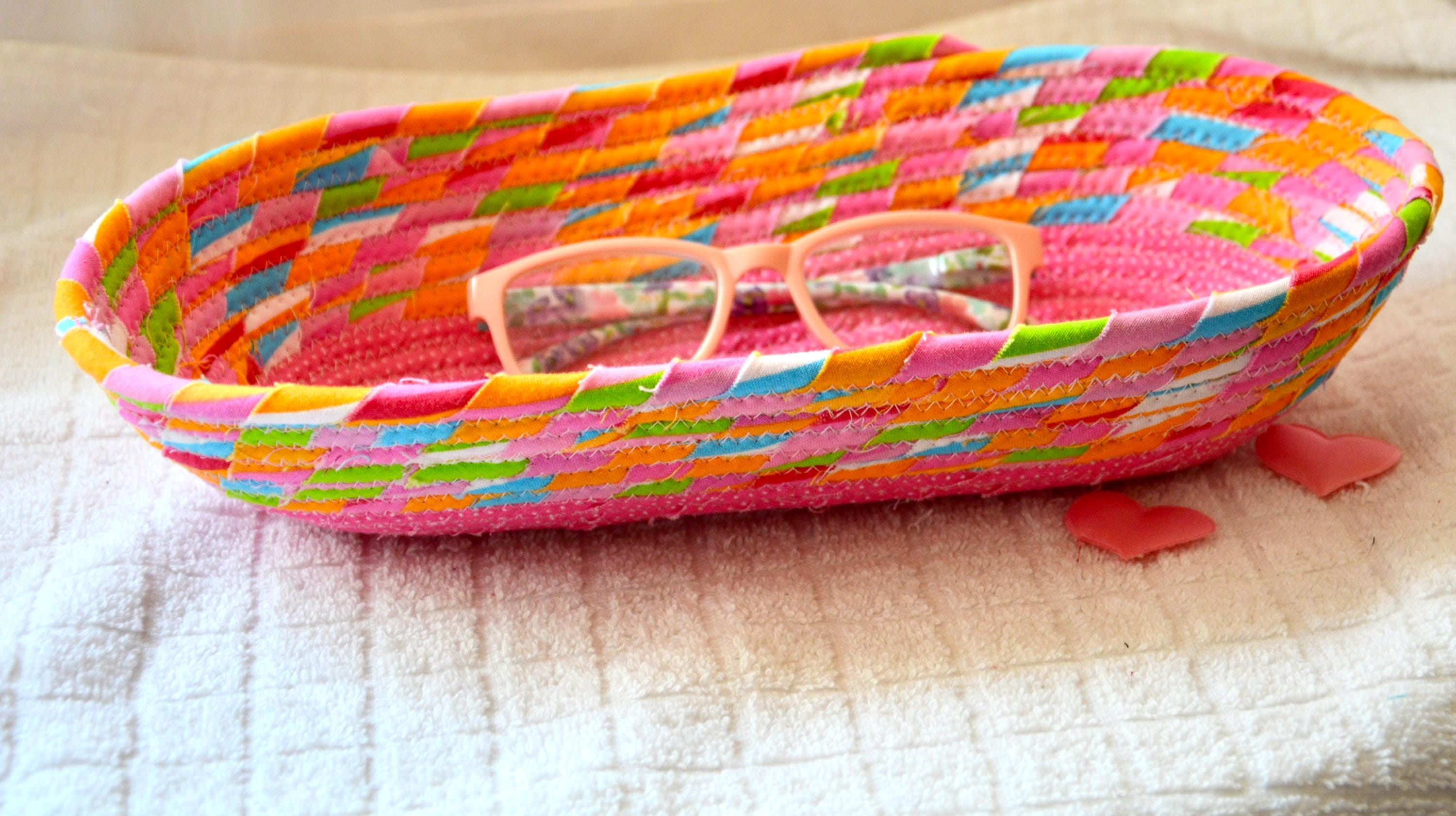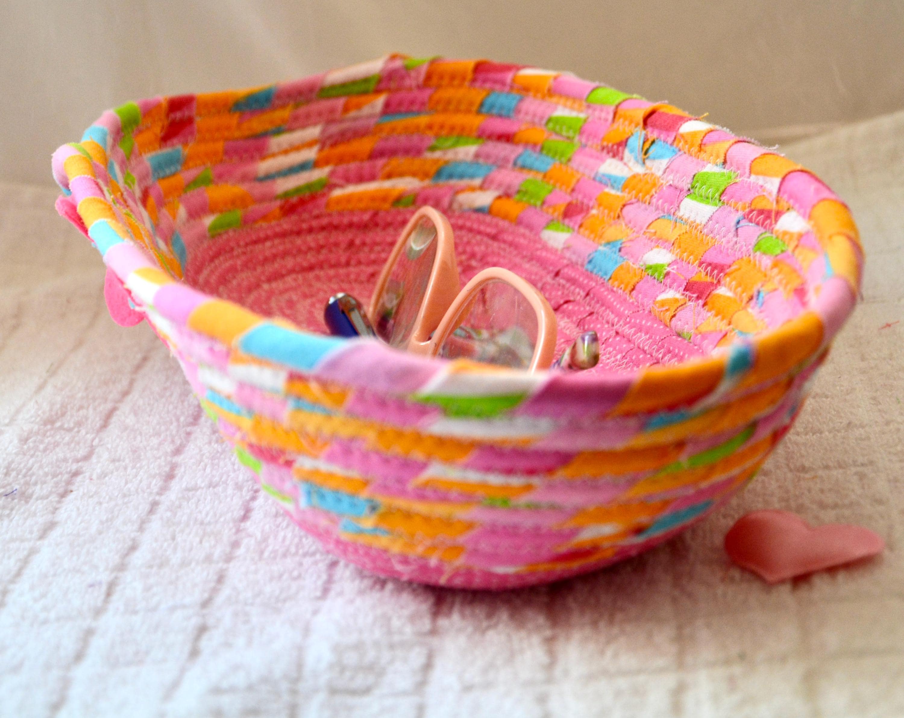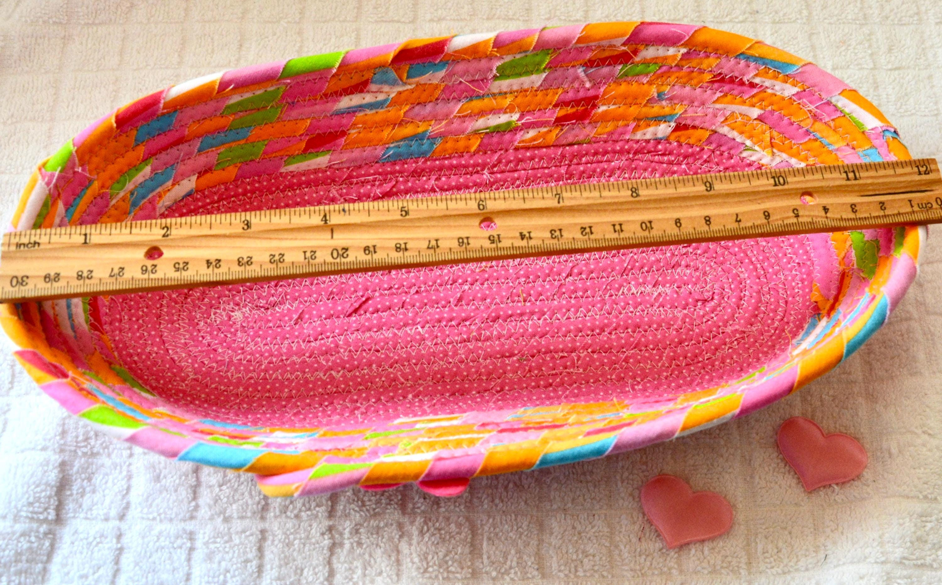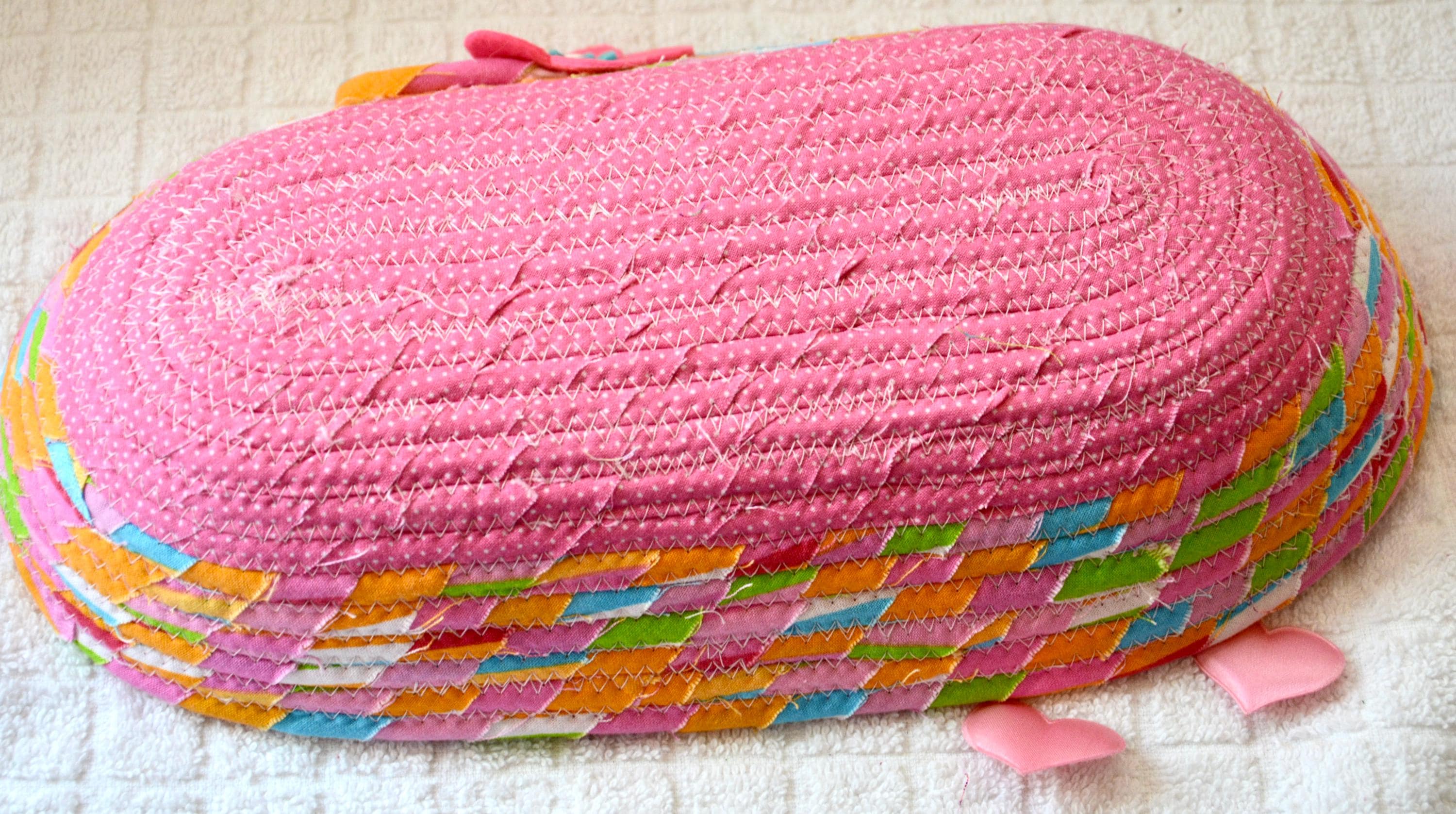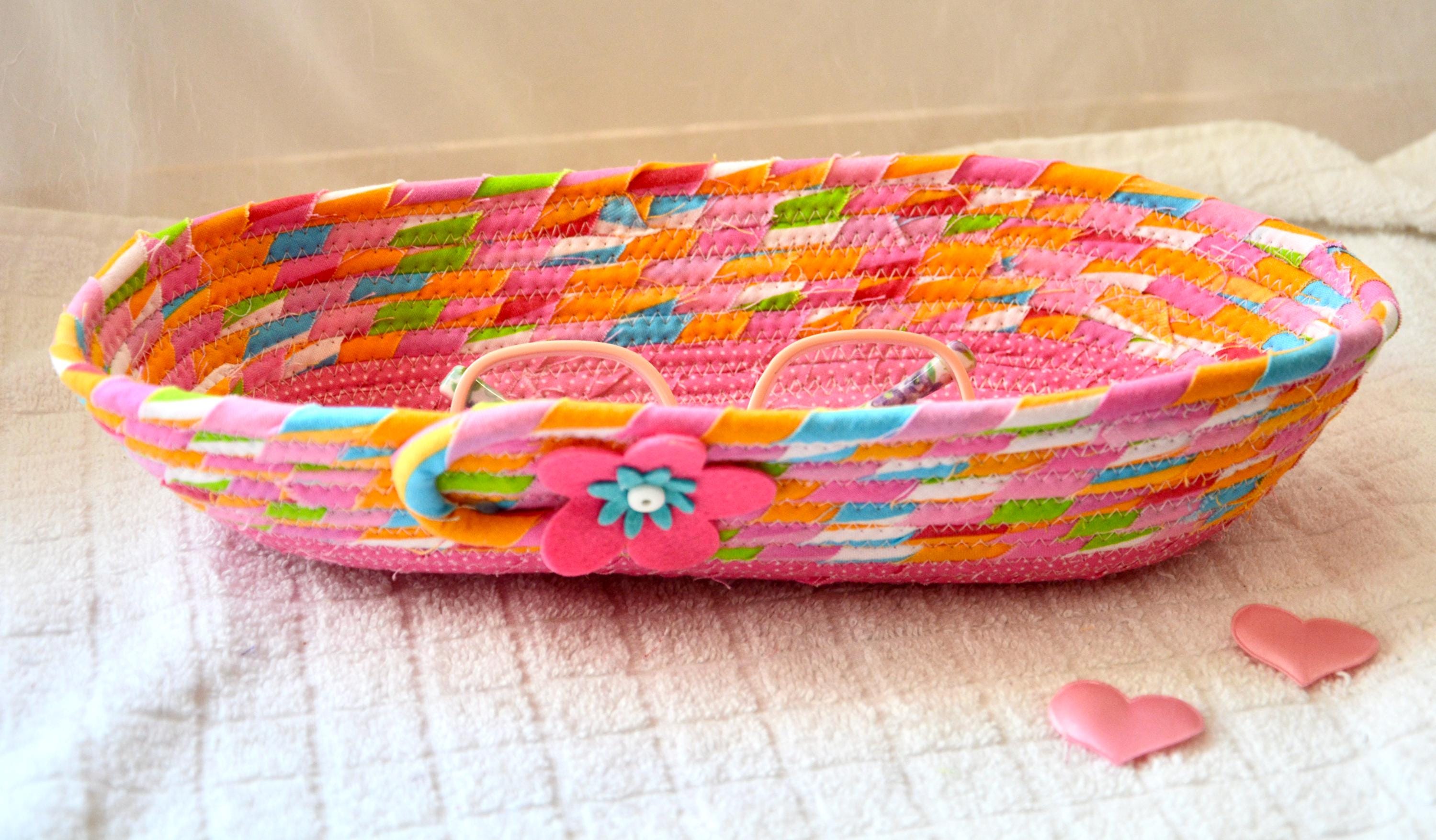 I hand wrapped this colorful pink fabric around cotton line, which I then hand coiled and machine quilted to make it sturdy. I used the raw edge technique with some fray, adding a nice shabby chic texture. I added a cute pink fabric to the base for a nice accent.