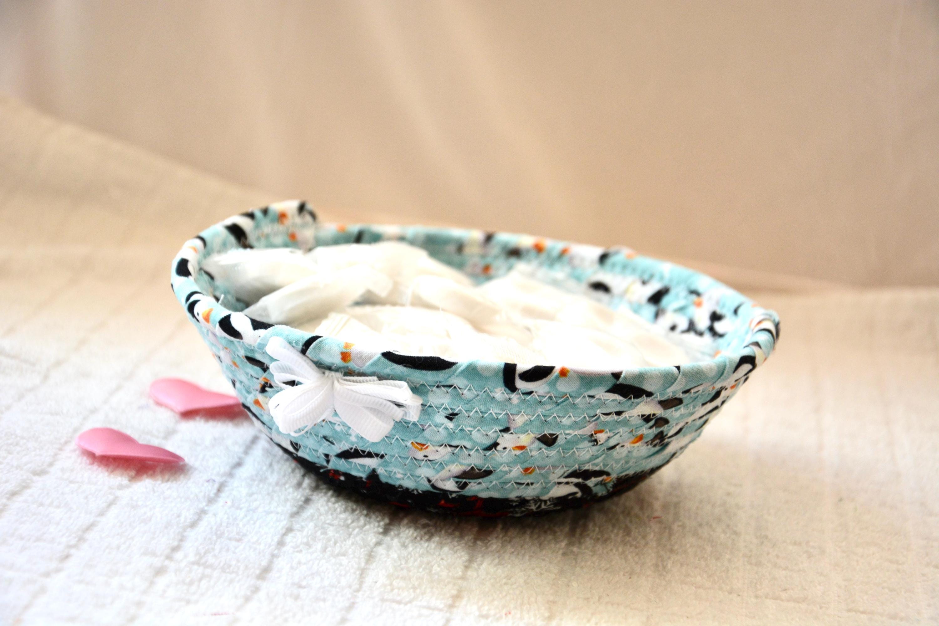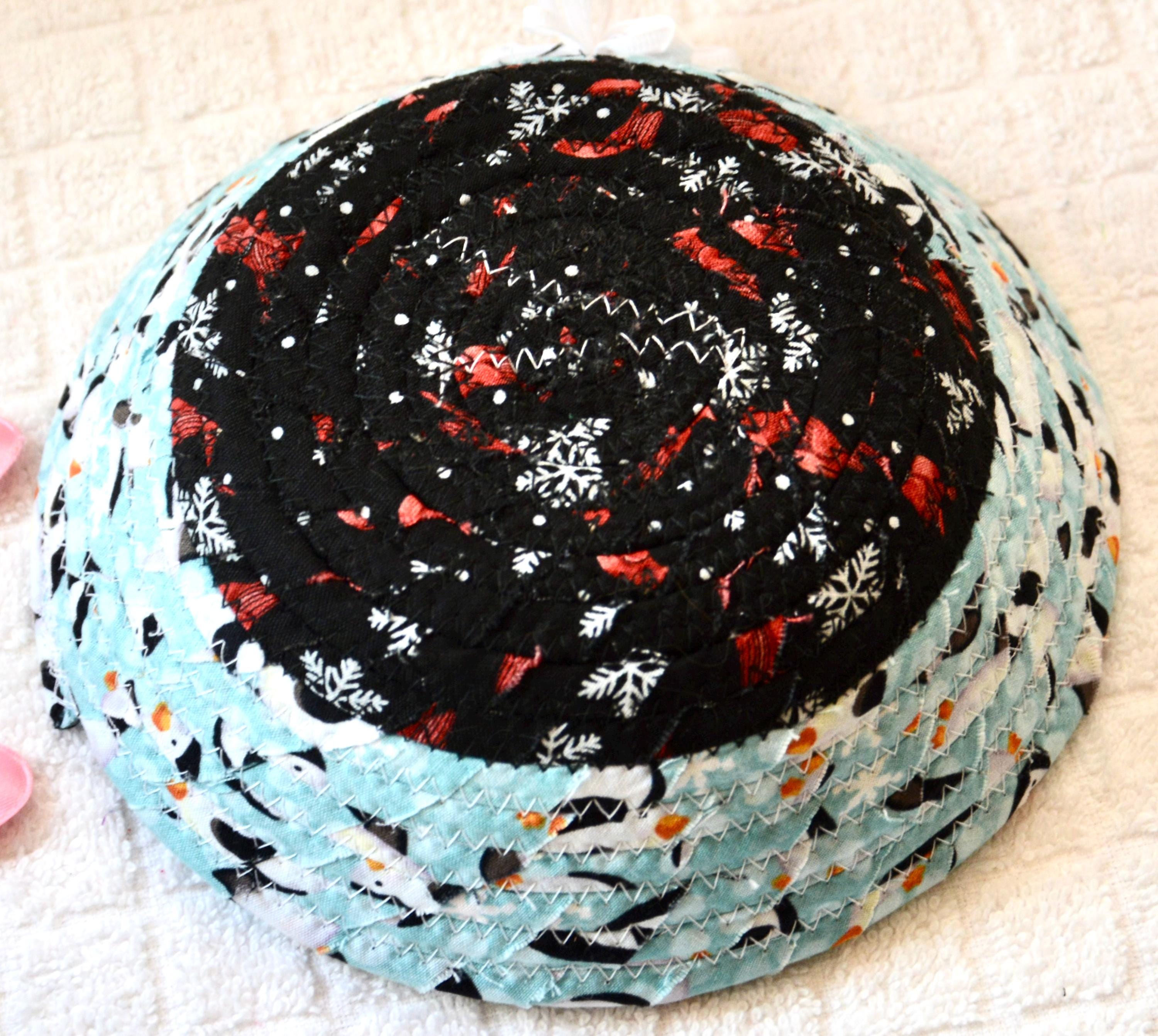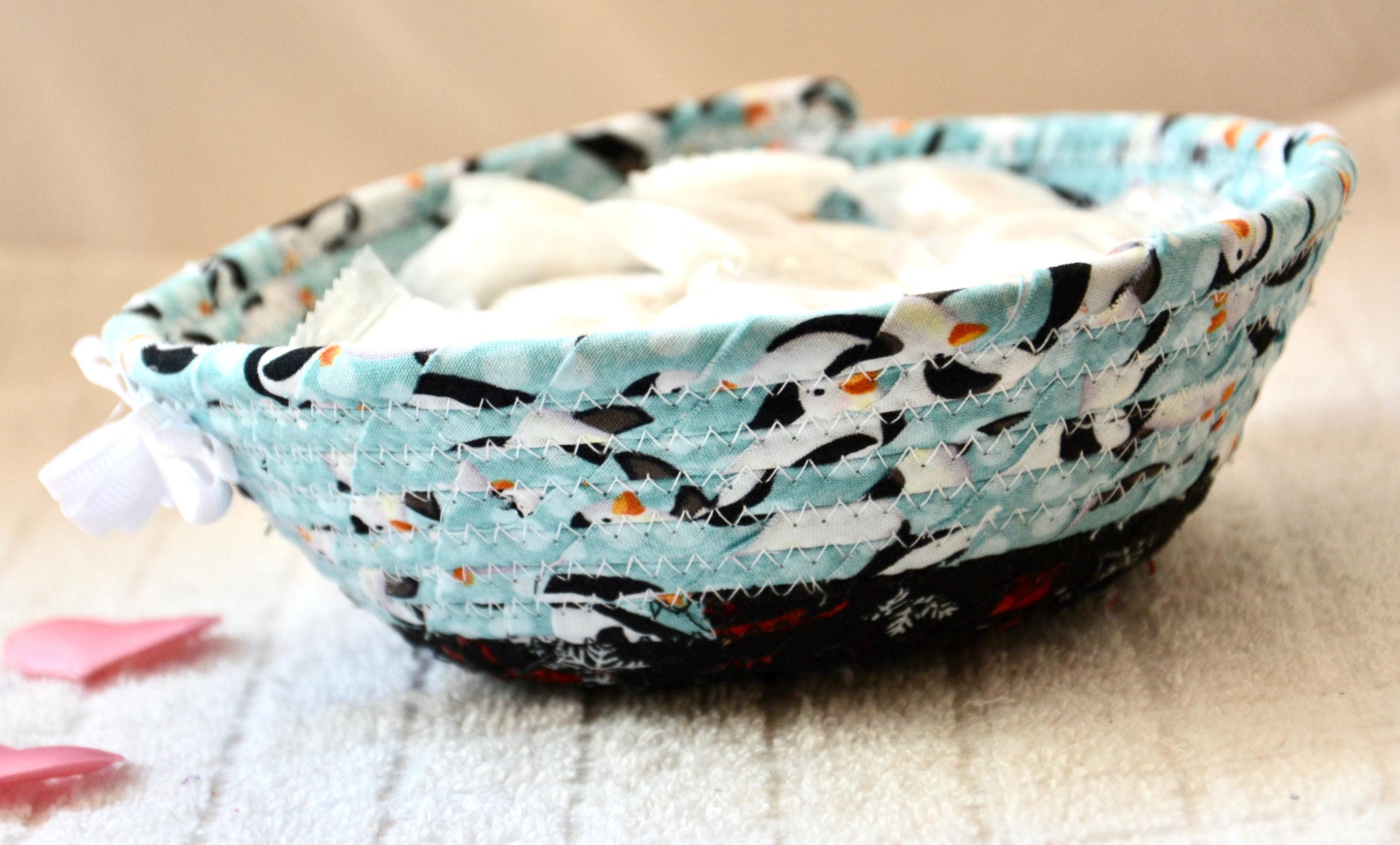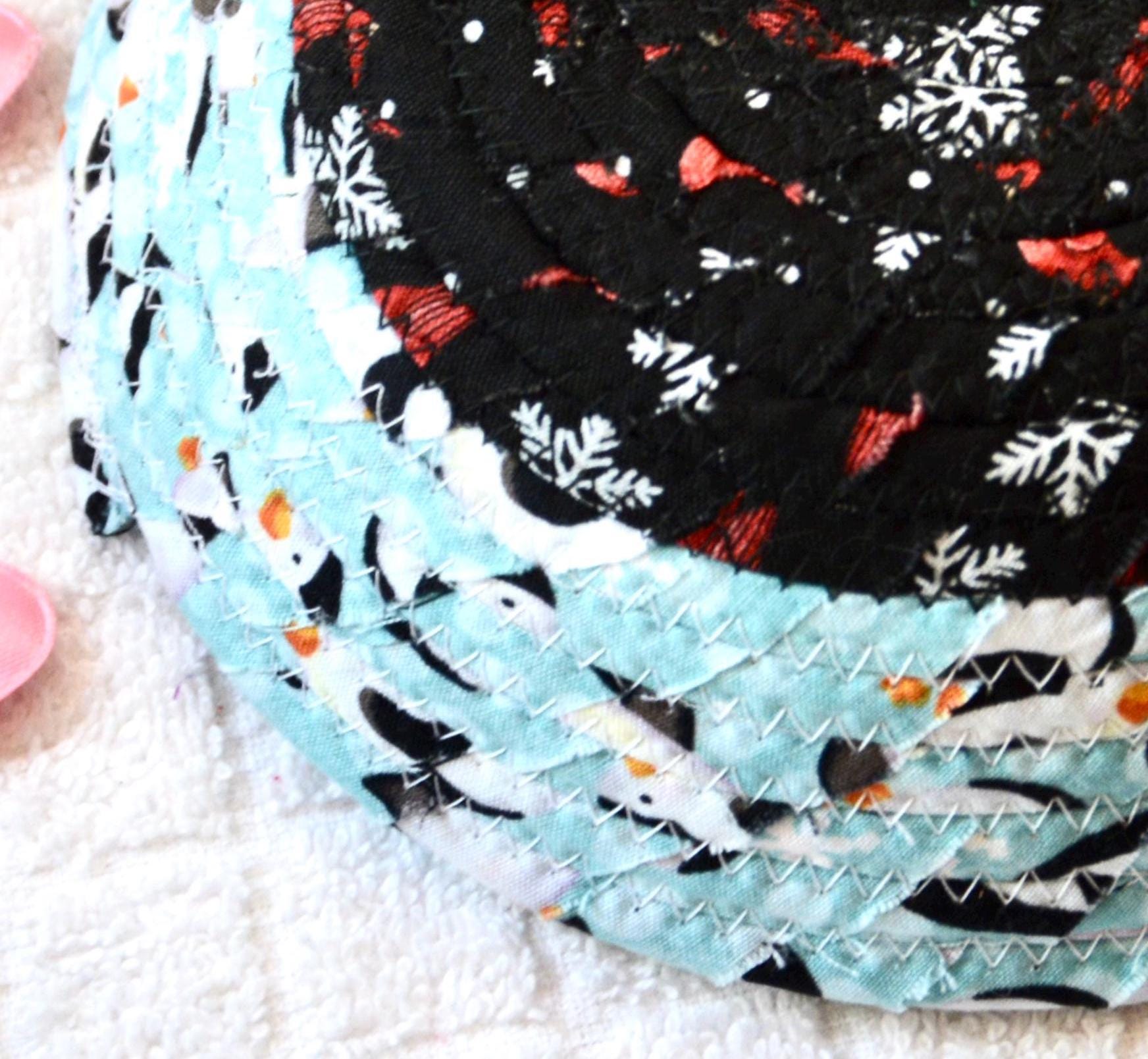 I hand wrapped these high quality fabrics around cotton line, which I then hand coiled and machine quilted to make it sturdy. I used the raw edge technique with some fray to add a wonderful shabby chic texture. I just love the snowflake highlights in these pretty fabrics! So festive! The pretty bow on the basket is included for a nice accent.