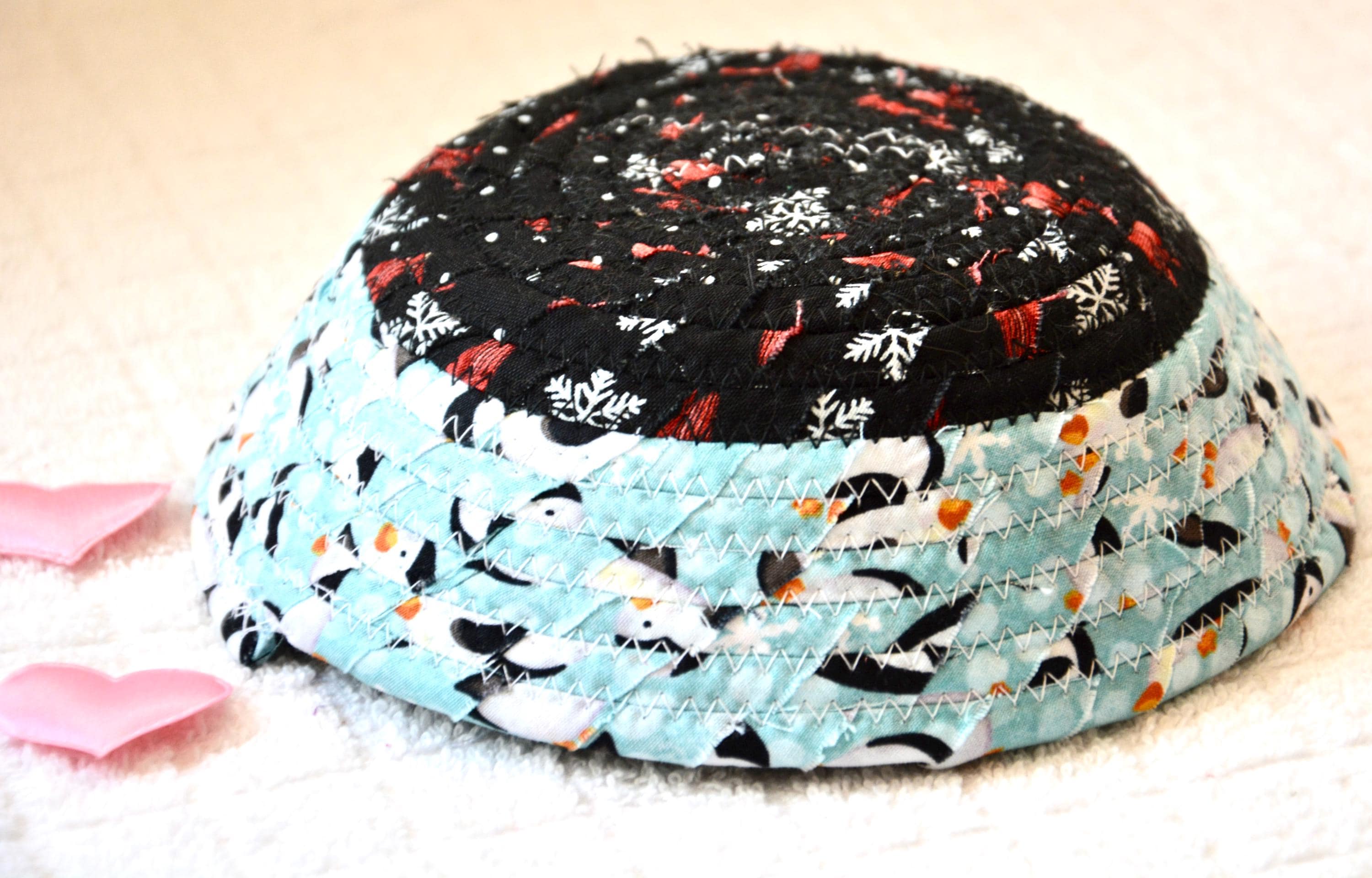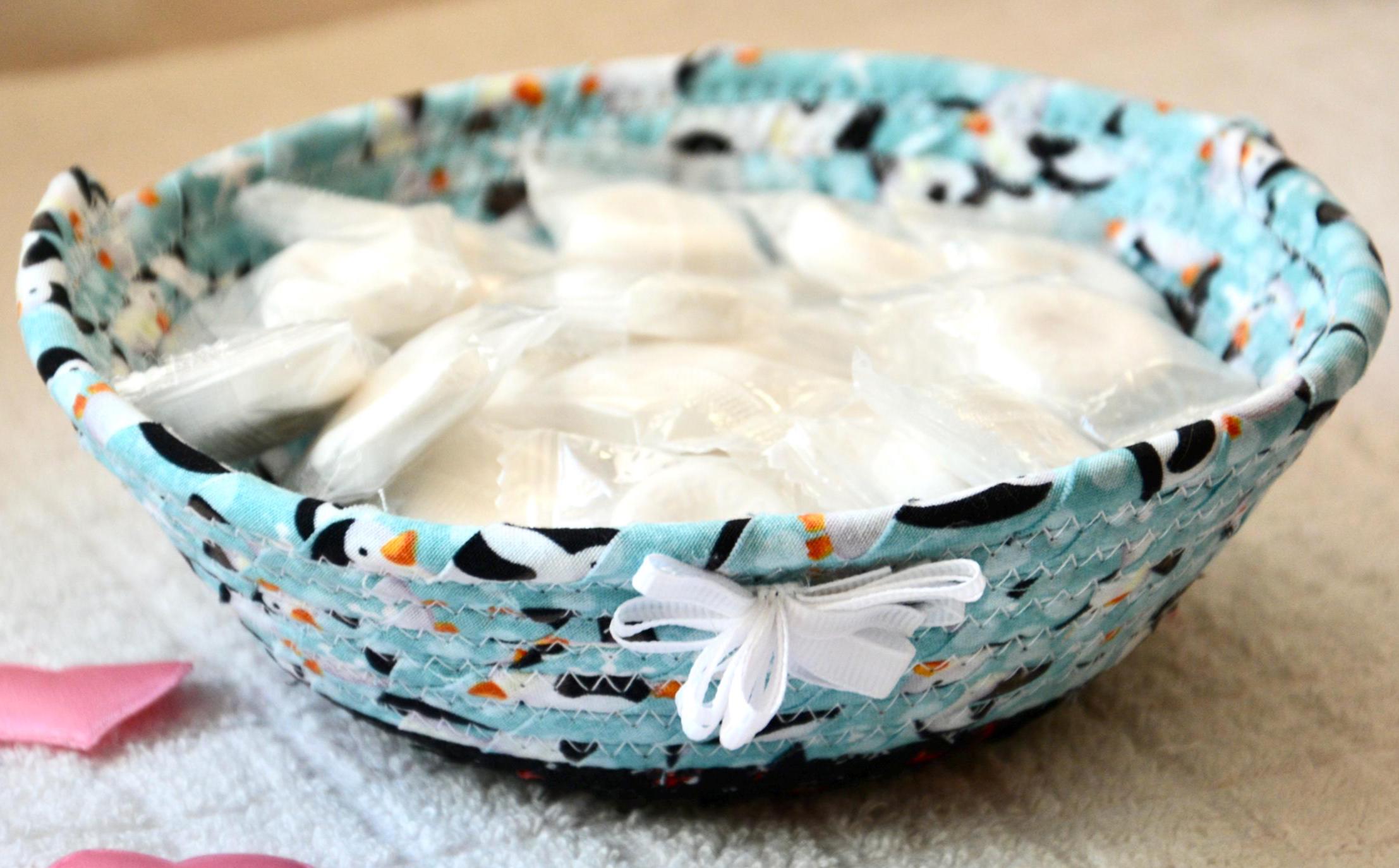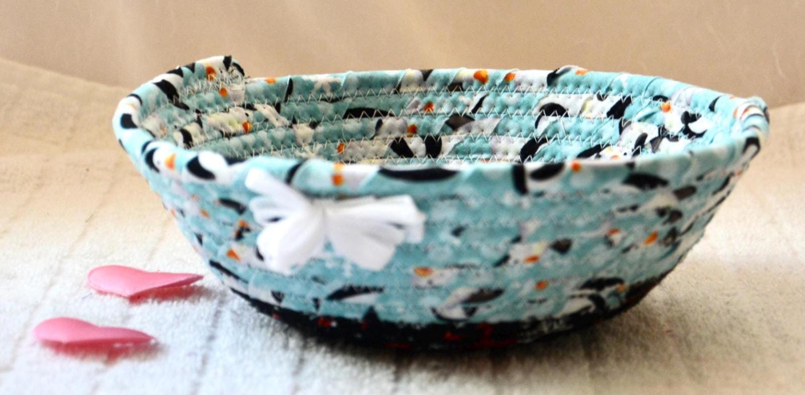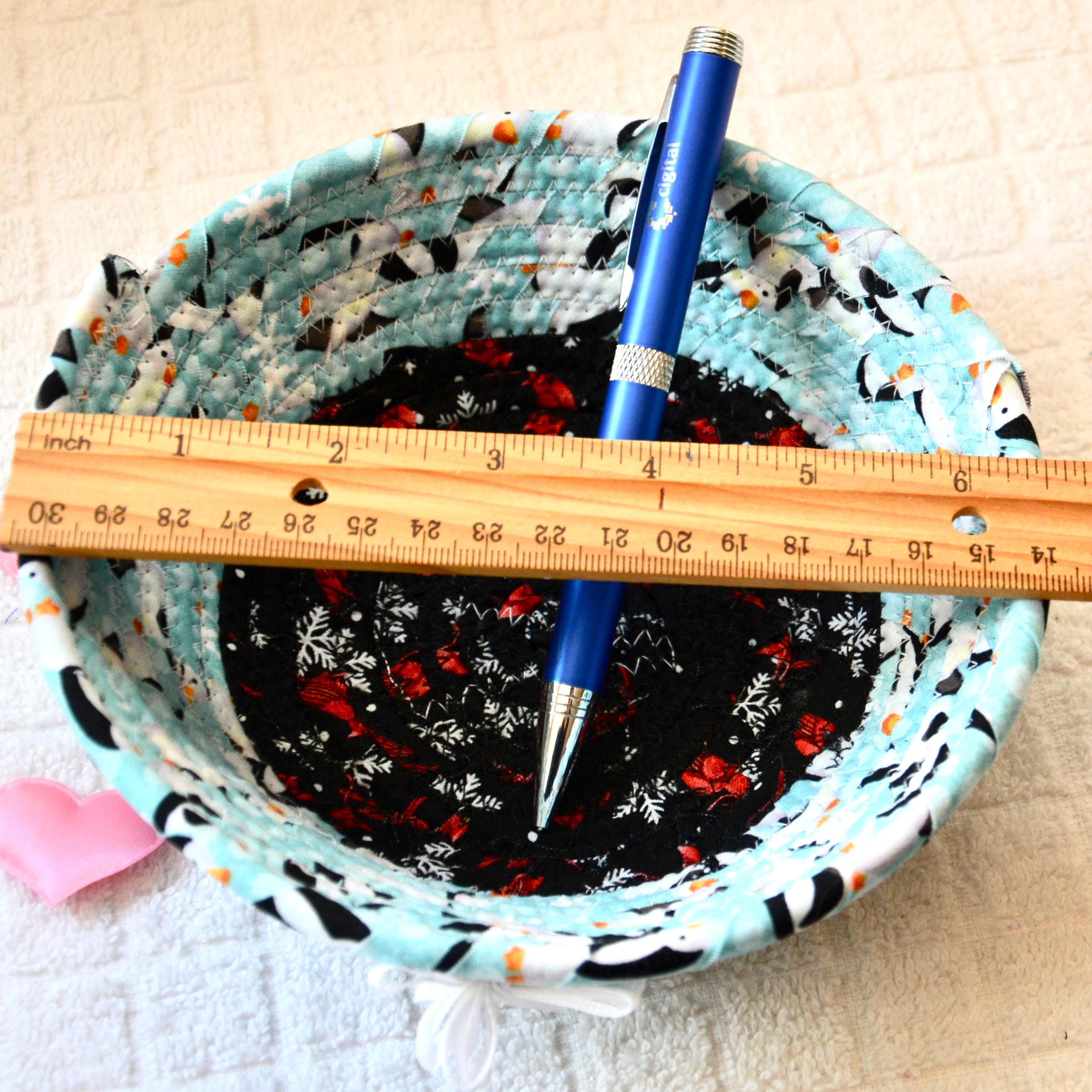 I hand wrapped these high quality fabrics around cotton line, which I then hand coiled and machine quilted to make it sturdy. I used the raw edge technique with some fray to add a wonderful shabby chic texture. I just love the snowflake highlights in these pretty fabrics! So festive! The pretty bow on the basket is included for a nice accent.