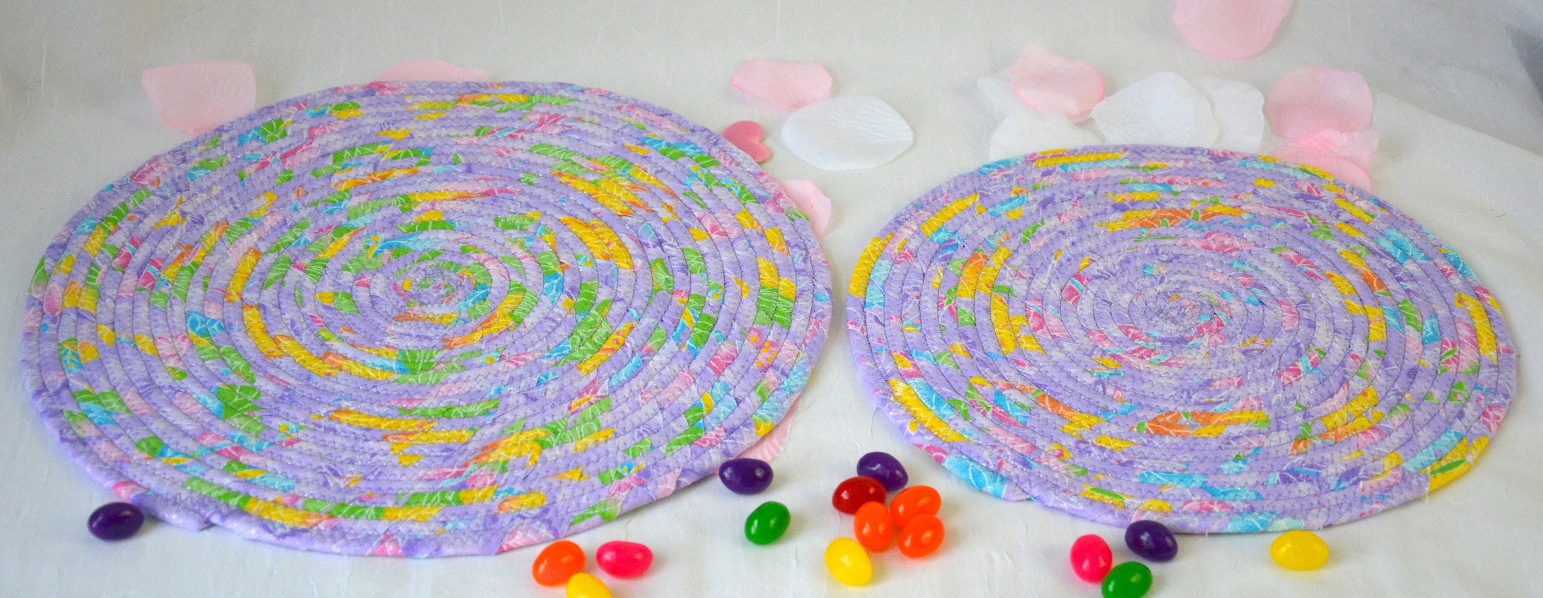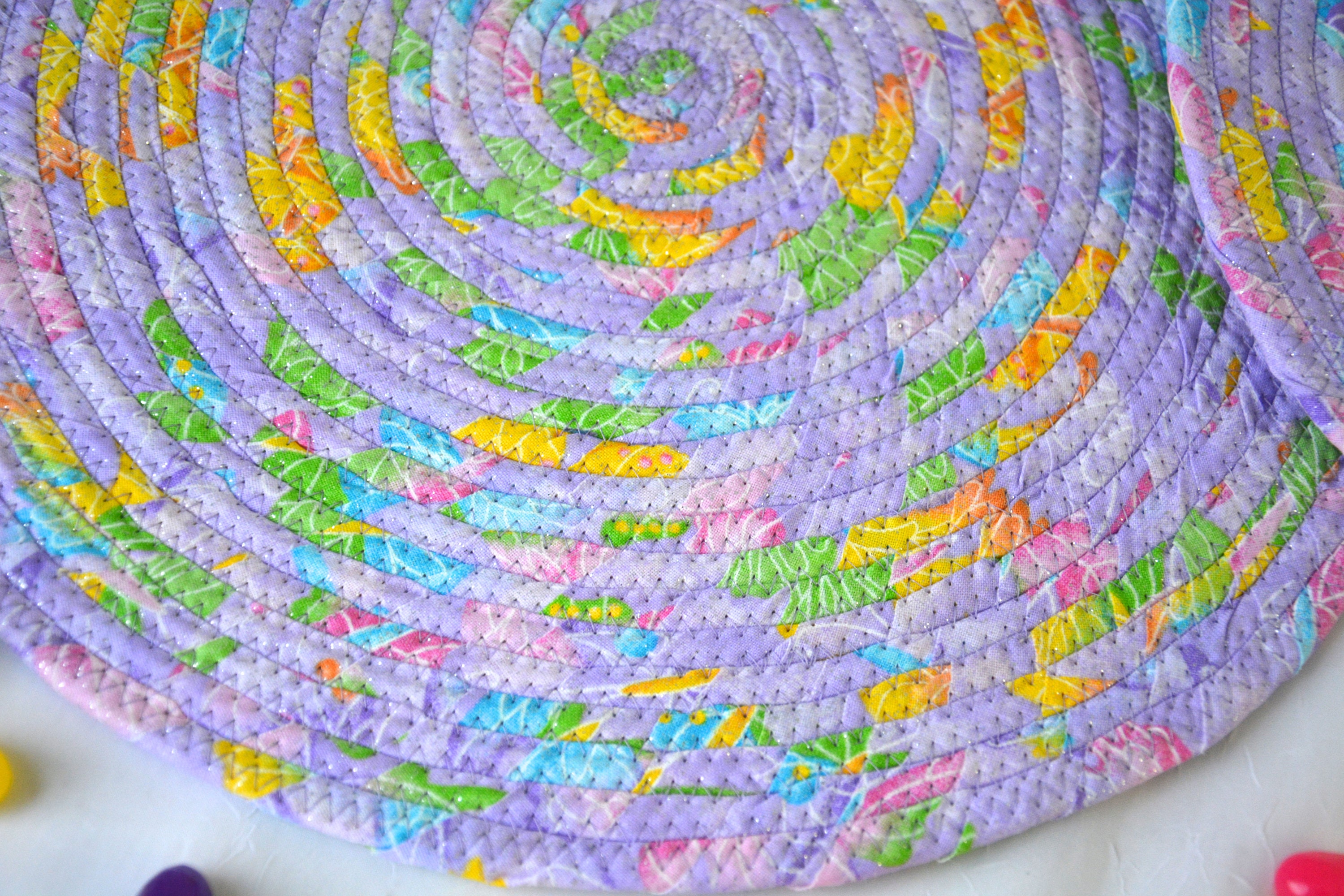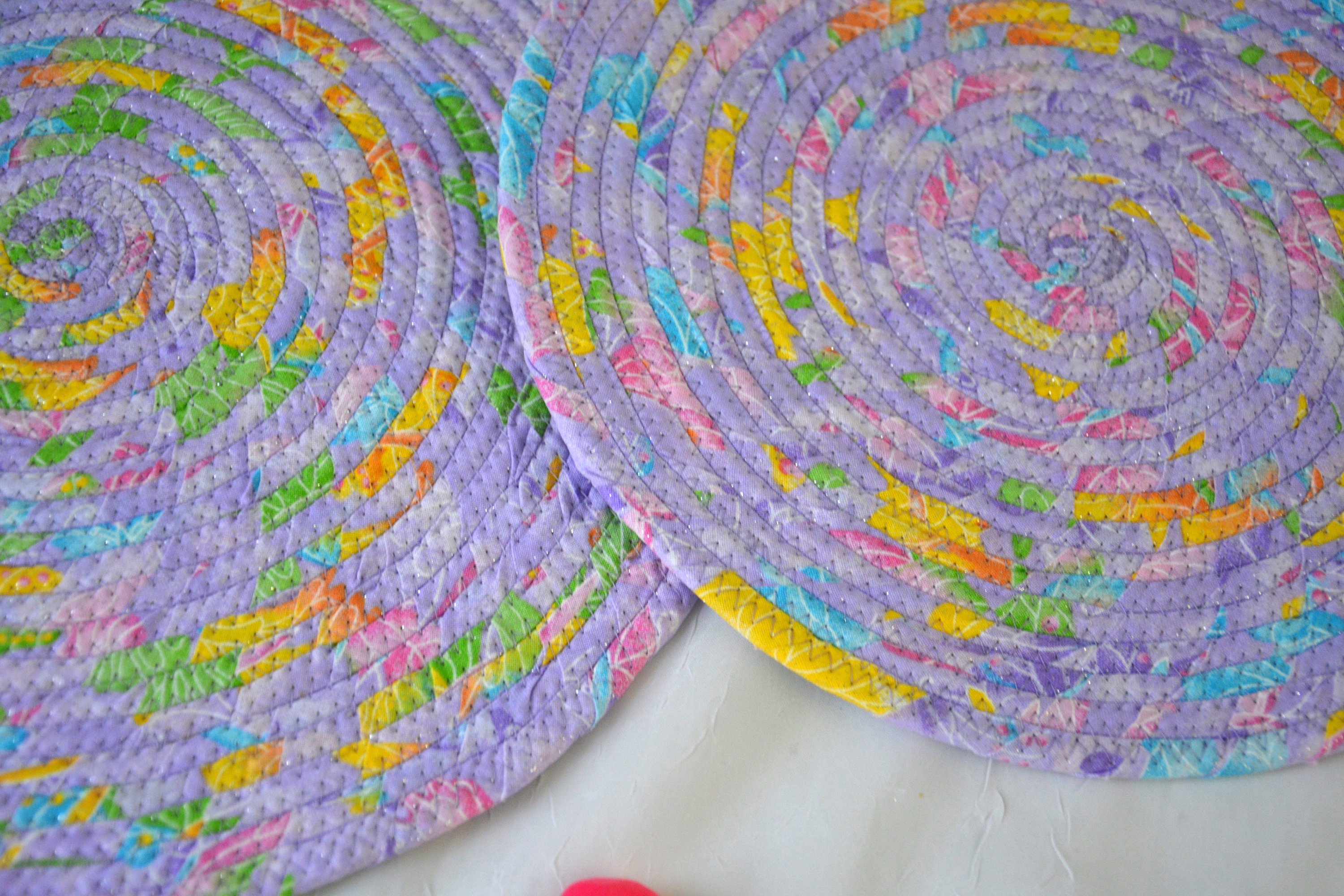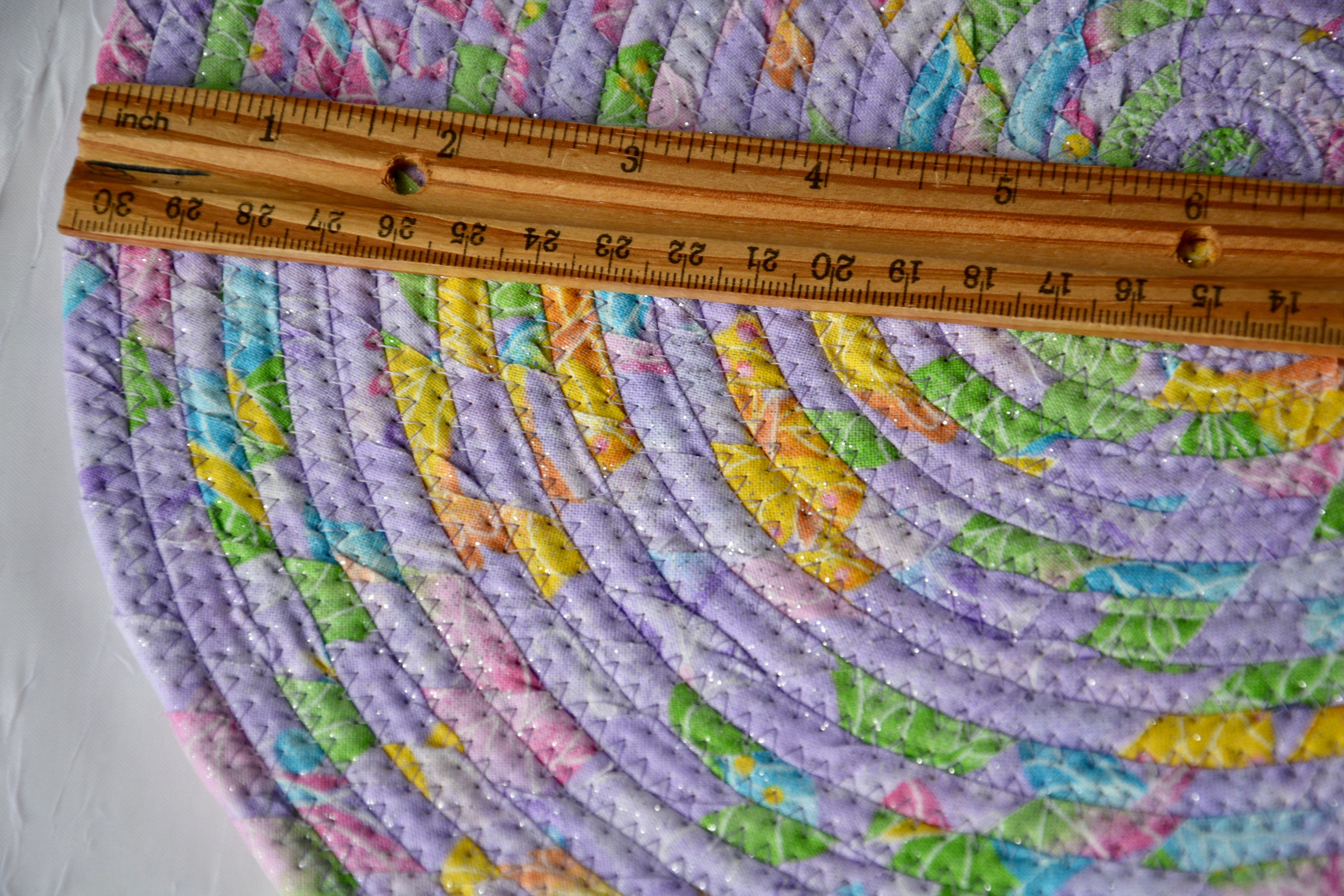 I hand wrapped this cute lavender glitter fabric around cotton line, which I then hand coiled and machine quilted to make it sturdy. I used the raw edge technique with some fray adding a nice shabby chic texture. It is 100% cotton fabric and shows on both sides of the trivet too! The pattern created is so unique! OOAK! The glitter adds that nice pop for your festive table.