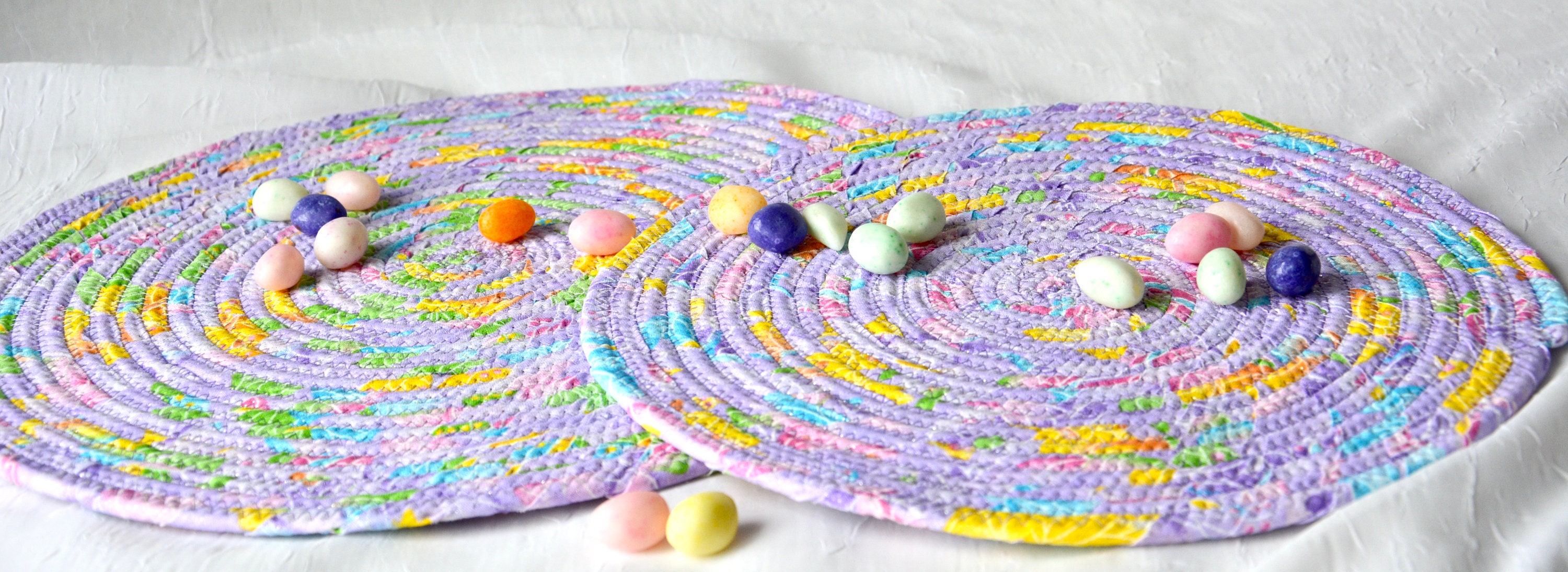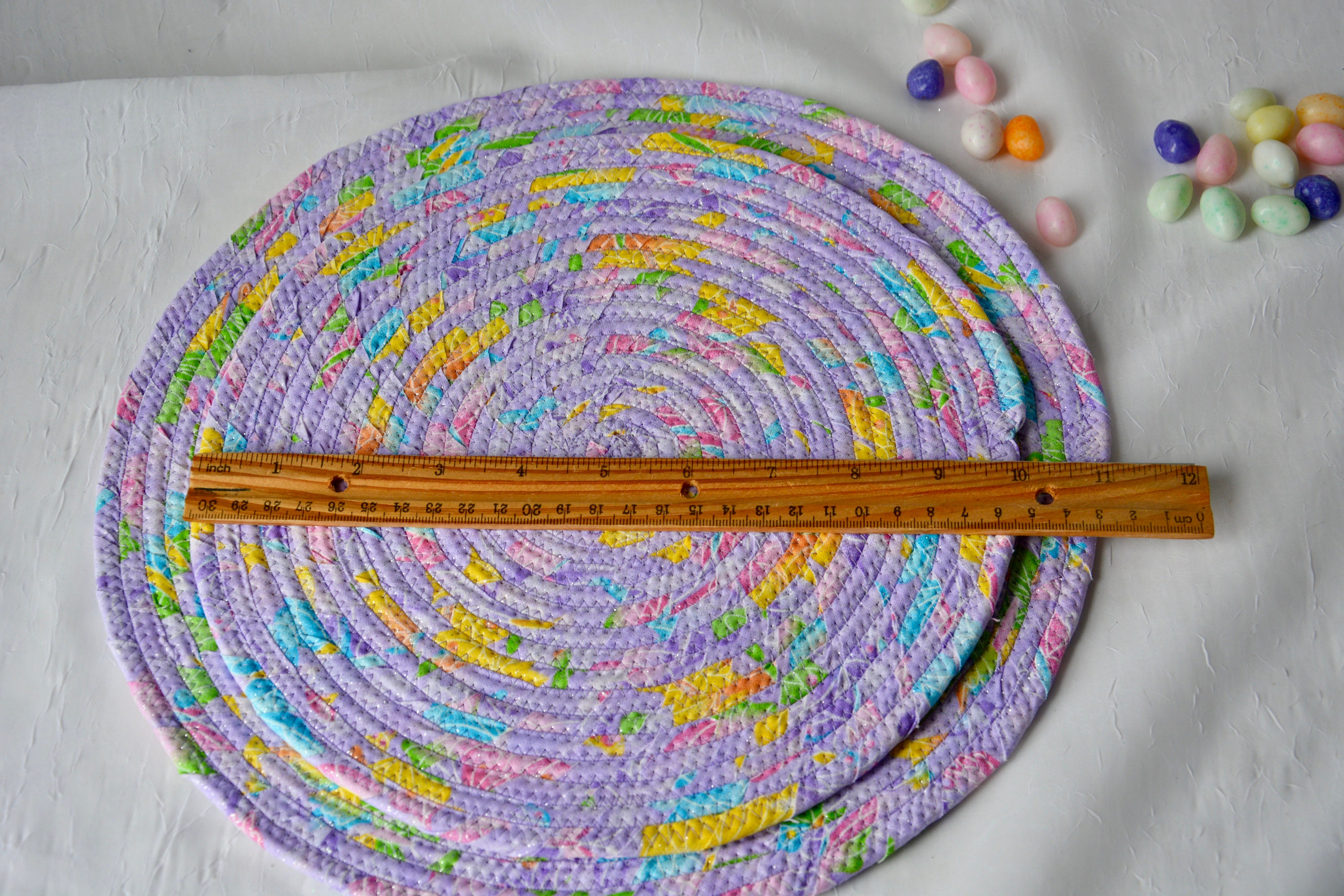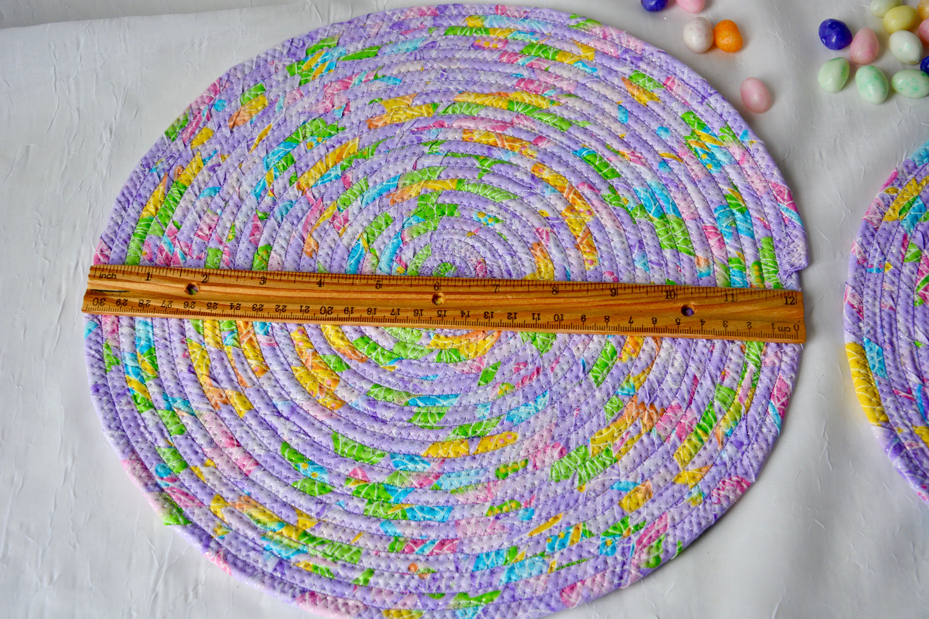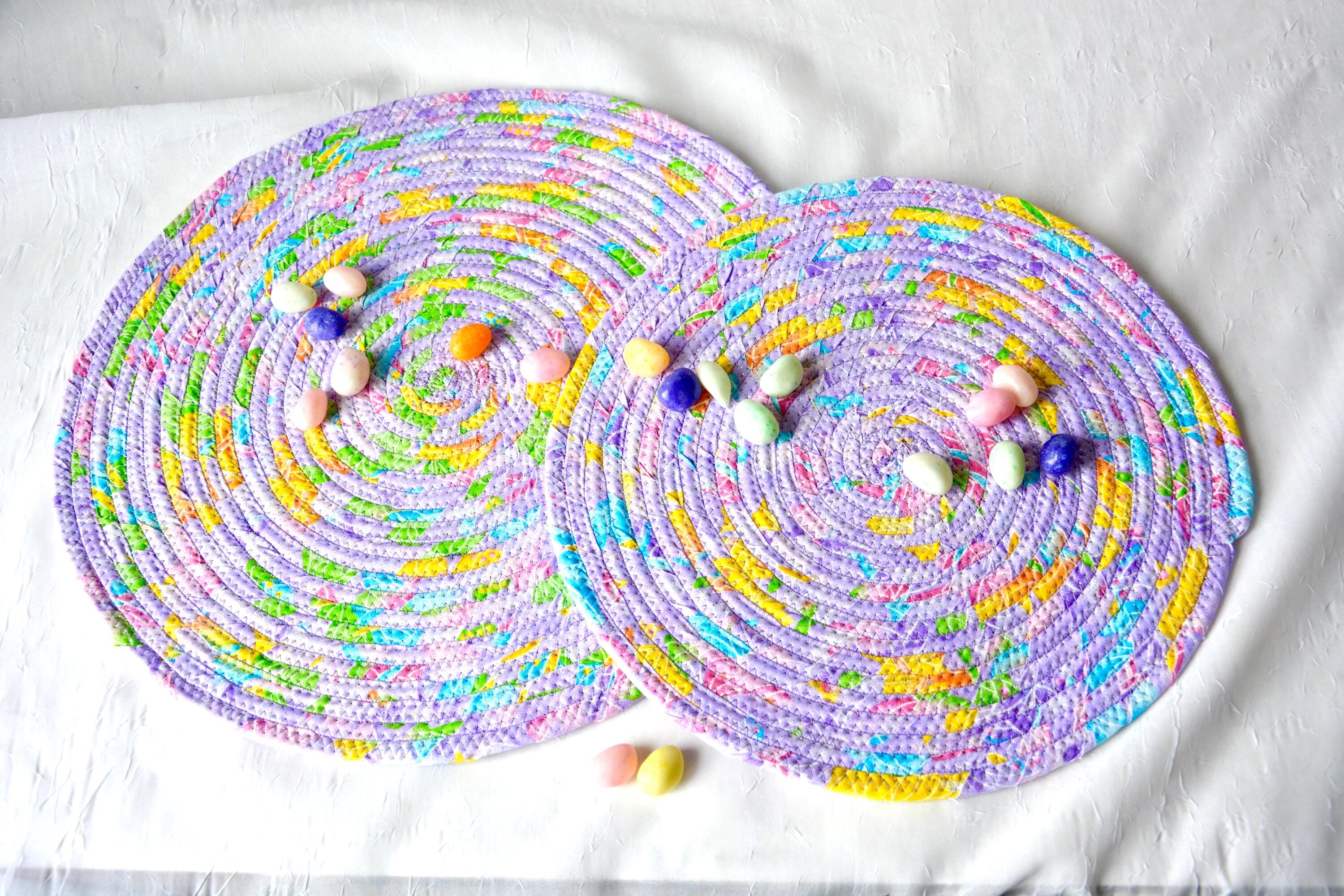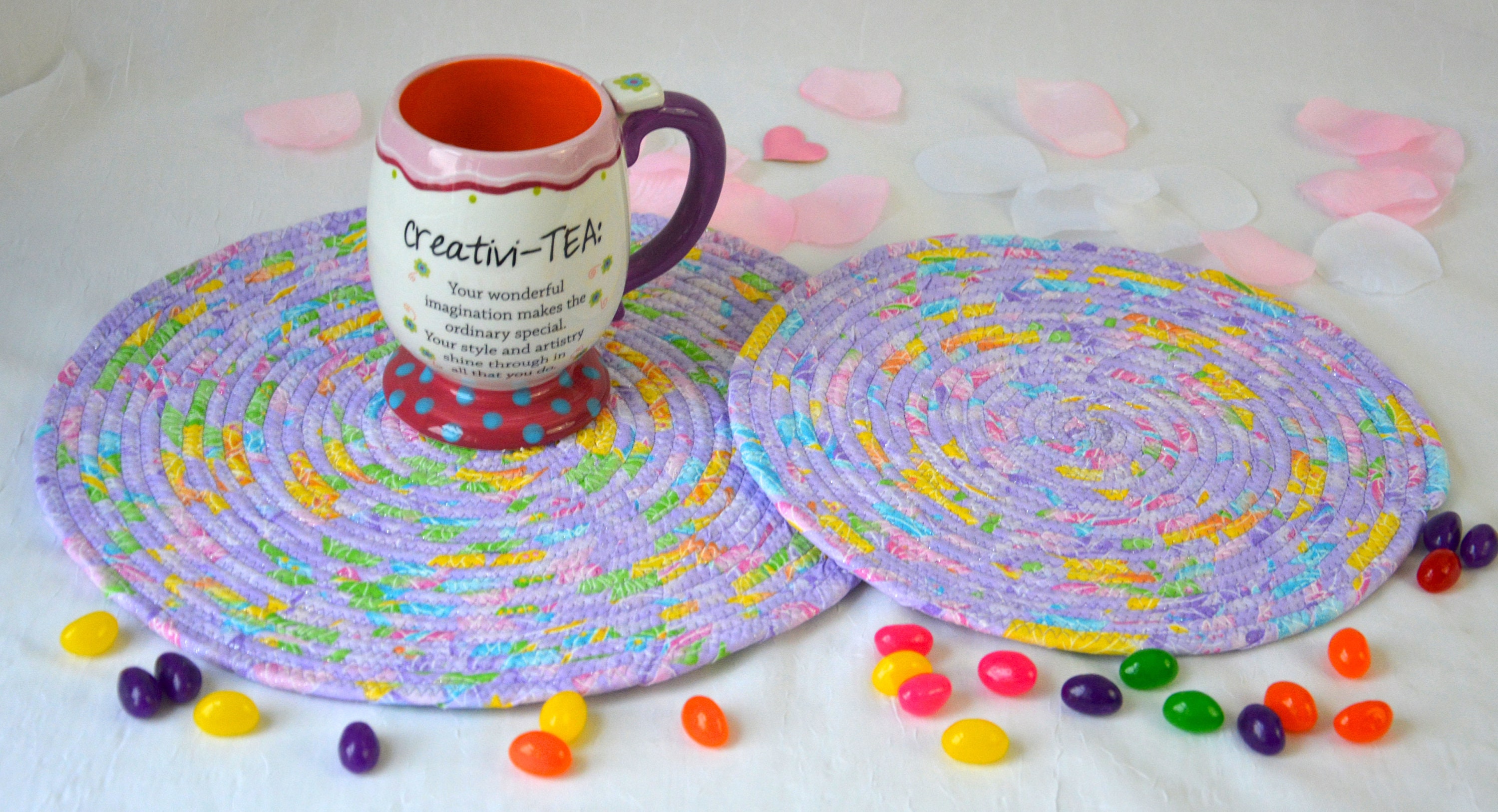 I hand wrapped this cute lavender glitter fabric around cotton line, which I then hand coiled and machine quilted to make it sturdy. I used the raw edge technique with some fray adding a nice shabby chic texture. It is 100% cotton fabric and shows on both sides of the trivet too! The pattern created is so unique! OOAK! The glitter adds that nice pop for your festive table.