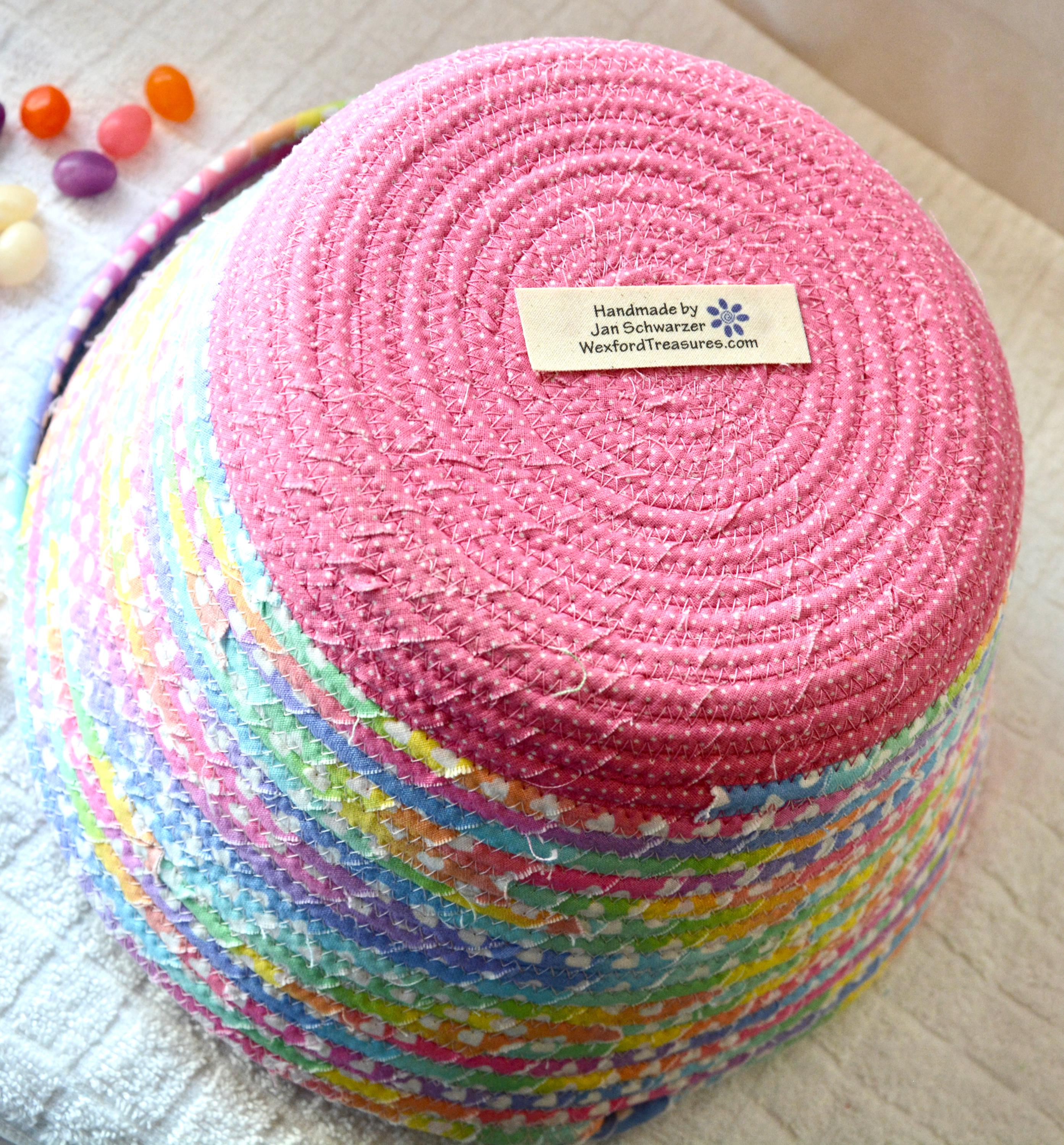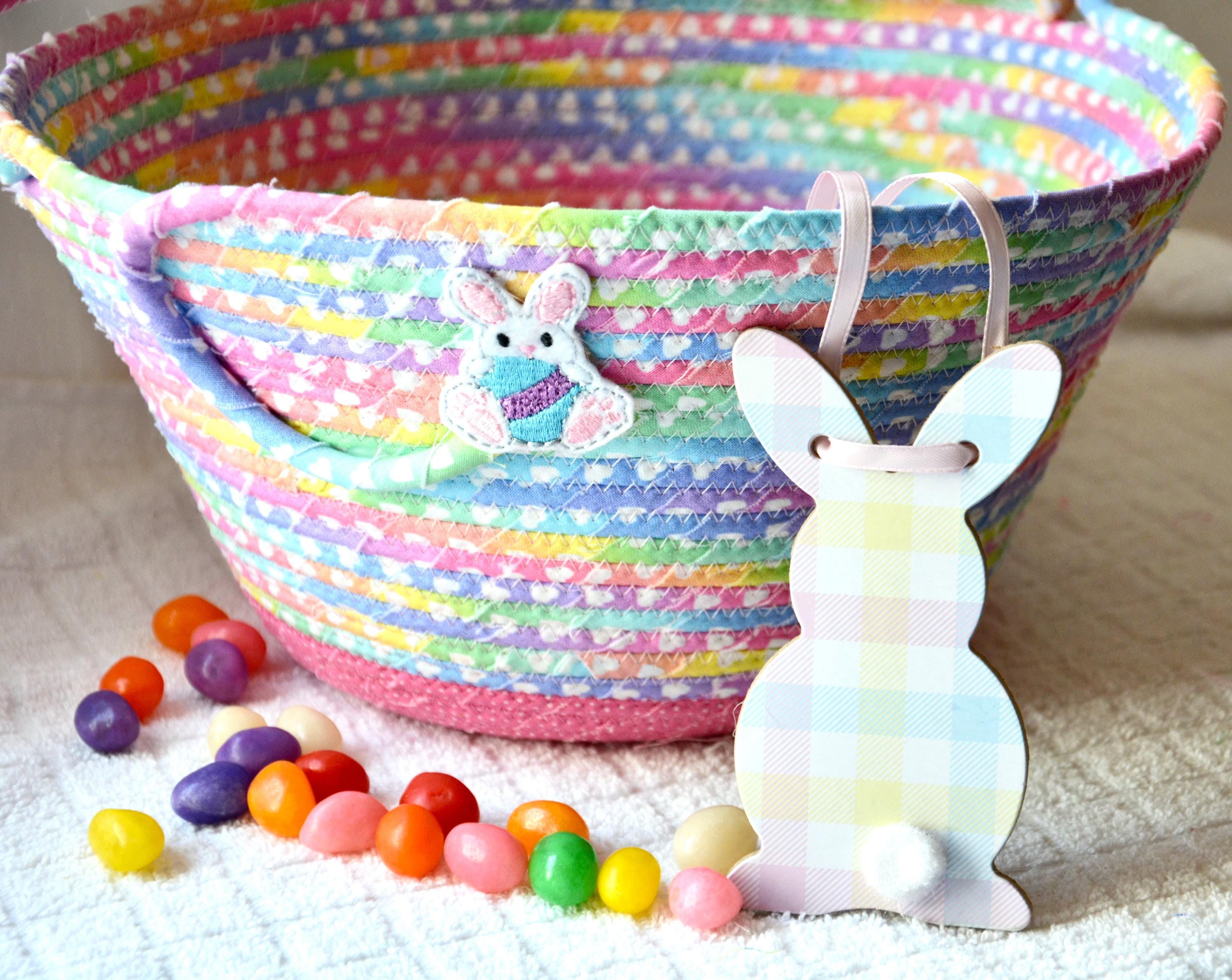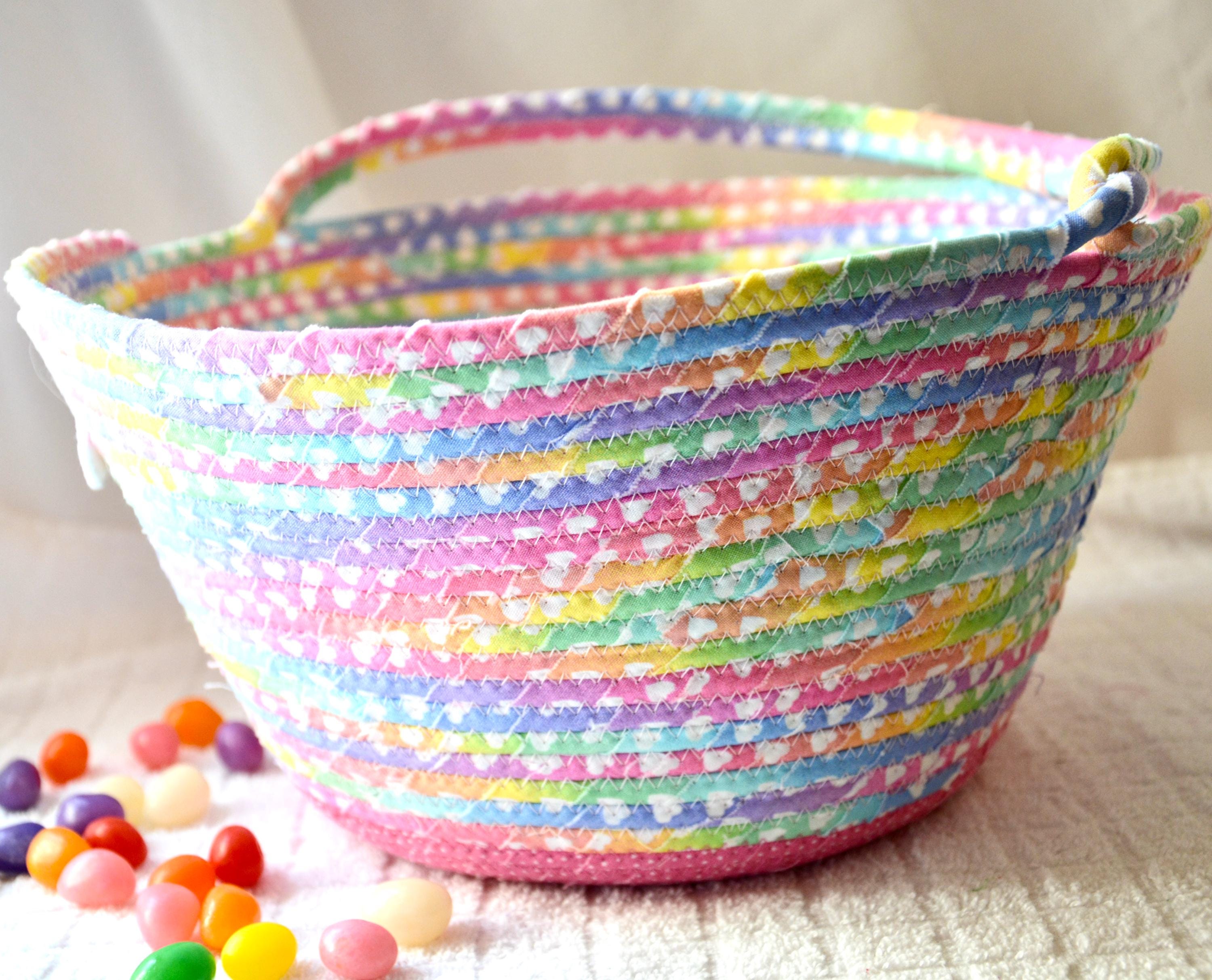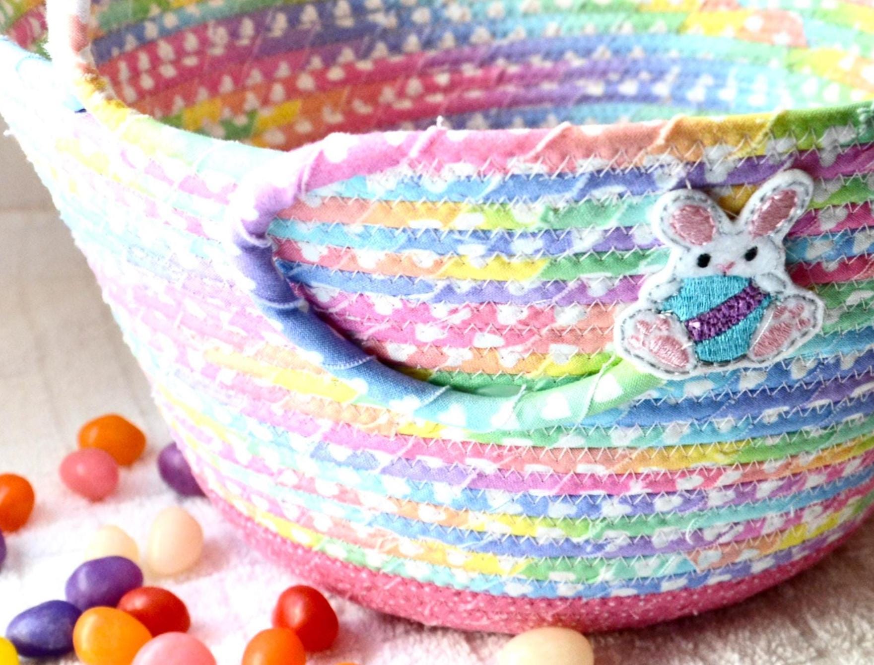 I hand wrapped these lovely Easter fabrics around cotton line, which I then hand coiled and machine quilted to make it sturdy. I used the raw edge technique with some fray, adding a nice shabby chic texture. The cute bunny on the basket is included for a nice accent. Color placement will vary. Spot clean. Both pretty fabrics are 100% cotton and both show on the inside of the basket too! Bunny, jelly beans, pen, candy, ruler props not included.