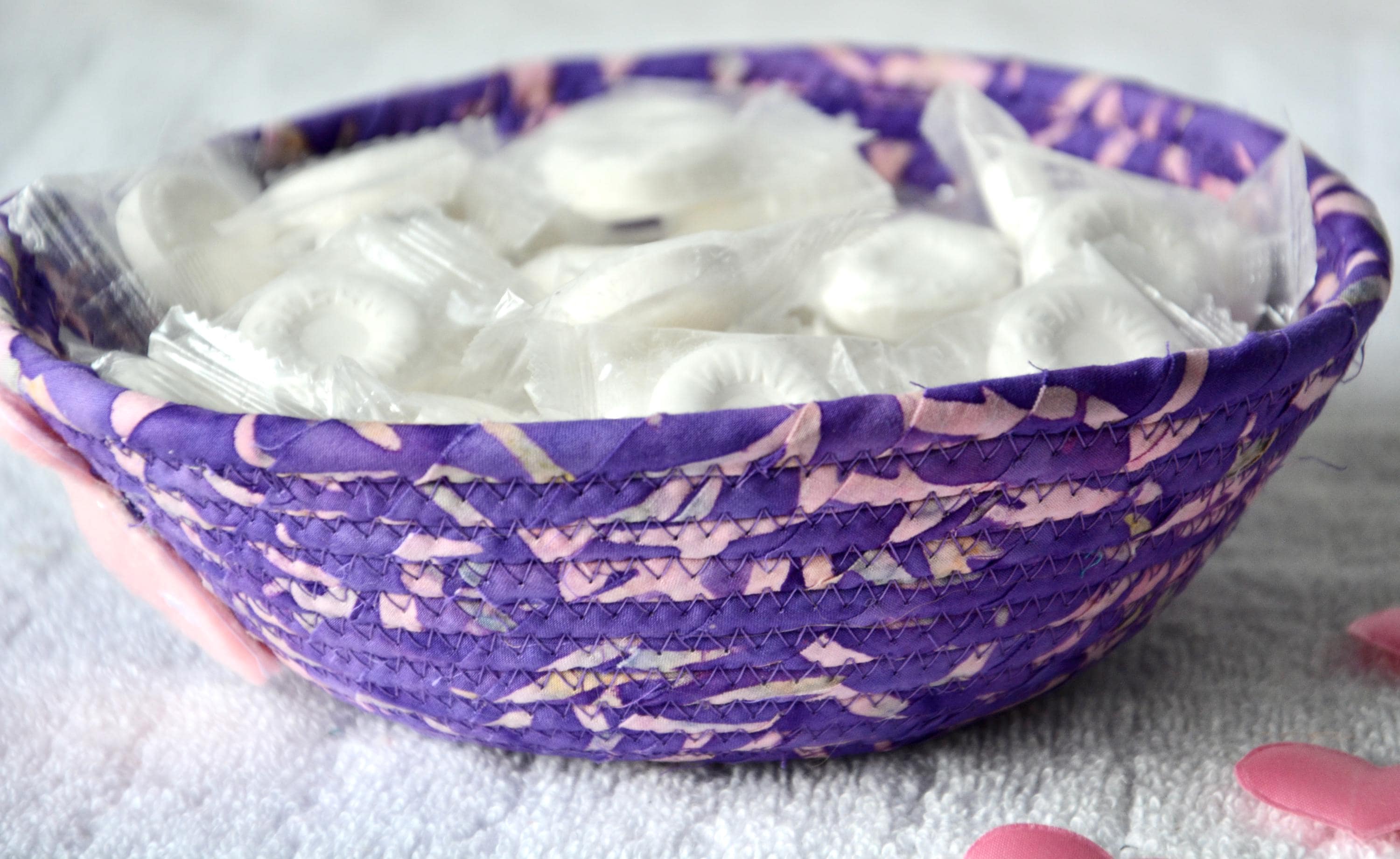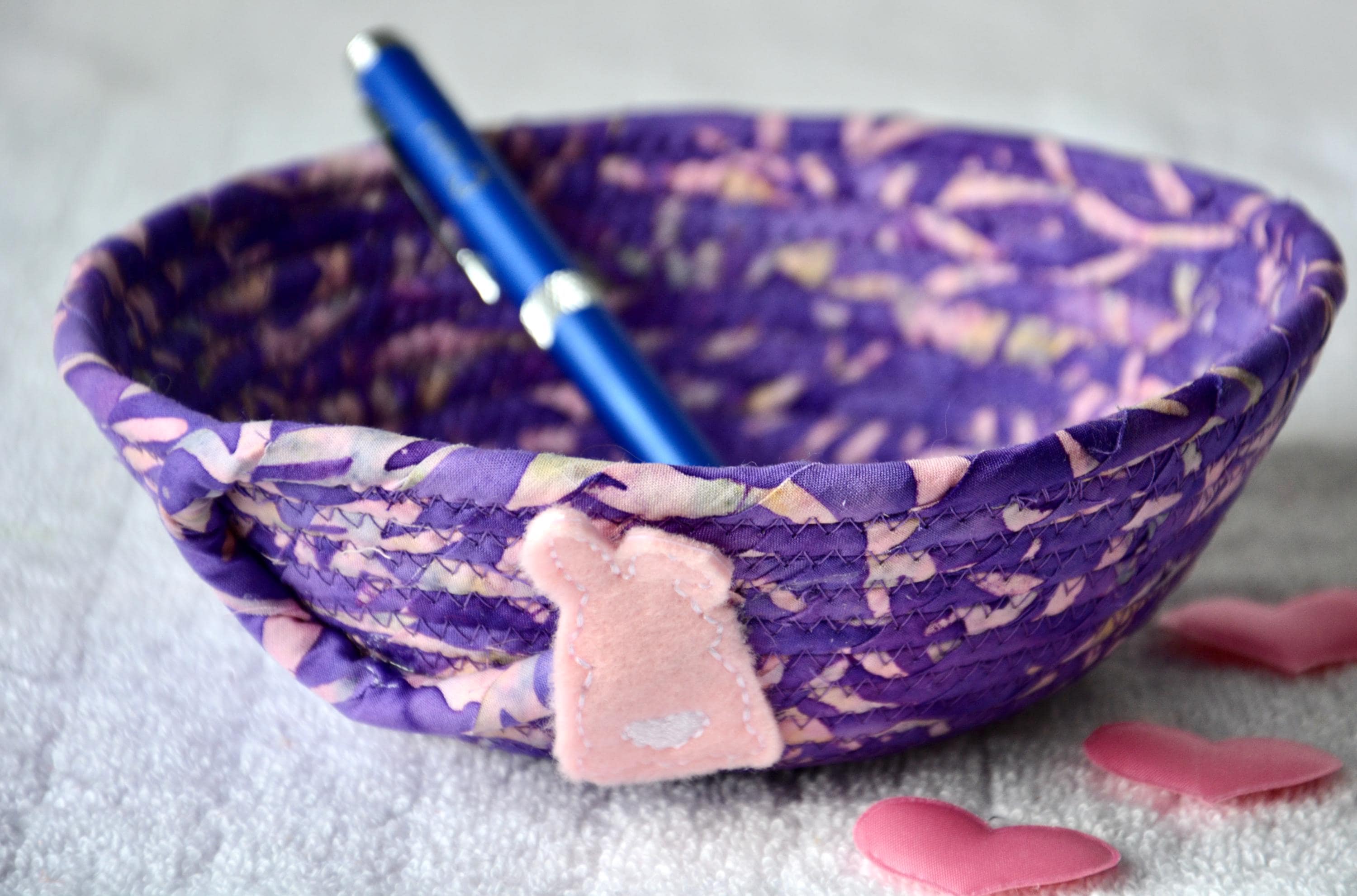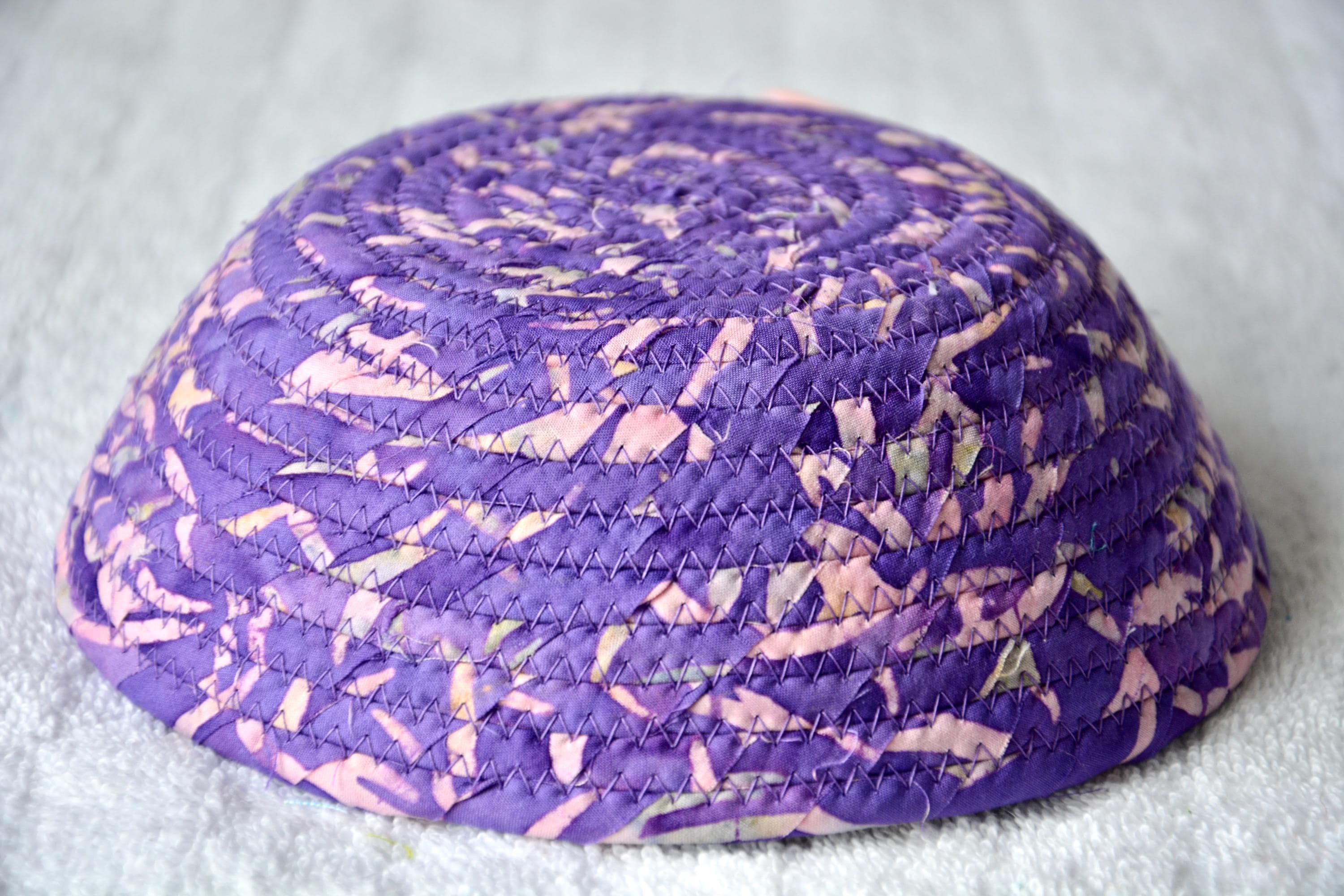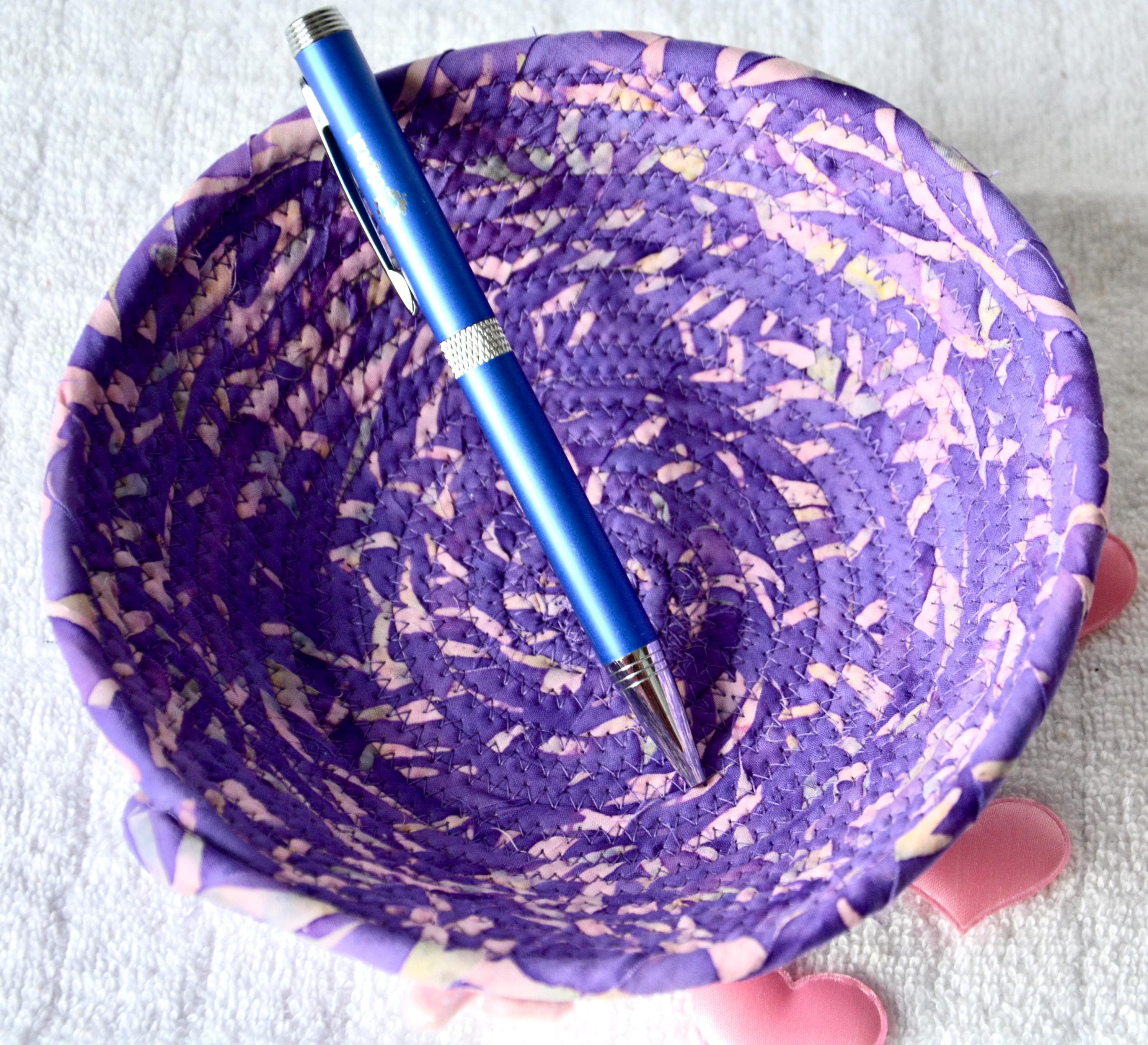 I hand wrapped this wonderful batik fabric around cotton line, which I then hand coiled and machine quilted to make it sturdy. I used the raw edge technique with some fray to add a great shabby chic texture. This is a high quality 100% cotton fabric and it shows on the inside too! The cute bunny on the basket is included for a nice accent.