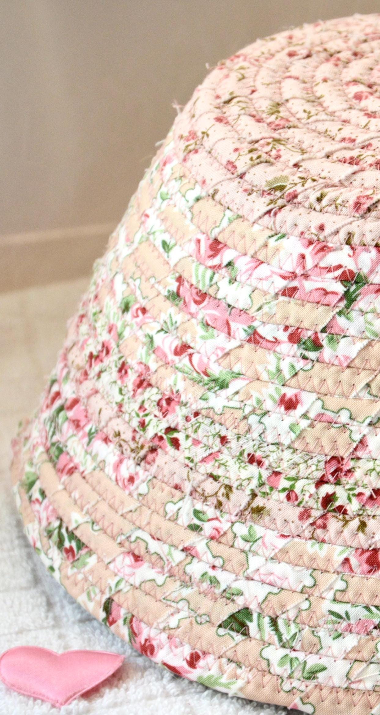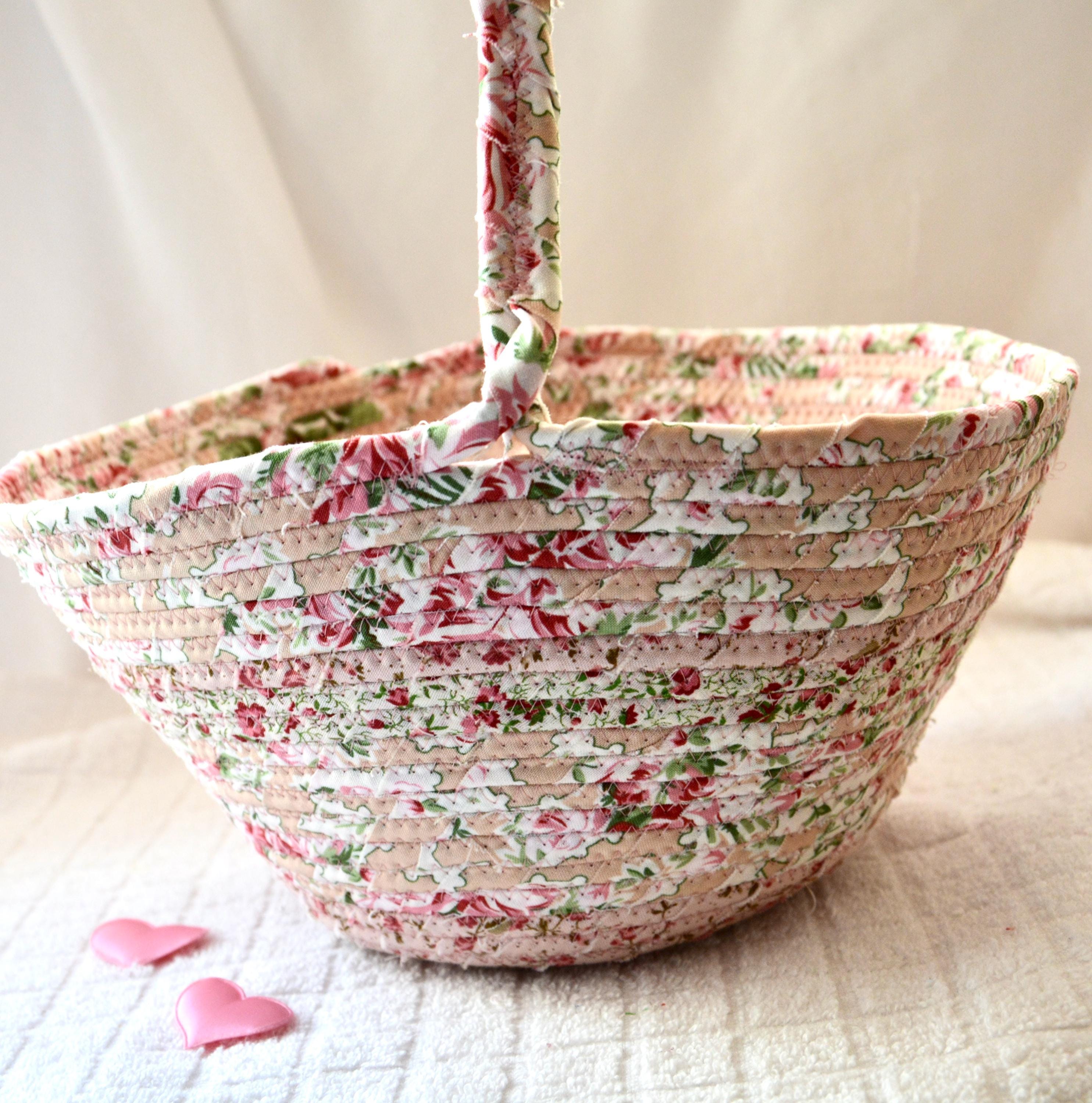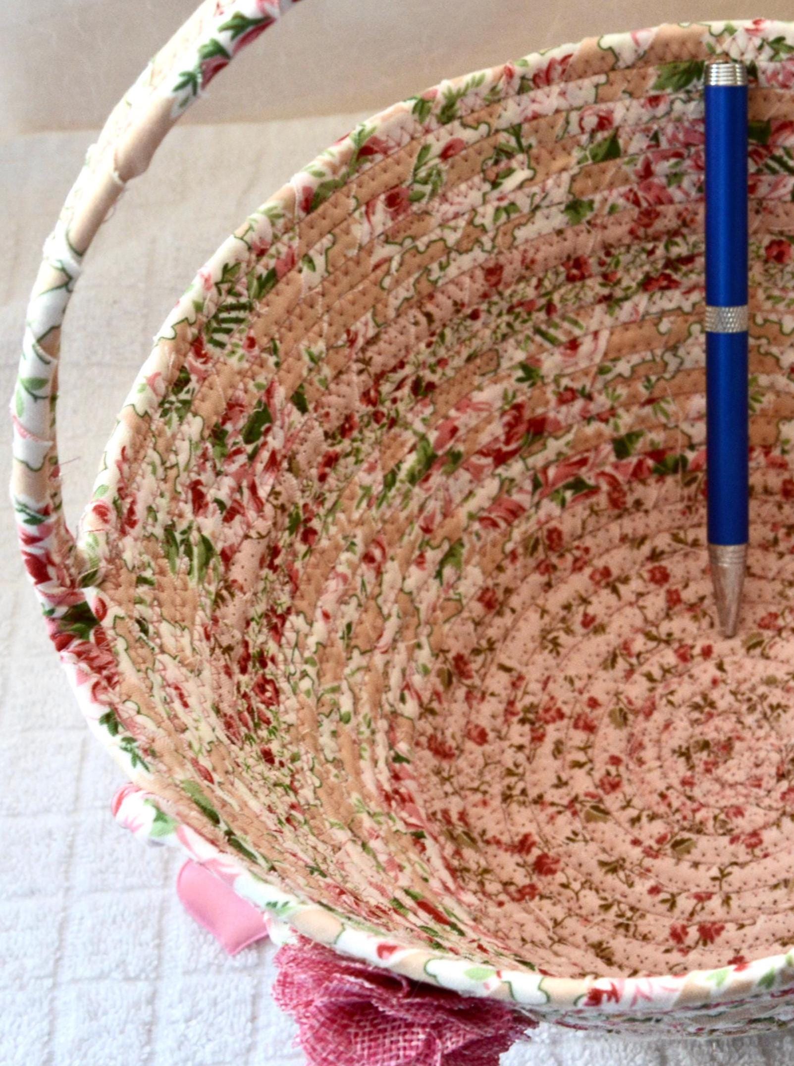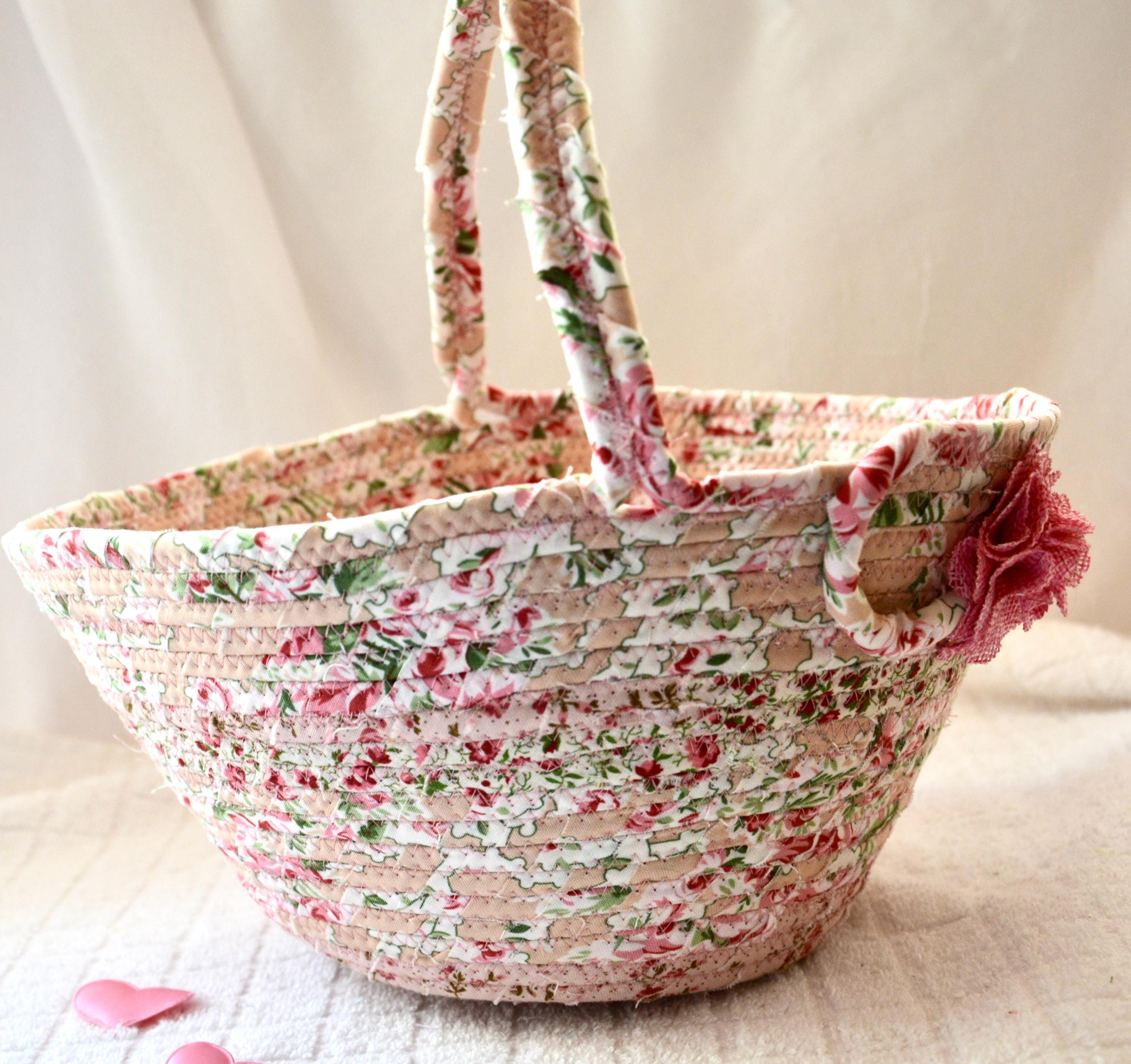 I hand wrapped these lovely floral fabrics around cotton line, which I then hand coiled and machine quilted to make it sturdy. I used the raw edge technique with a little fray, adding a nice shabby chic texture. The pretty flower on the basket is included for a nice accent.